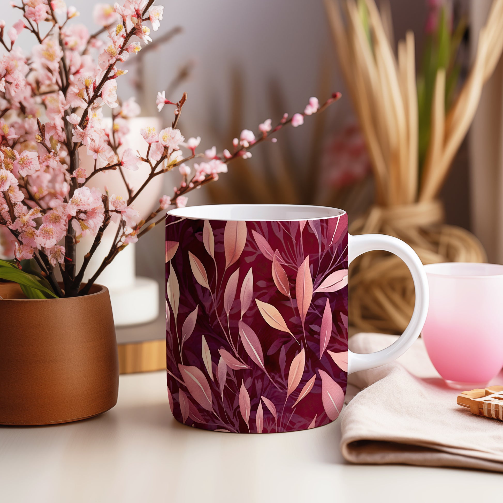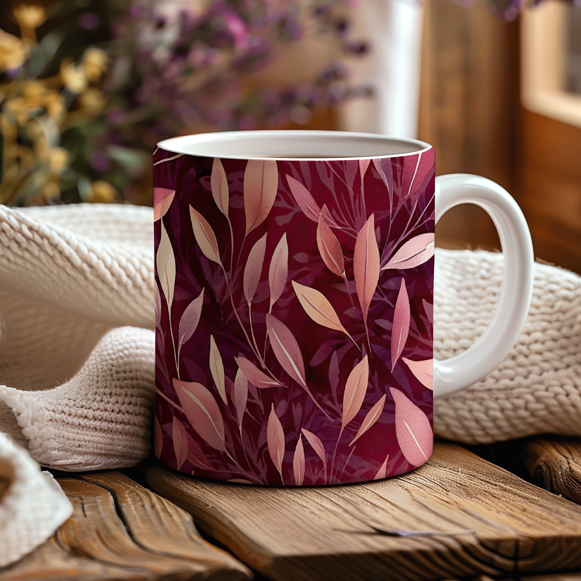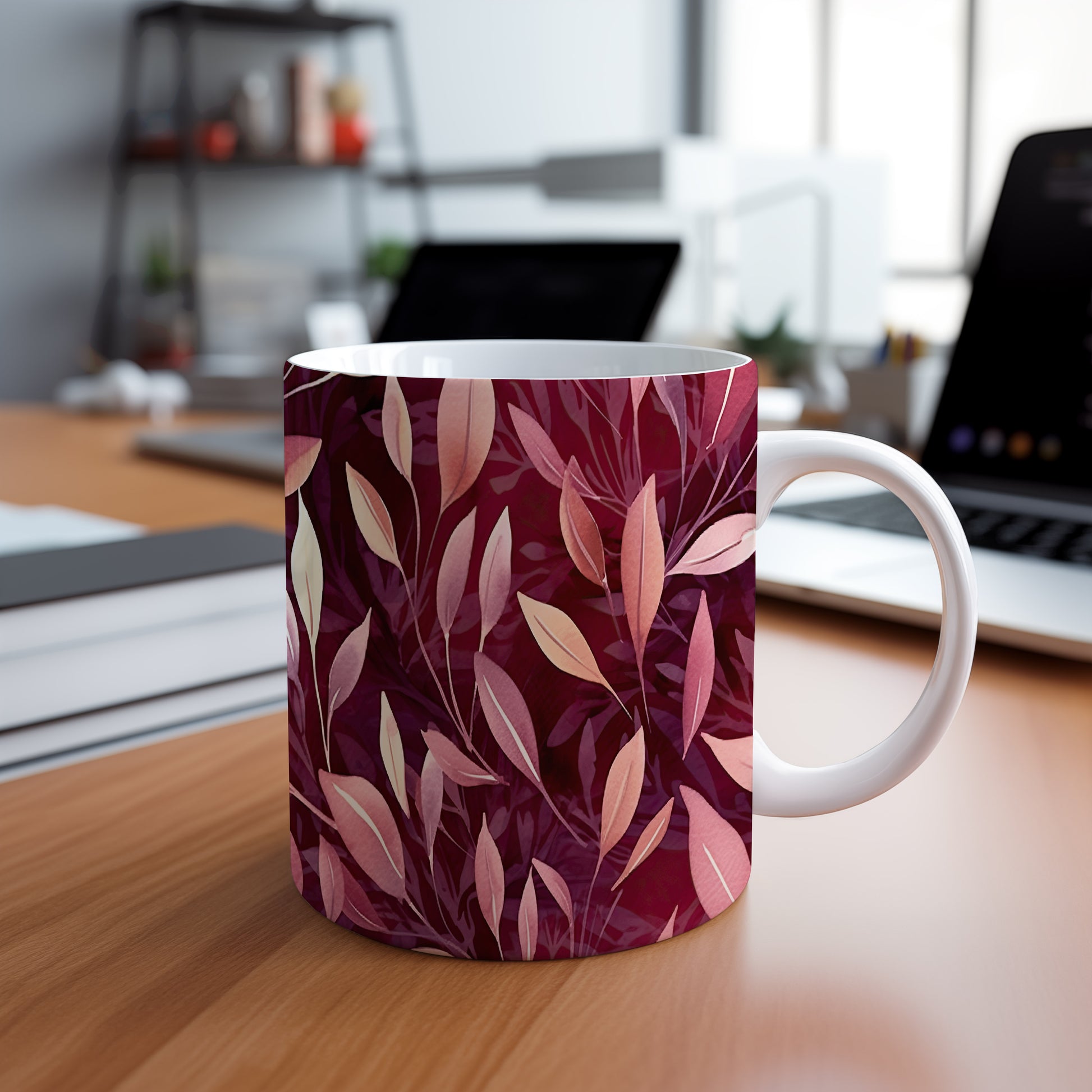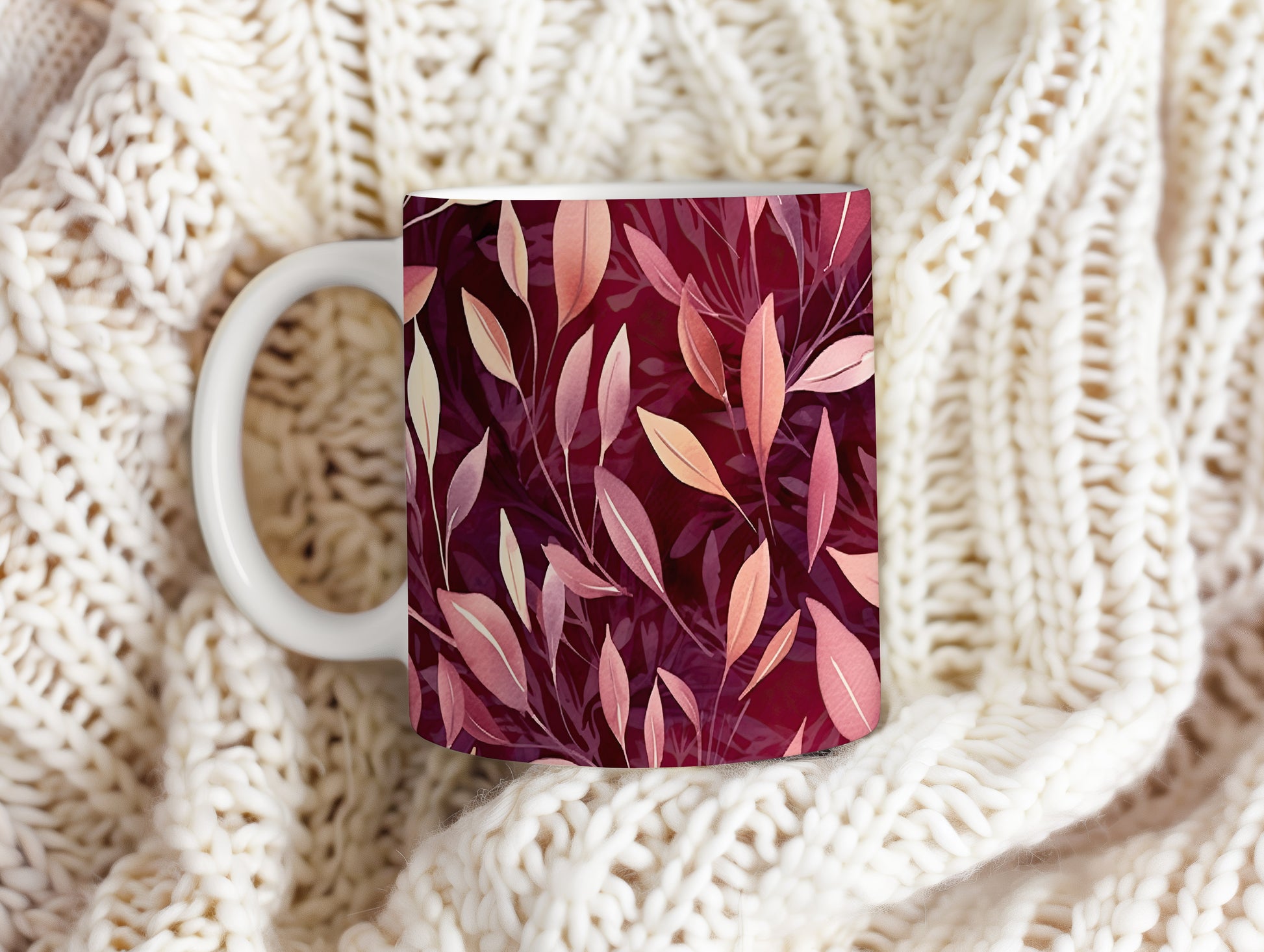 Tento hrnek s jemným designem barevných listů vyniká na tmavém pozadí. Ideální pro každodenní používání nebo jako stylový dárek.