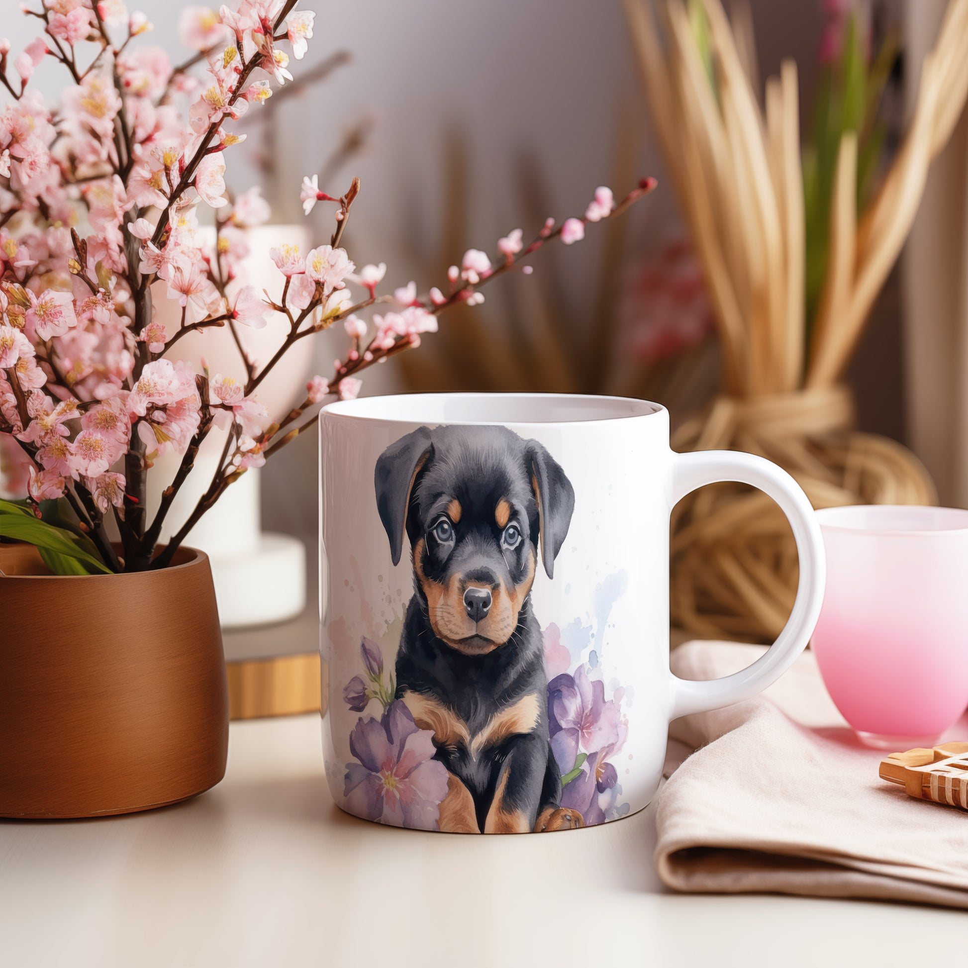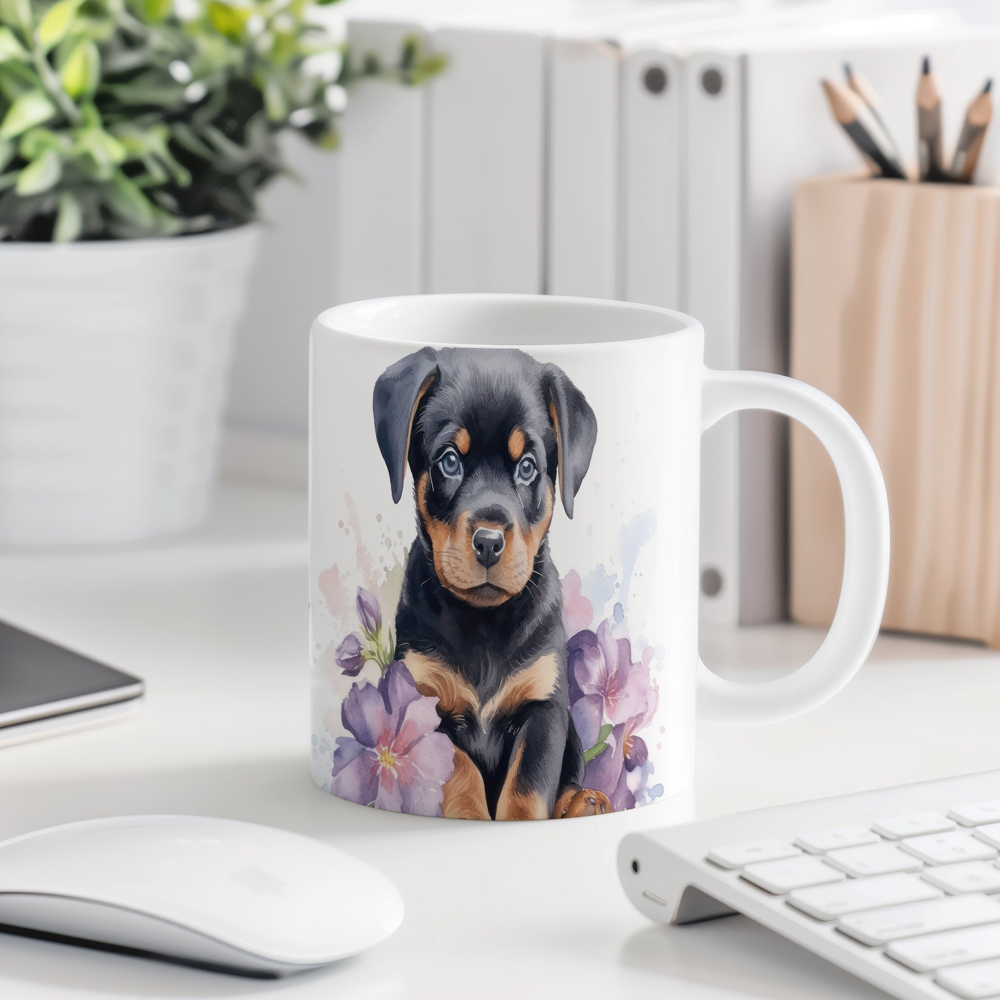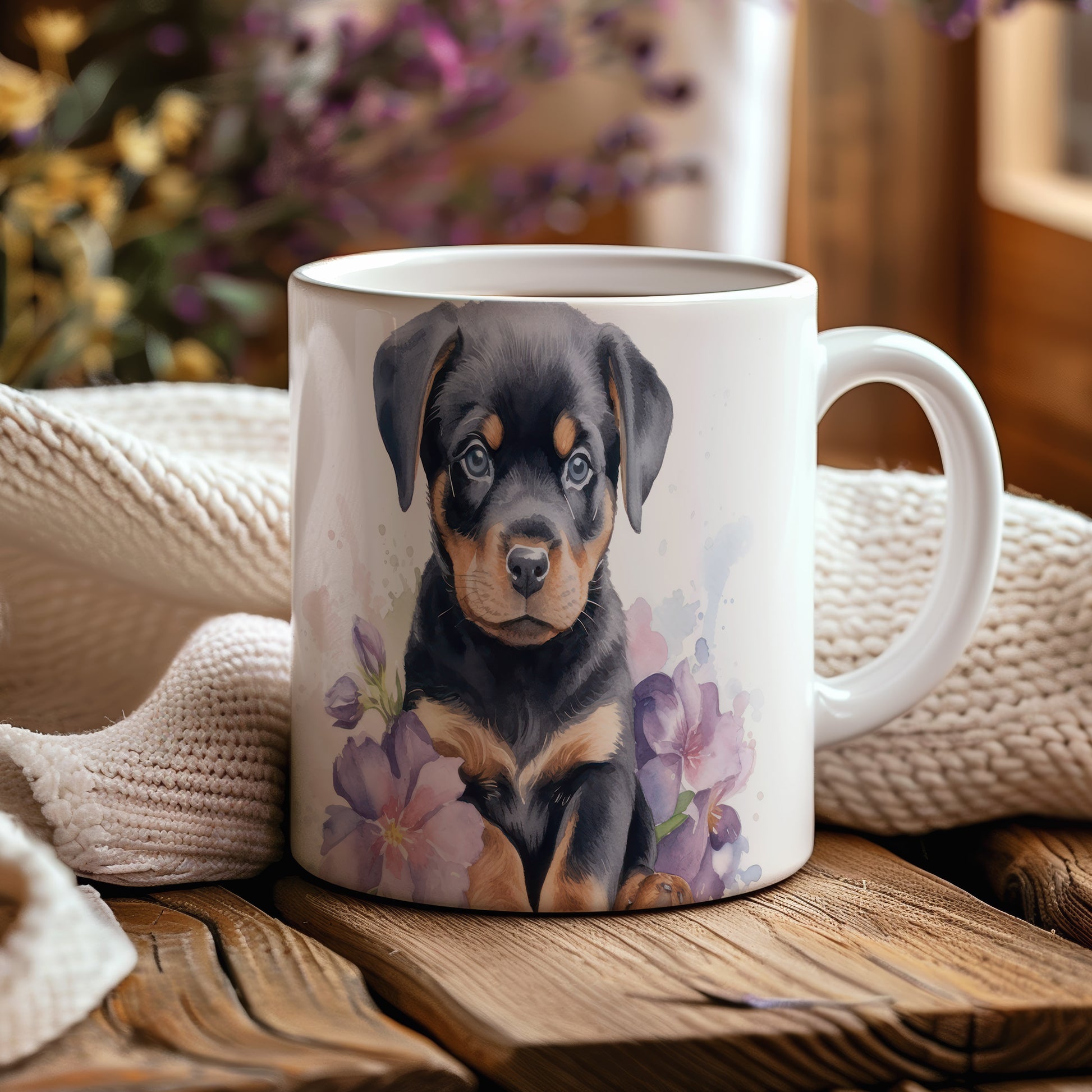 Tento hrníček s motivem štěněte rotvajlera v květinovém designu je ideální pro milovníky psů. Přidejte do svého dne špetku radosti a pohody s tímto jedinečným kouskem.