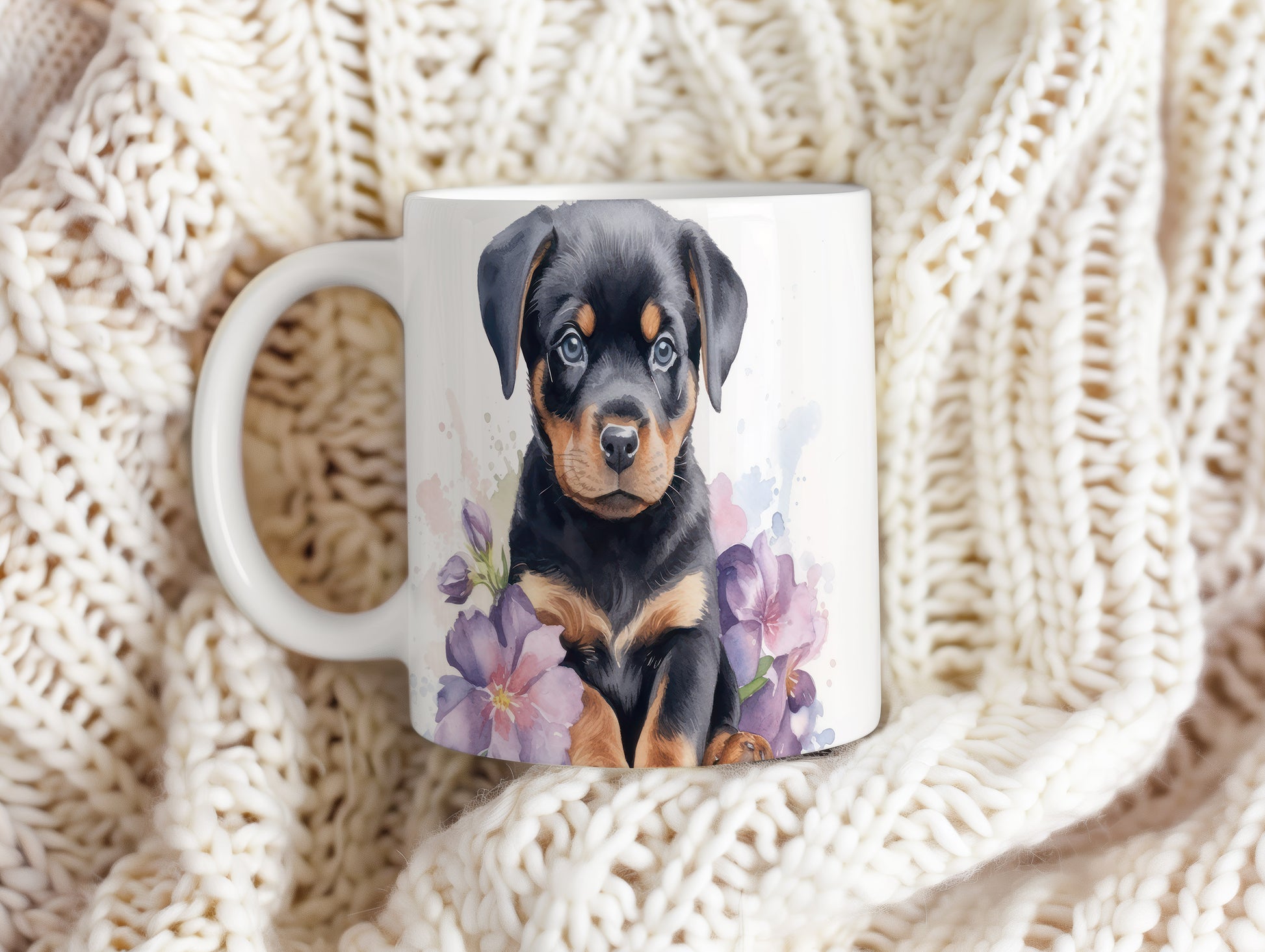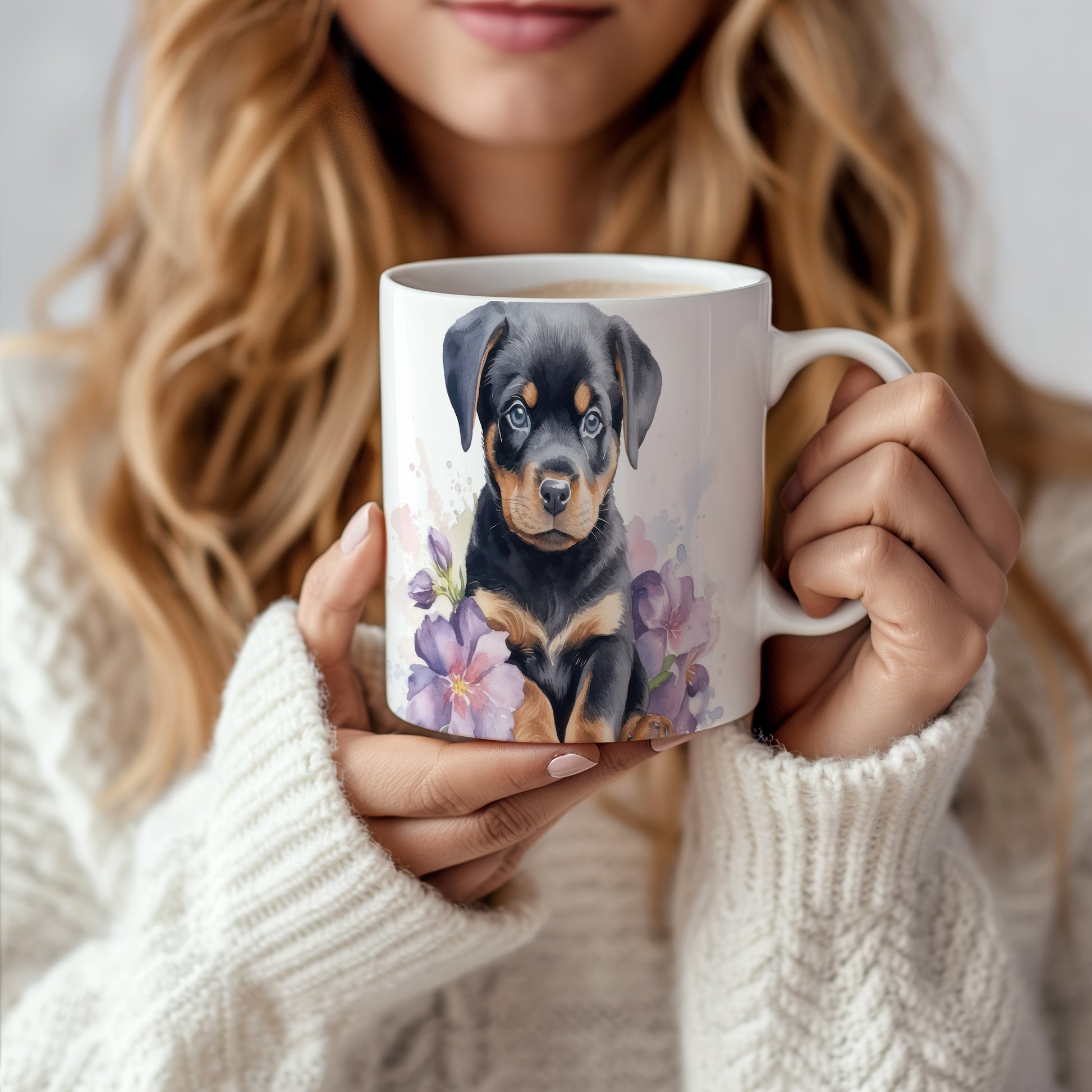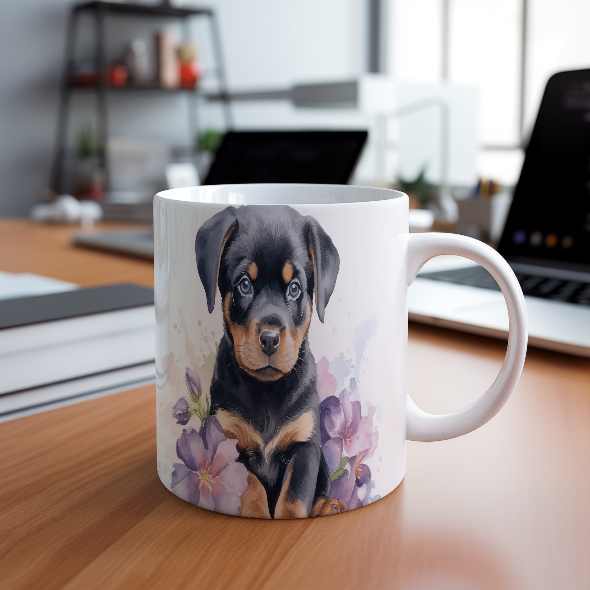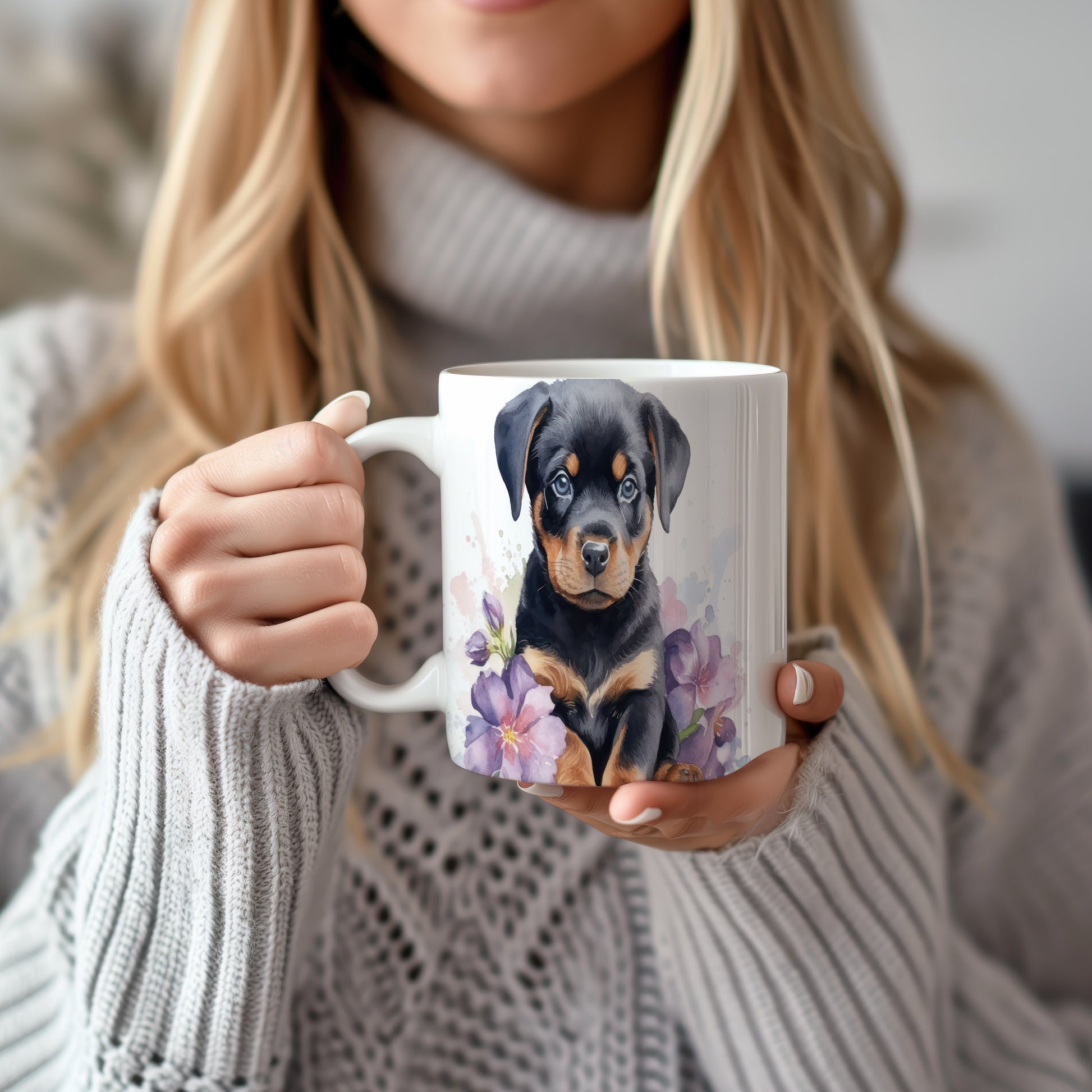 Tento hrníček s motivem štěněte rotvajlera v květinovém designu je ideální pro milovníky psů. Přidejte do svého dne špetku radosti a pohody s tímto jedinečným kouskem.