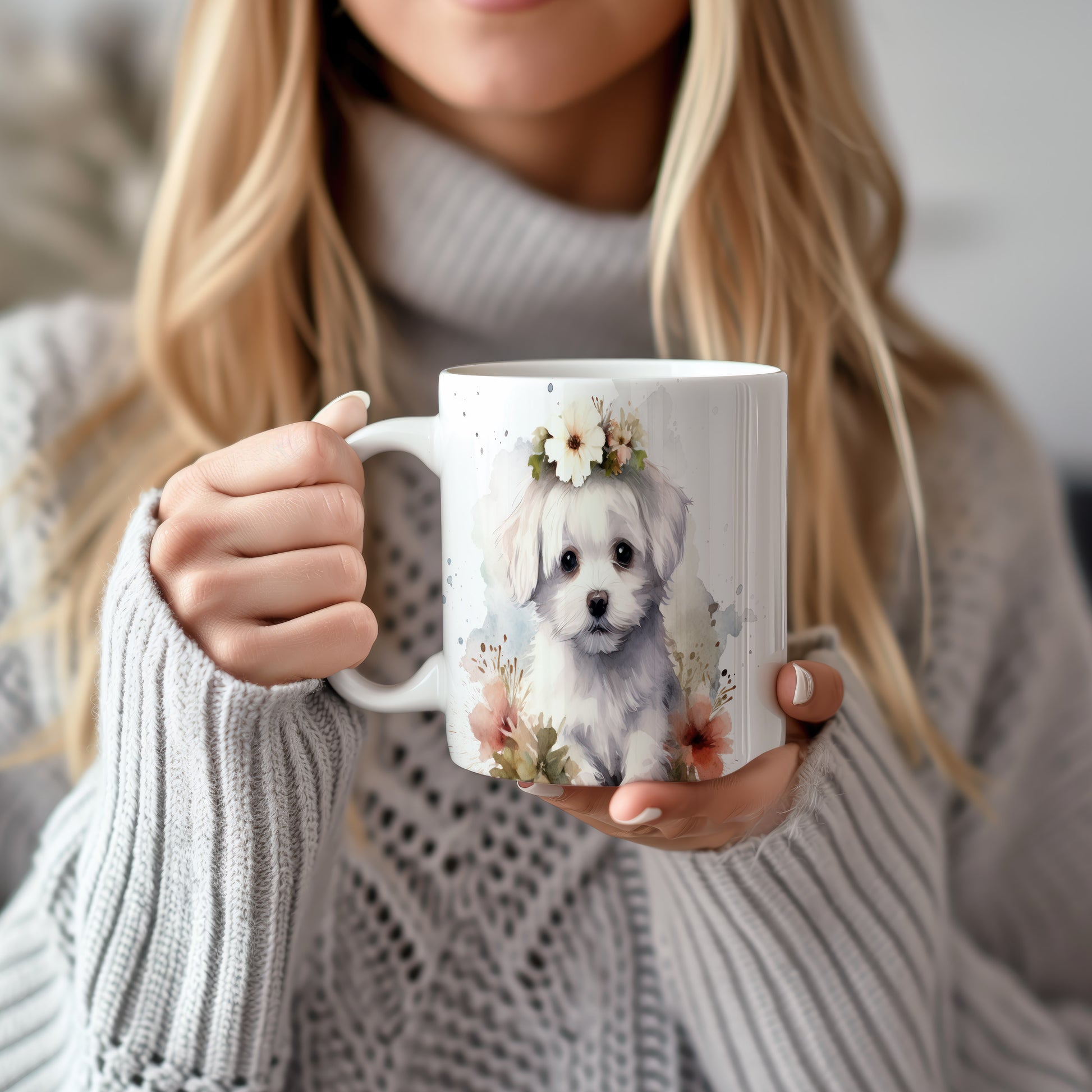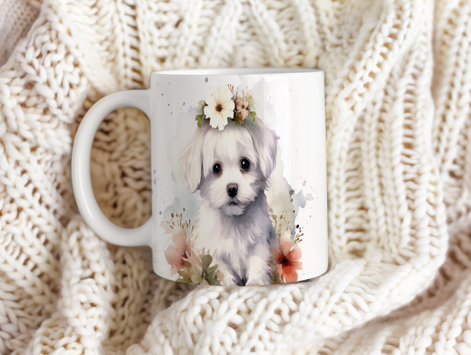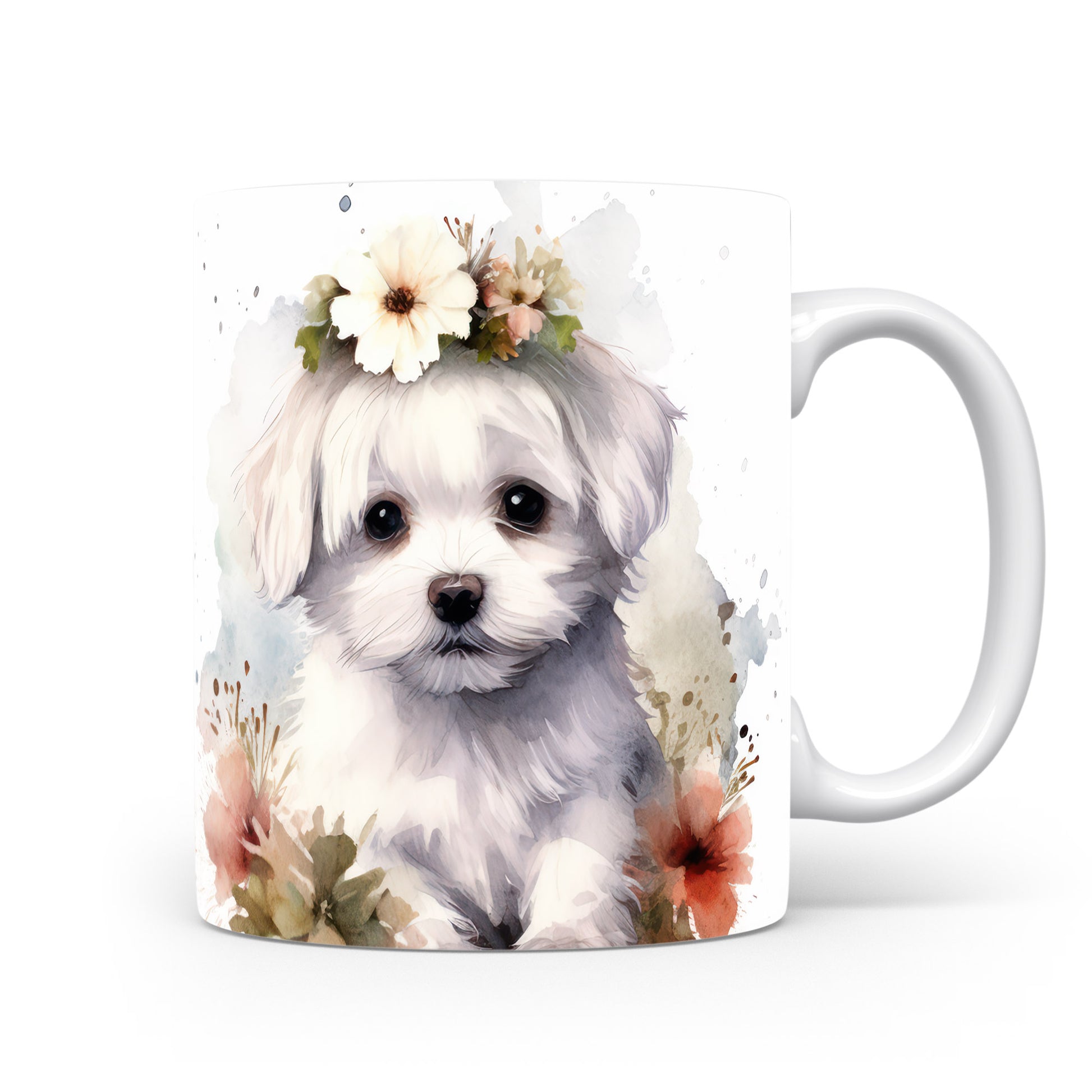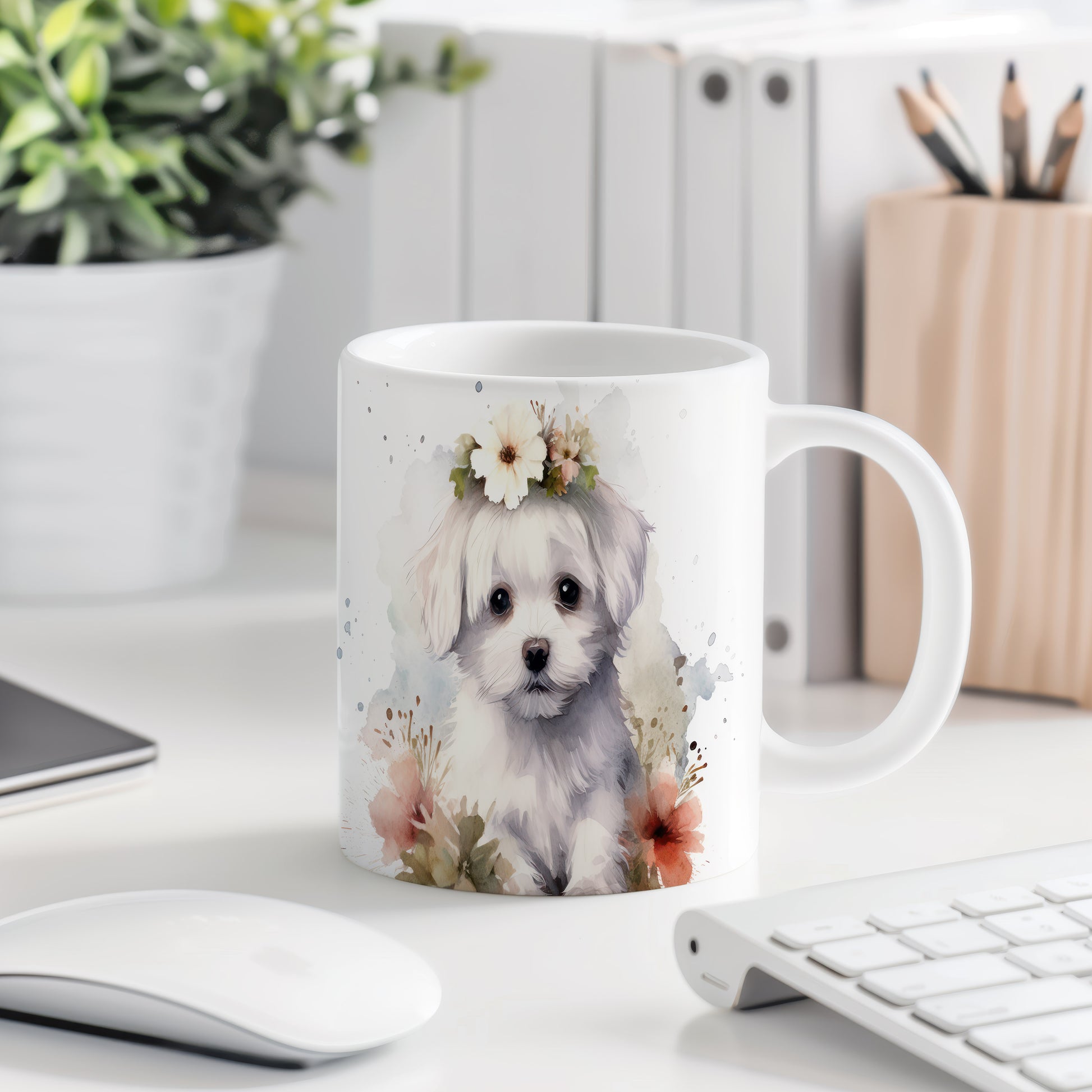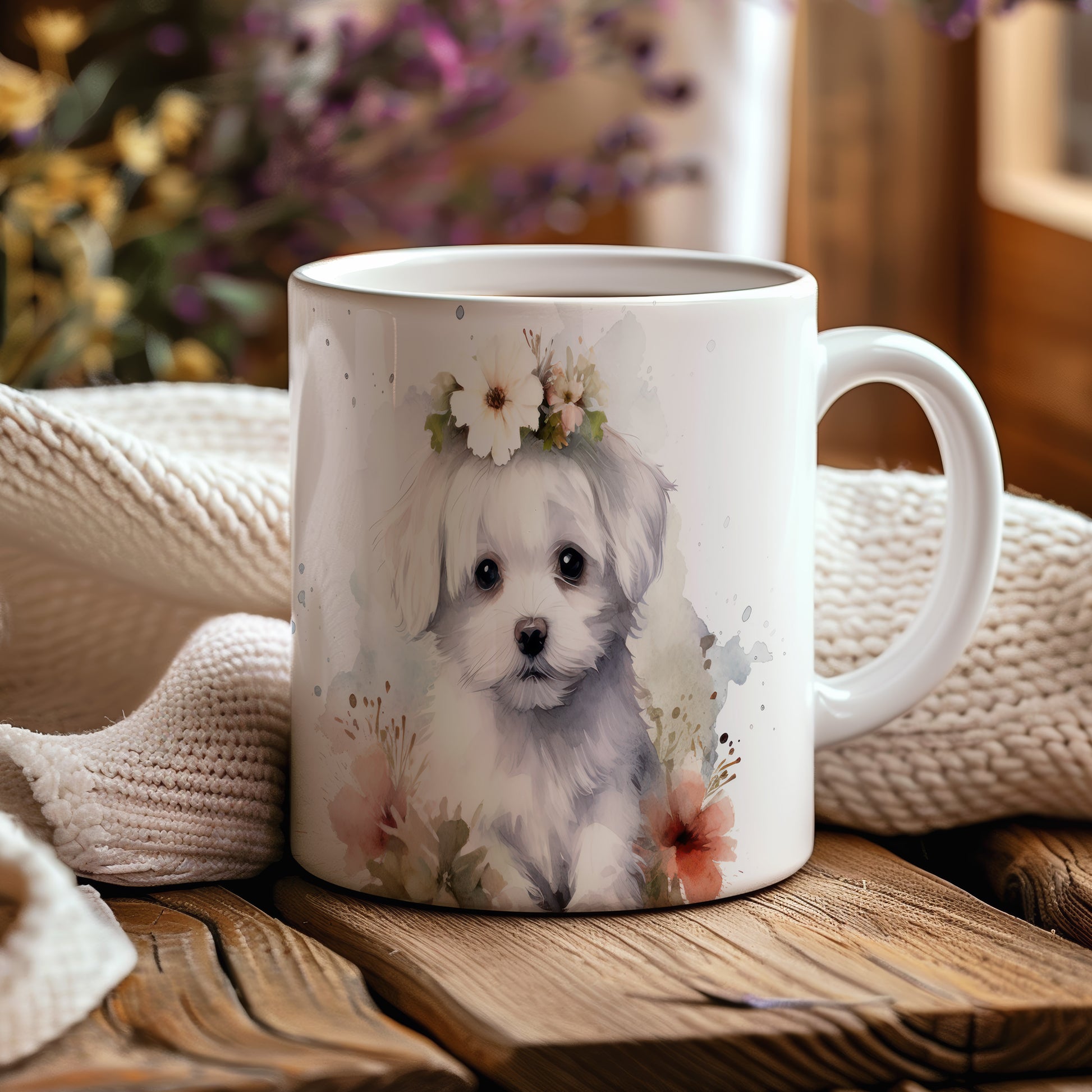 Hrnek s roztomilým štěnětem s květinovým věnečkem