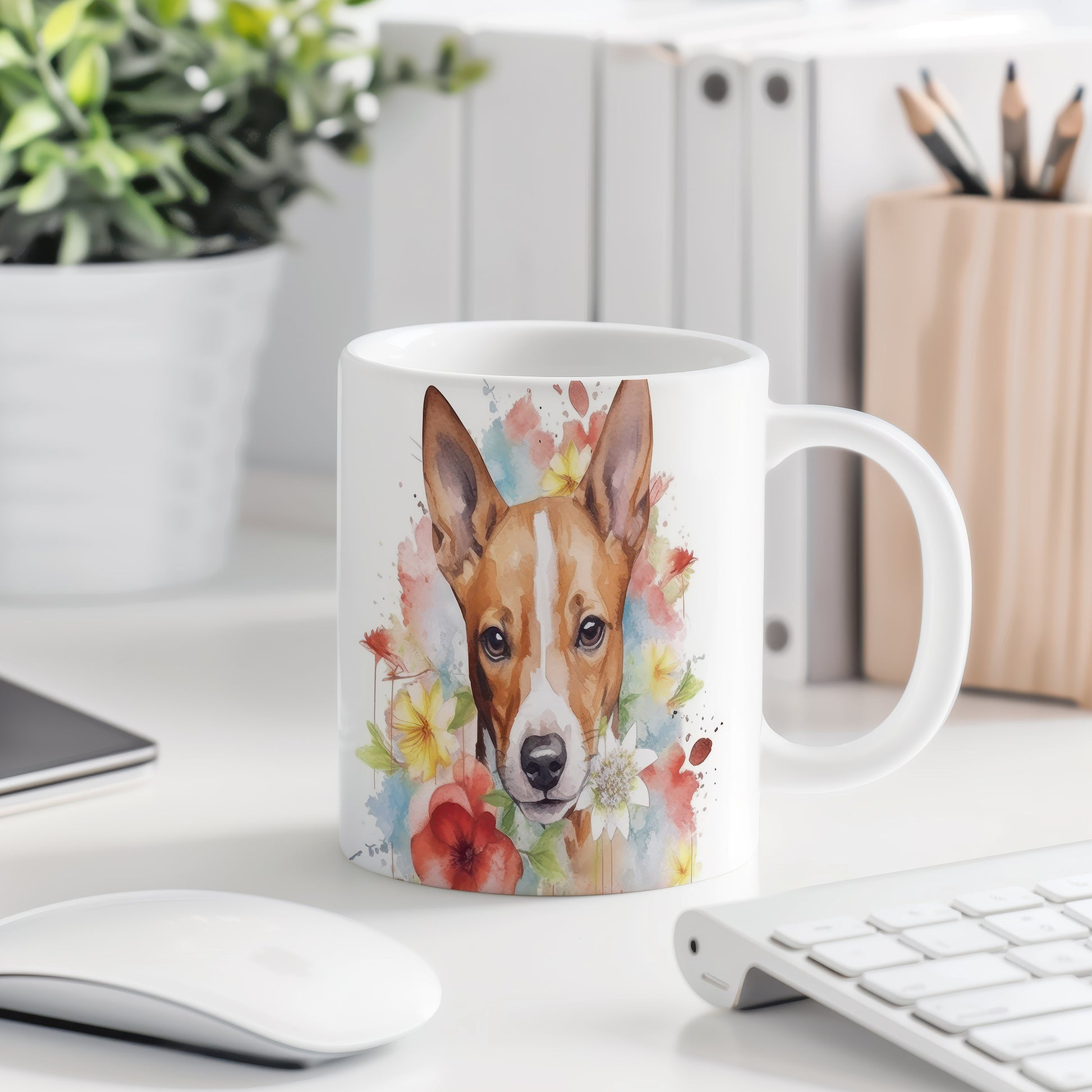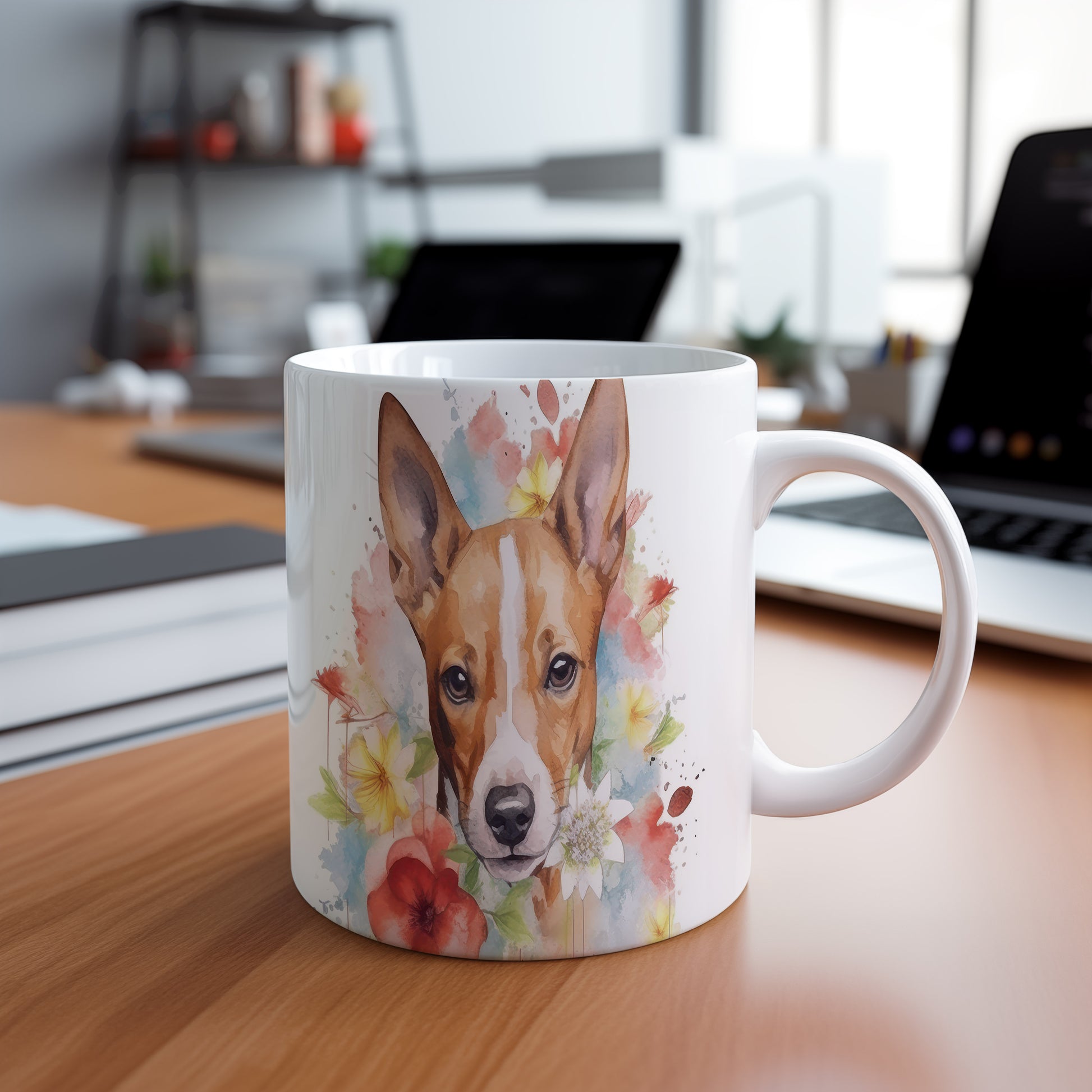 Stylový hrnek s krásným motivem psa basenji obklopeného květinami. Ideální pro milovníky psů a umění, který potěší při každém doušku kávy.