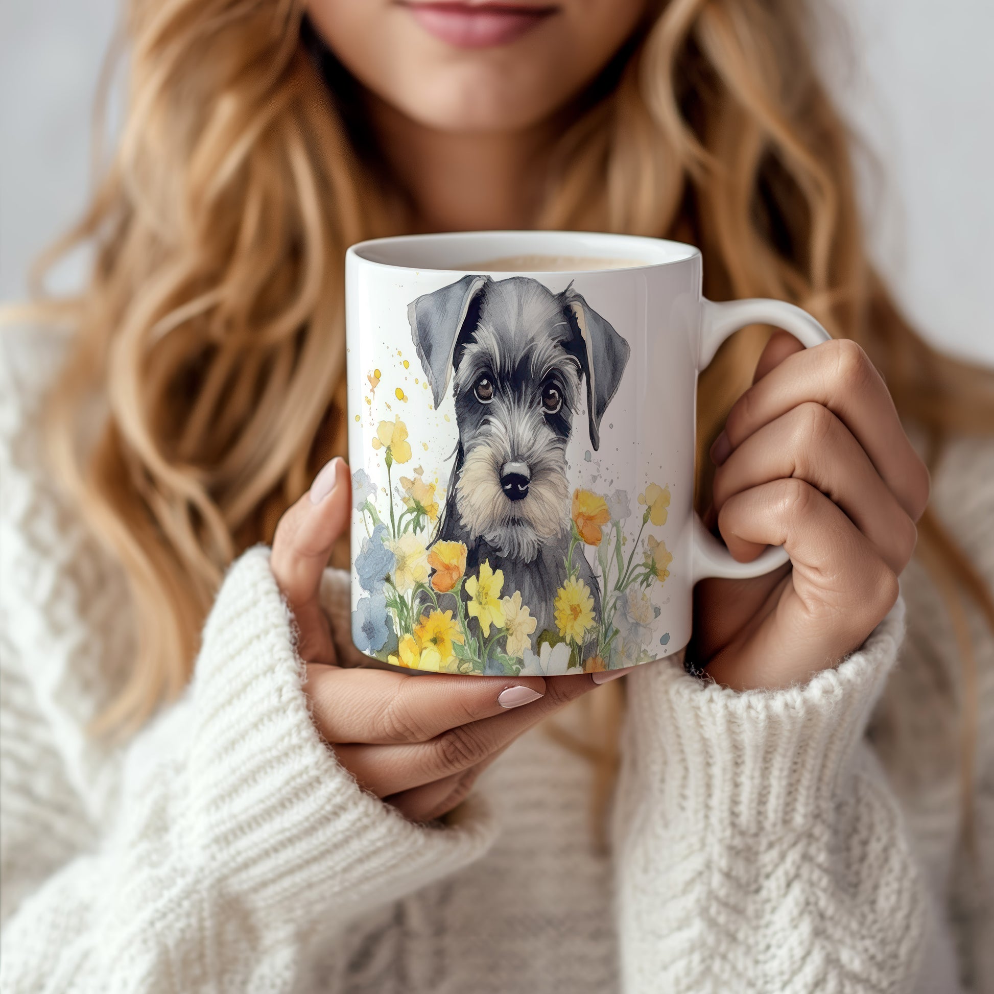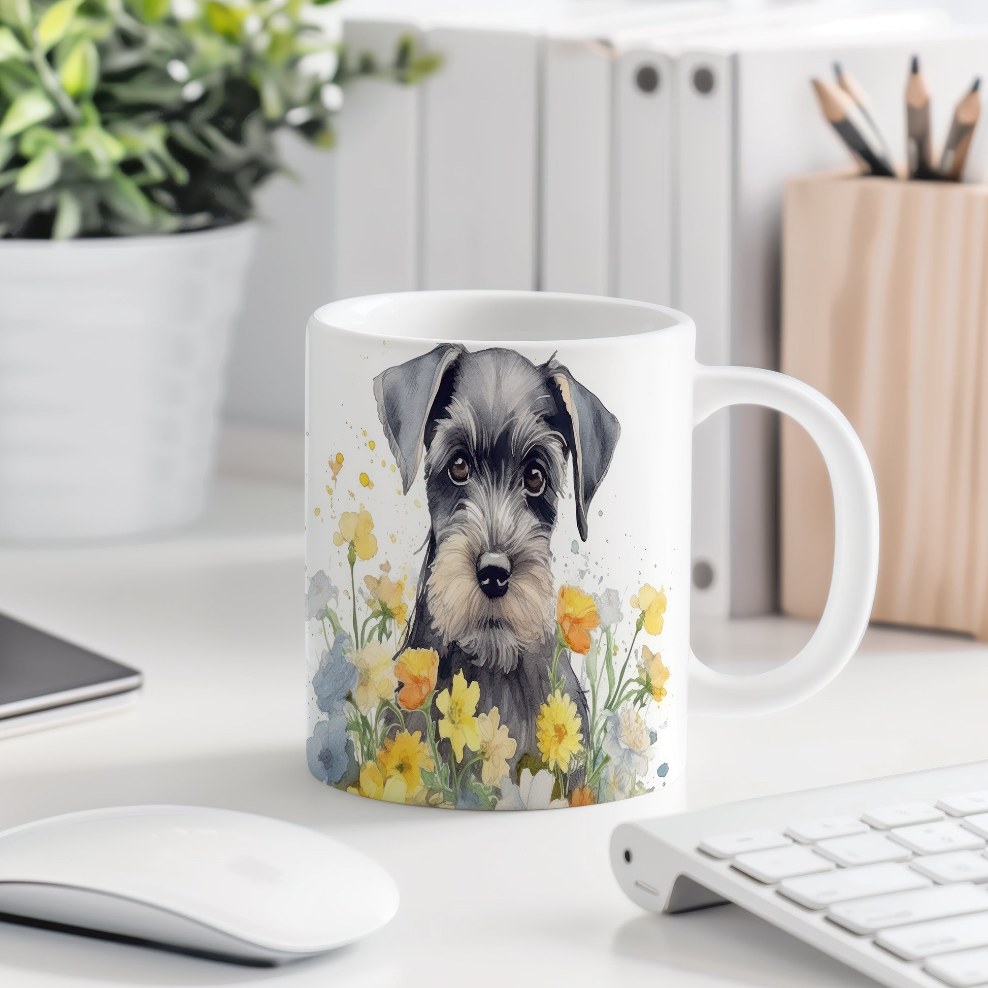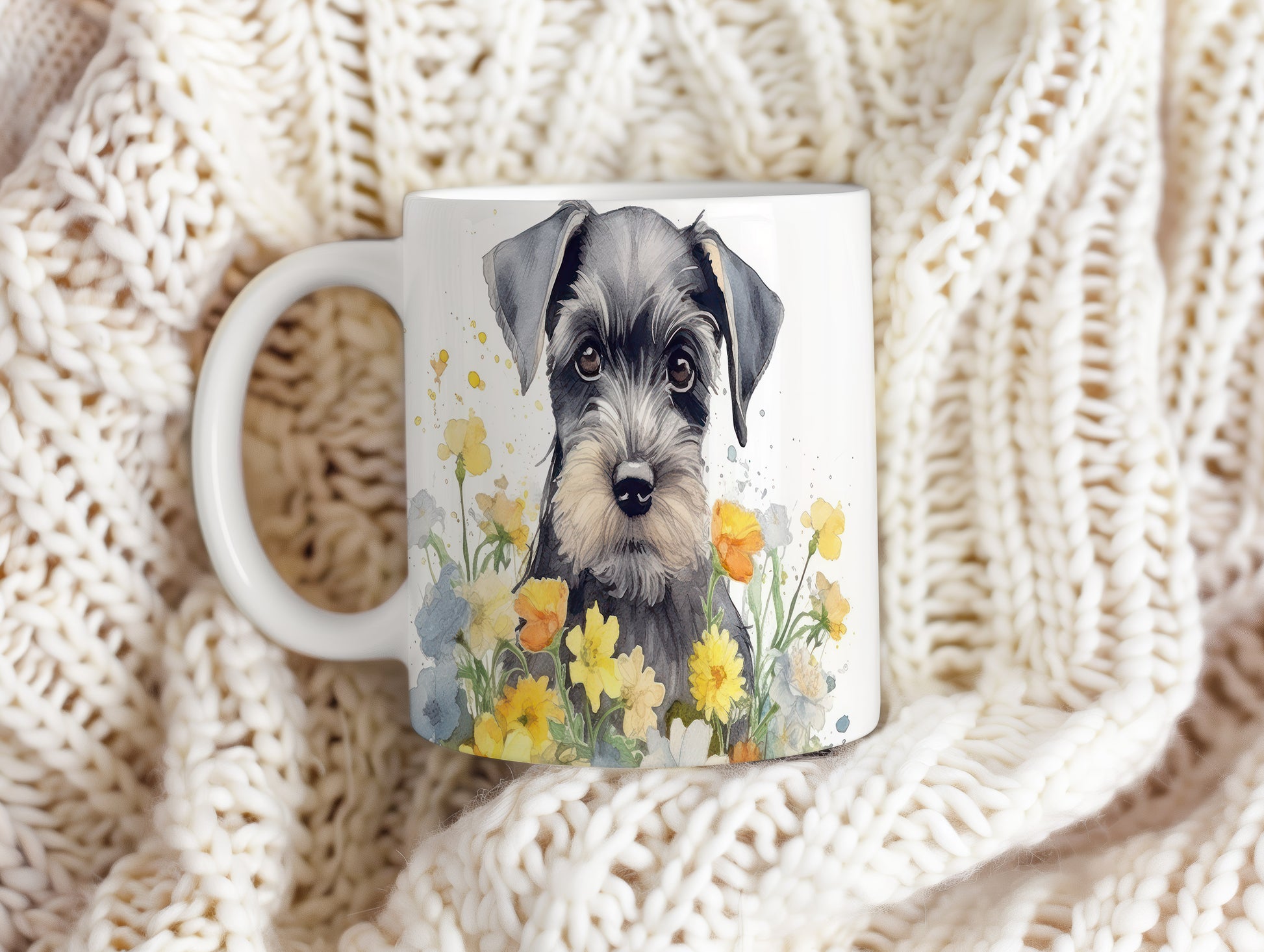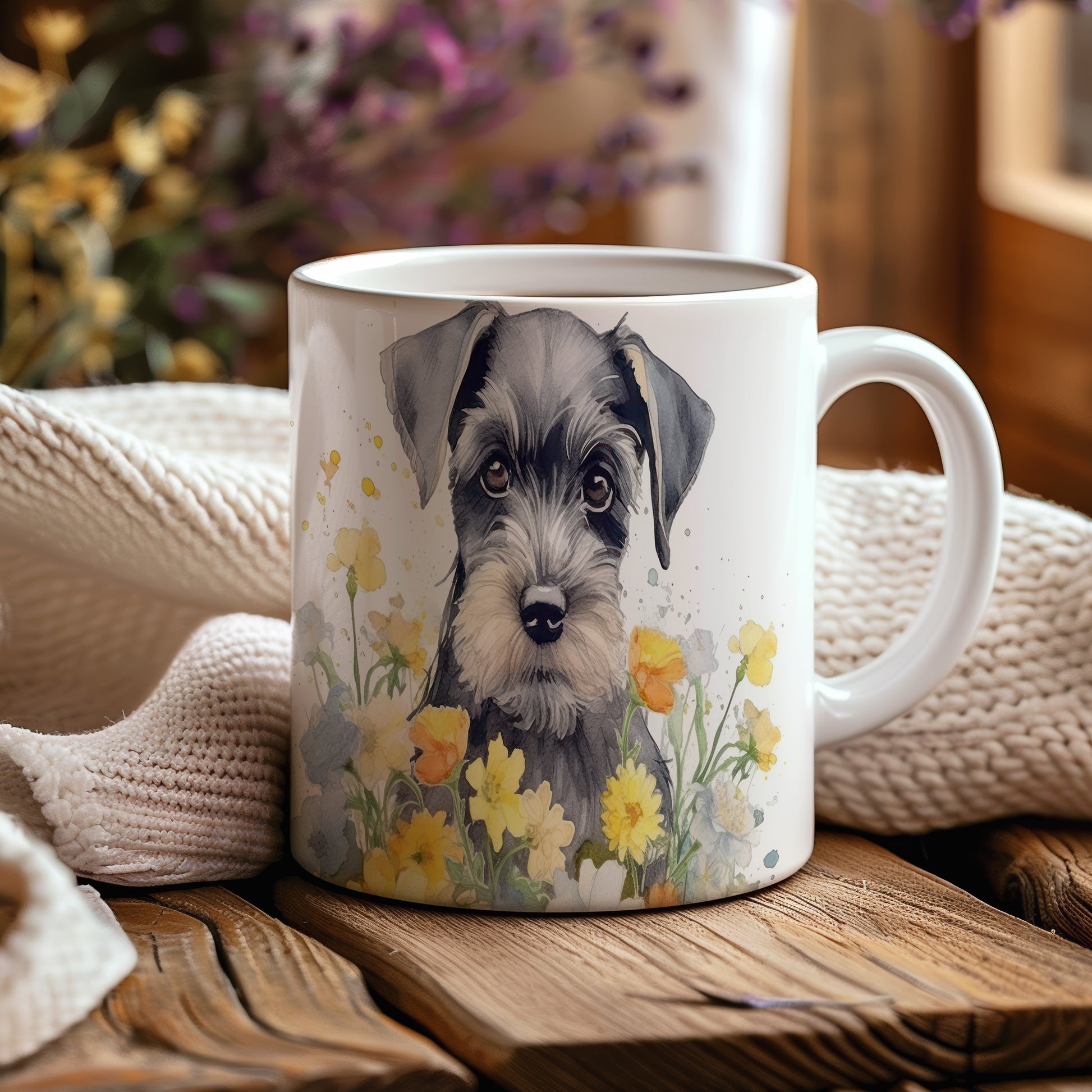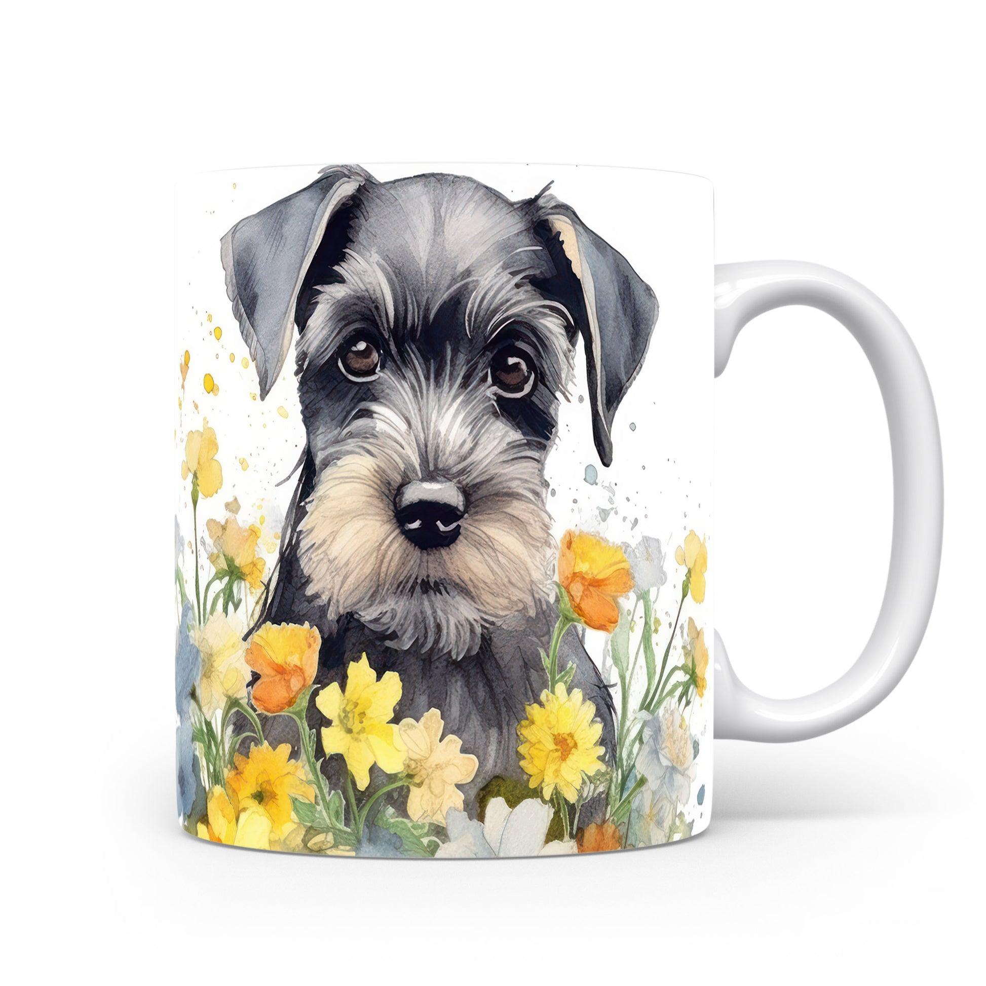 Stylový hrnek s ilustrací špringršpaněla v květinovém aranžmá. Ideální na kávu nebo čaj pro milovníky psů.