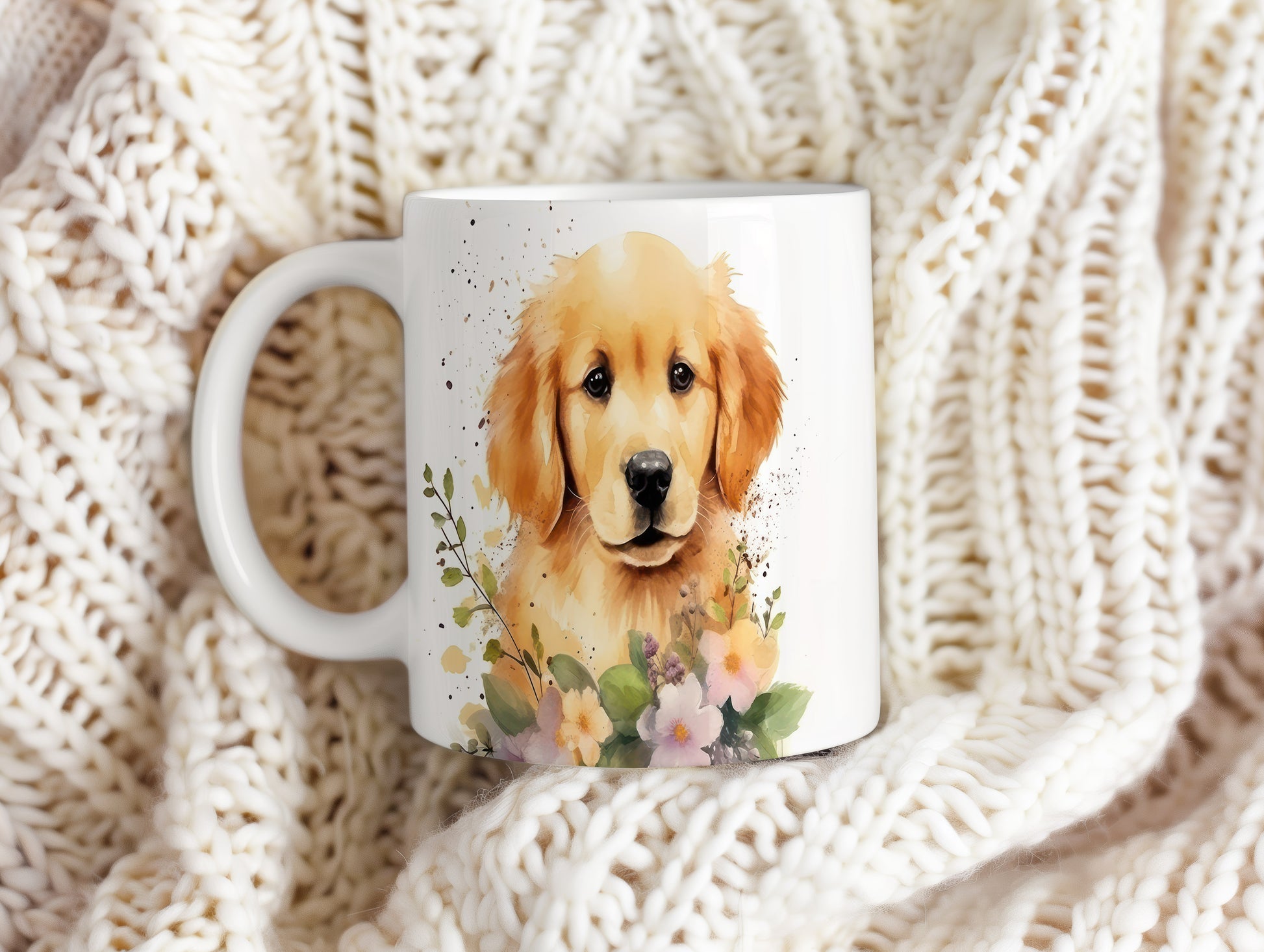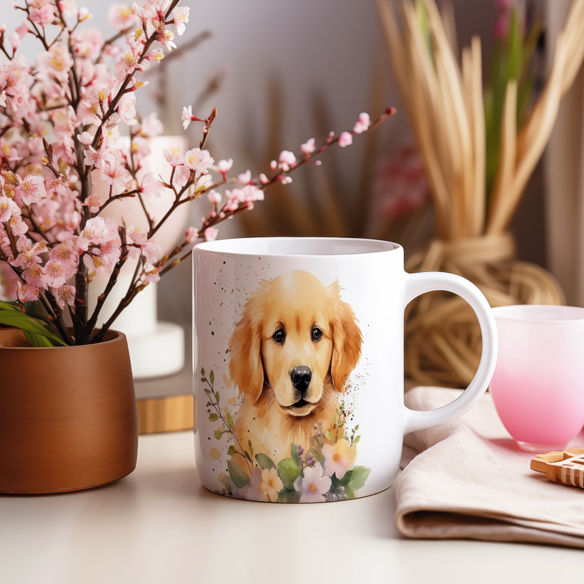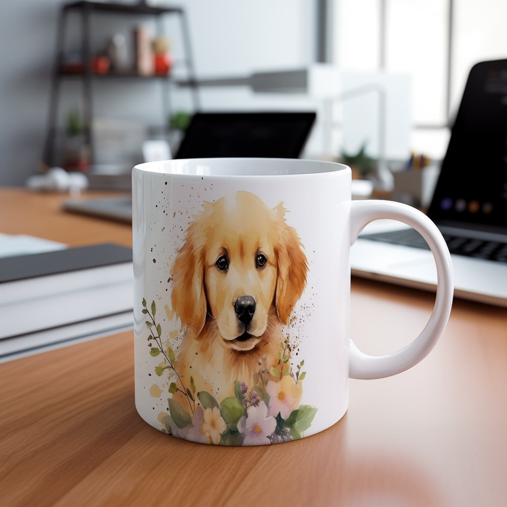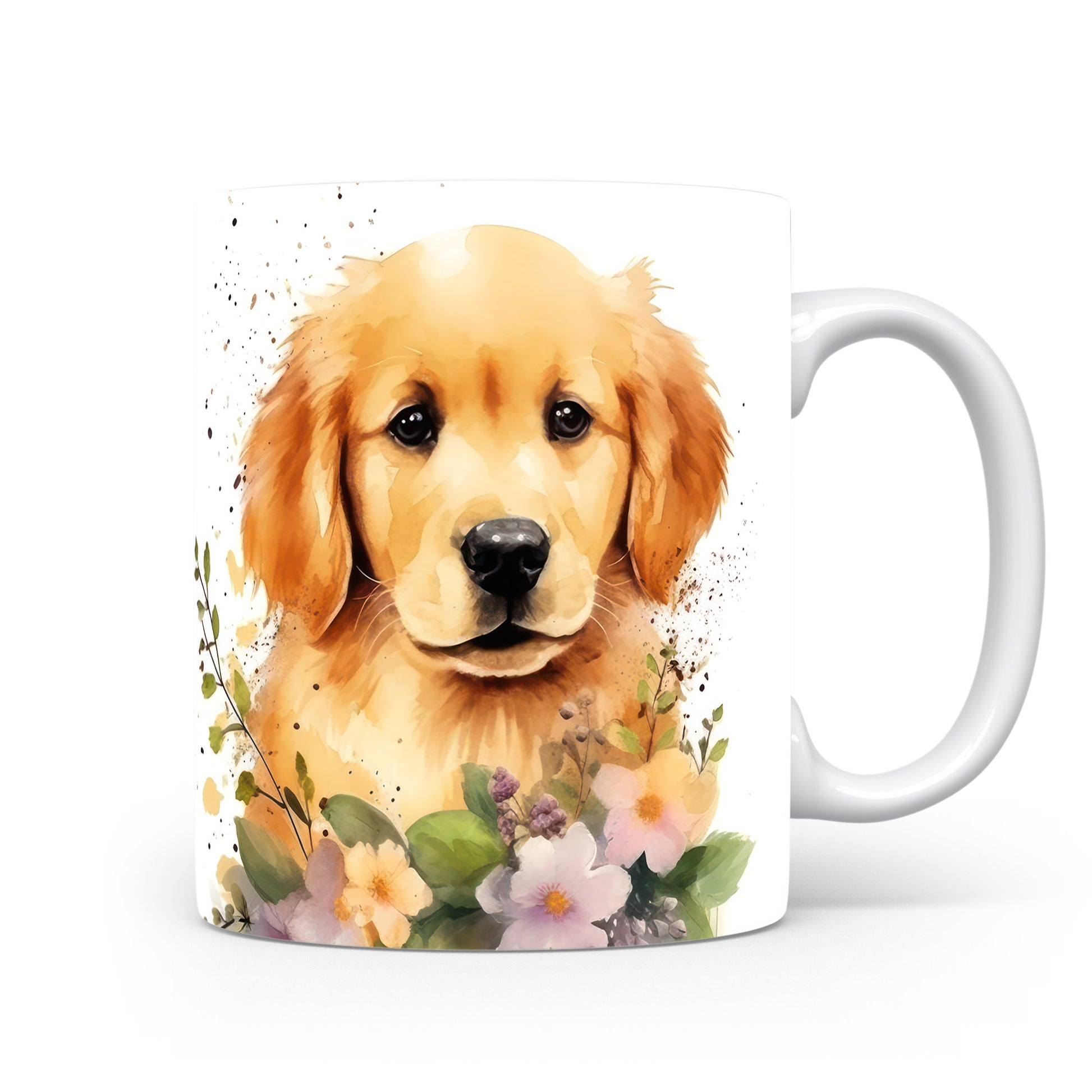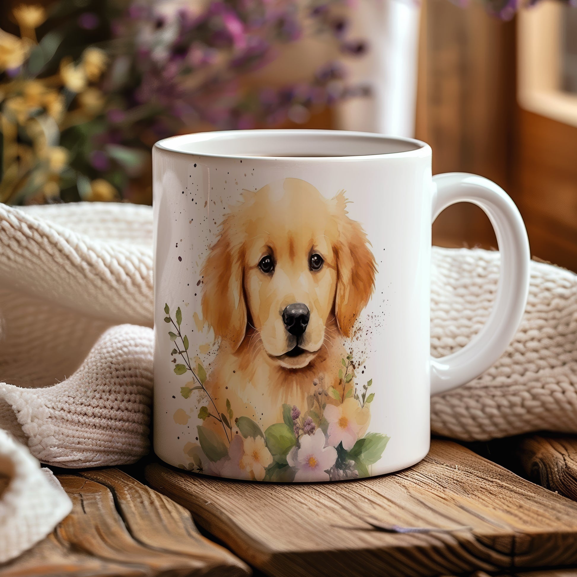 Tento hrníček s krásným motivem zlatého retrívra a květin přinese radost každému milovníkovi psů. Ideální pro ranní kávu nebo čaj, osvěží váš den.