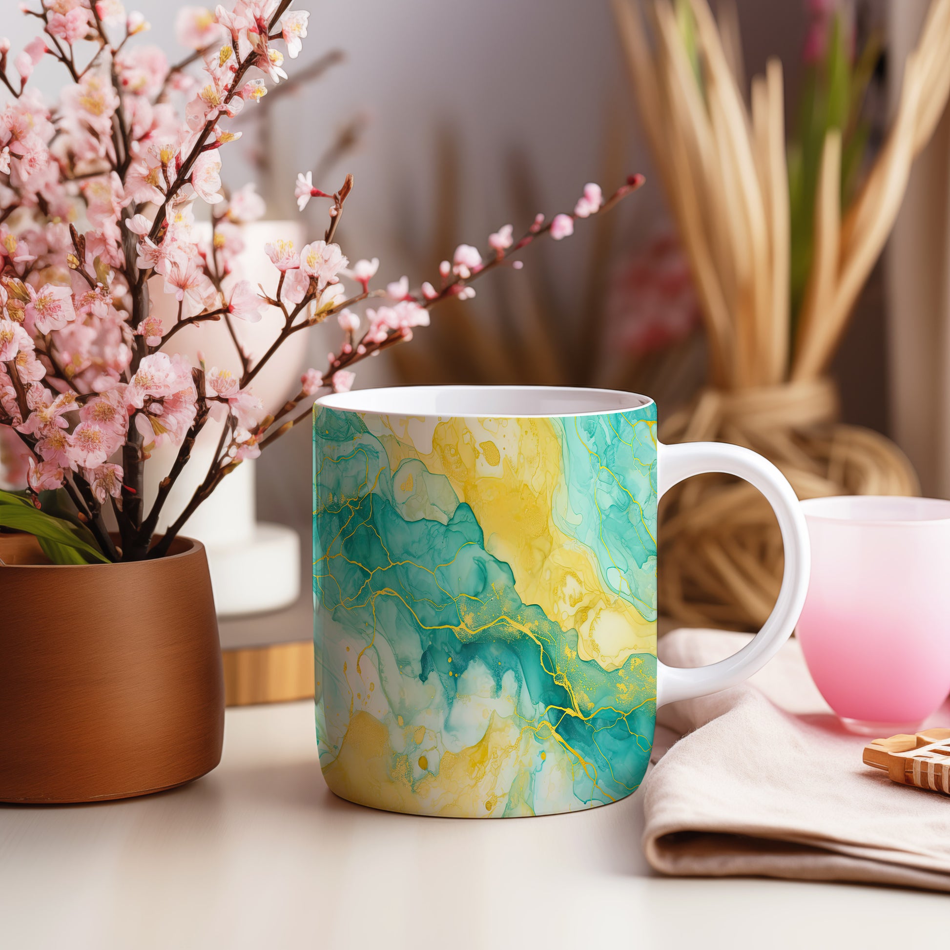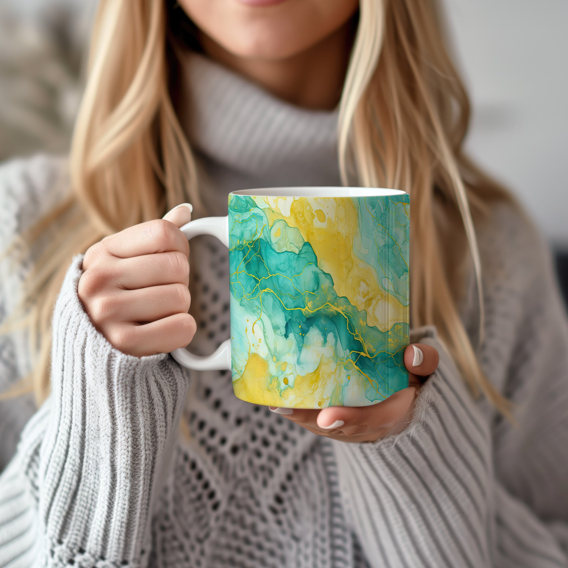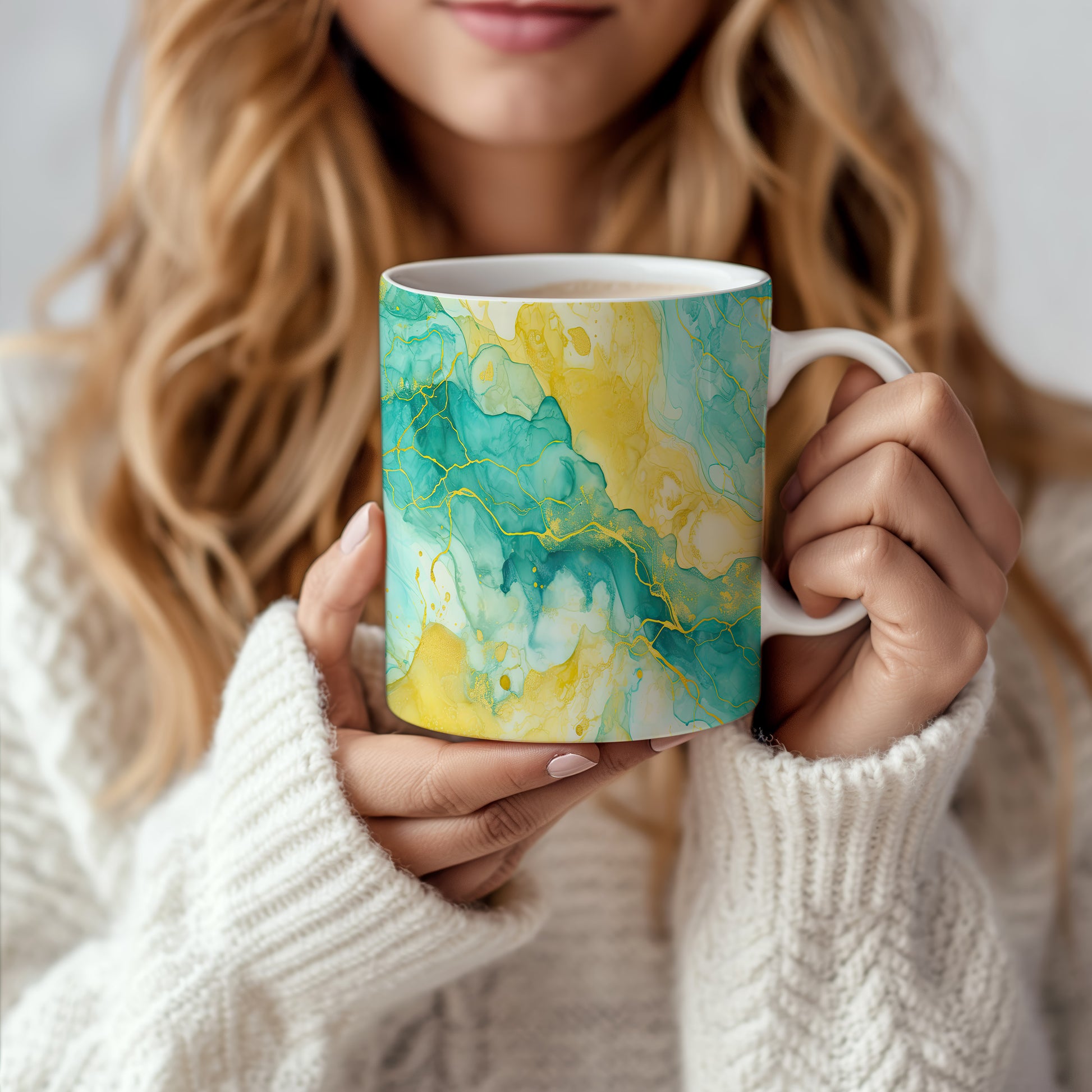 Elegantní hrnek s akvarelovým motivem v modrožlutých odstínech