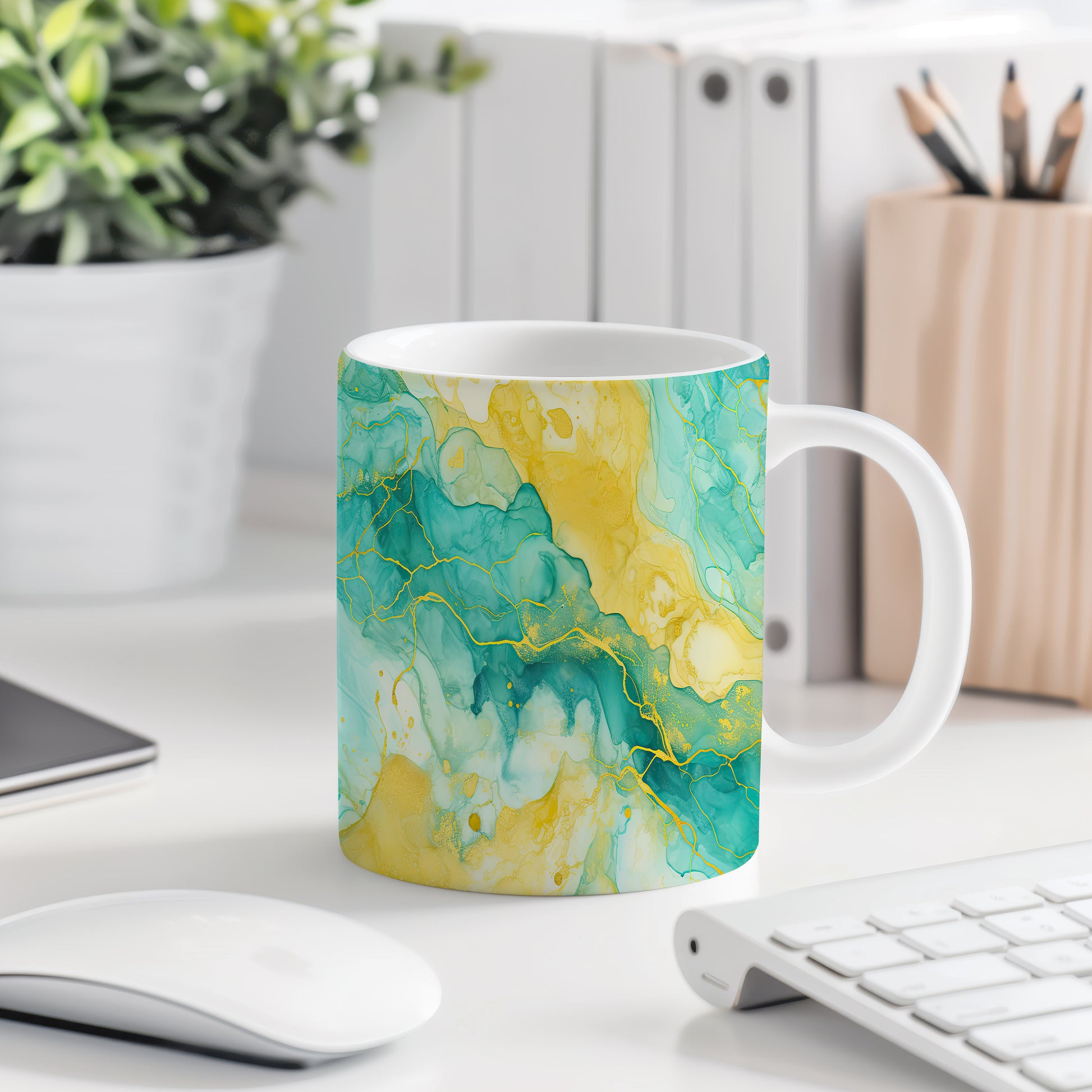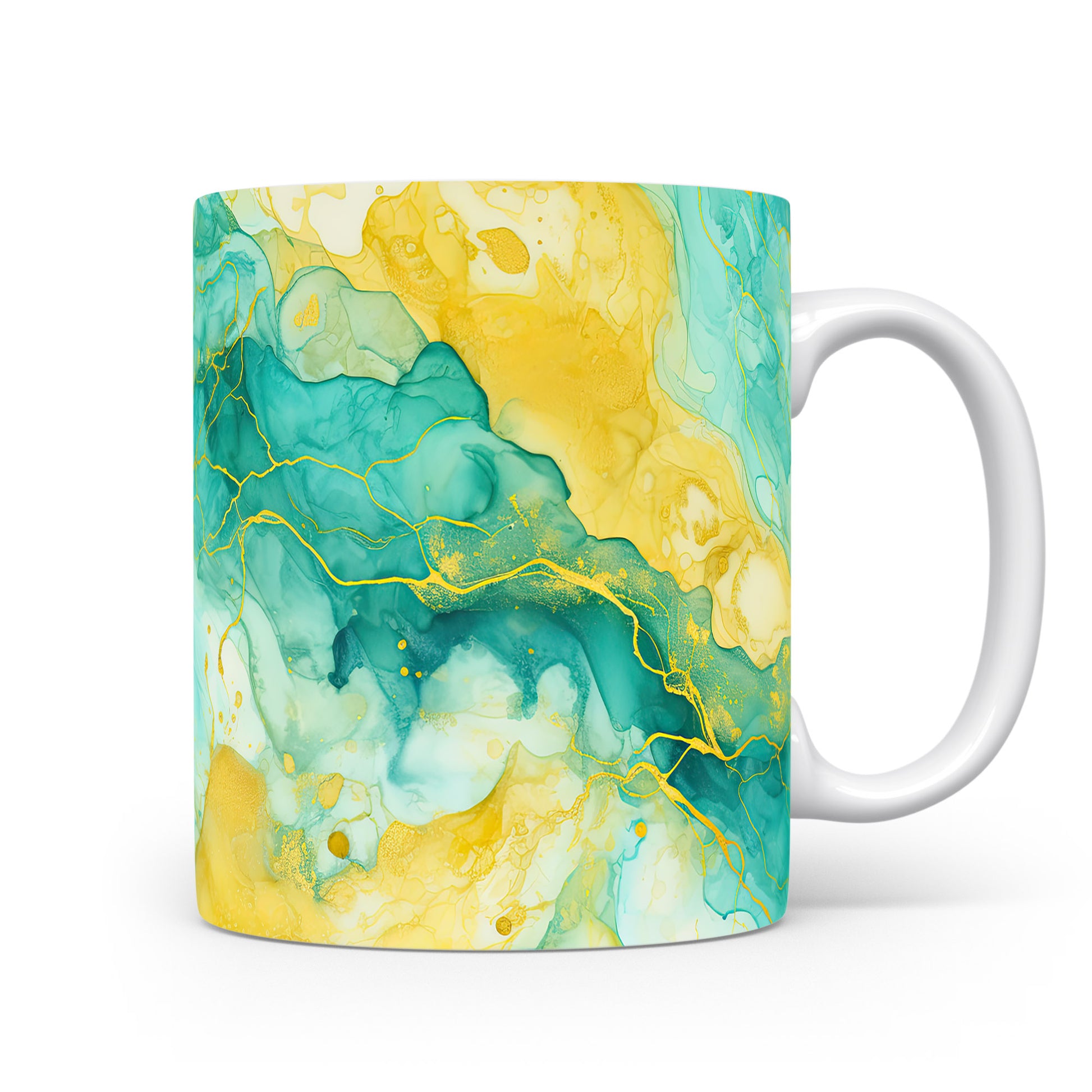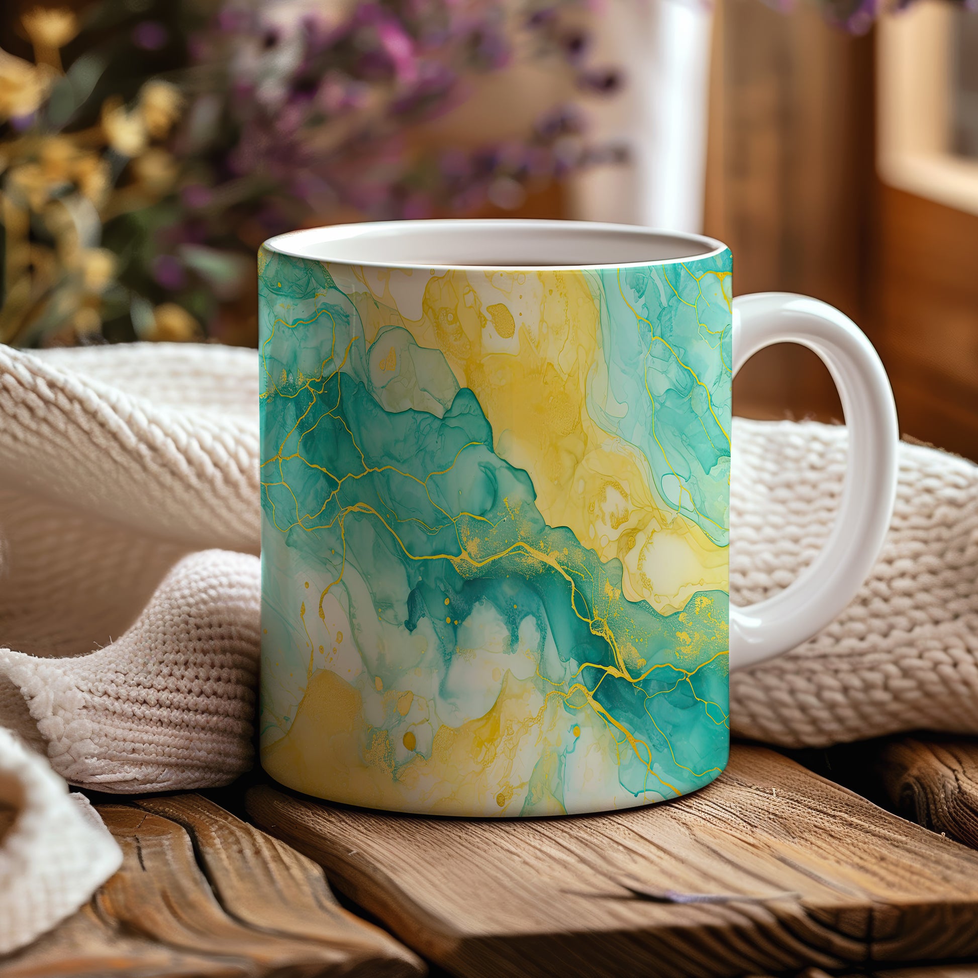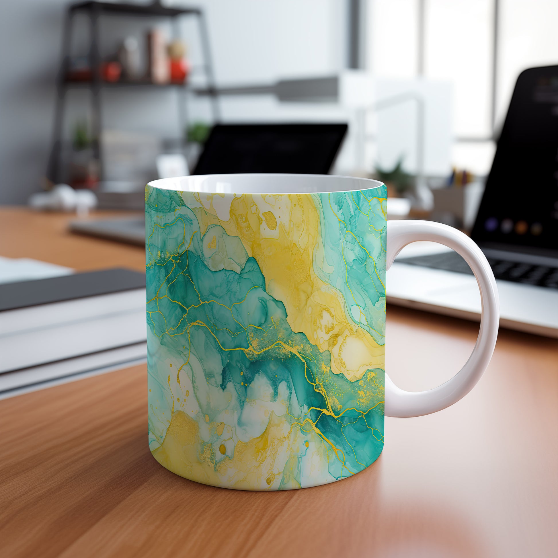 Elegantní hrnek s akvarelovým motivem v modrožlutých odstínech