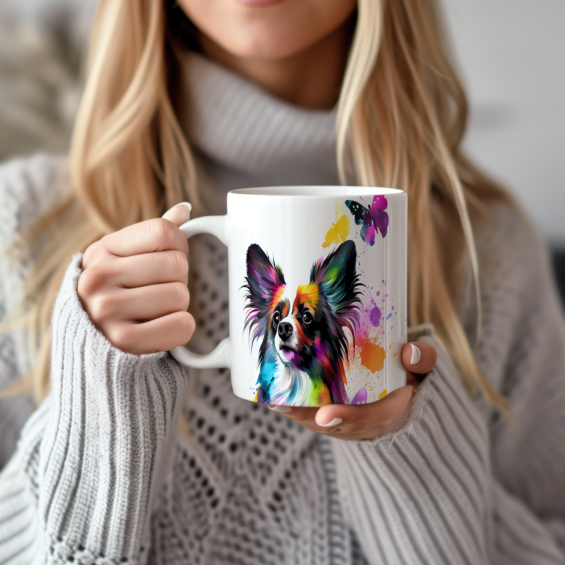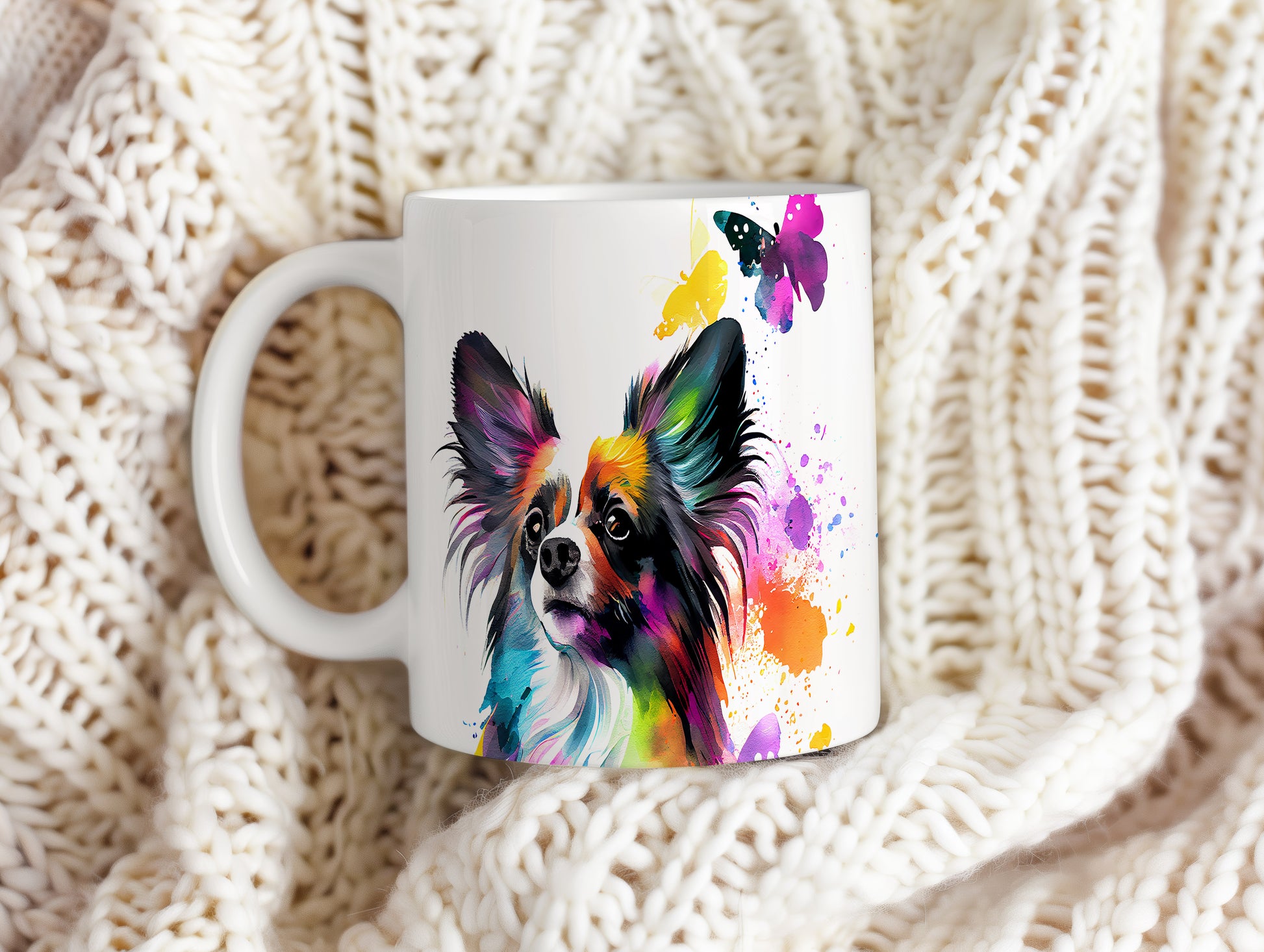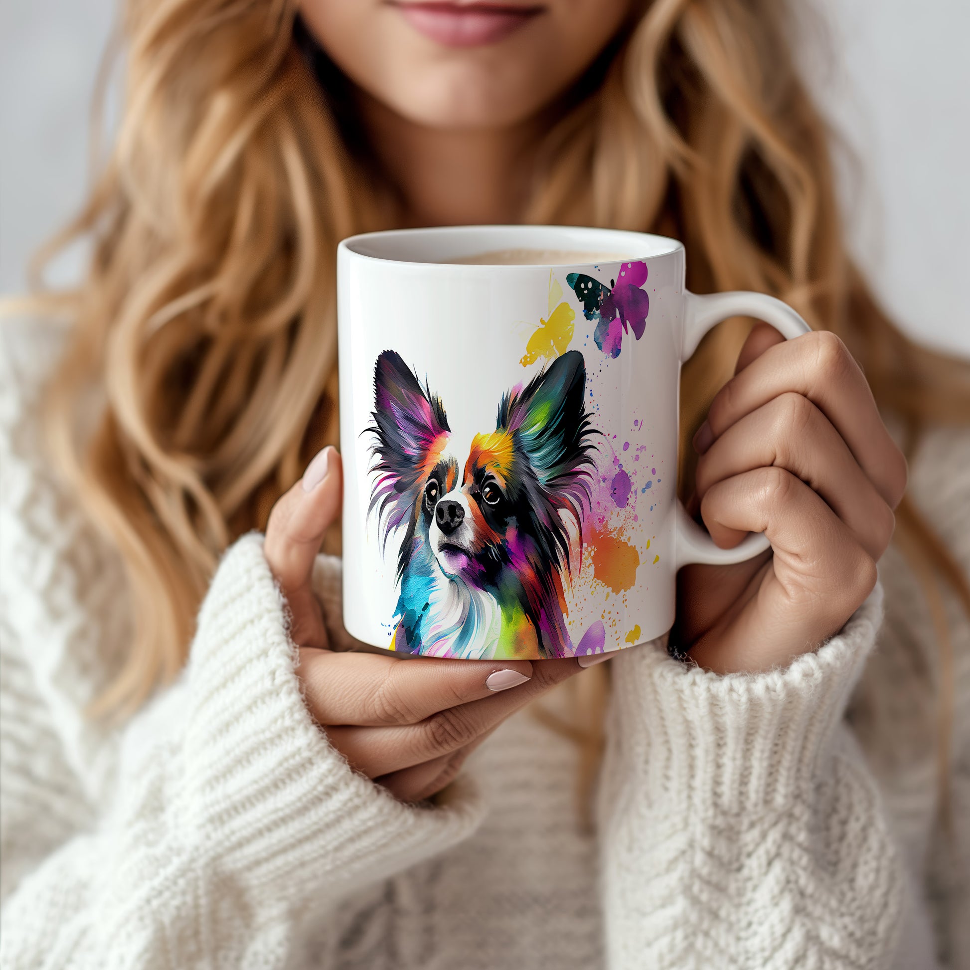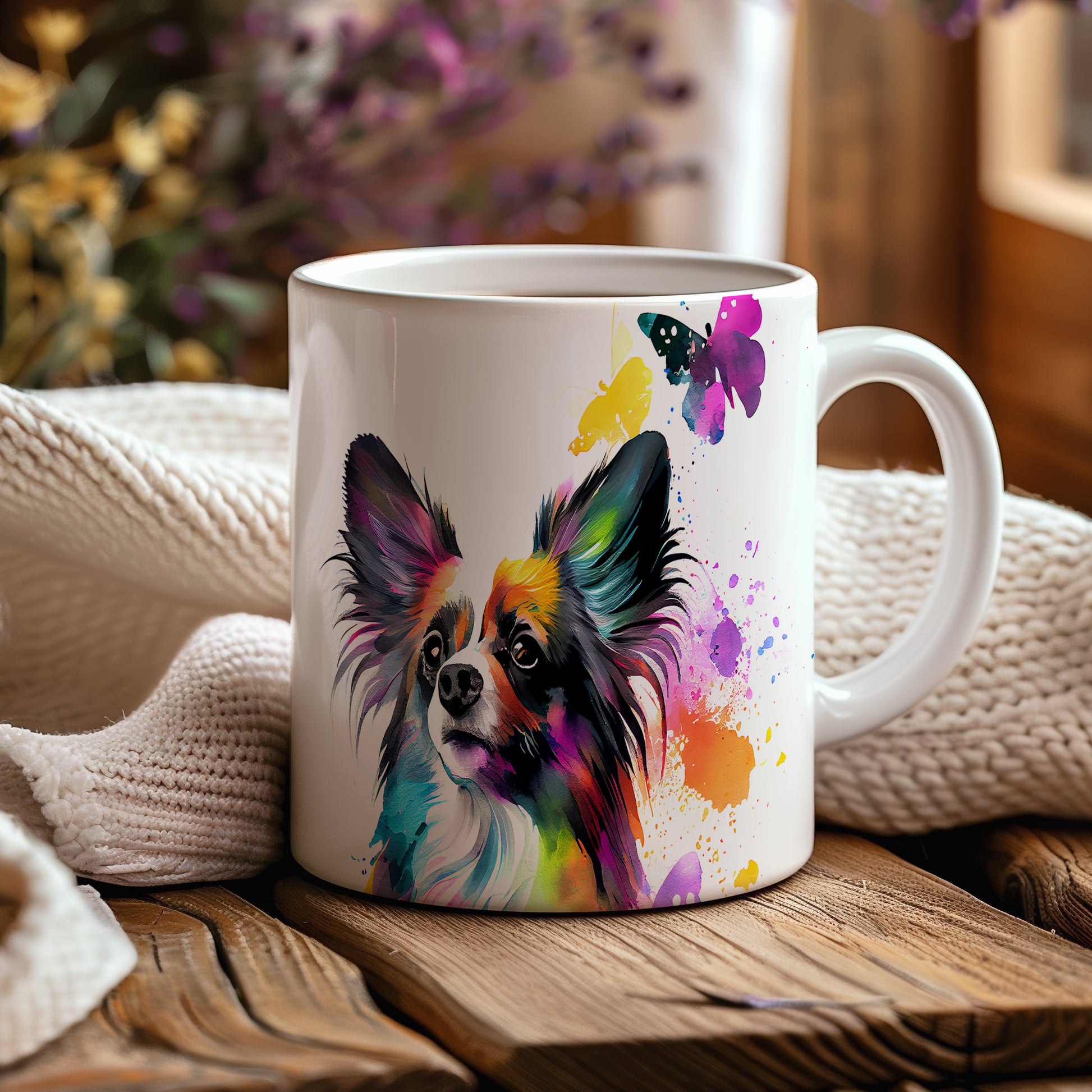 Tento originální hrnek s uměleckým zobrazením psa plemene papillon je ideální pro milovníky zvířat. Vytvořte si příjemné chvíle s oblíbeným nápojem v elegantním designu.