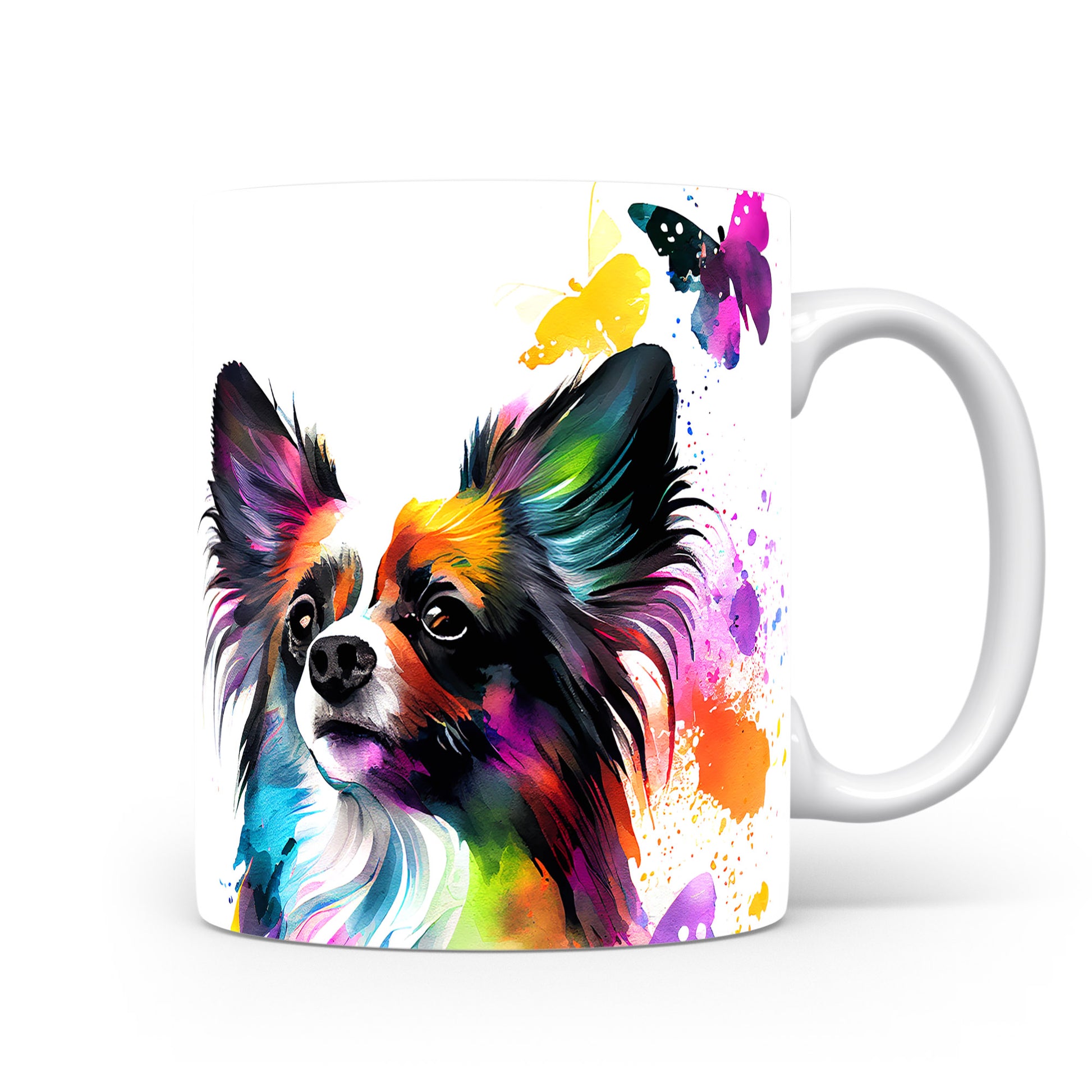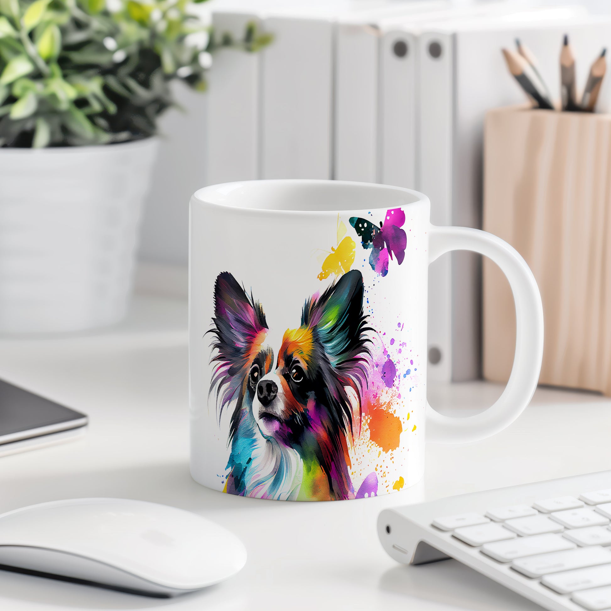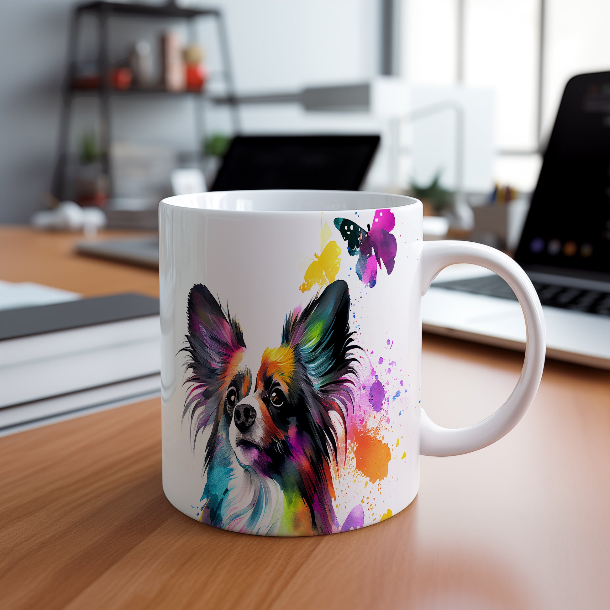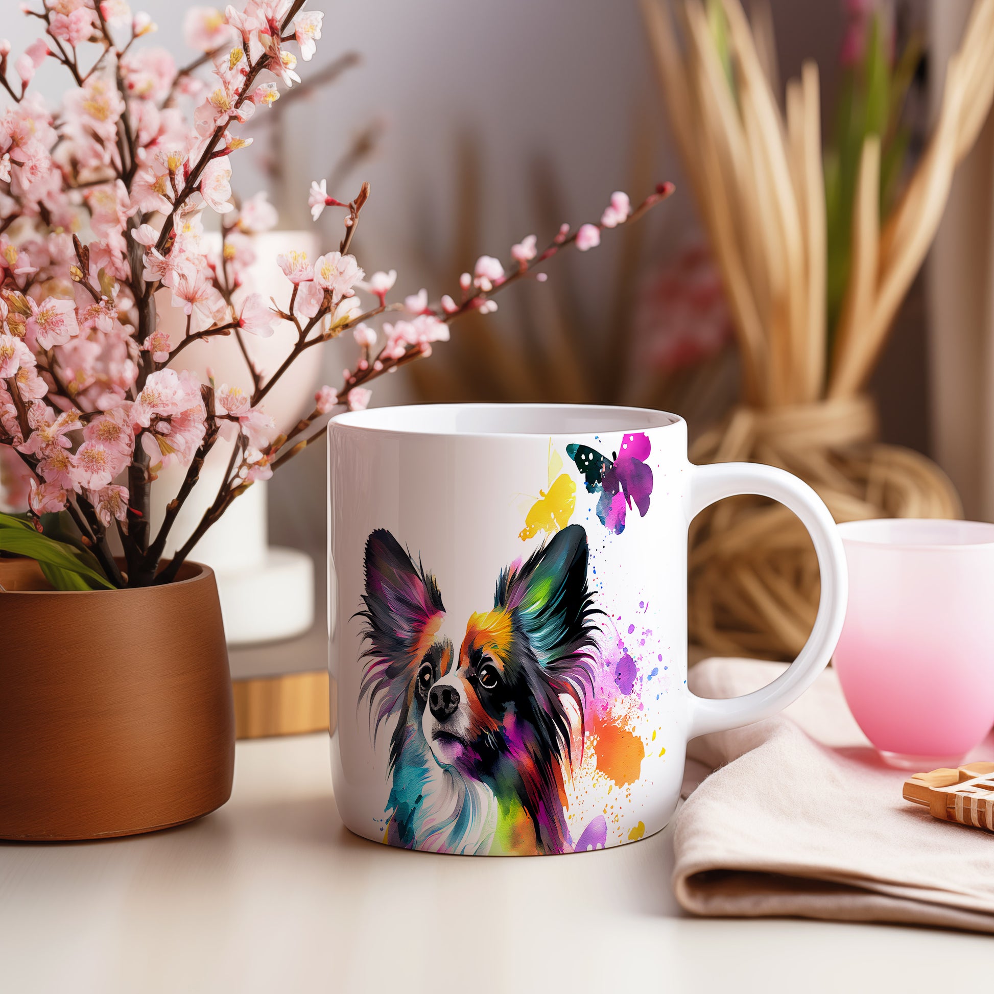 Tento originální hrnek s uměleckým zobrazením psa plemene papillon je ideální pro milovníky zvířat. Vytvořte si příjemné chvíle s oblíbeným nápojem v elegantním designu.