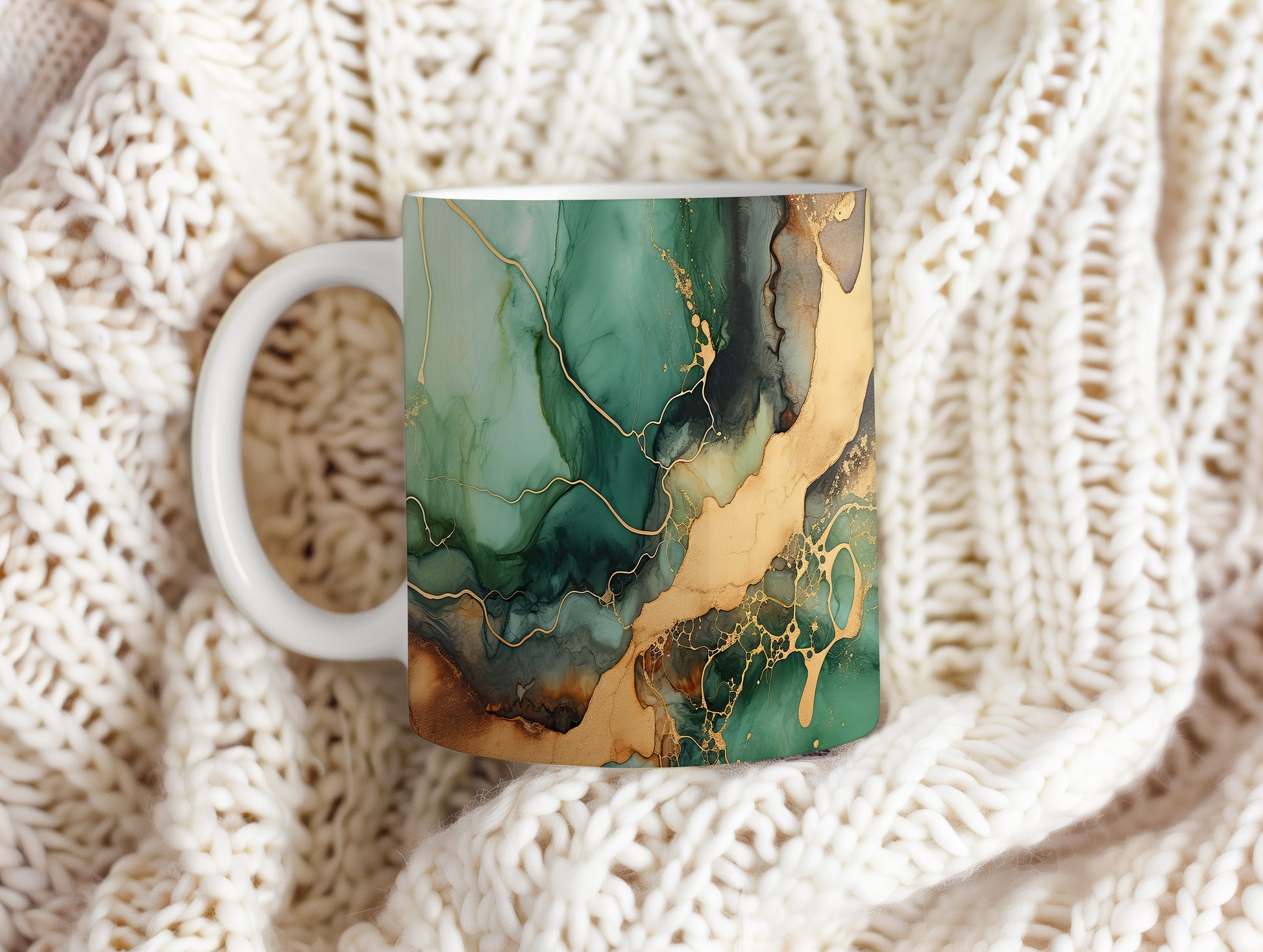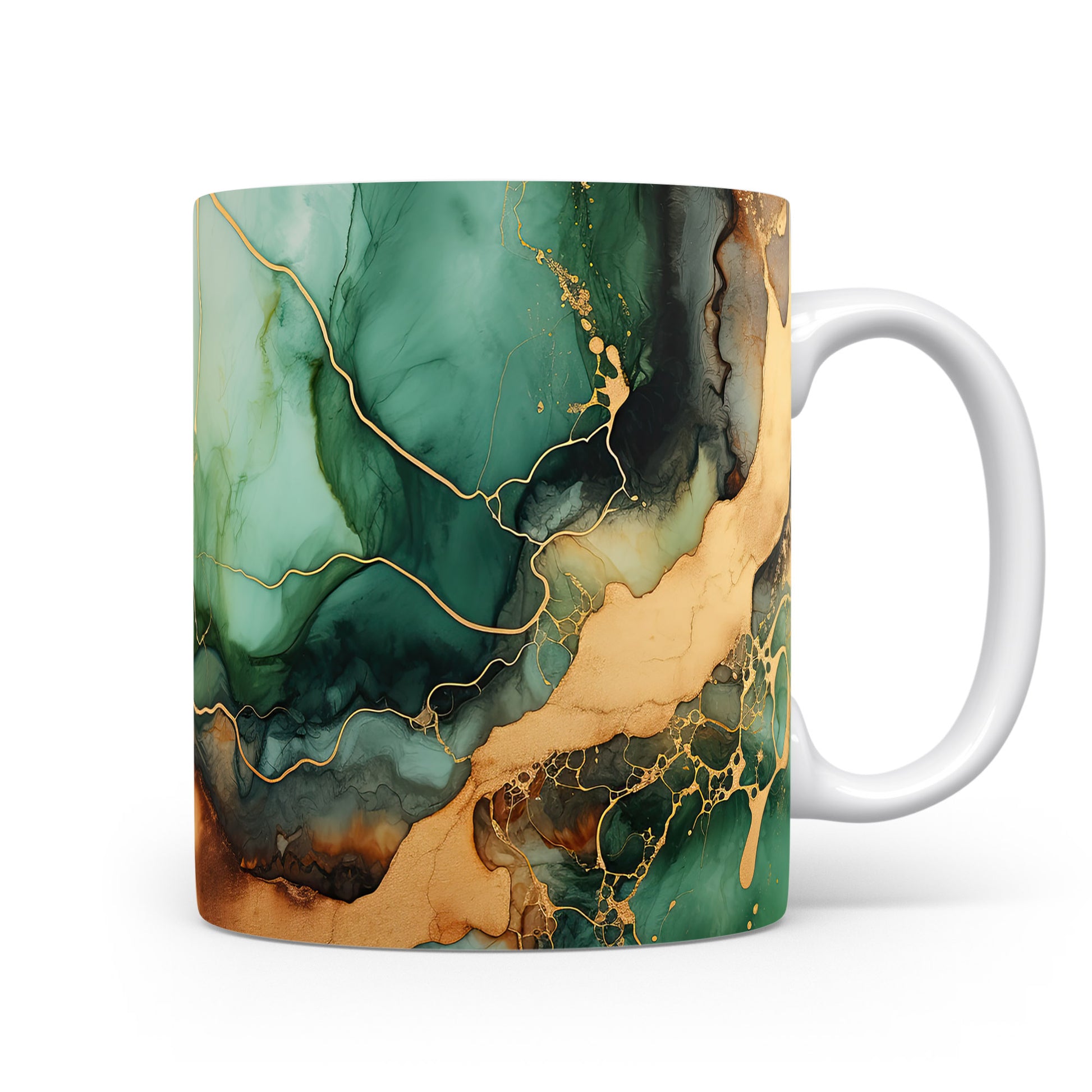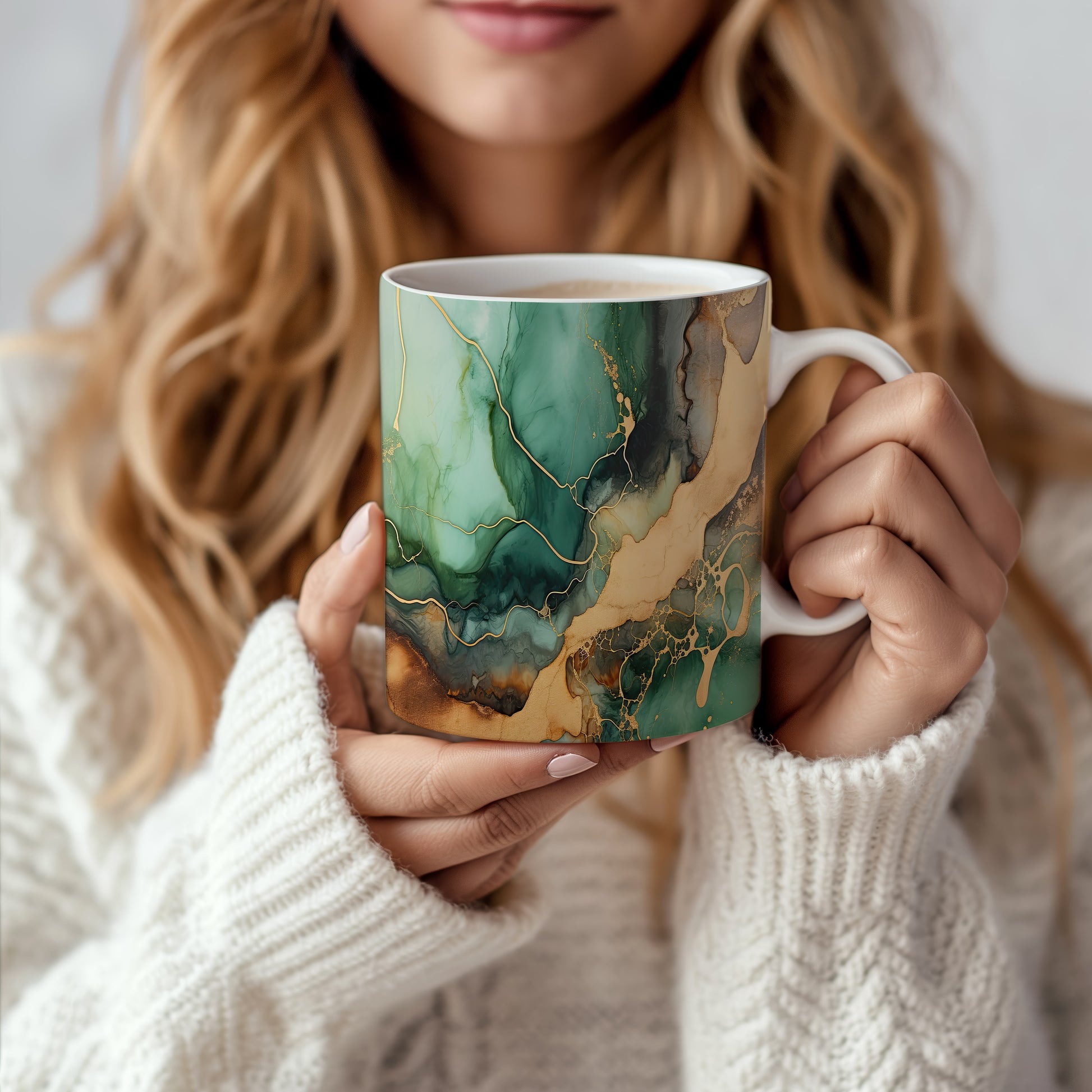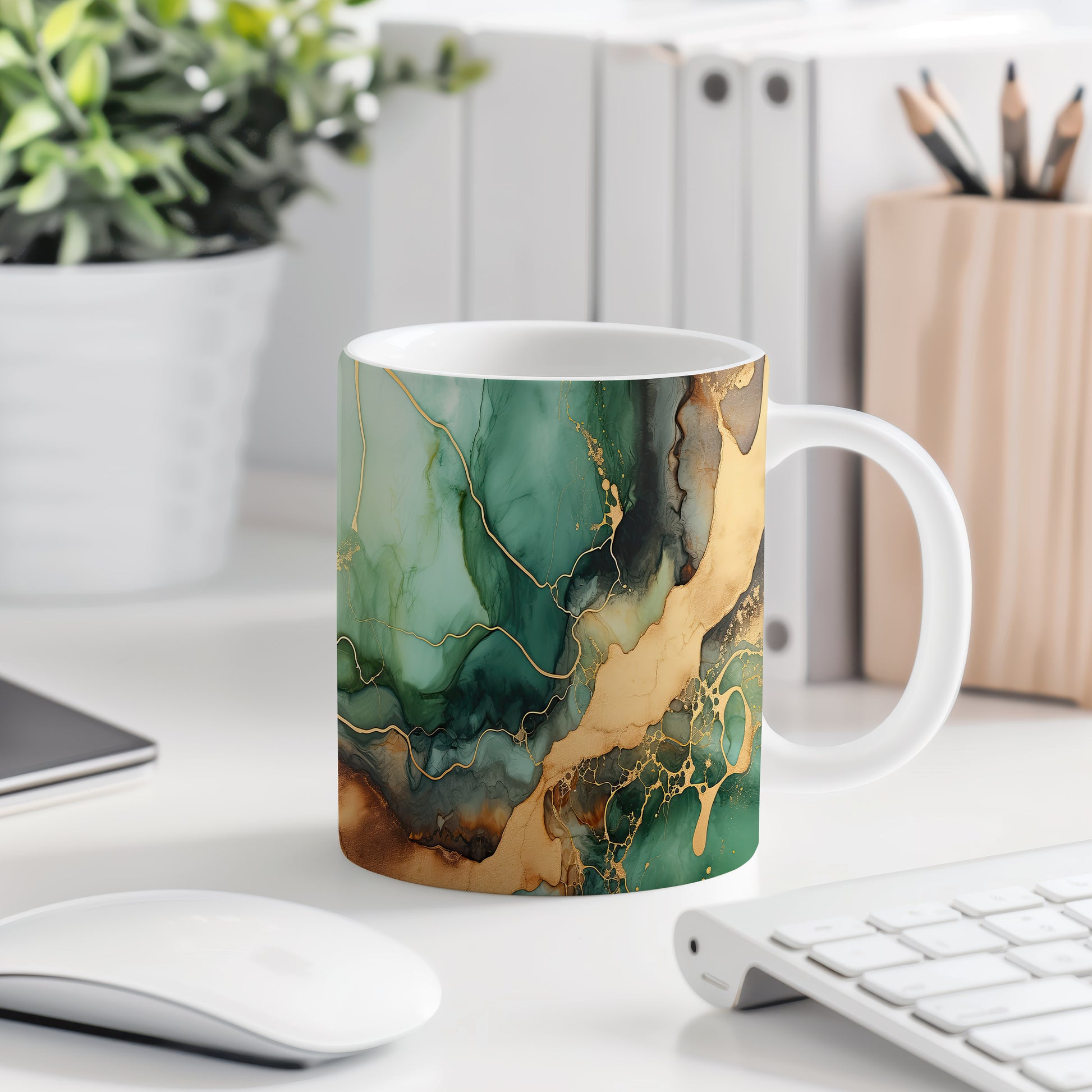 Elegantní hrnek s abstraktním zeleným motivem a zlatými detaily