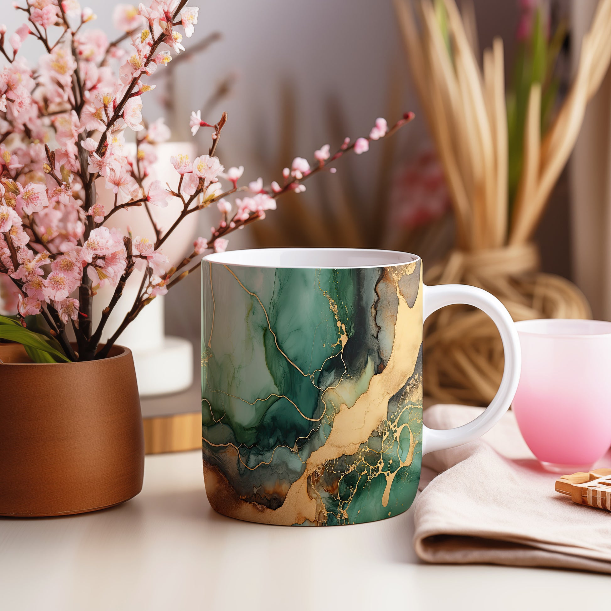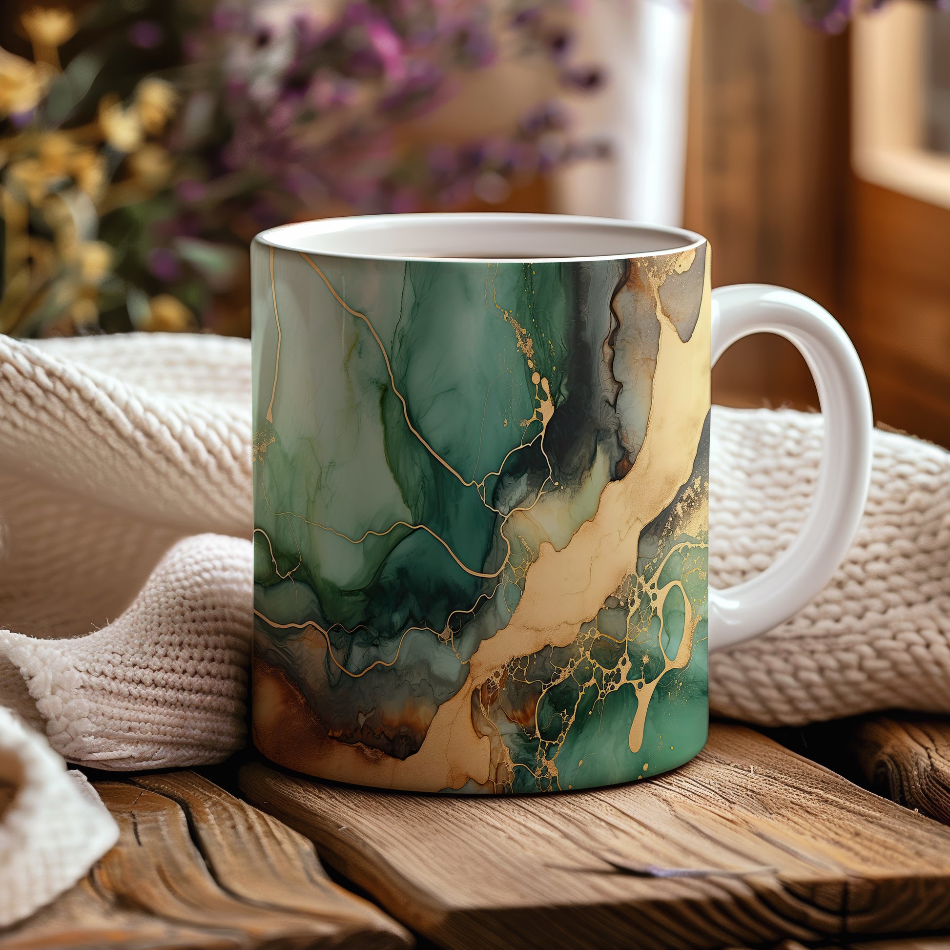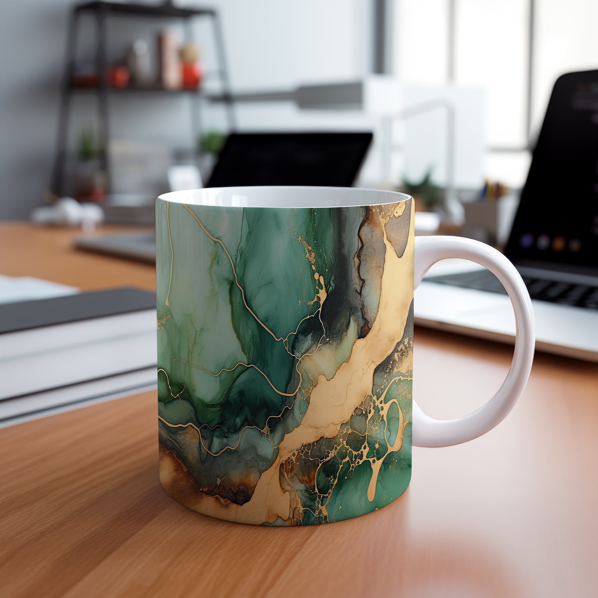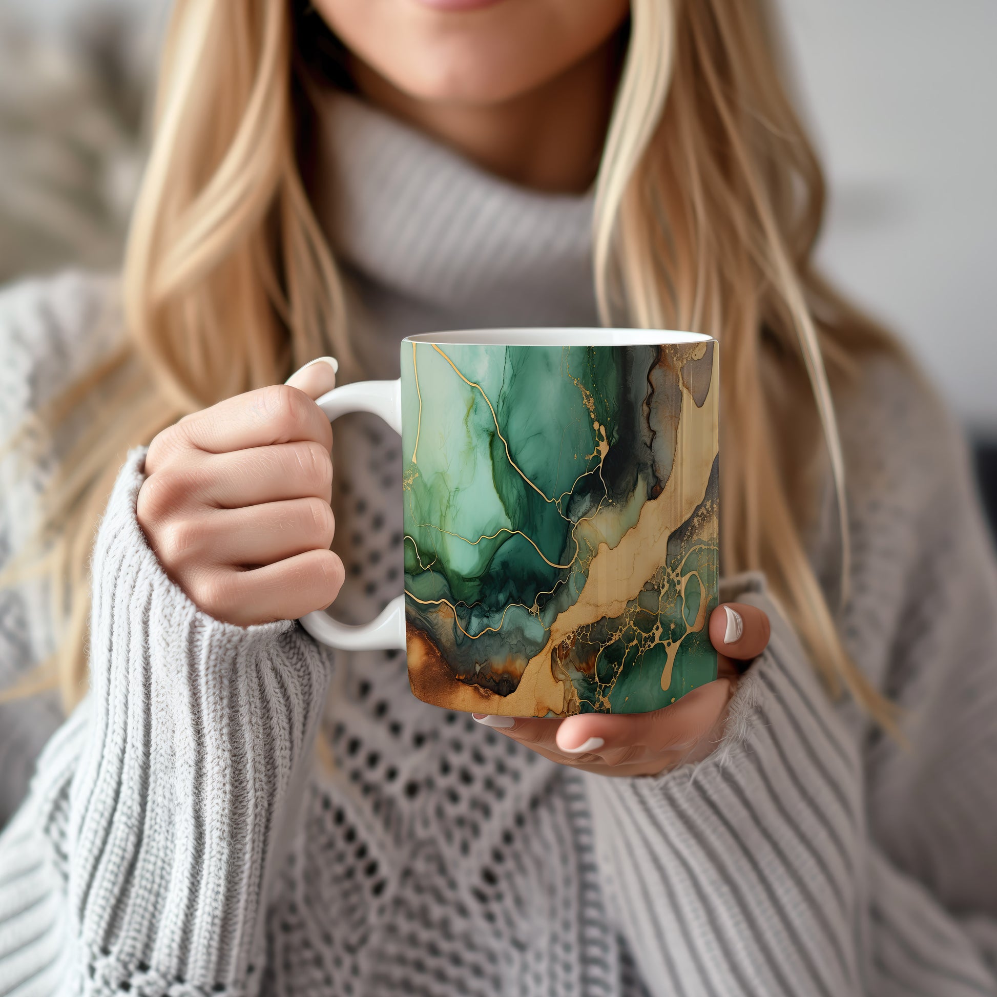 Elegantní hrnek s abstraktním zeleným motivem a zlatými detaily