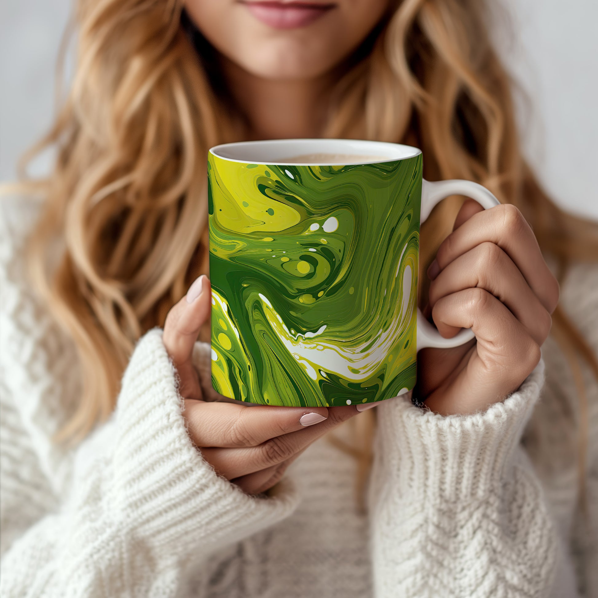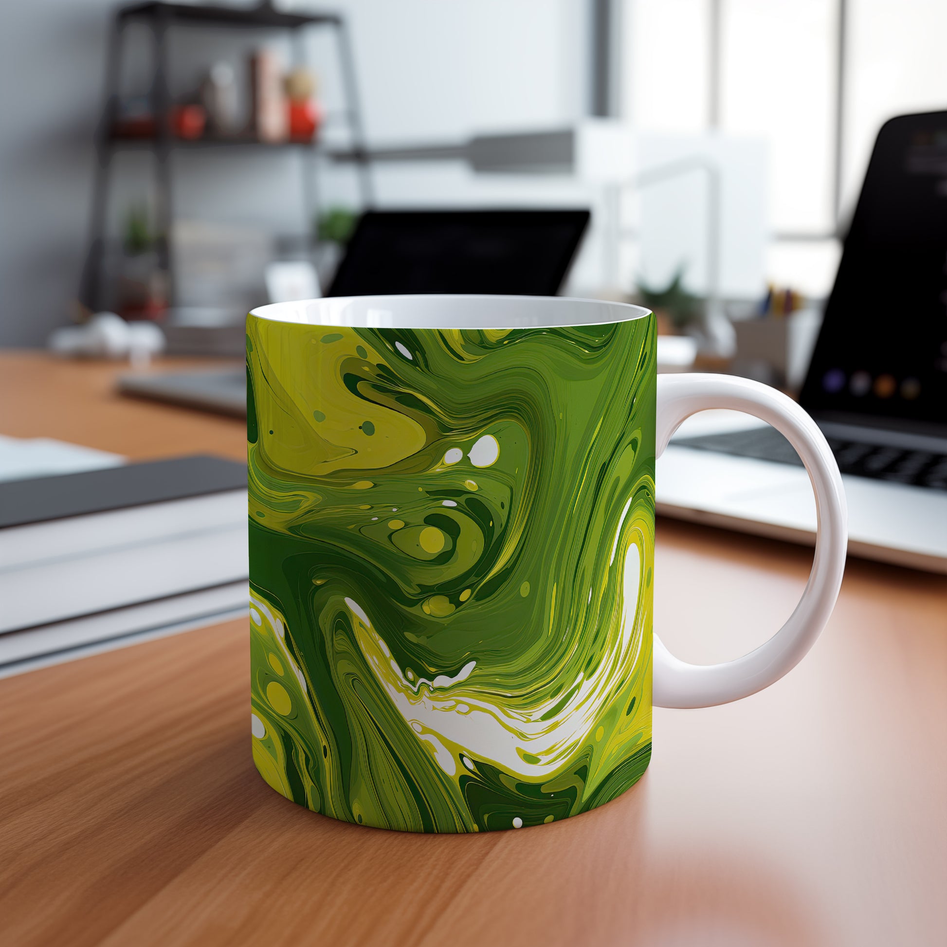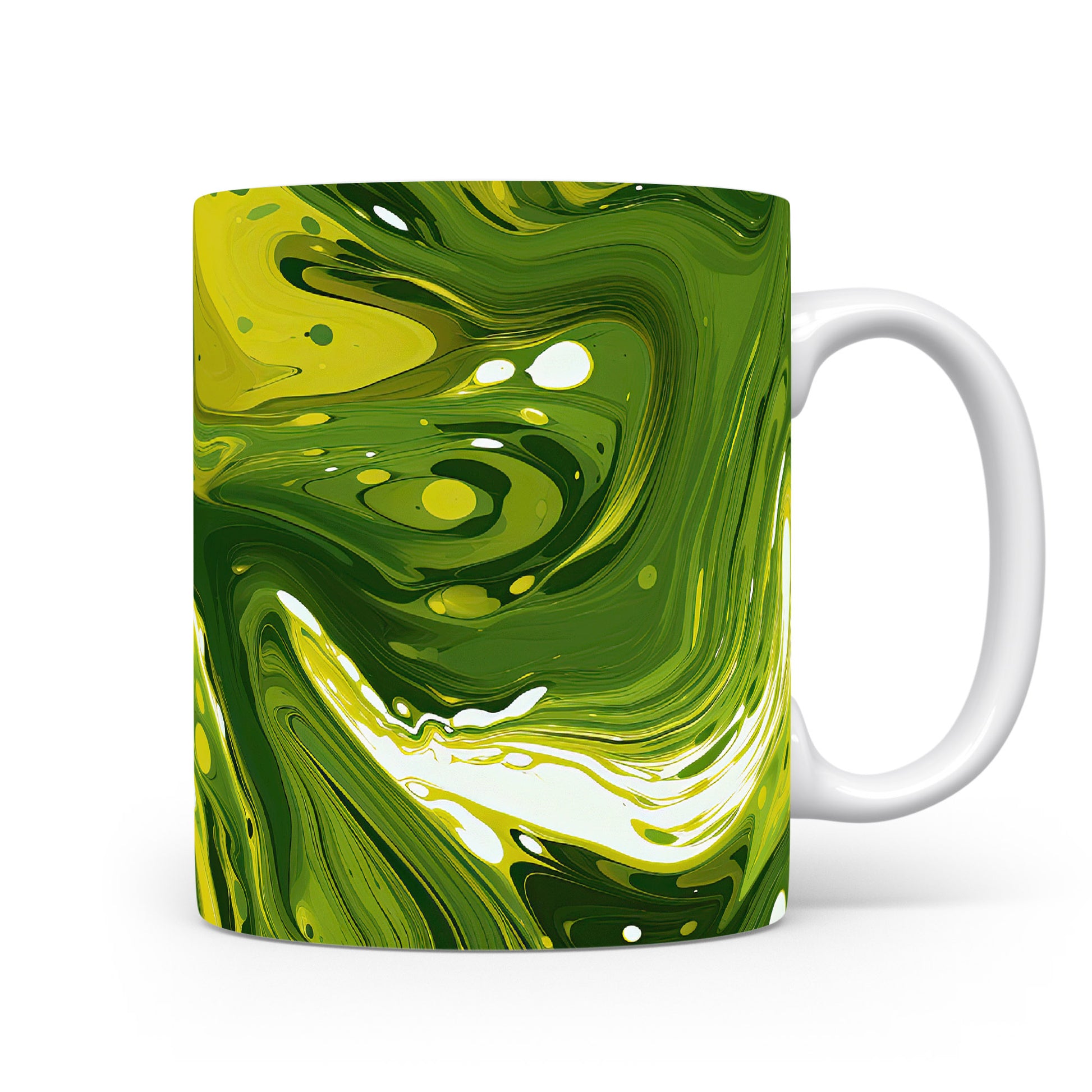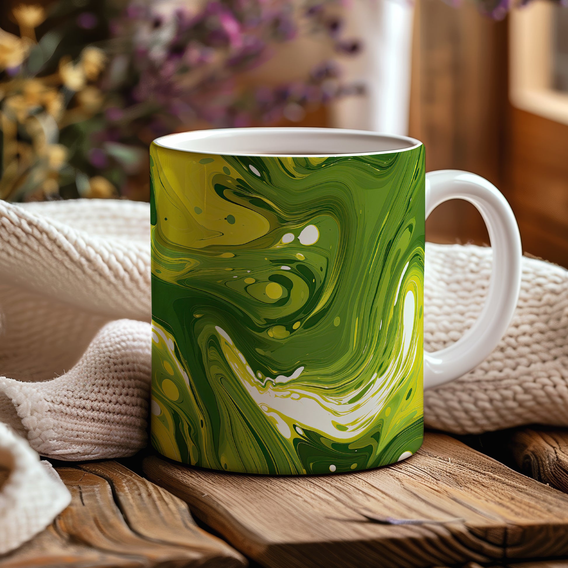 Tento hrnek s unikátním abstraktním vzorem v zelených tónech je ideální pro vaši ranní kávu nebo čaj. Vynikněte s tímto stylovým kouskem, který oživí váš stůl.