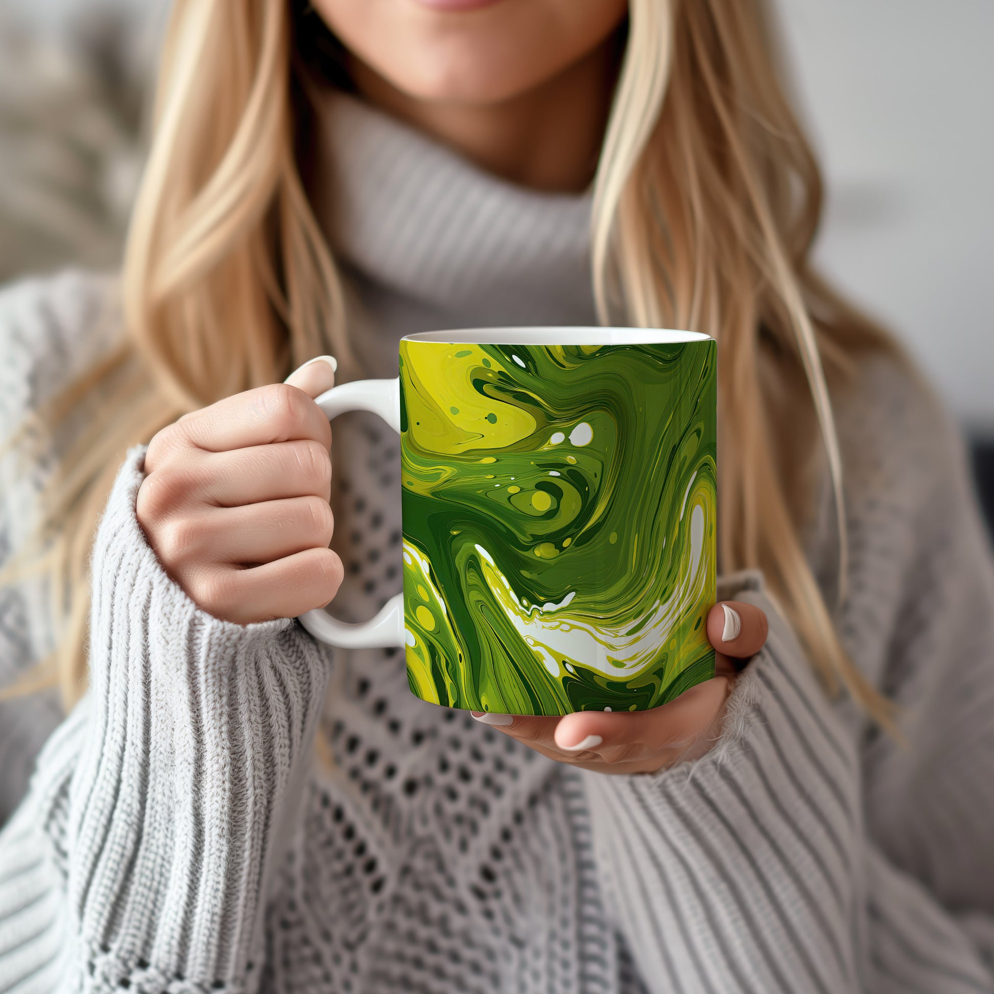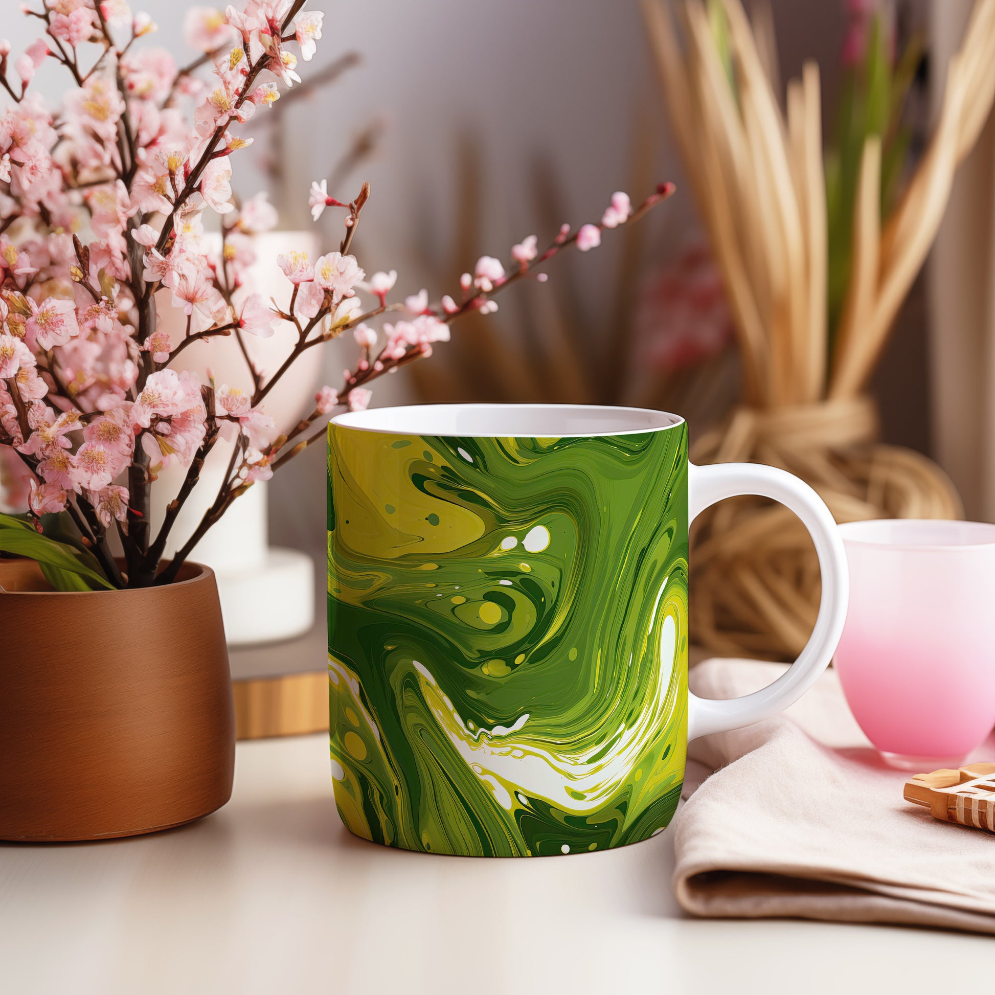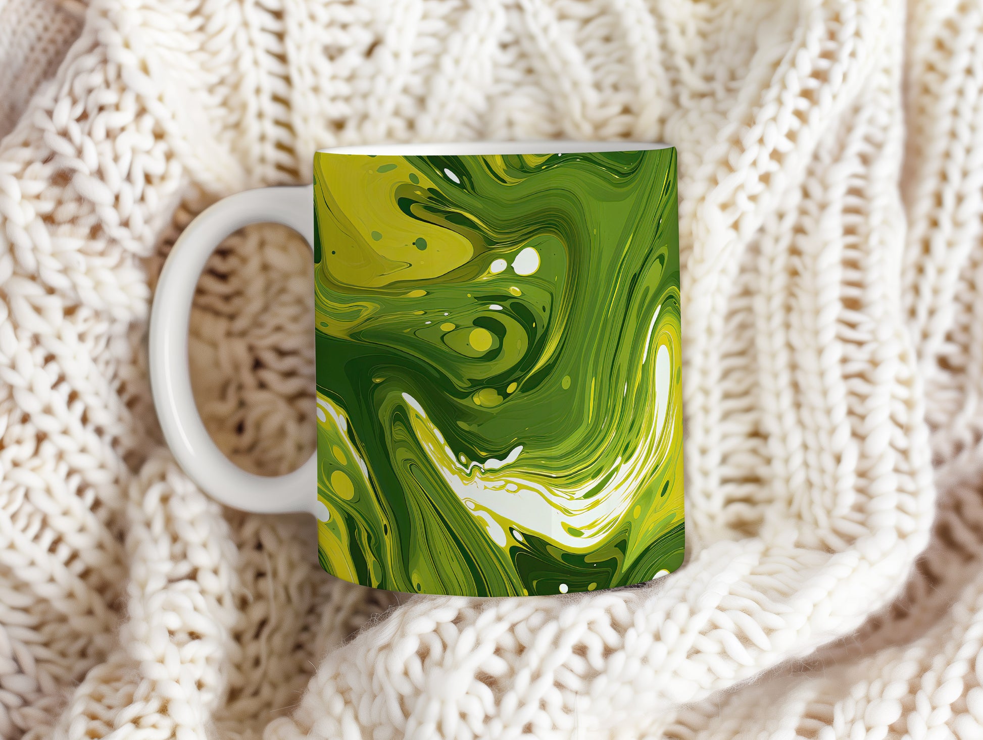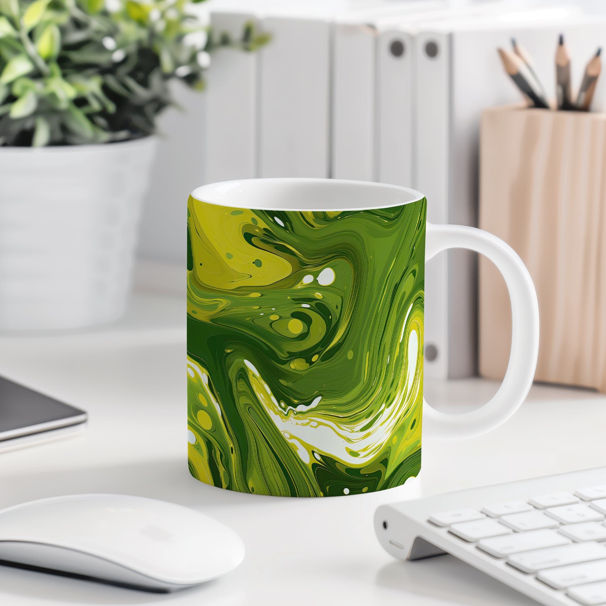 Tento hrnek s unikátním abstraktním vzorem v zelených tónech je ideální pro vaši ranní kávu nebo čaj. Vynikněte s tímto stylovým kouskem, který oživí váš stůl.