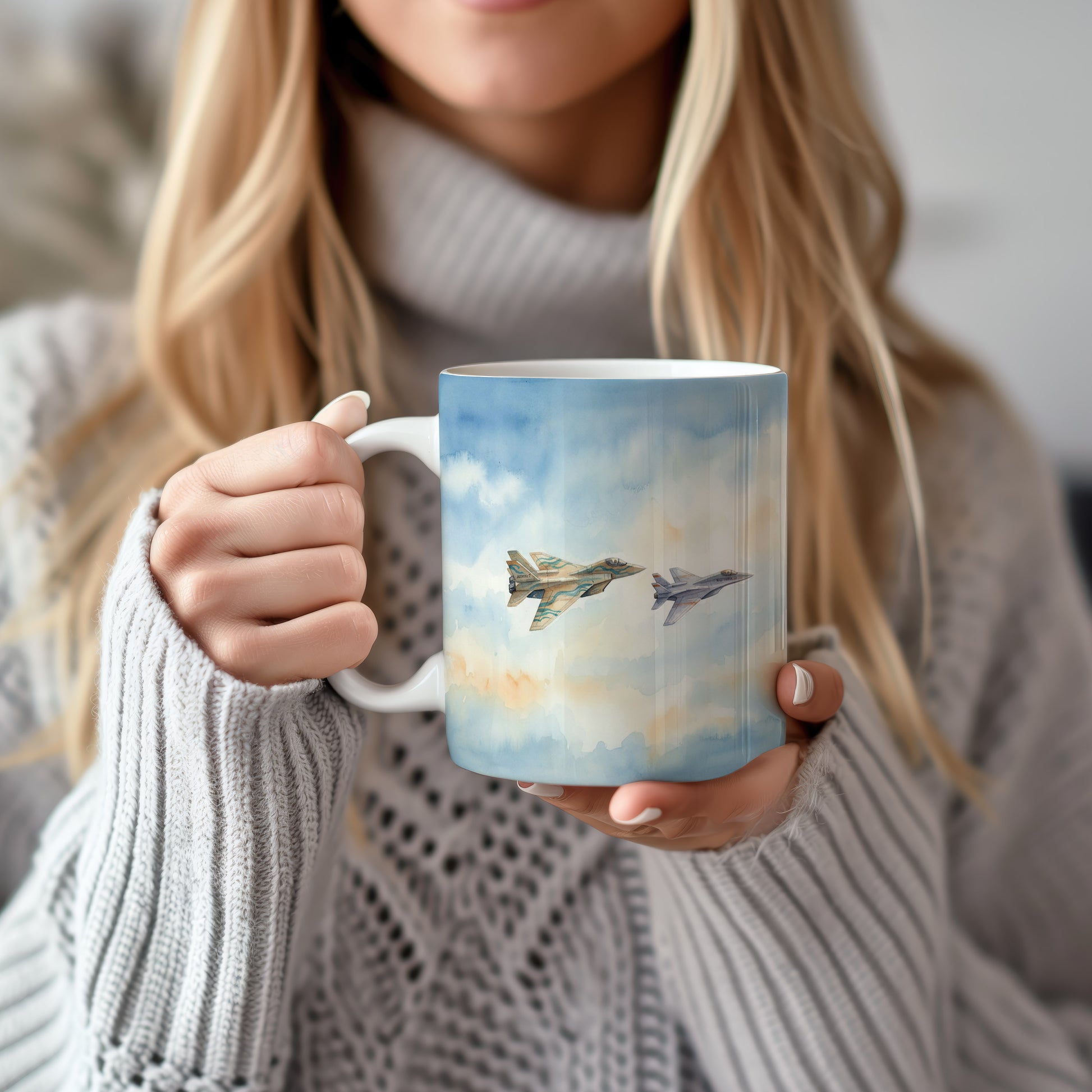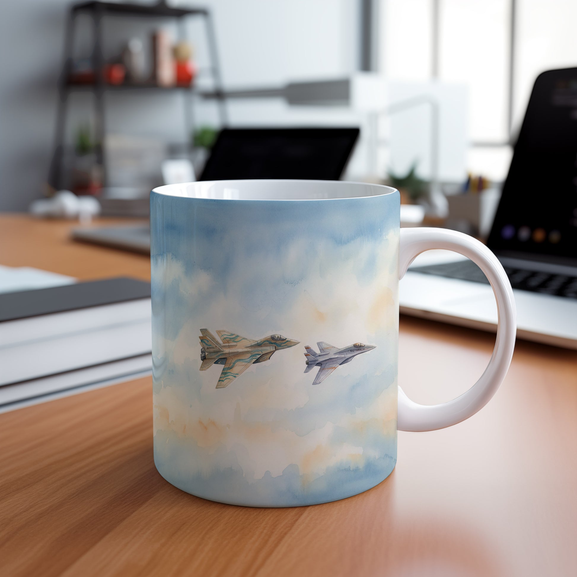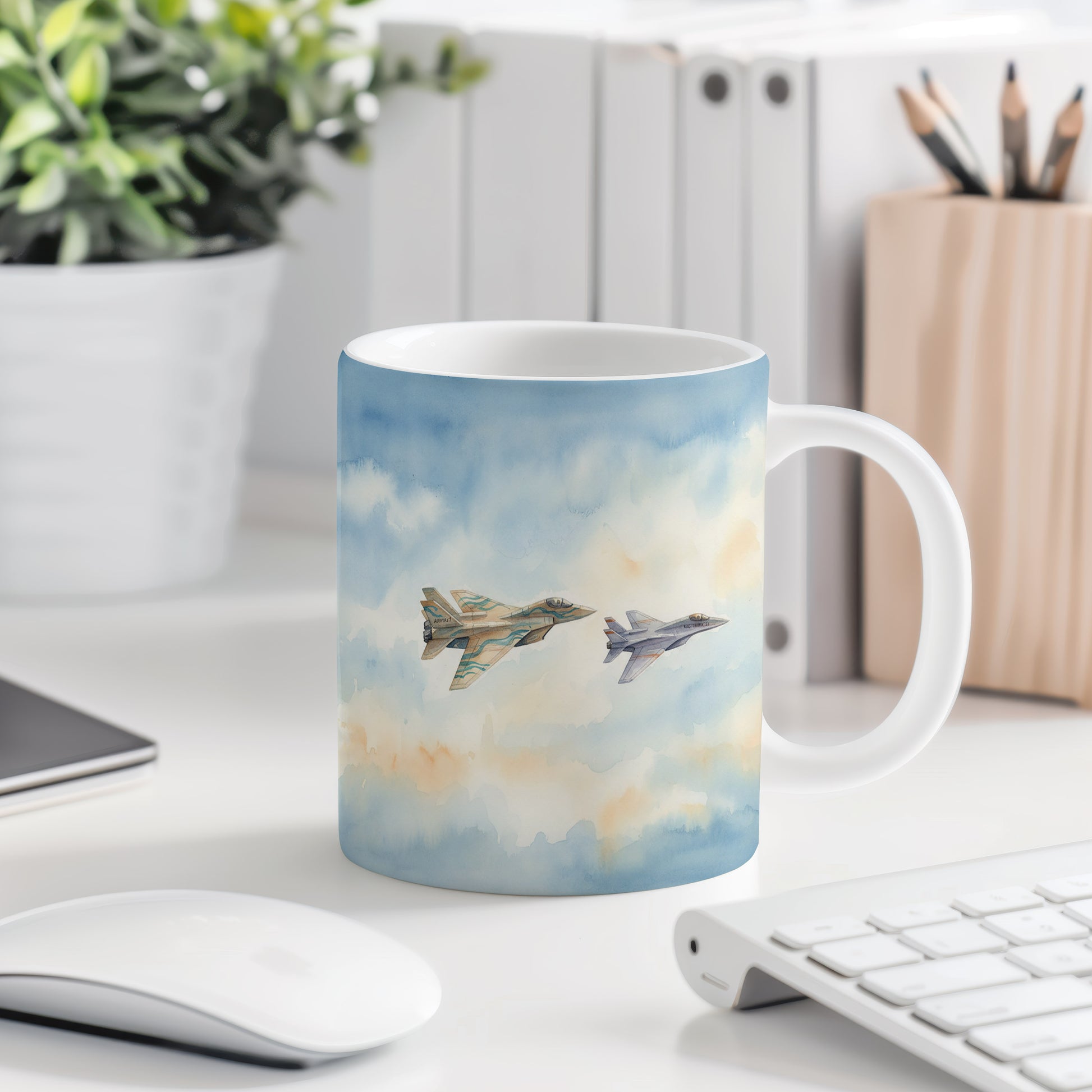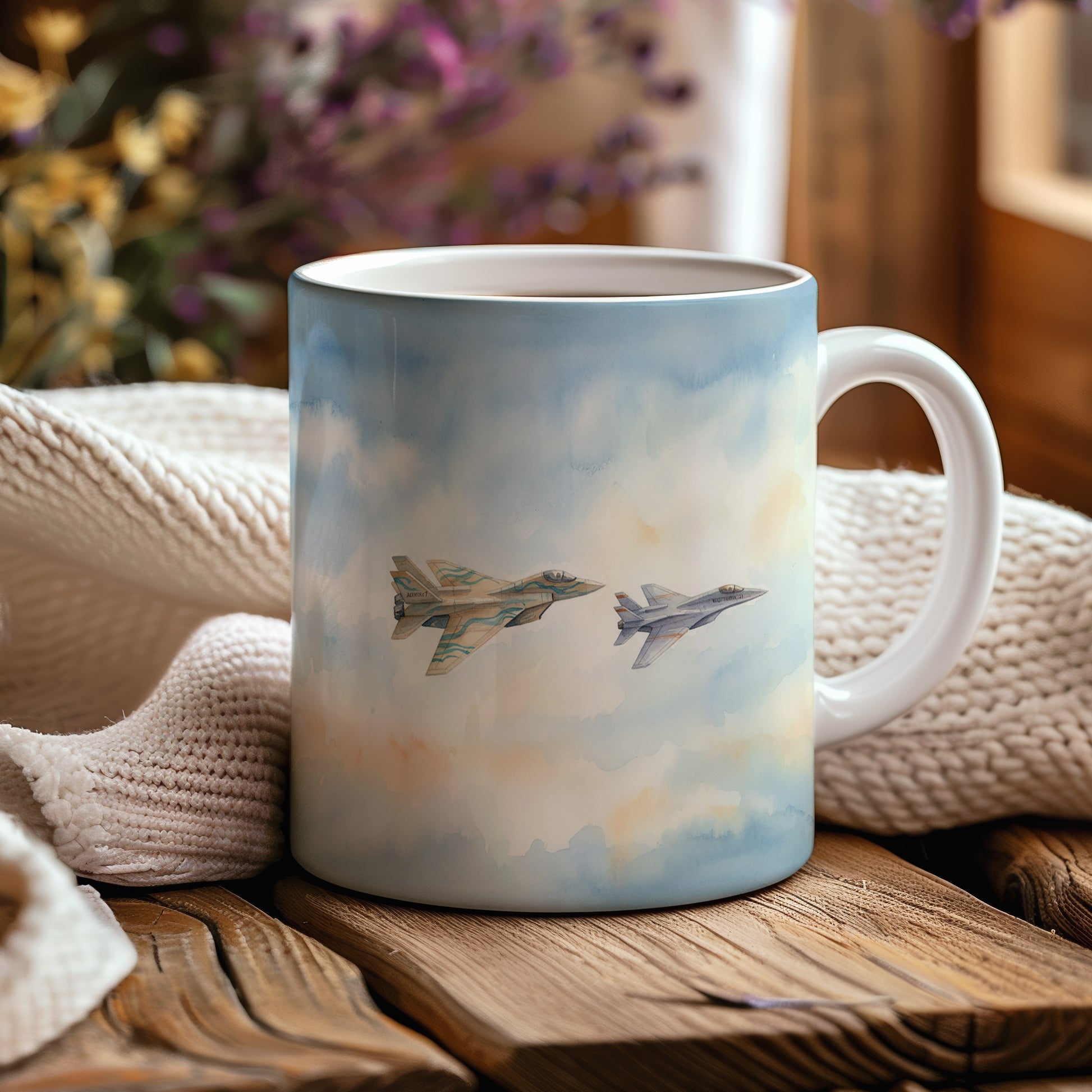 Elegantní hrnek s akvarelovou malbou dvou stíhaček letících na obloze. Ideální pro milovníky letectví. Hrnek 330 ml – vhodný do myčky i mikrovlnky.