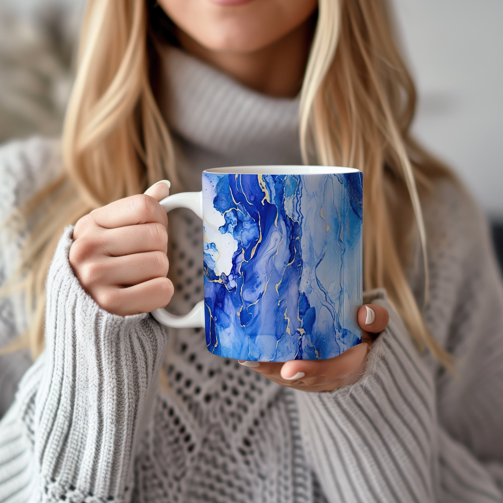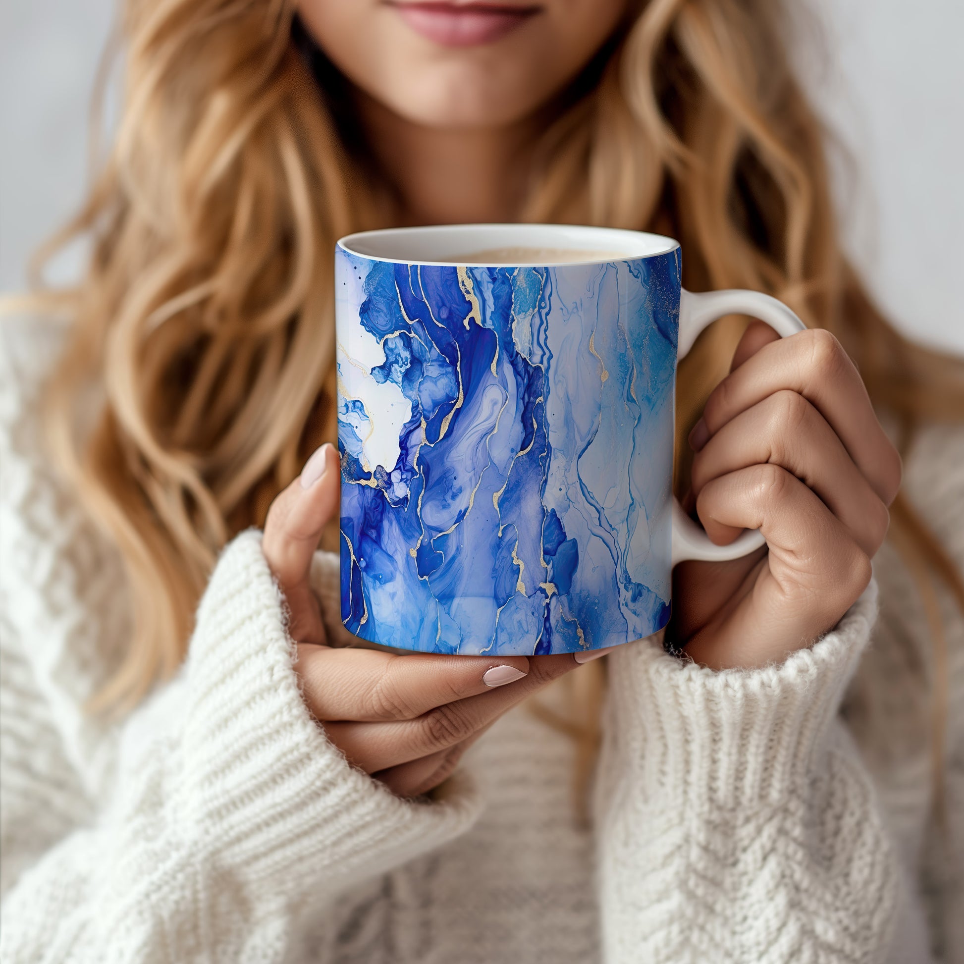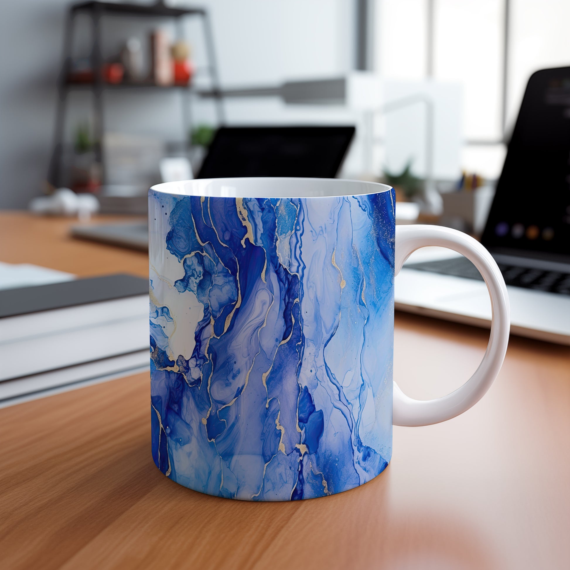 Tento hrnek s akvarelovými žílami v modrých a zlatých tónech přináší elegantní a moderní vzhled. Je ideální pro milovníky umění a skvělým dárkem pro přátele či rodinu. Materiál: keramika. Objem: 330 ml. Vhodné do myčky i mikrovlnky. Díky svému designu přidává každodennímu pití kávy nebo čaje na stylu.