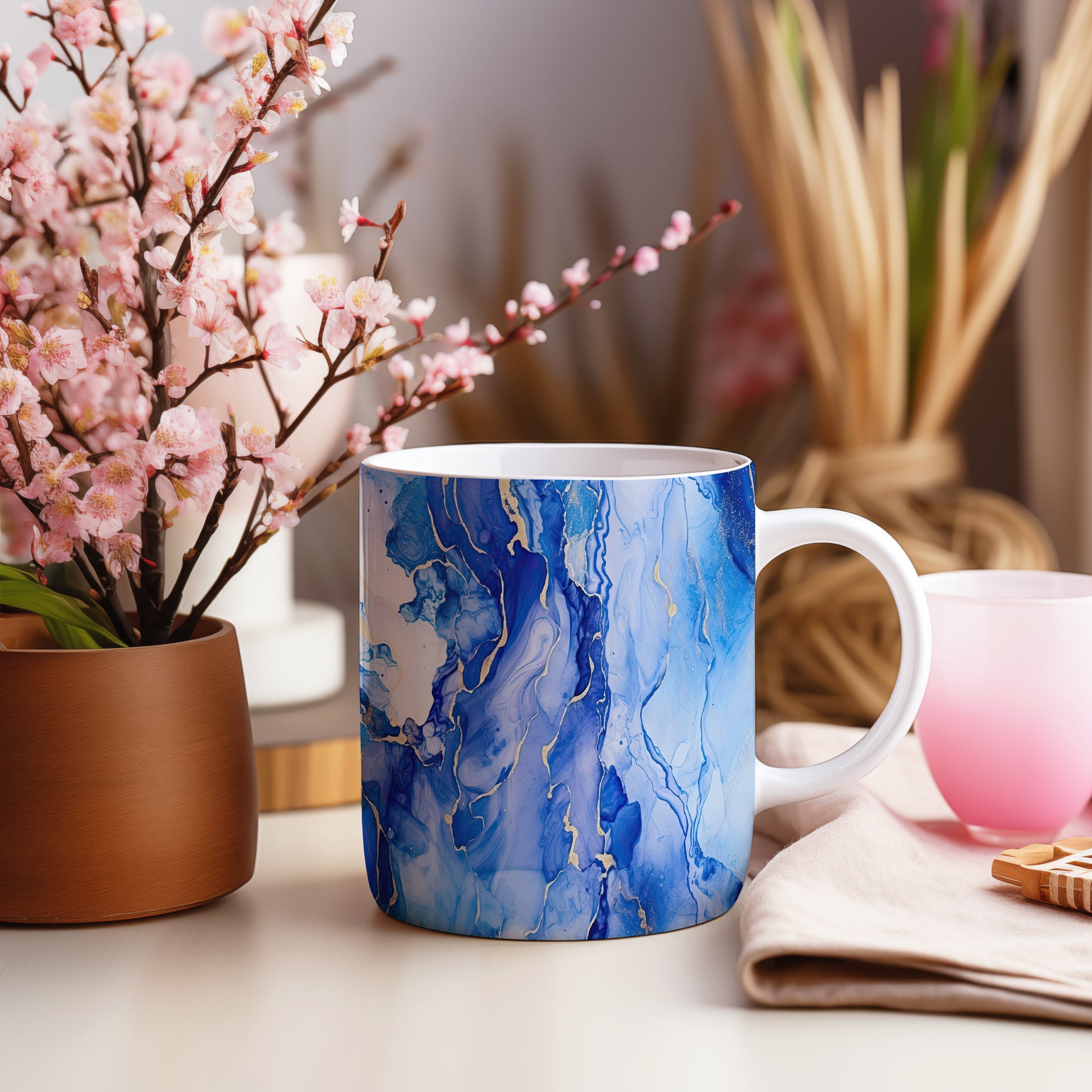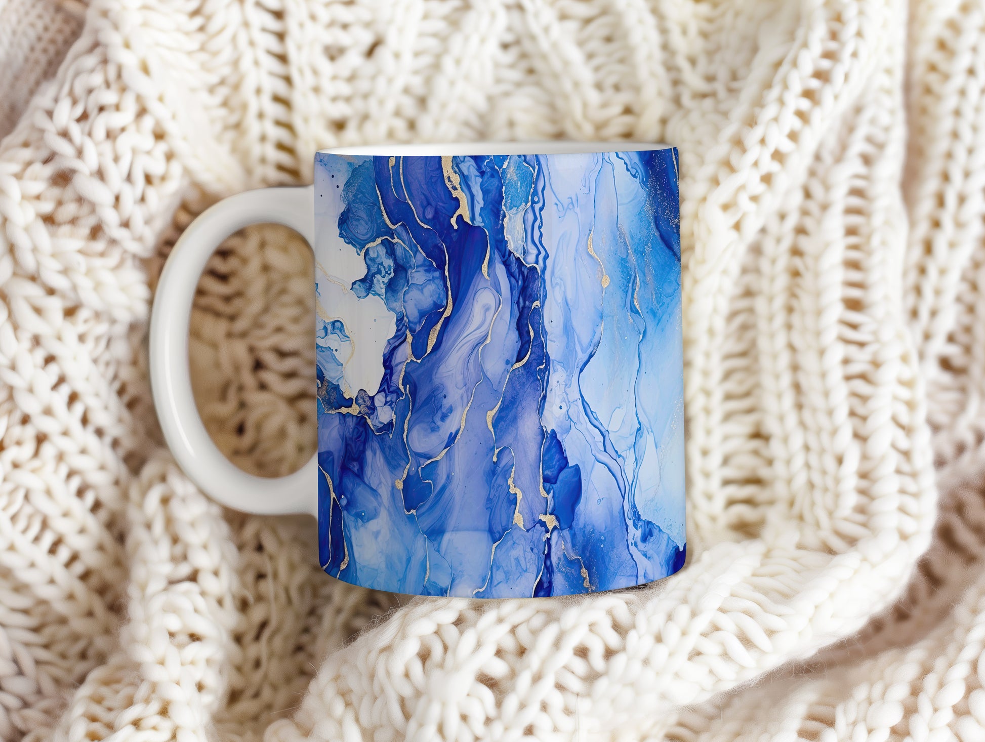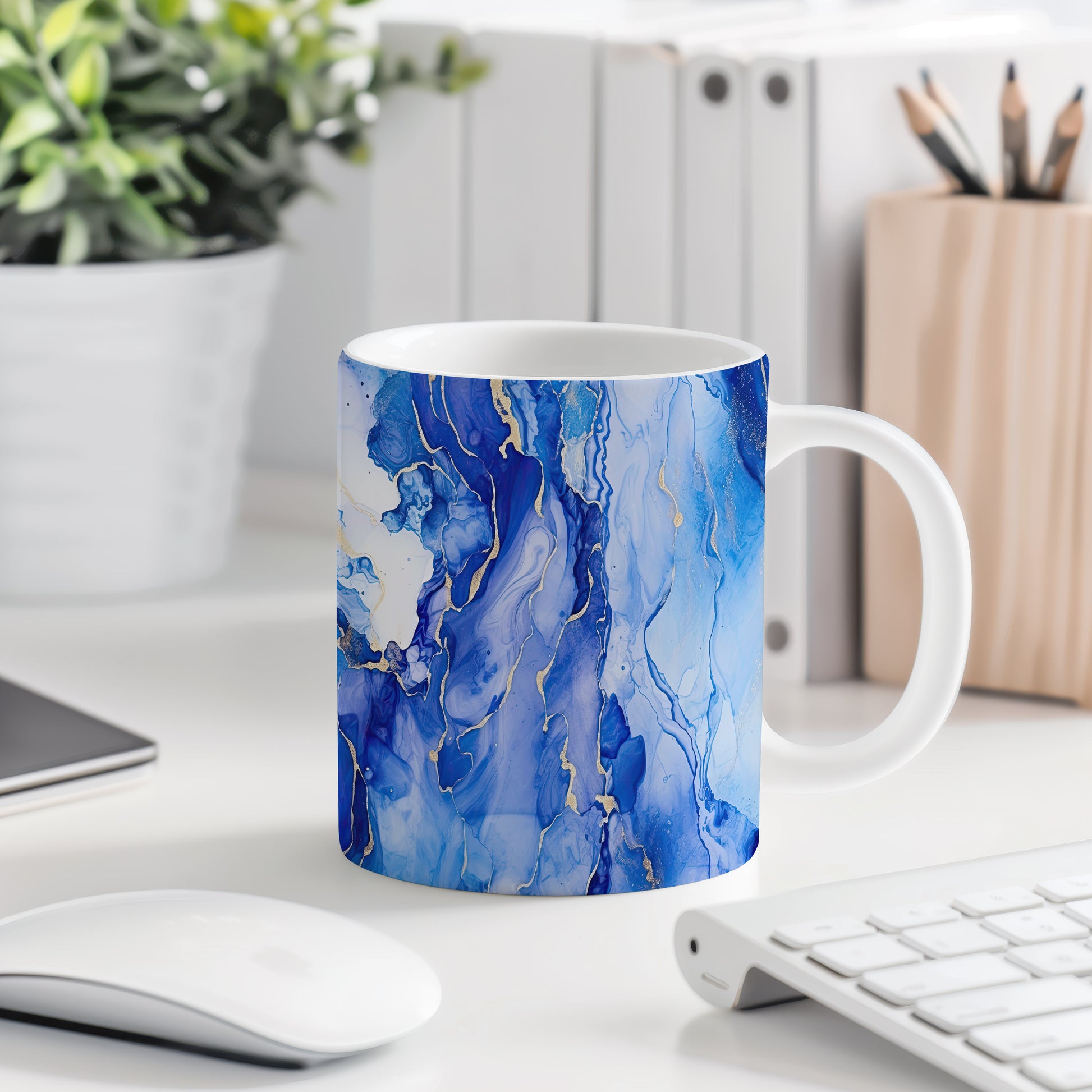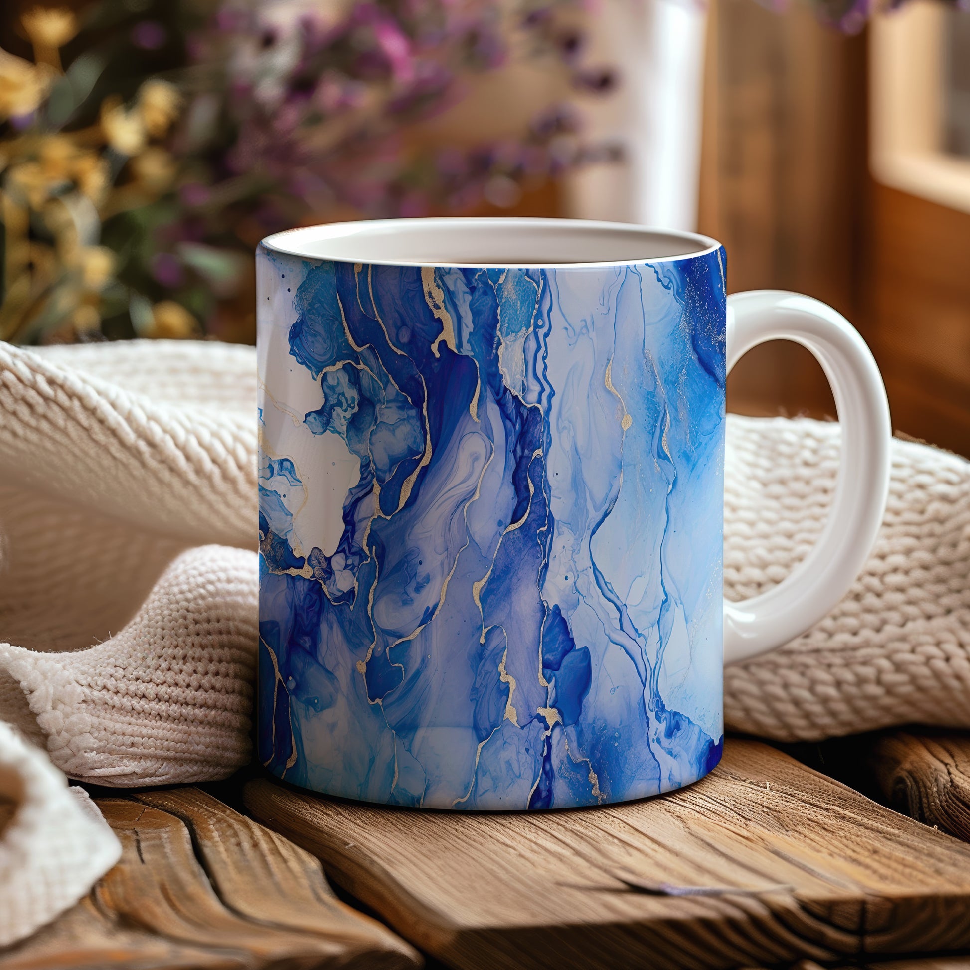 Tento hrnek s akvarelovými žílami v modrých a zlatých tónech přináší elegantní a moderní vzhled. Je ideální pro milovníky umění a skvělým dárkem pro přátele či rodinu. Materiál: keramika. Objem: 330 ml. Vhodné do myčky i mikrovlnky. Díky svému designu přidává každodennímu pití kávy nebo čaje na stylu.