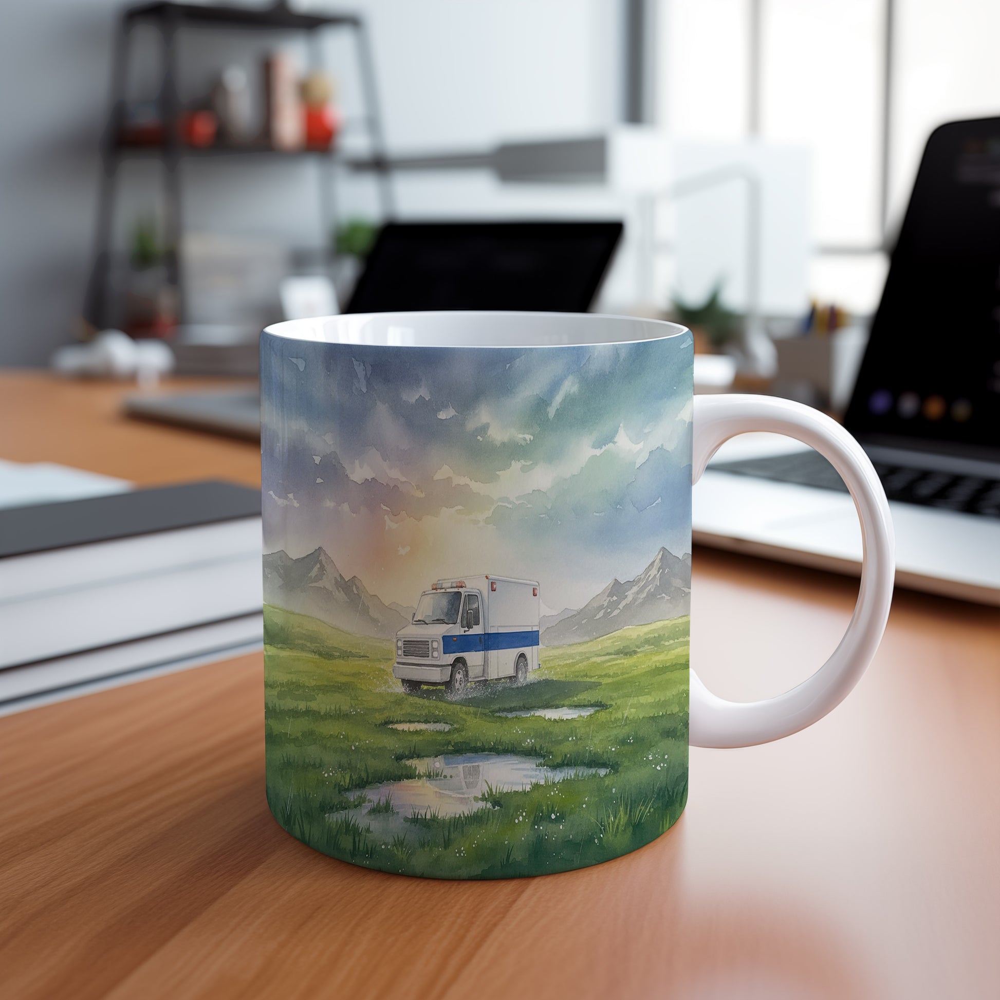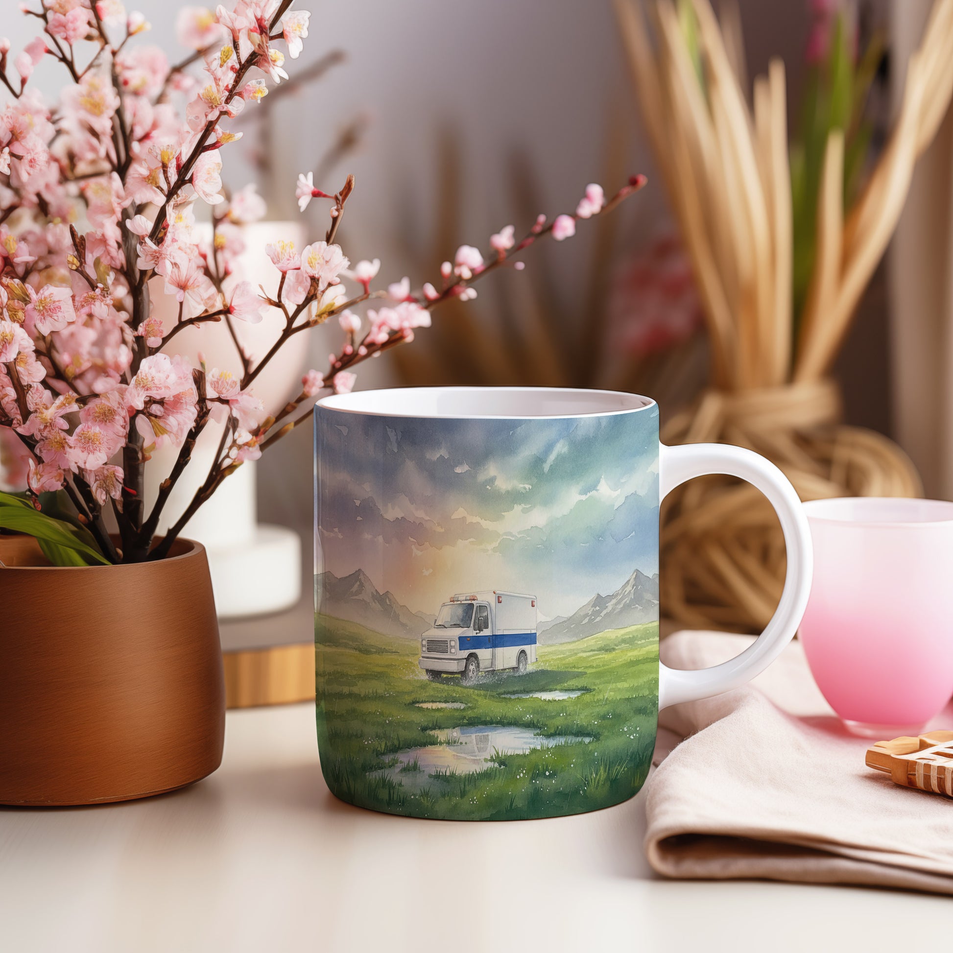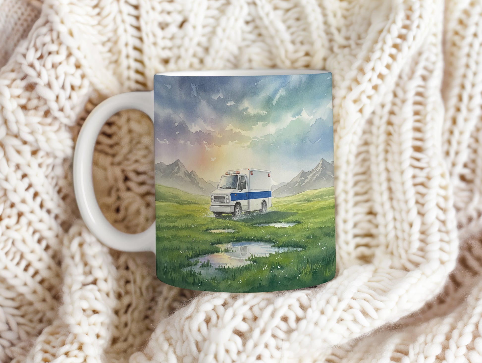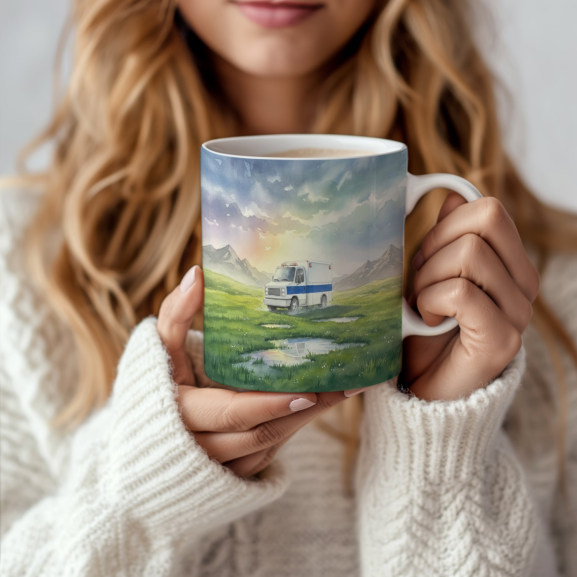 Akvarelový motiv sanitky projíždějící malebnou horskou loukou přináší klid a pohodu. Ideální dárek pro milovníky přírody.