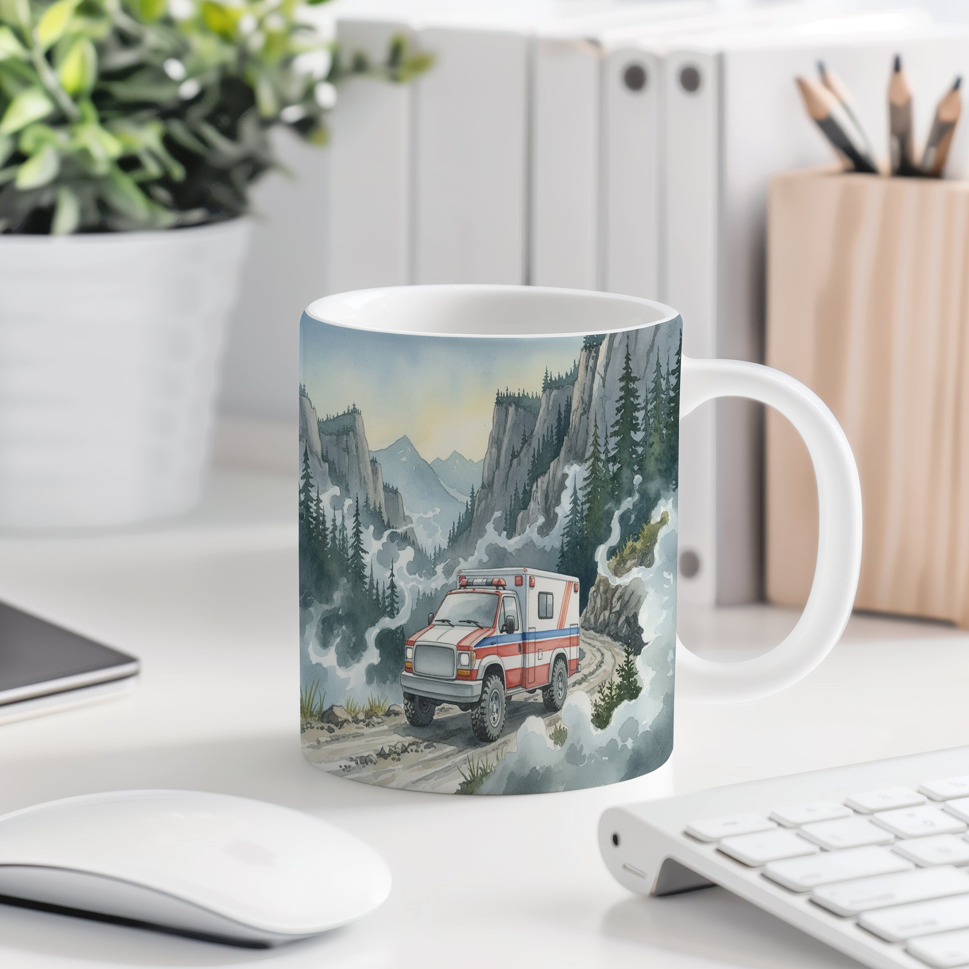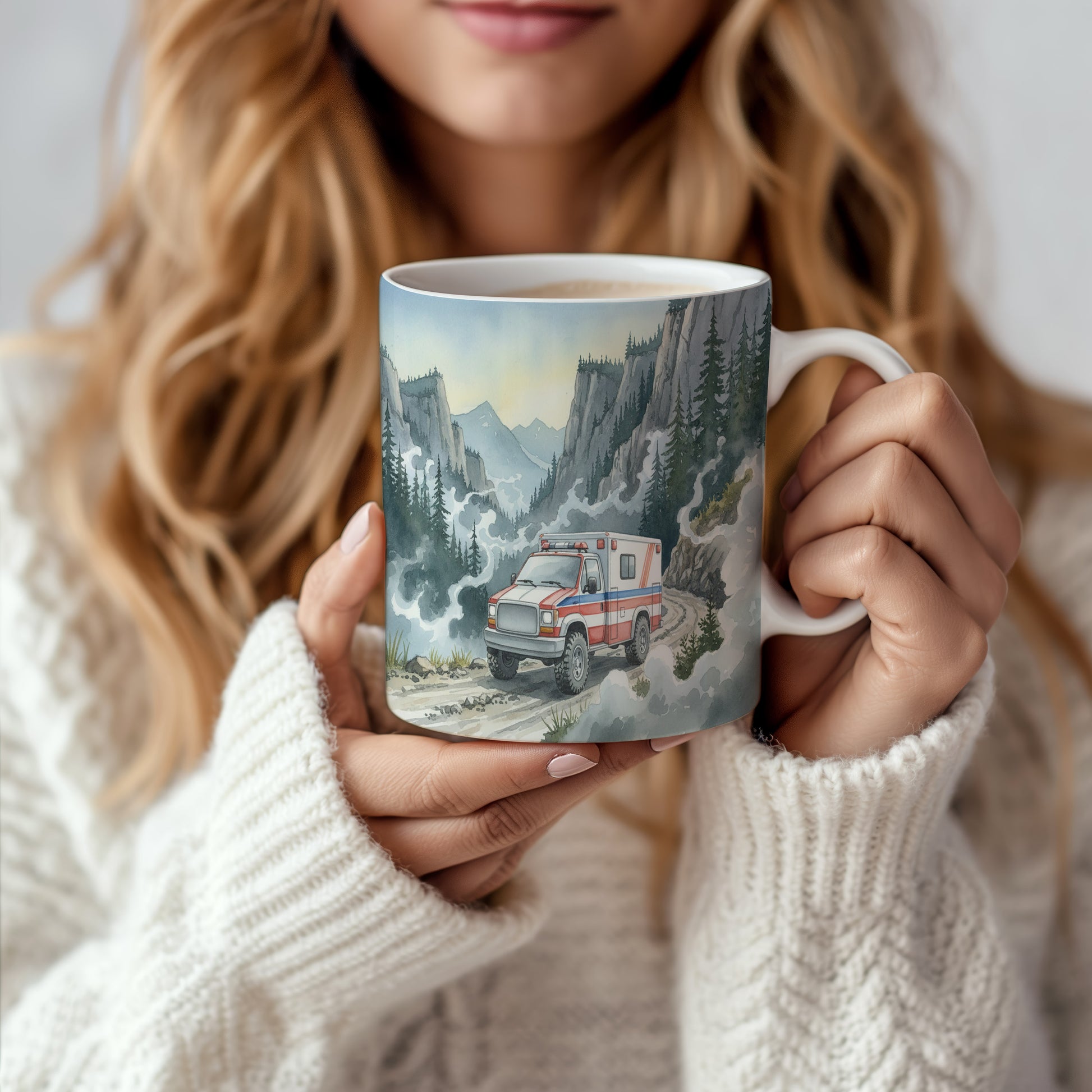 Akvarelový motiv ambulance projíždějící dramatickou horskou krajinou přináší pocit dobrodružství. Hrnek 330 ml – vhodný do myčky i mikrovlnky.