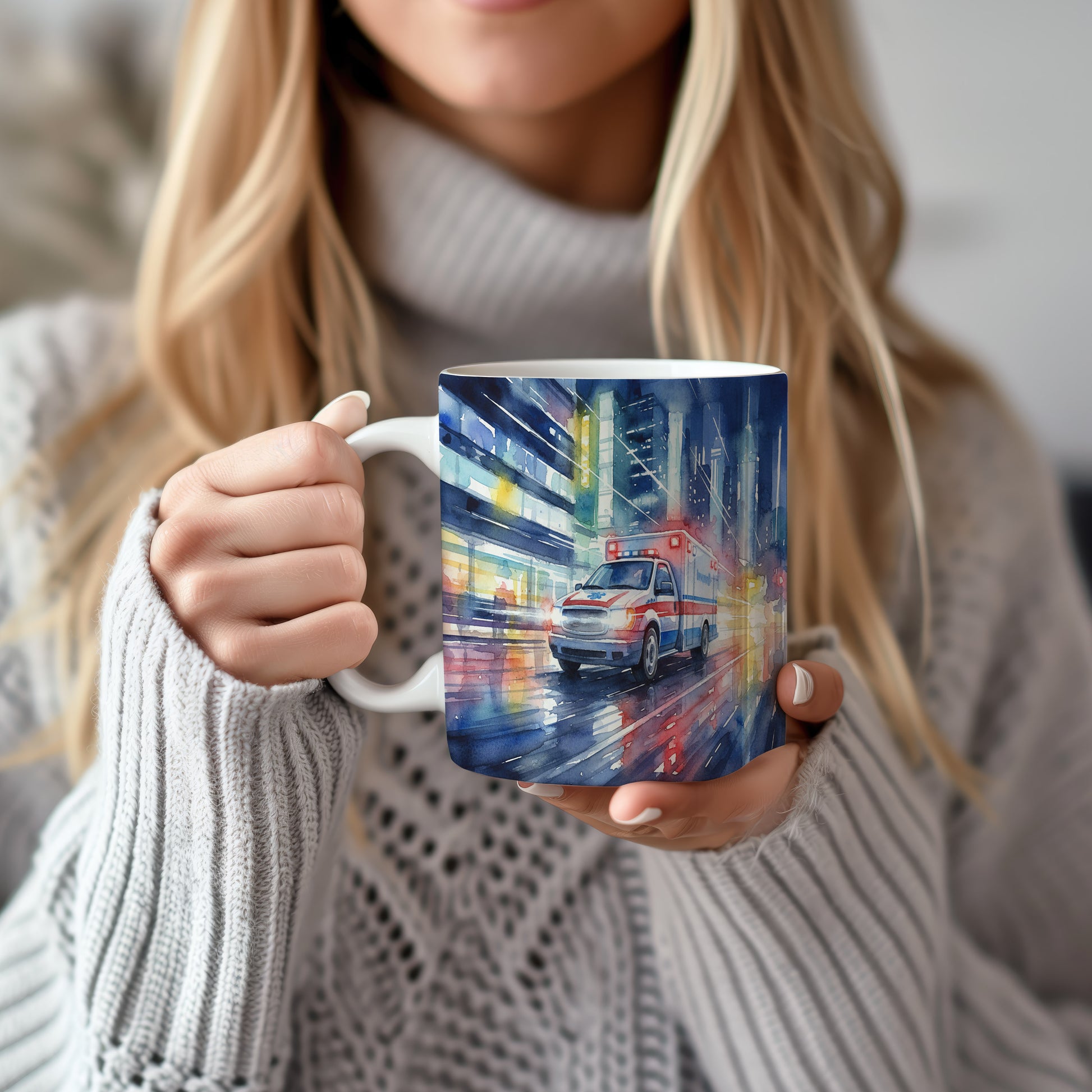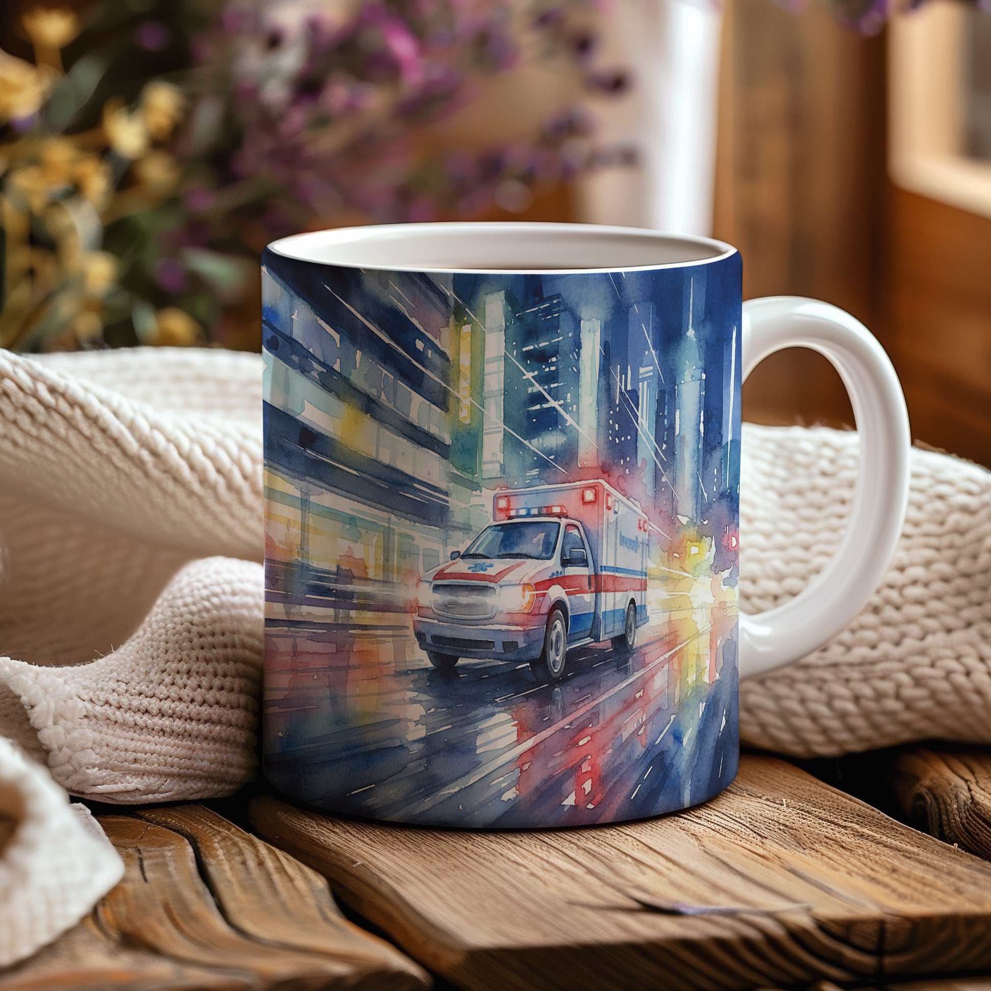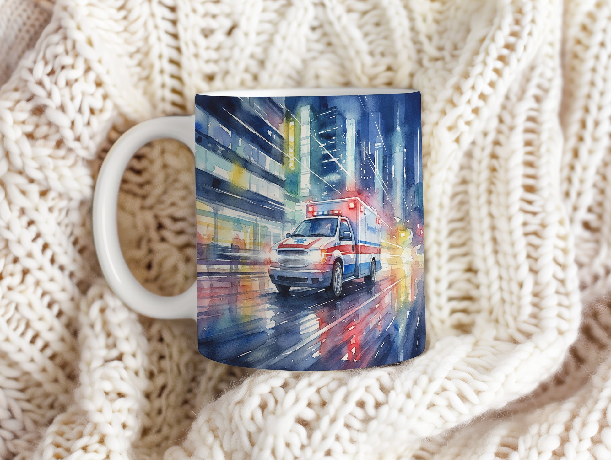 Akvarelový motiv sanitky svištící nočním městem. Ideální pro milovníky dynamických scenérií. Hrnek 330 ml – vhodný do myčky i mikrovlnky.