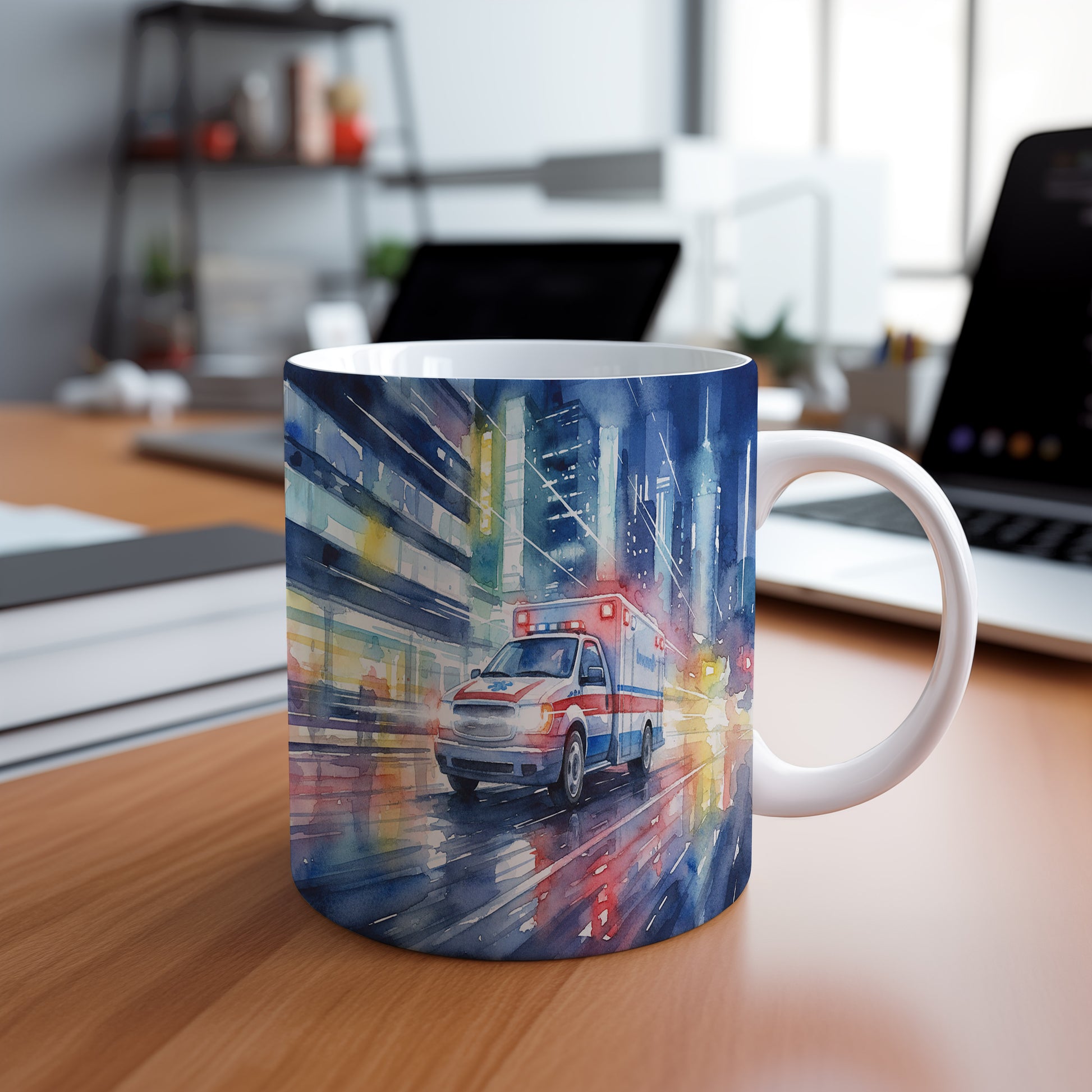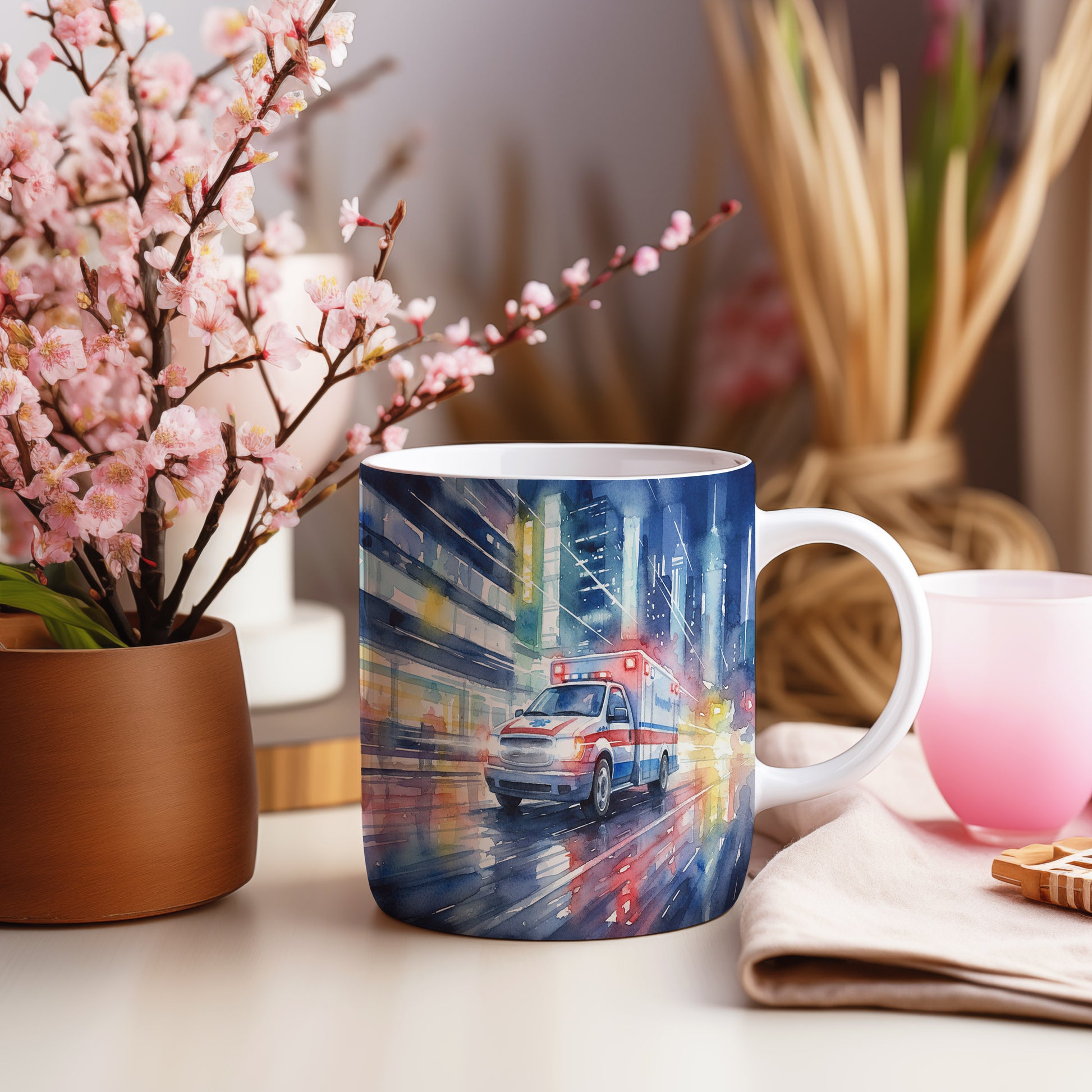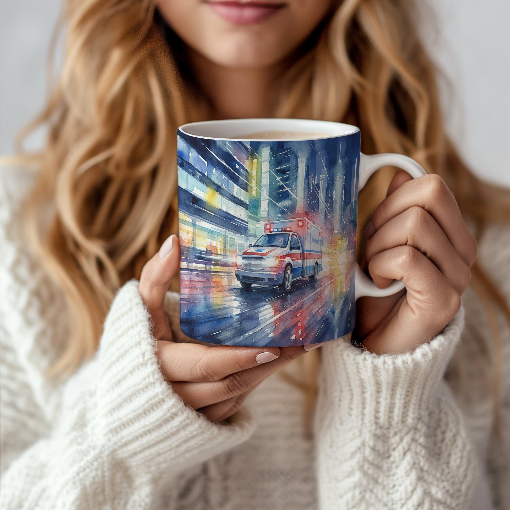 Akvarelový motiv sanitky svištící nočním městem. Ideální pro milovníky dynamických scenérií. Hrnek 330 ml – vhodný do myčky i mikrovlnky.