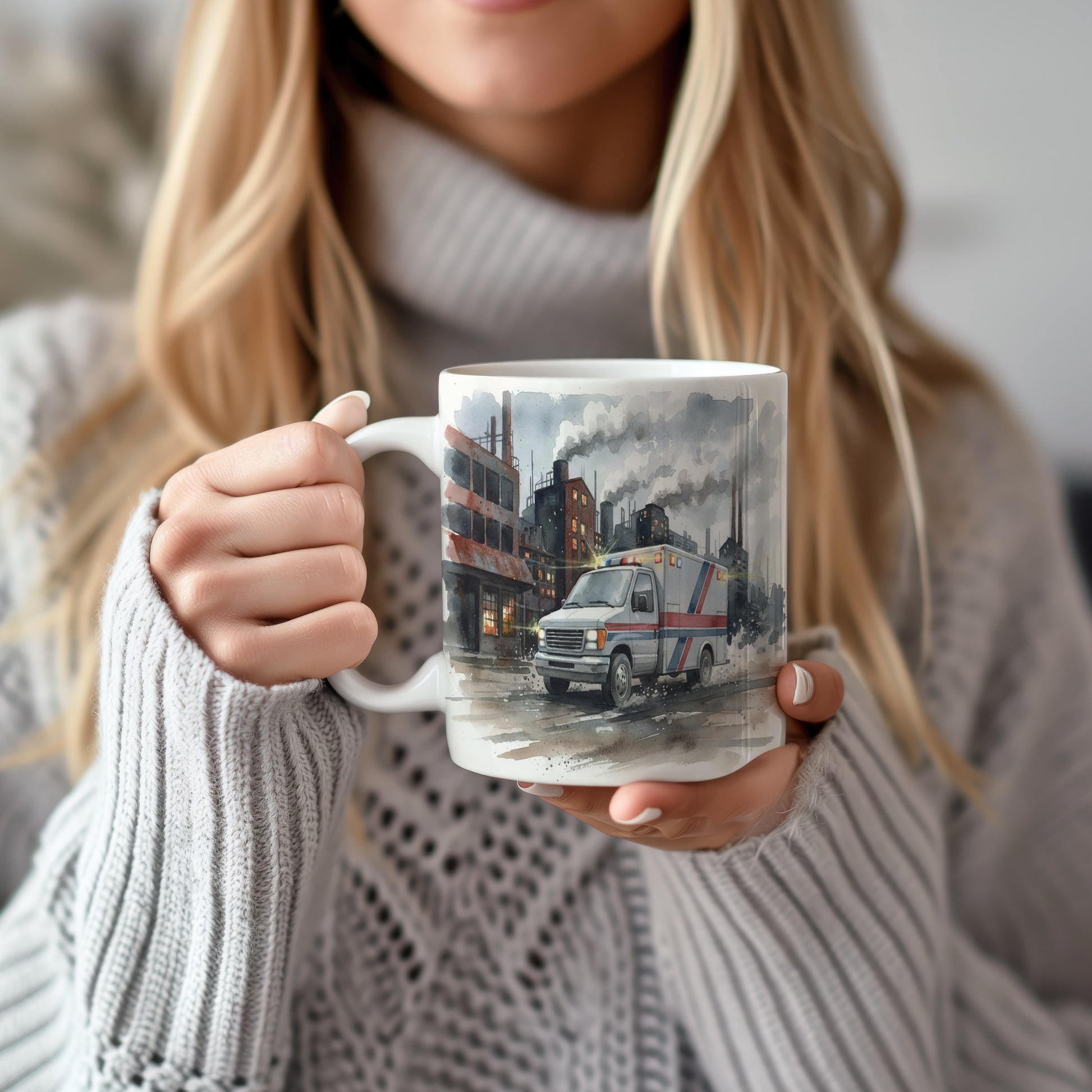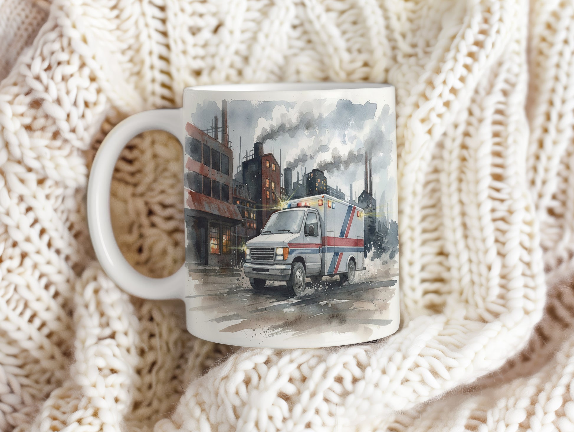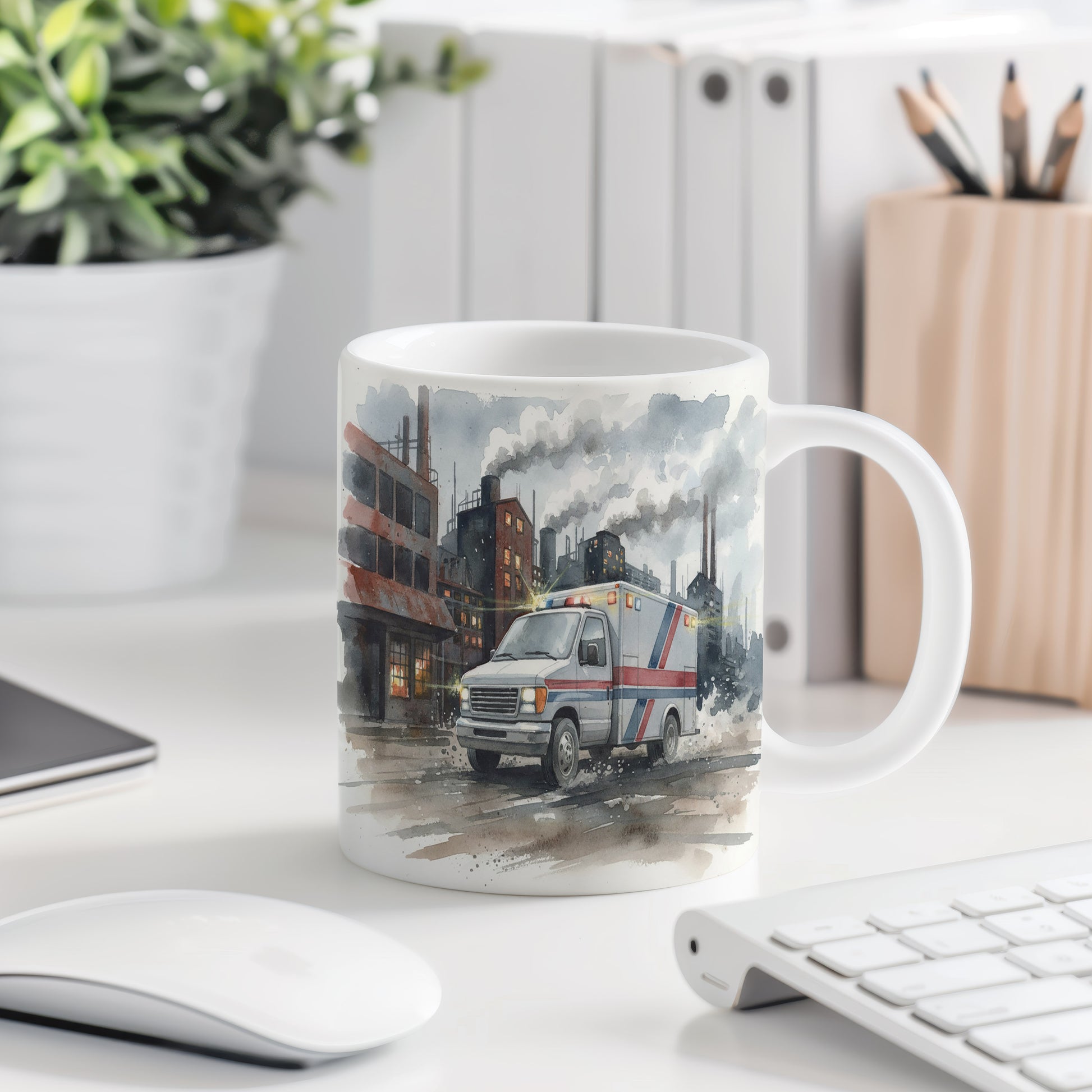 Elegantní hrnek s akvarelovým motivem sanitky projíždějící průmyslovou zónou. Skvělý doplněk pro milovníky akčních scén. Hrnek 330 ml – vhodný do myčky i mikrovlnky.