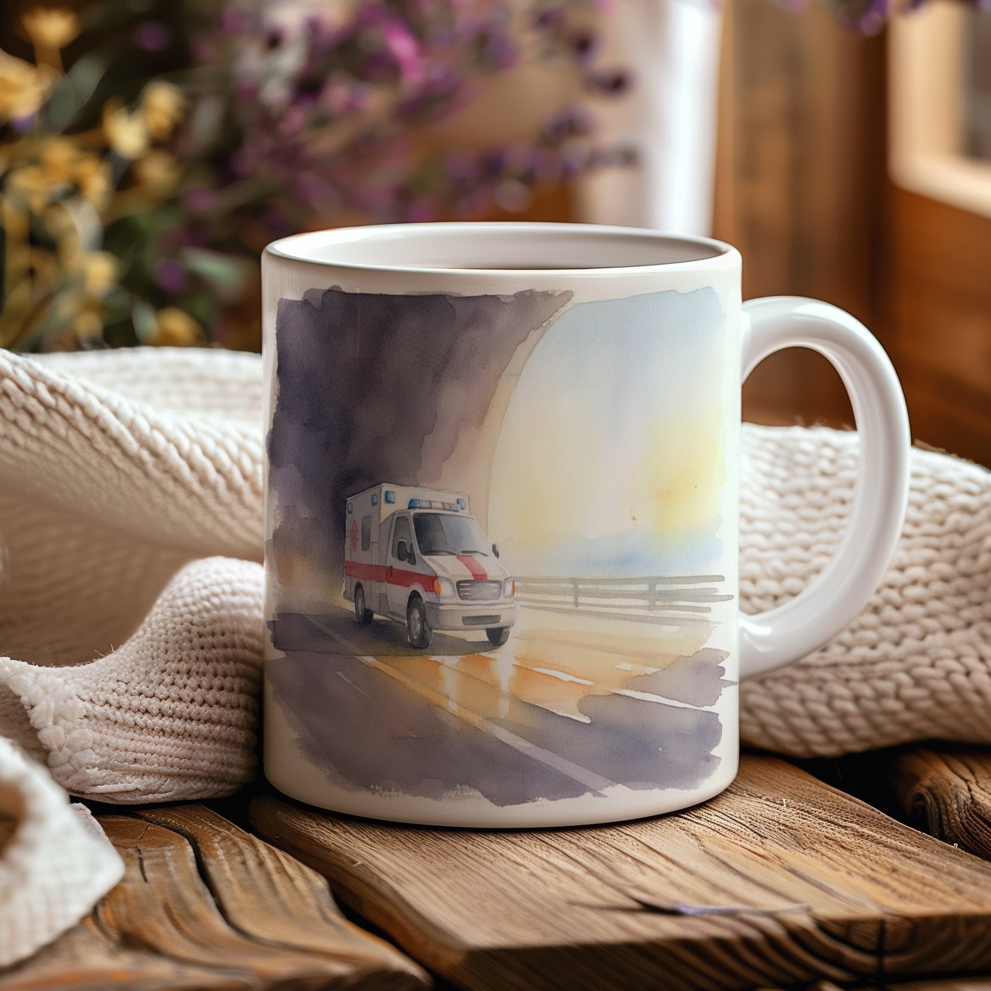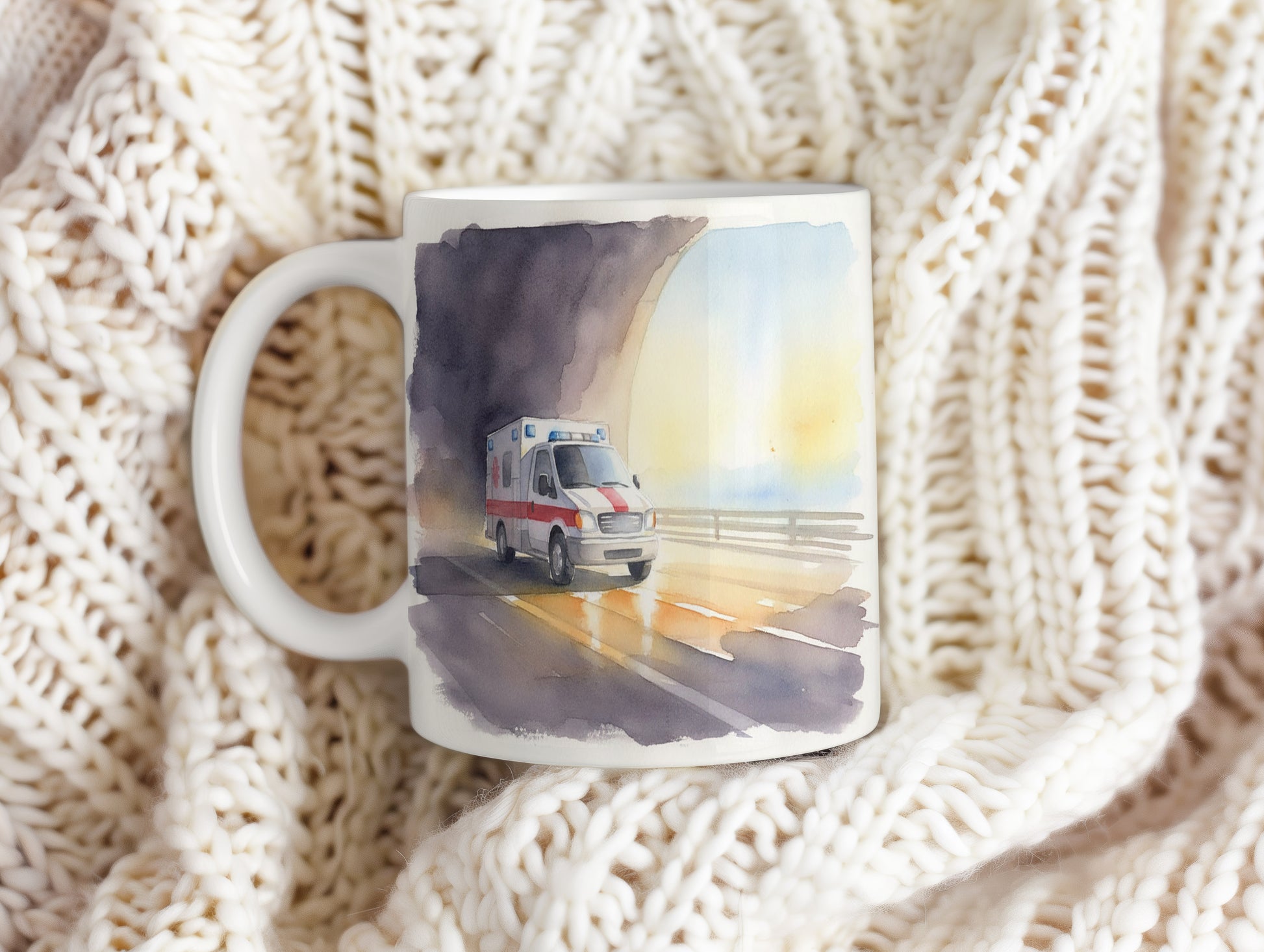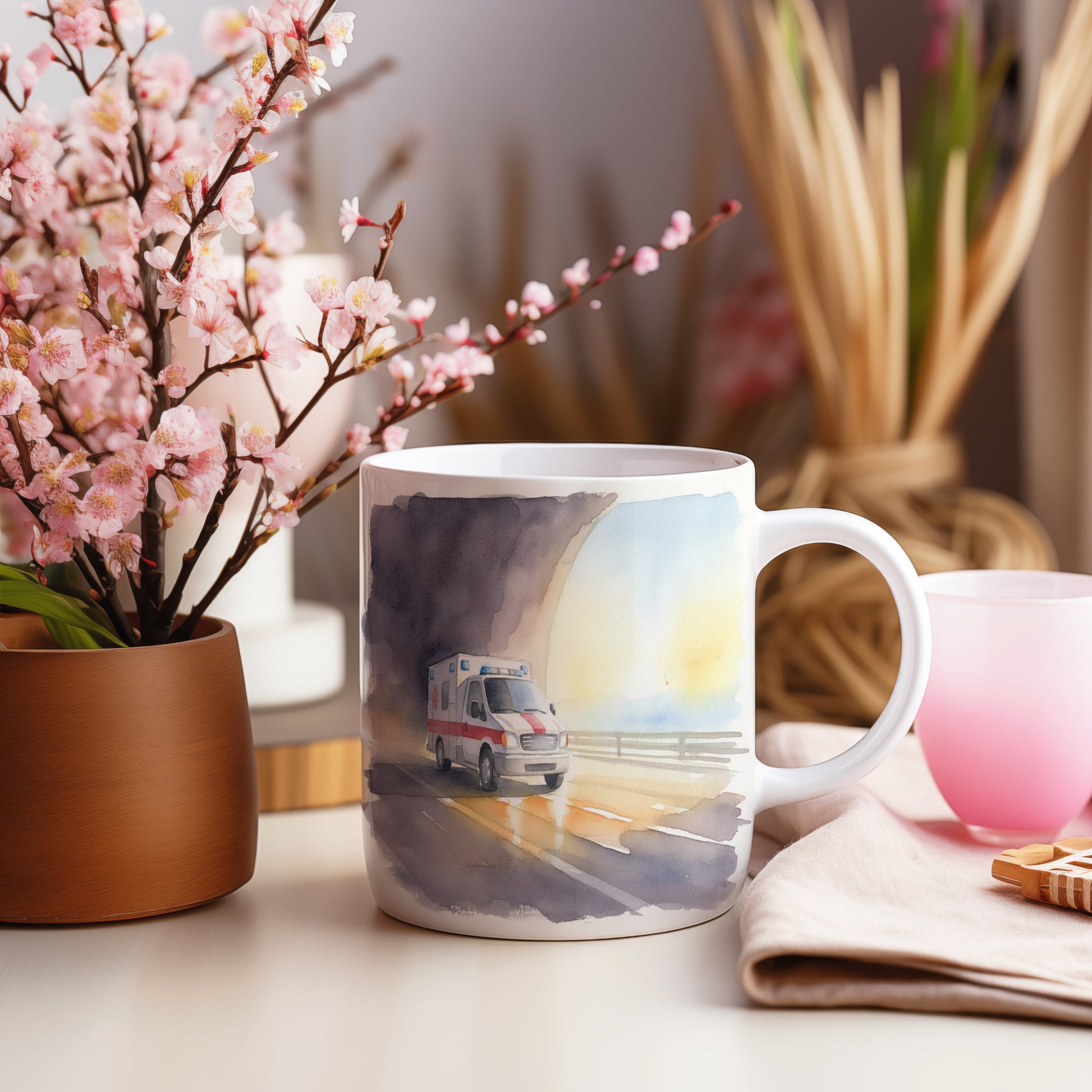 Akvarelový motiv sanitky projíždějící tunel za ranního svitu přináší klid a energii. Hrnek 330 ml – vhodný do myčky i mikrovlnky.