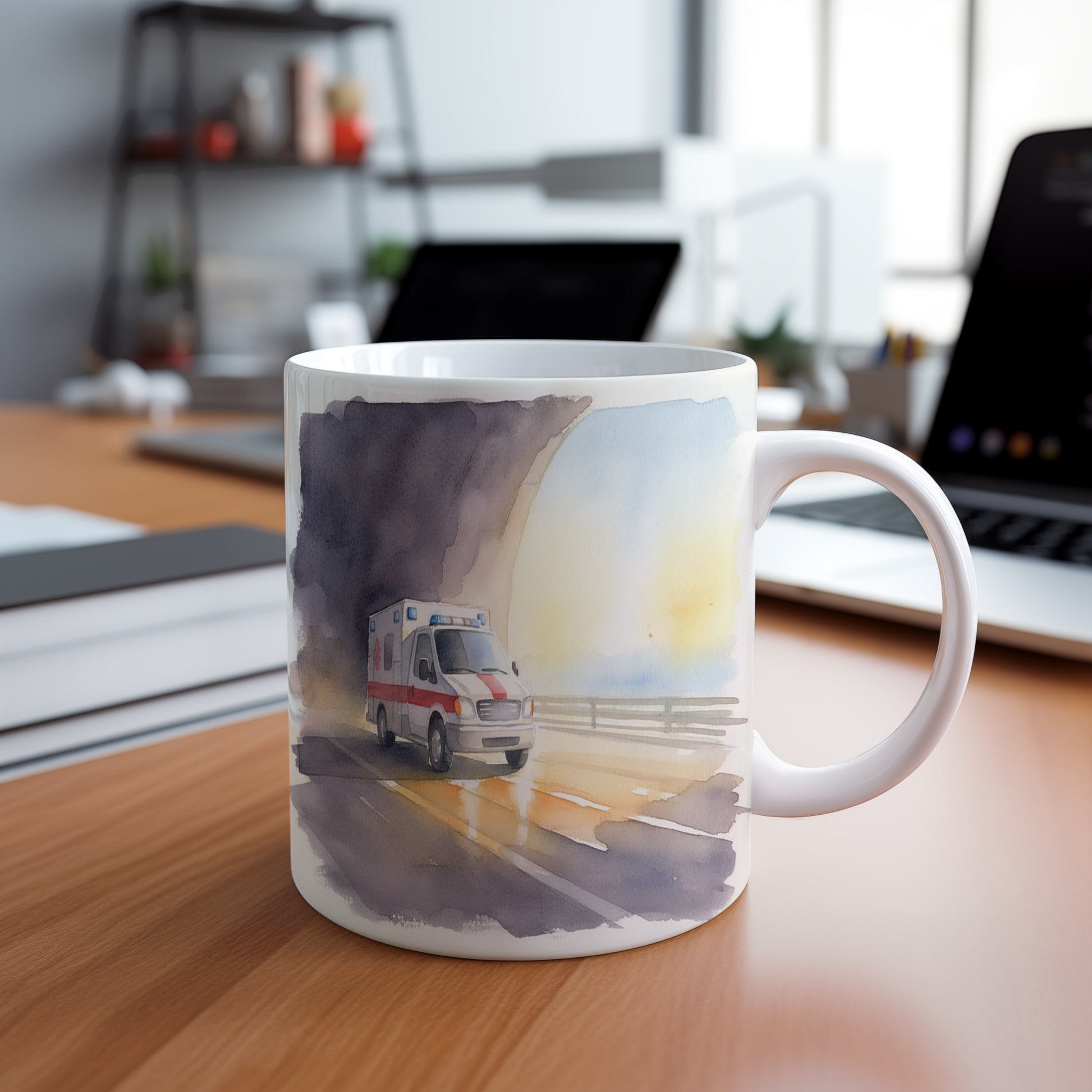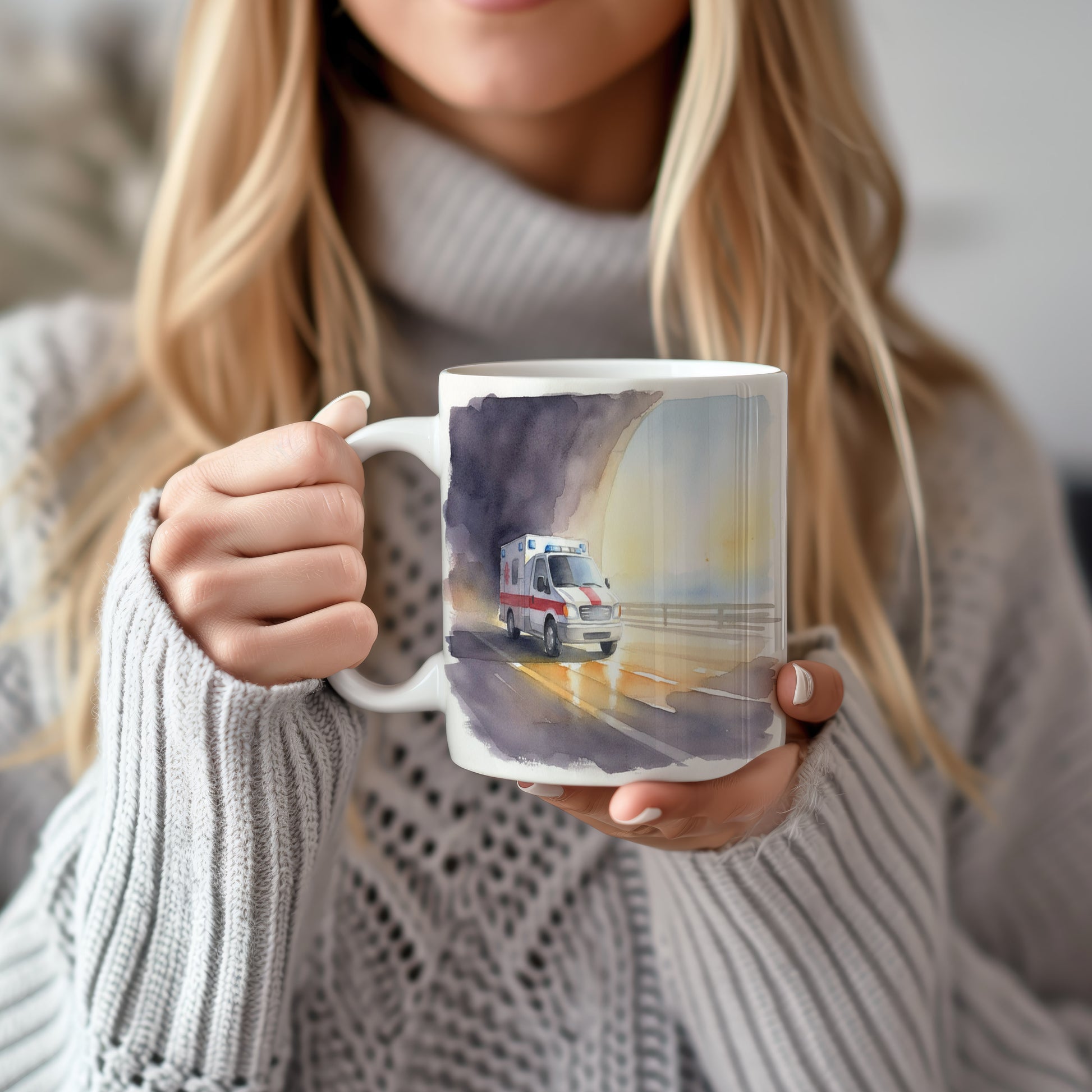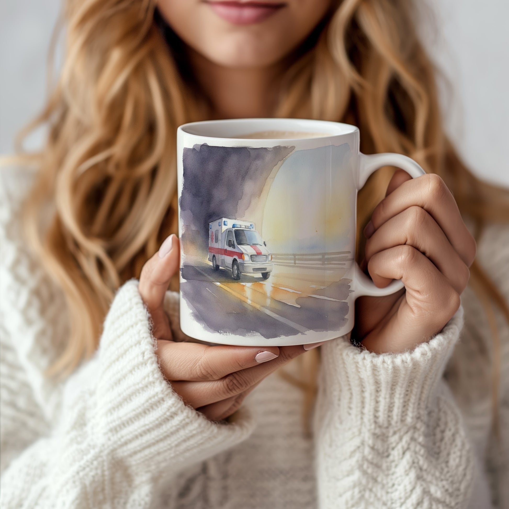 Akvarelový motiv sanitky projíždějící tunel za ranního svitu přináší klid a energii. Hrnek 330 ml – vhodný do myčky i mikrovlnky.