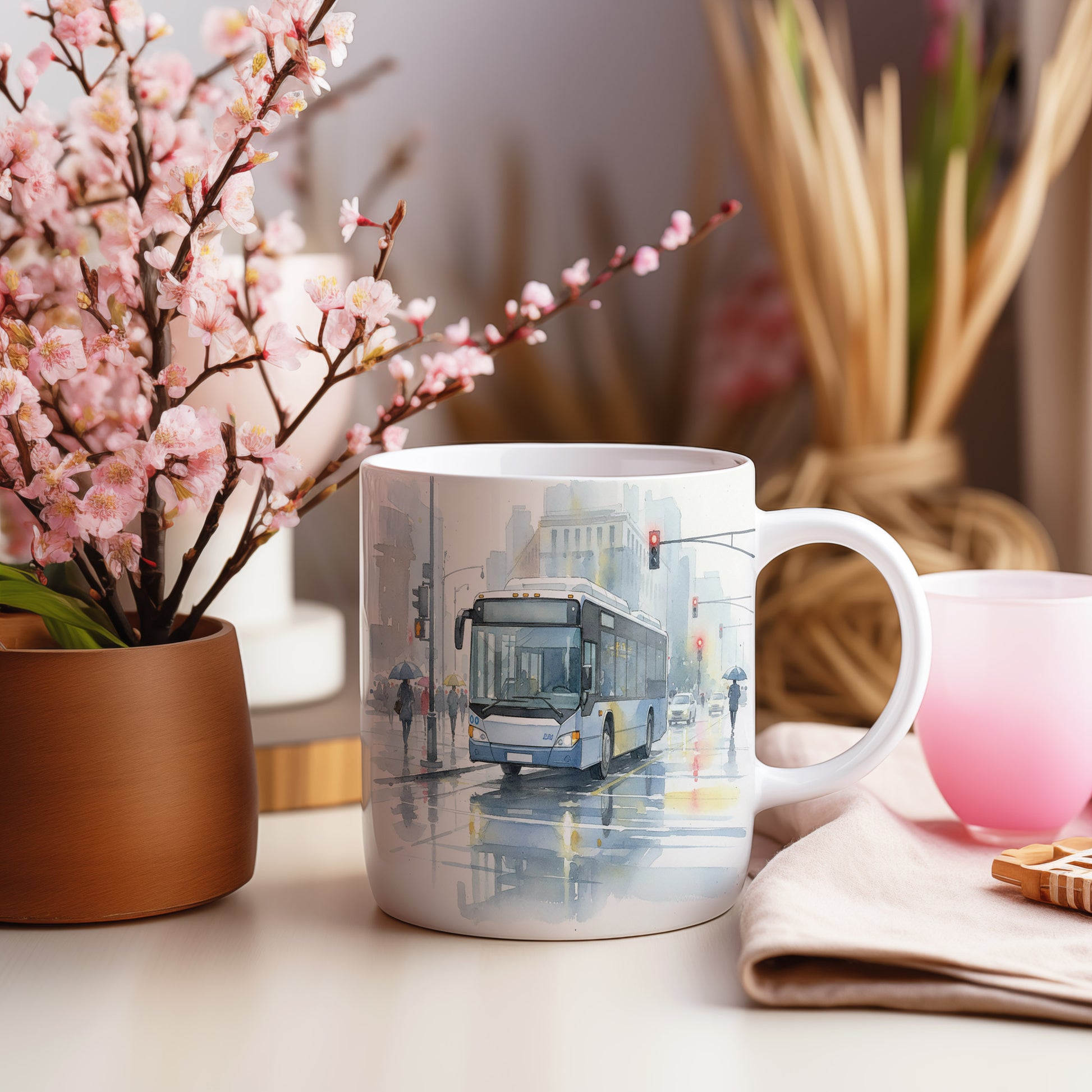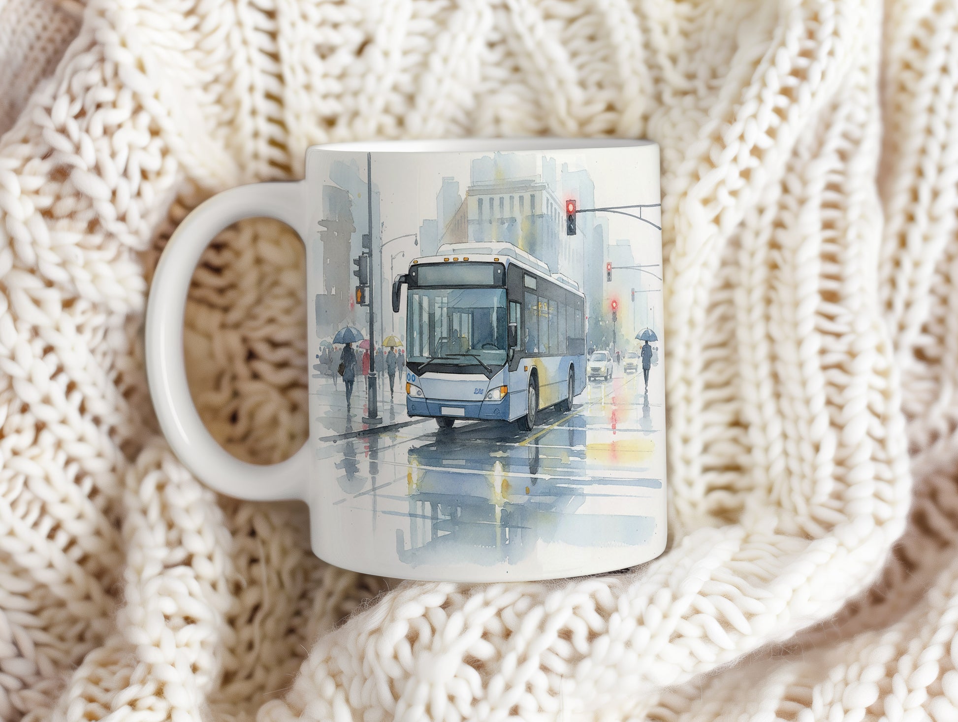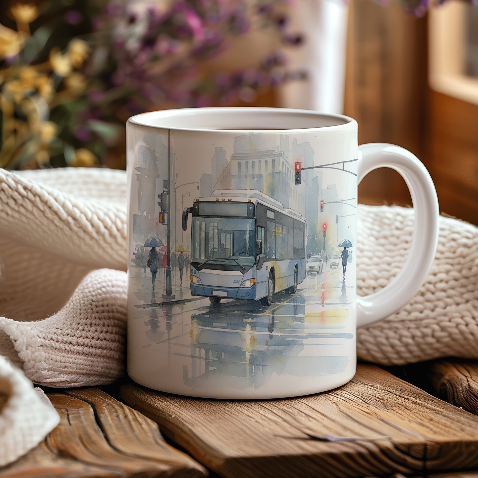 Objevte kouzlo městského života s jemným akvarelem autobusu na deštivé ulici. Ideální pro milovníky dopravních prostředků.