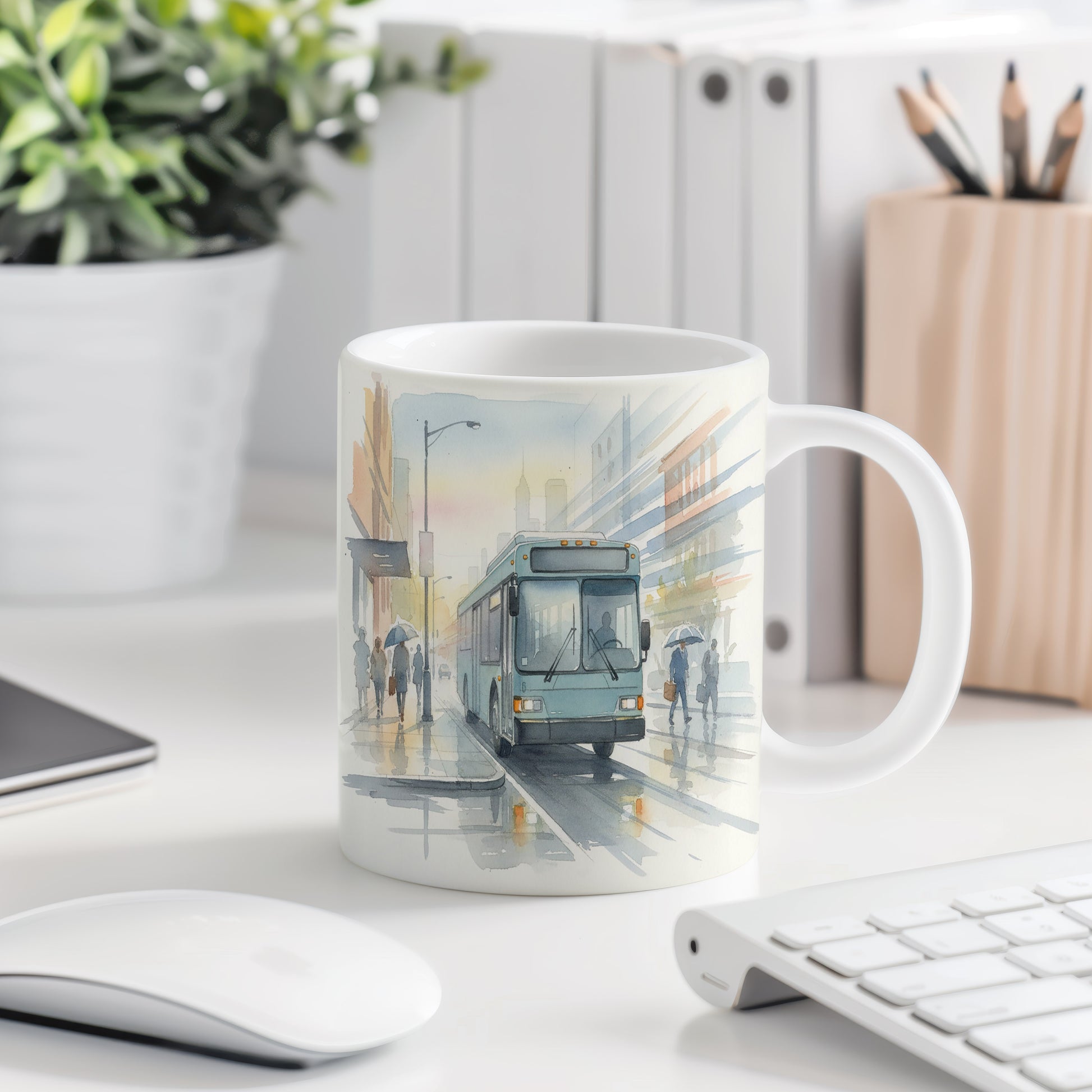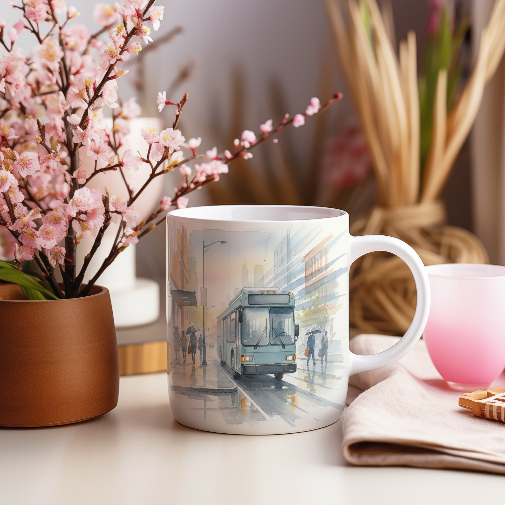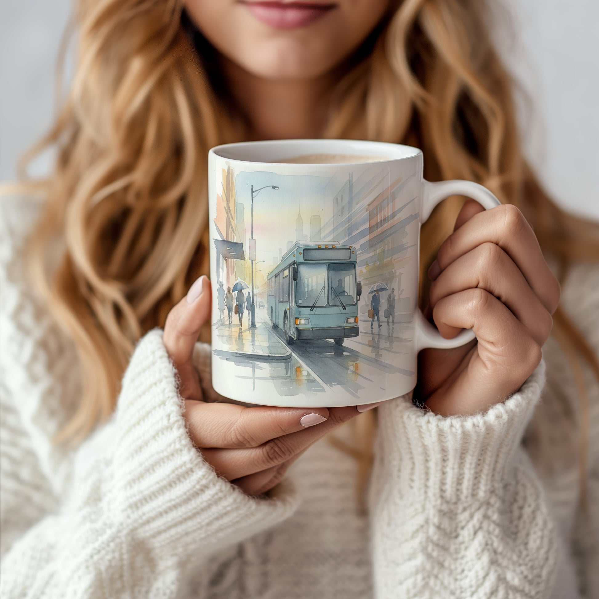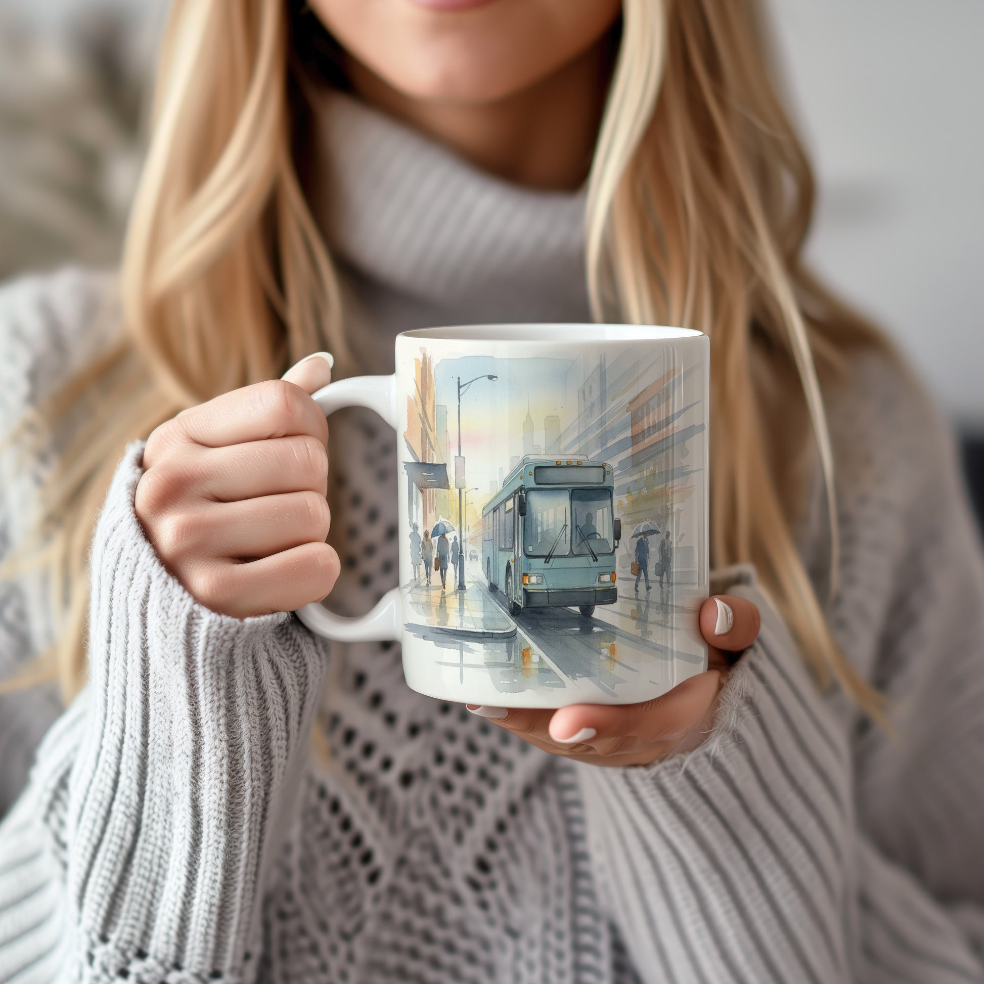 Objevte kouzlo městské atmosféry s akvarelem autobusu projíždějícího deštivými ulicemi. Hrnek 330 ml – vhodný do myčky i mikrovlnky.