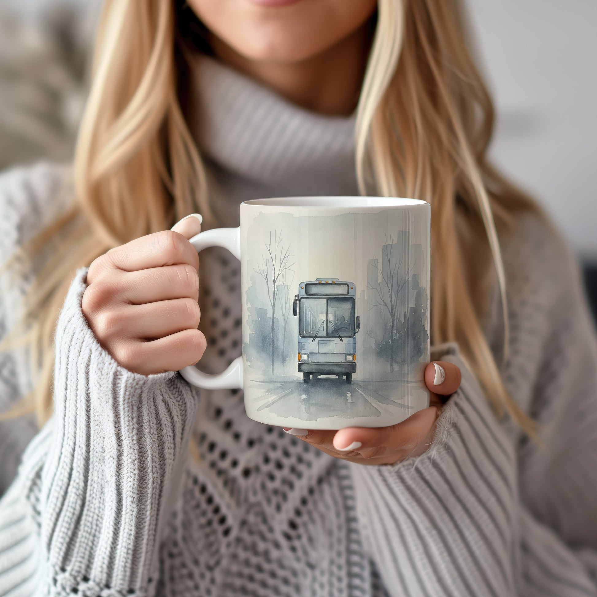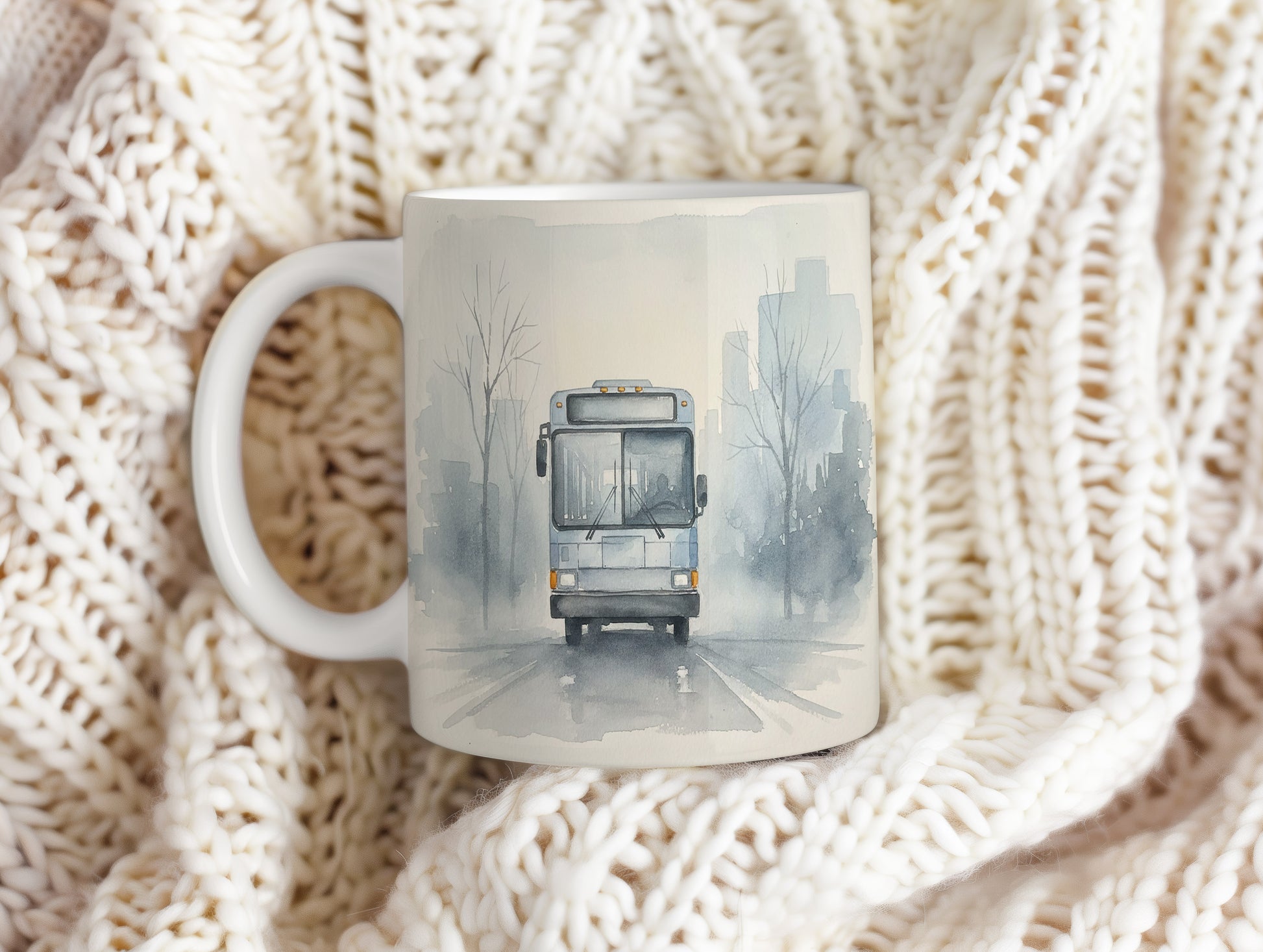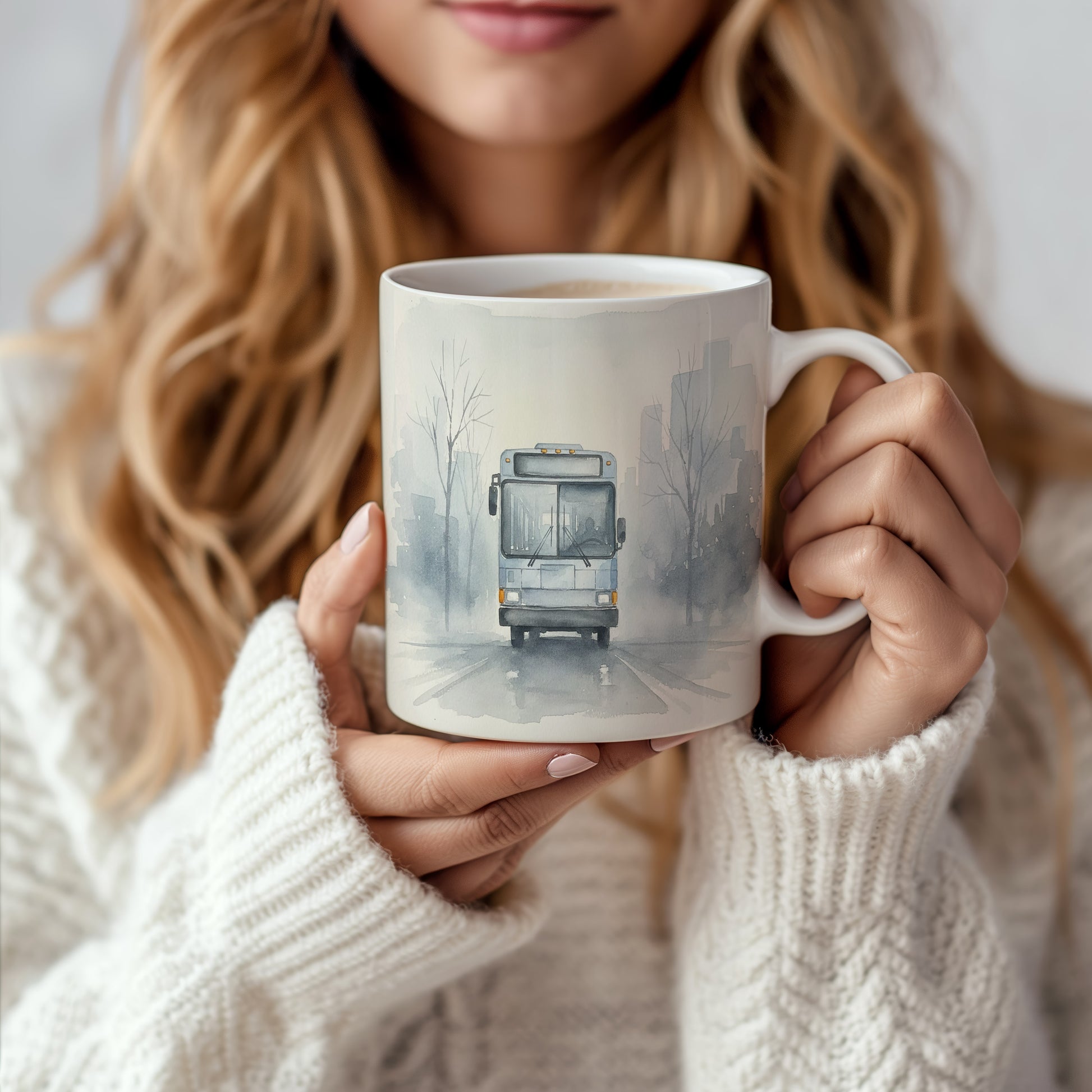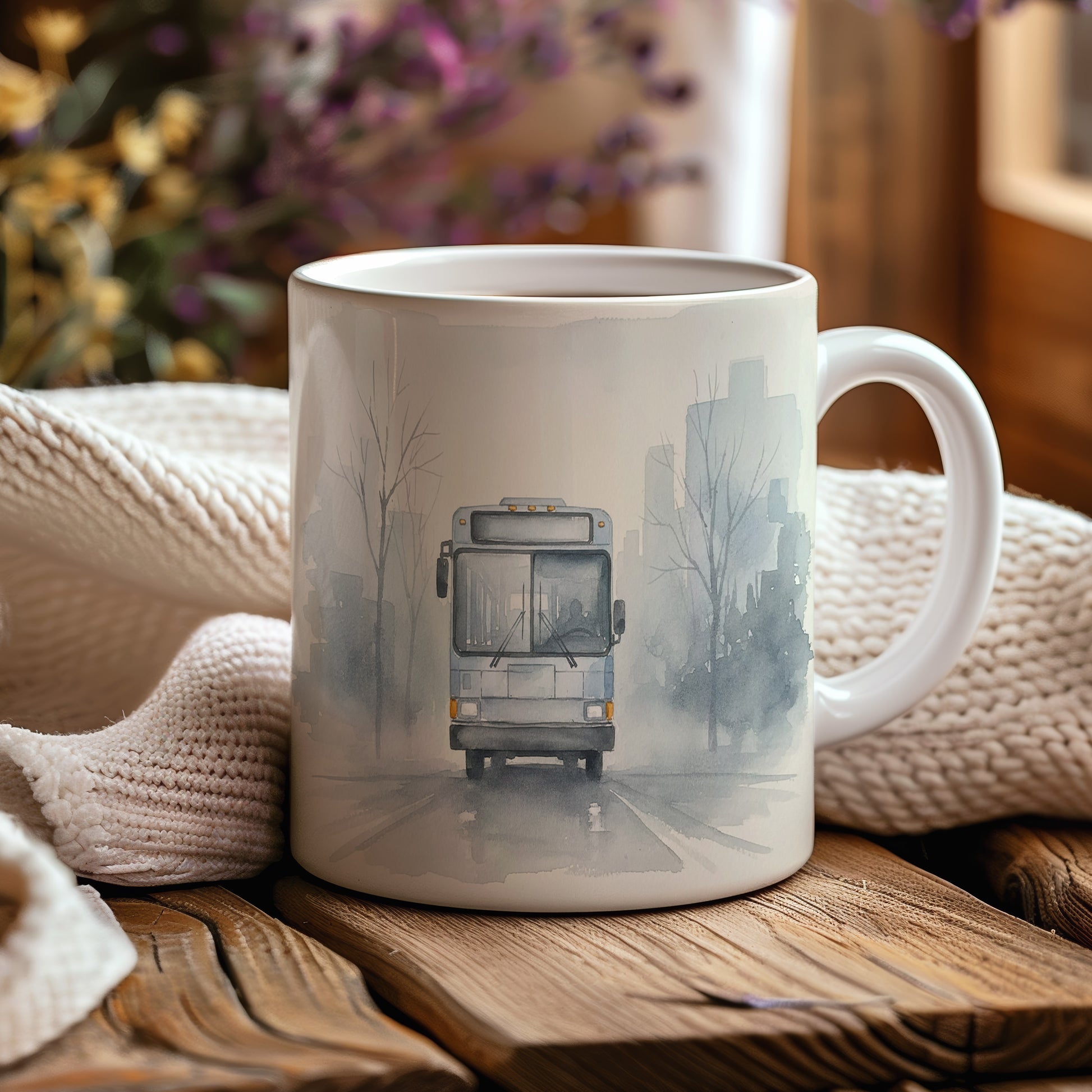 Objevte kouzlo městské dopravy s tímto hrnkem, který zobrazuje autobus projíždějící mlhavým městem. Jemný akvarel dodává scéně snový nádech. Hrnek 330 ml – vhodný do myčky i mikrovlnky.