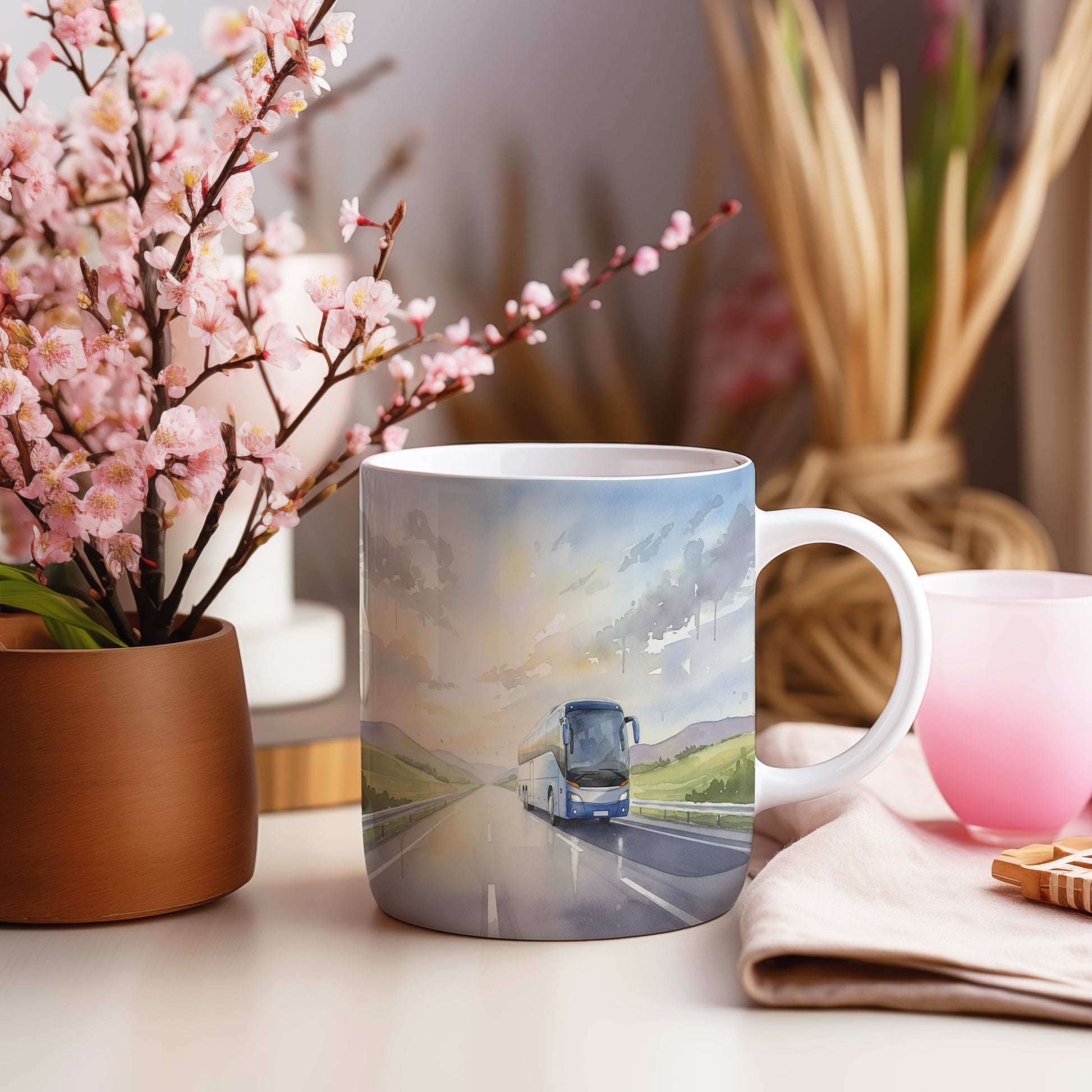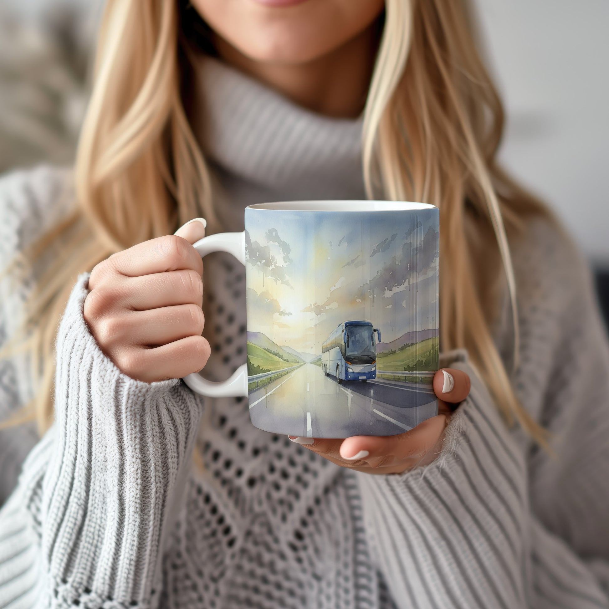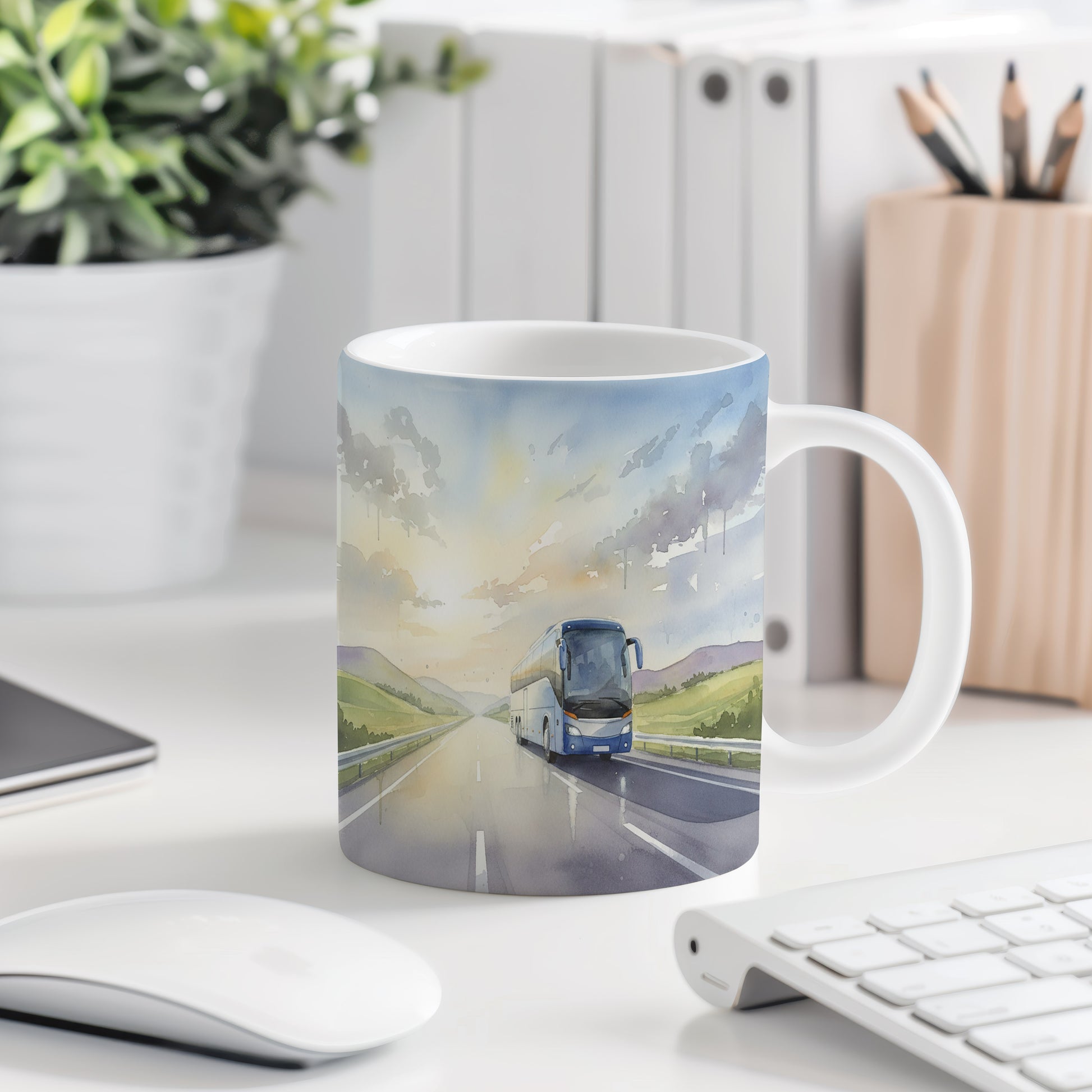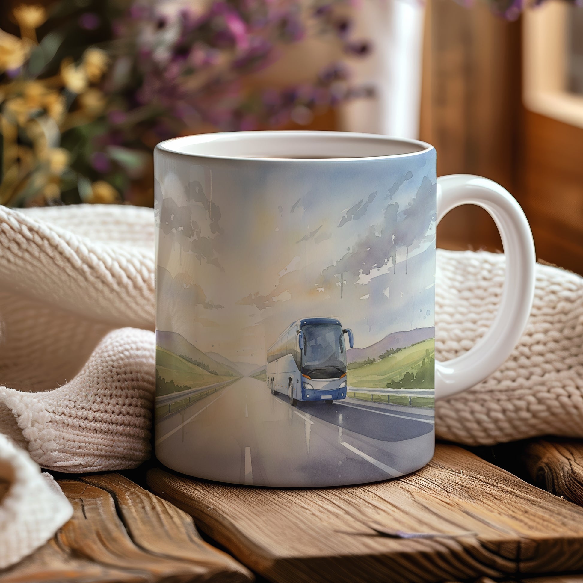 Objevte kouzlo cestování s tímto hrnkem, na kterém je akvarelový motiv autobusu projíždějícího otevřenou krajinou při úsvitu. Jemné barvy a detaily vytvářejí pocit volnosti a pohody.