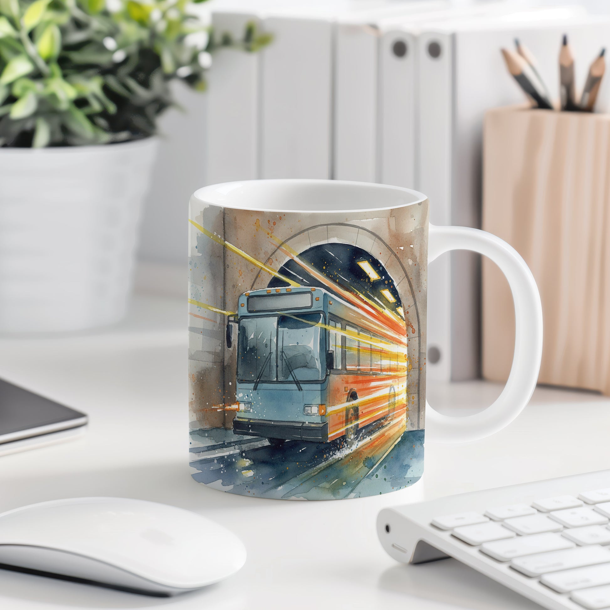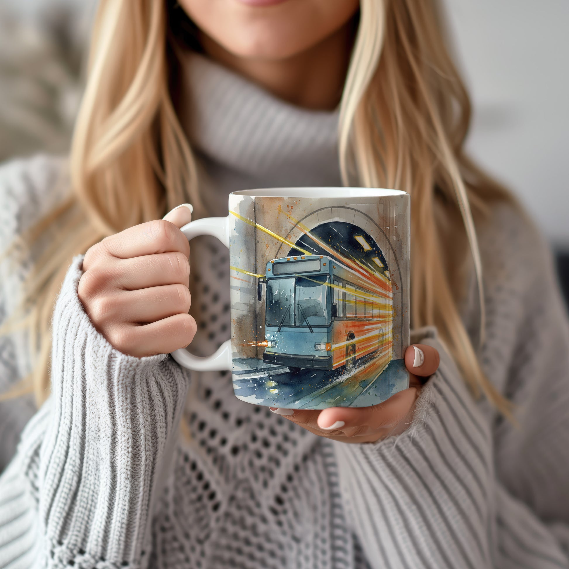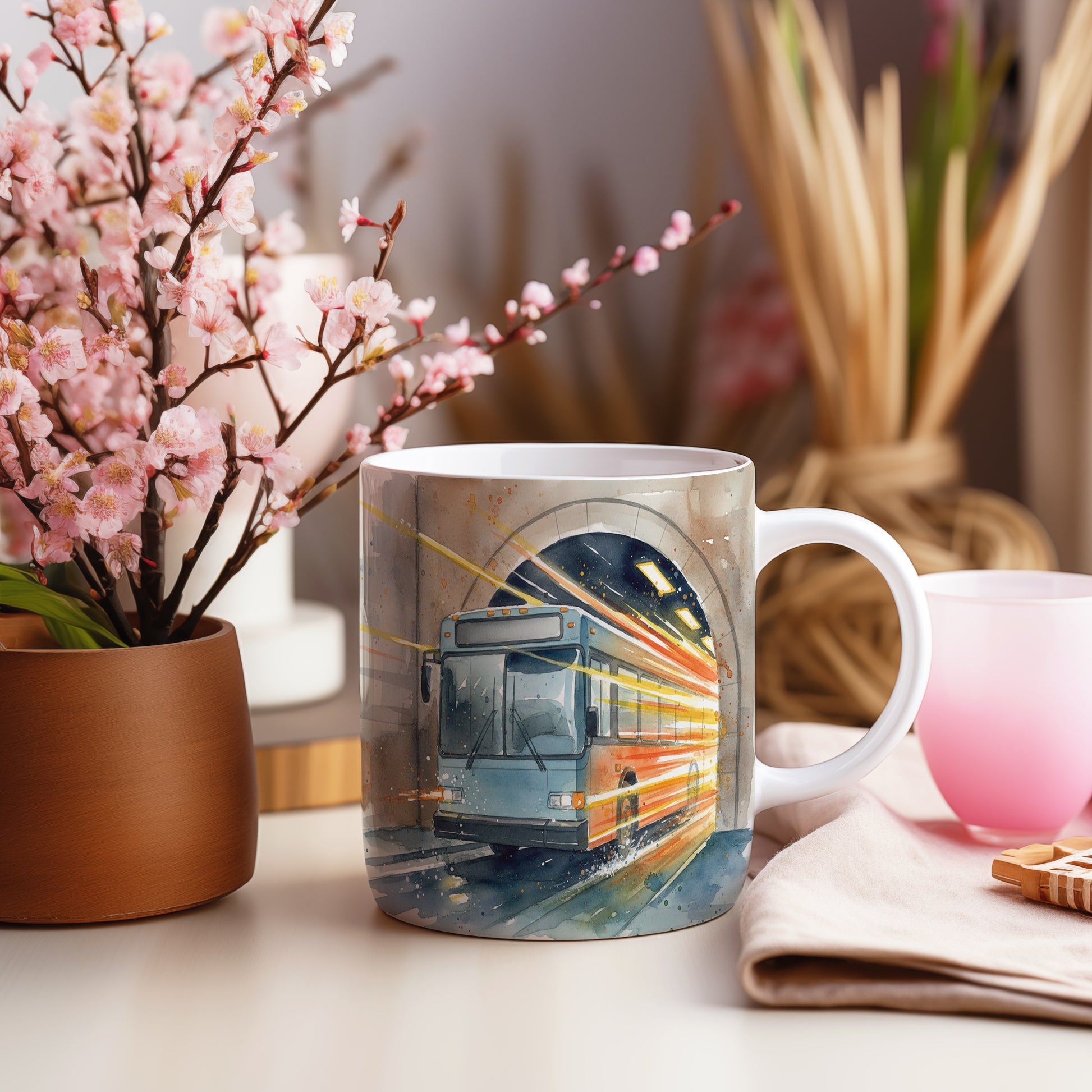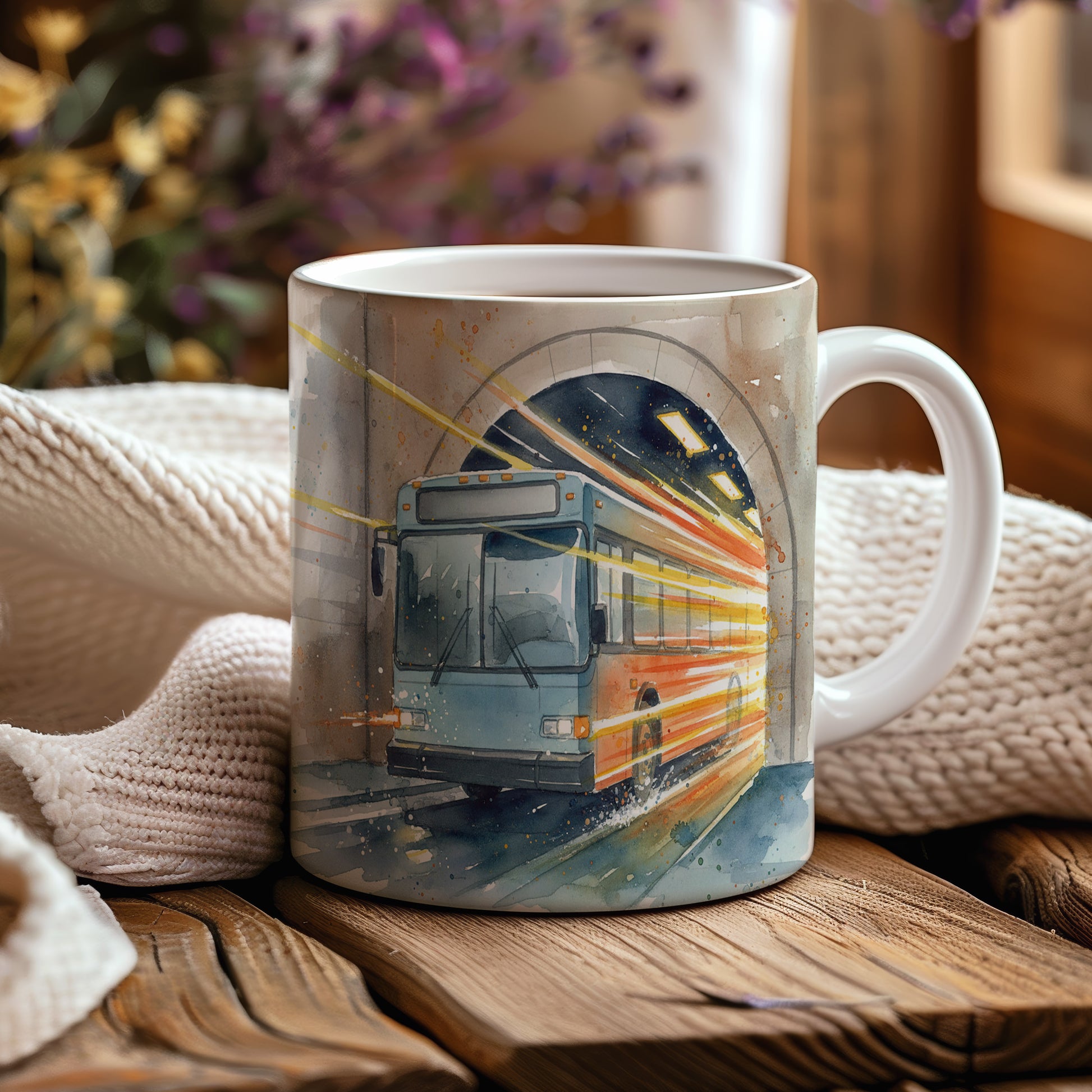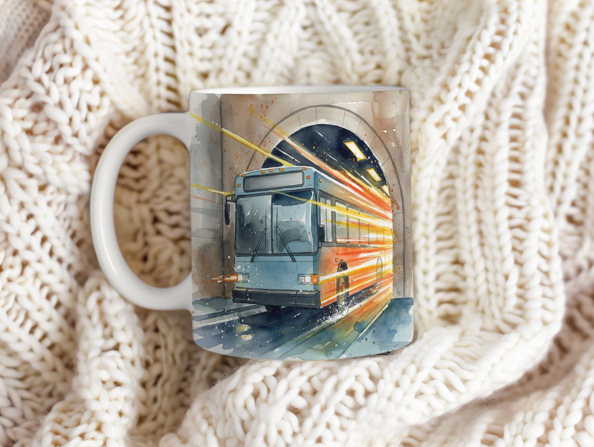 Objevte kouzlo rychlosti s tímto hrnkem, kde akvarelový autobus projíždí světelným tunelem. Skvělý doplněk pro milovníky dopravních scén. Hrnek 330 ml – vhodný do myčky i mikrovlnky.