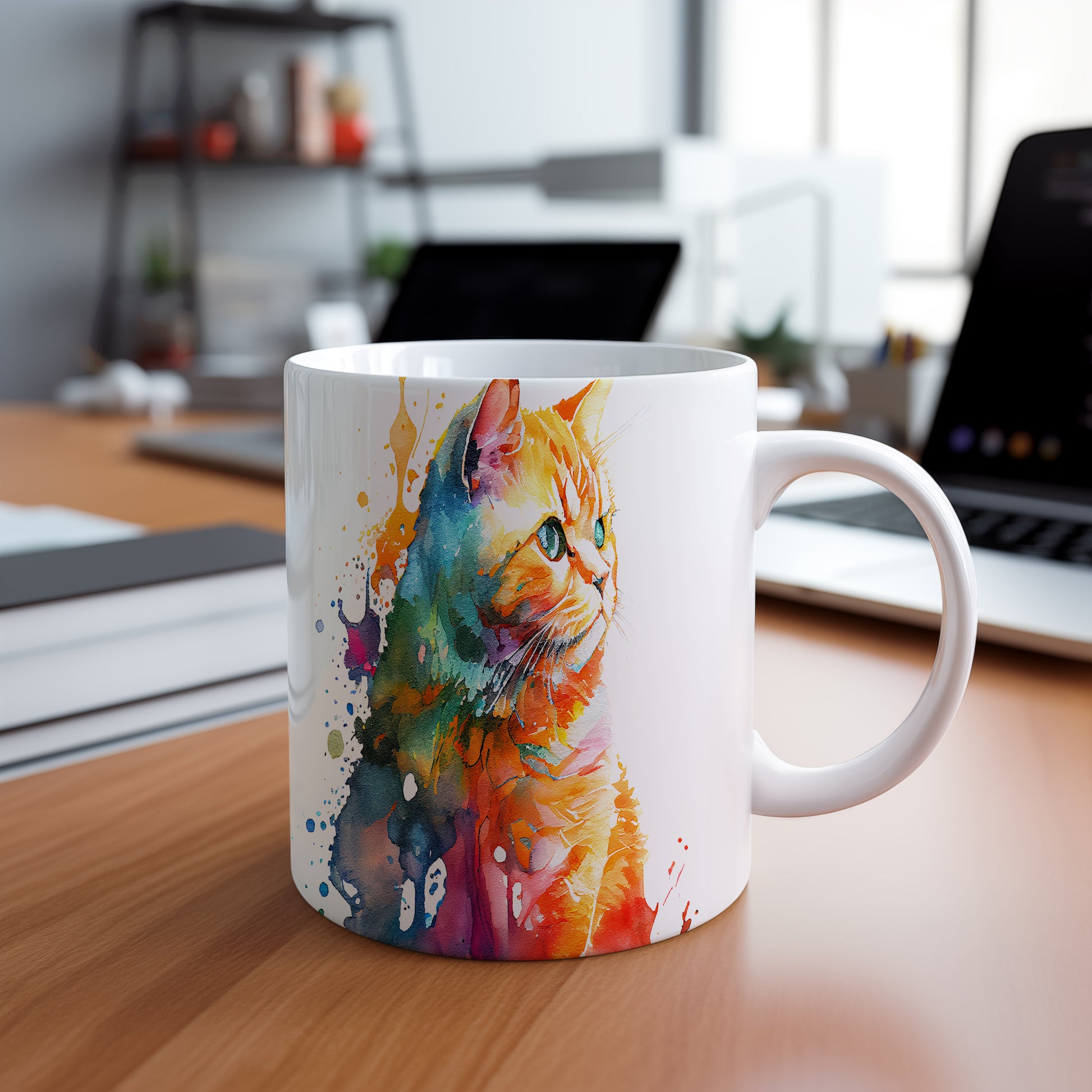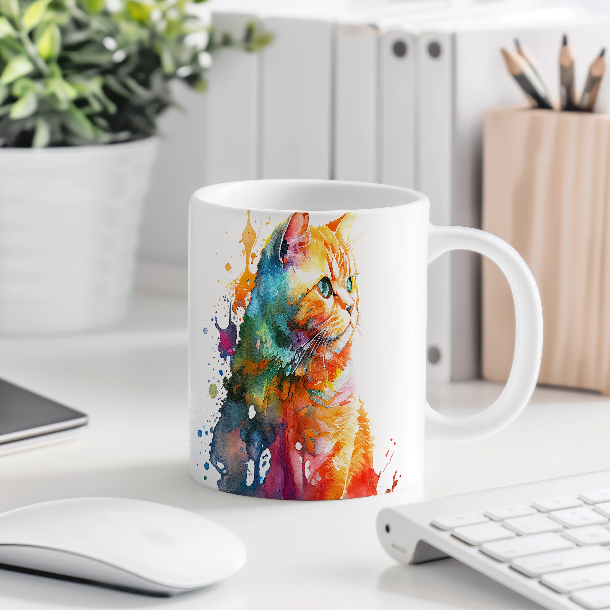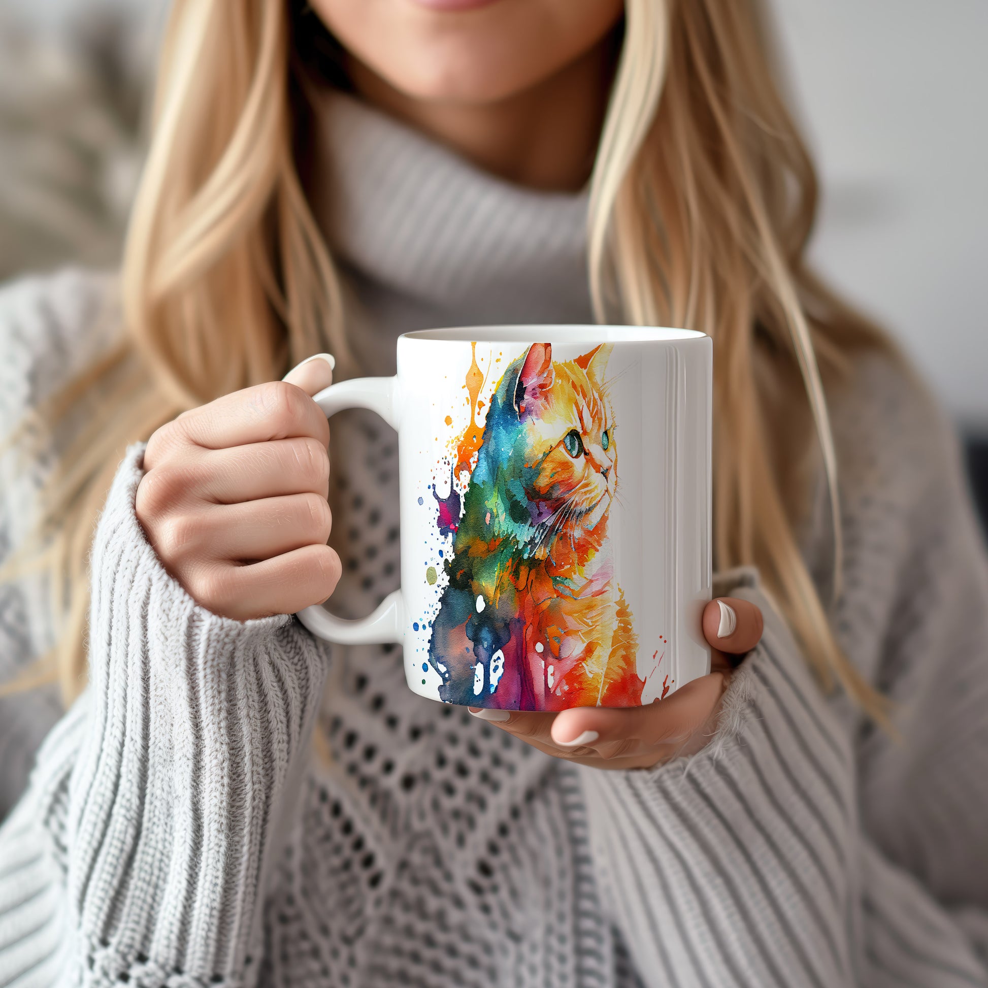 Stylový hrnek s ilustrací kočky v živých barvách a abstraktními skvrnami. Tento hrnek je ideální pro milovníky koček a kreativní duše, skvělý tip na dárek pro přátele nebo rodinu. Materiál: keramika. Objem: 330 ml. Vhodné do myčky i mikrovlnky. Používání tohoto hrnku přináší radost a oživí každodenní pití.