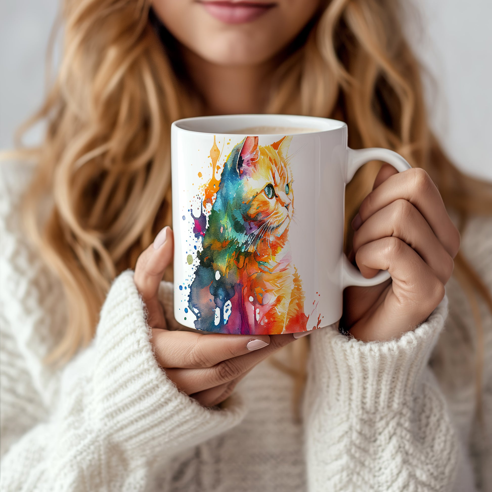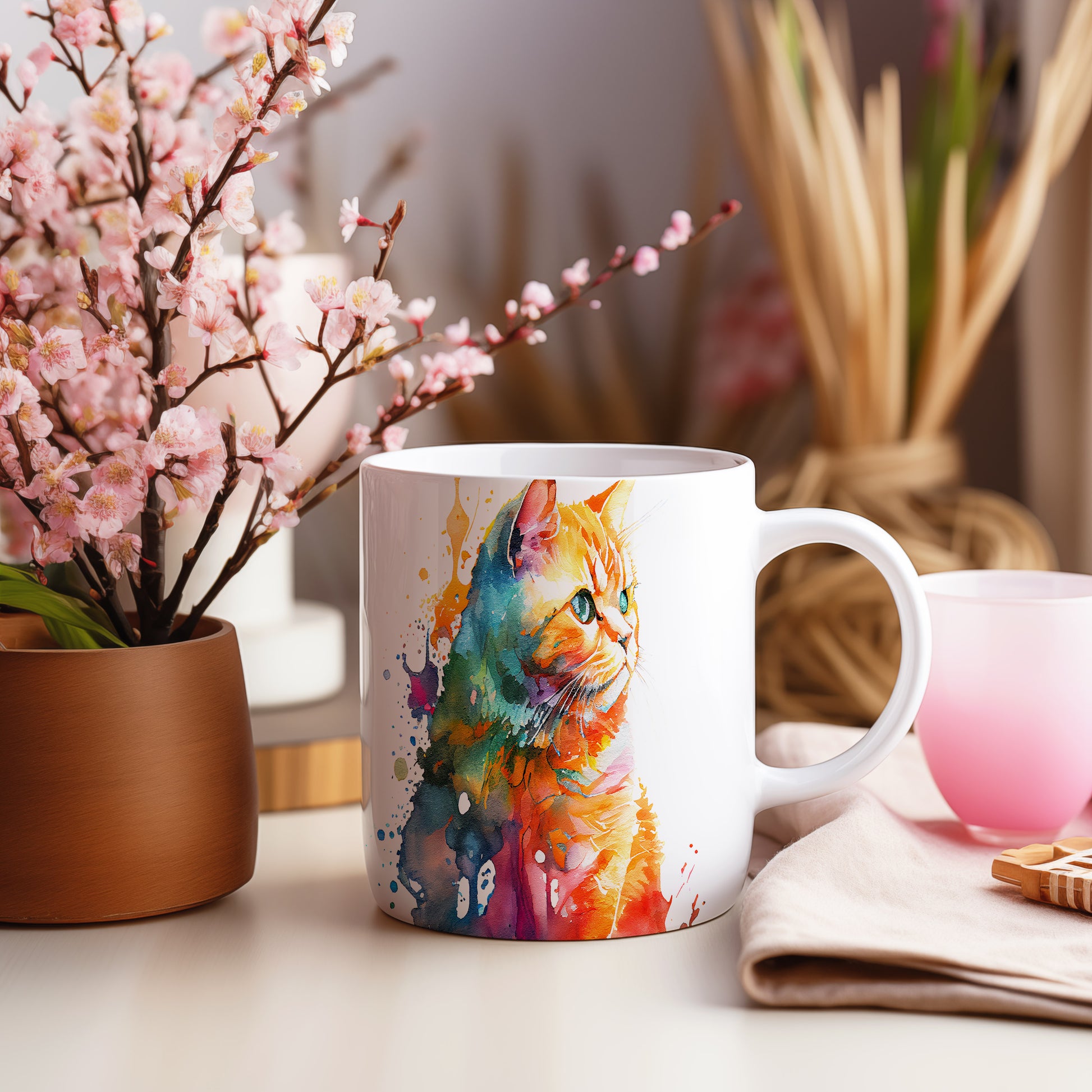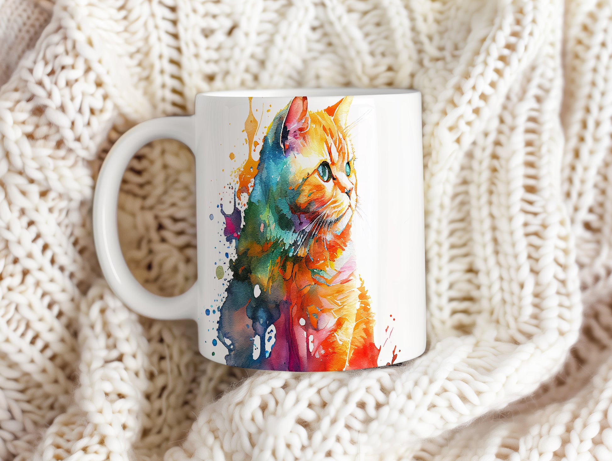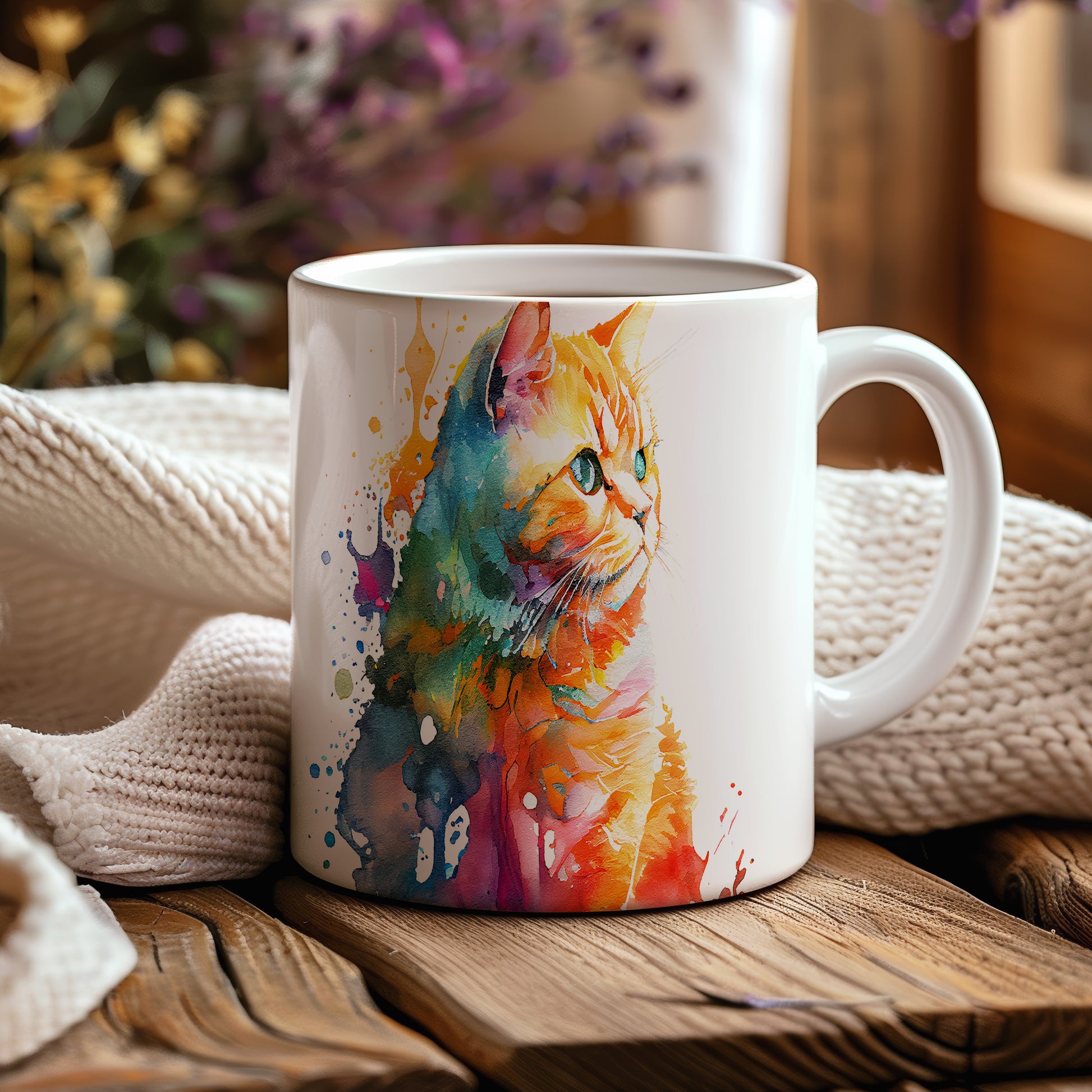 Hrnek s barevnou kočkou a abstraktními skvrnami