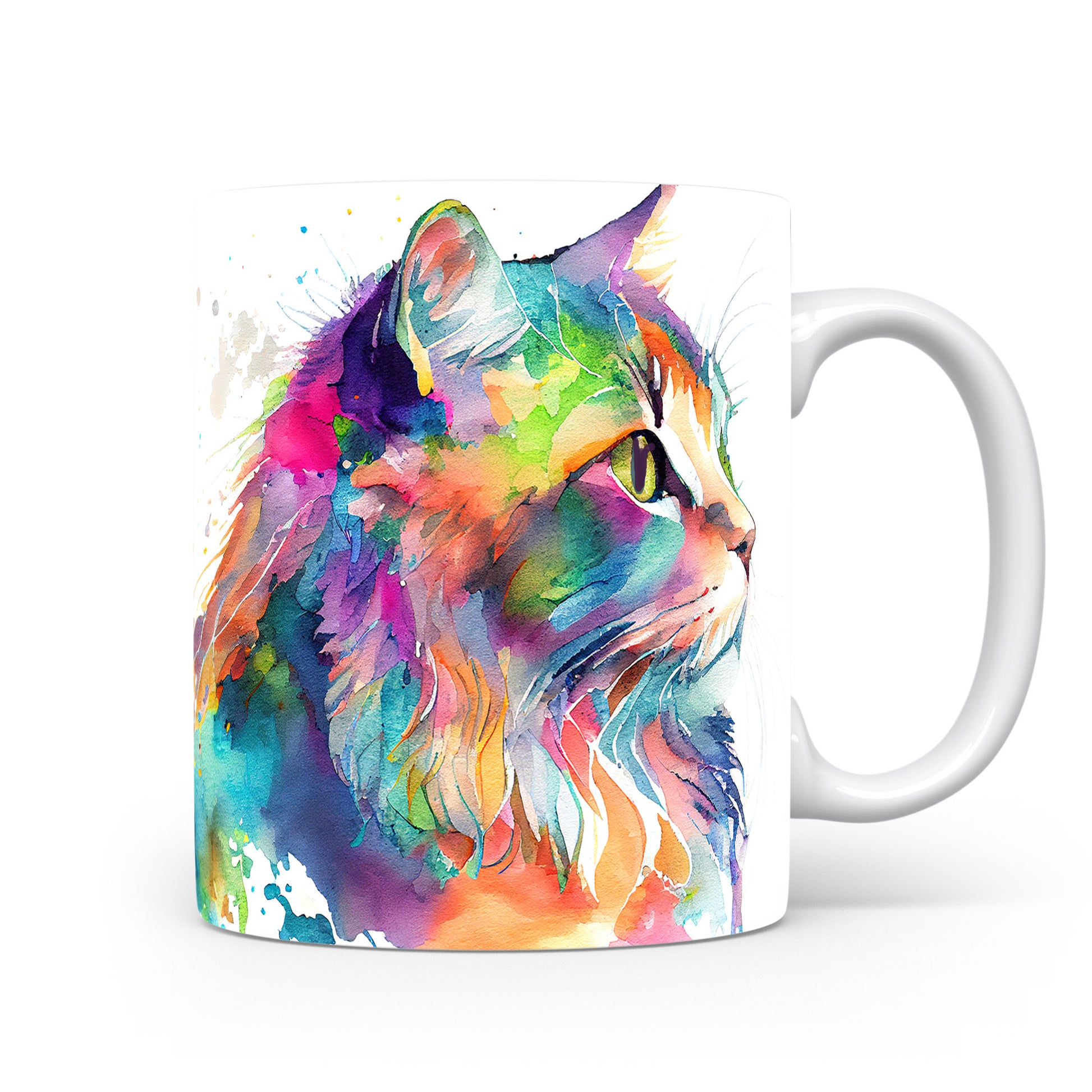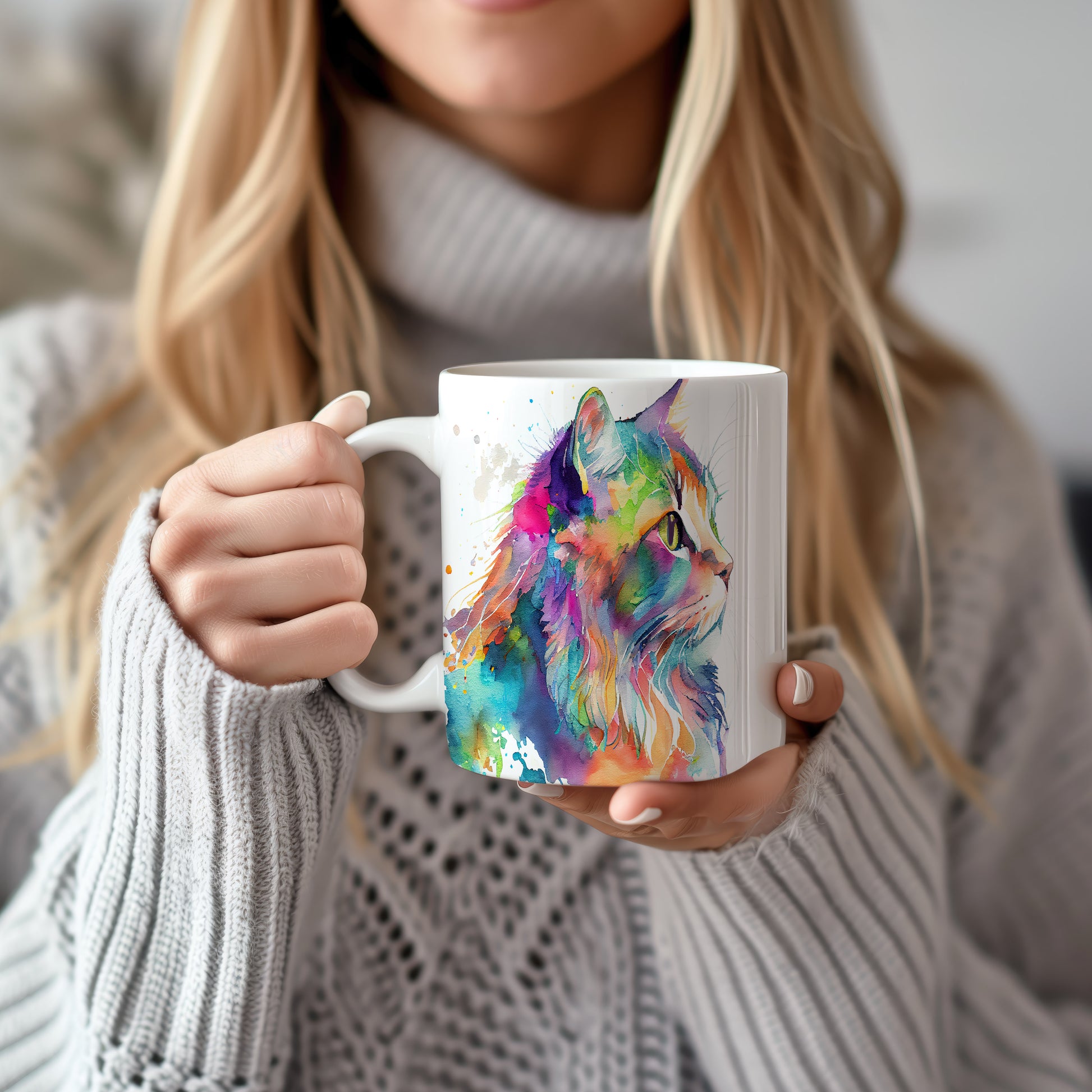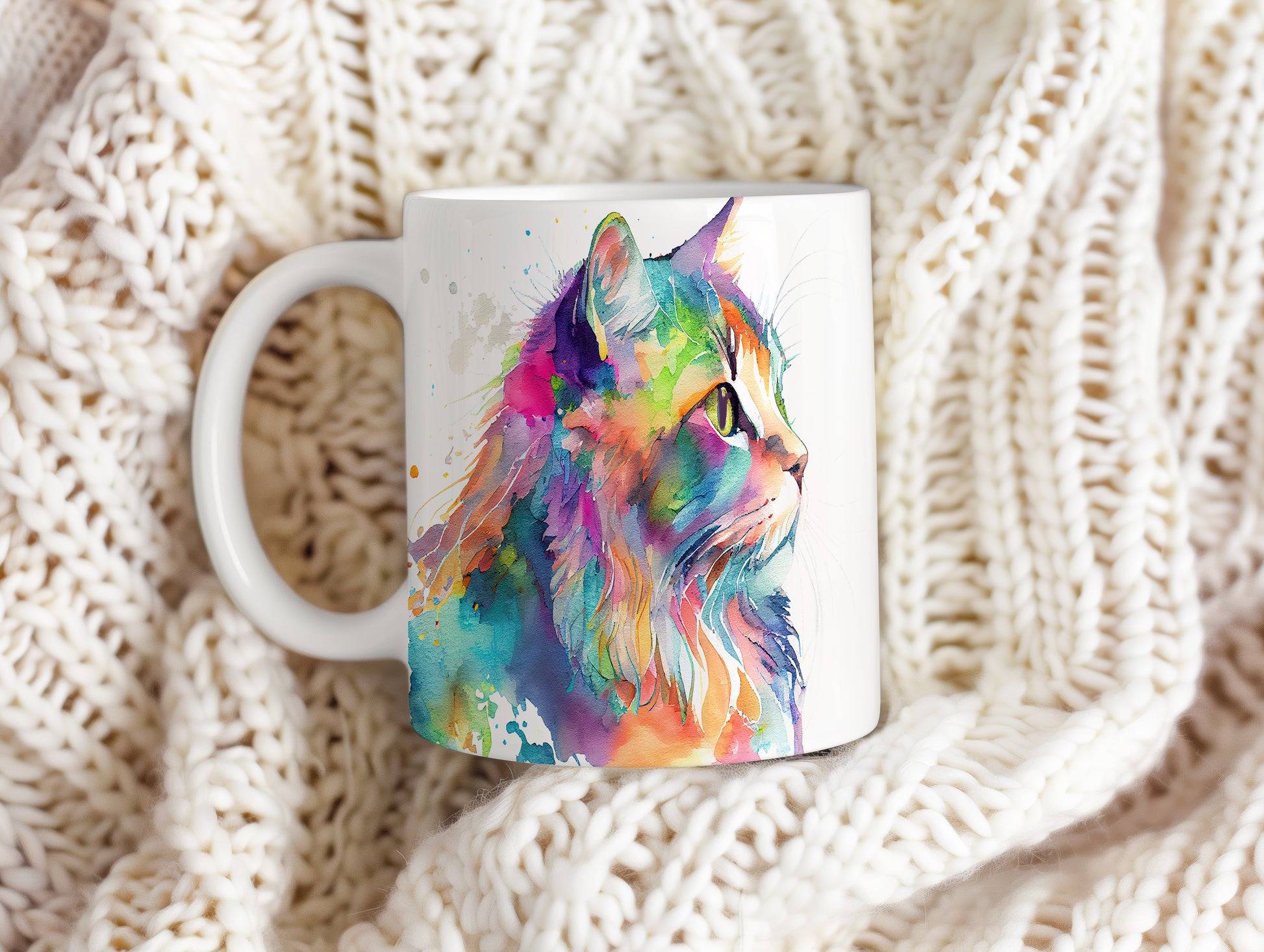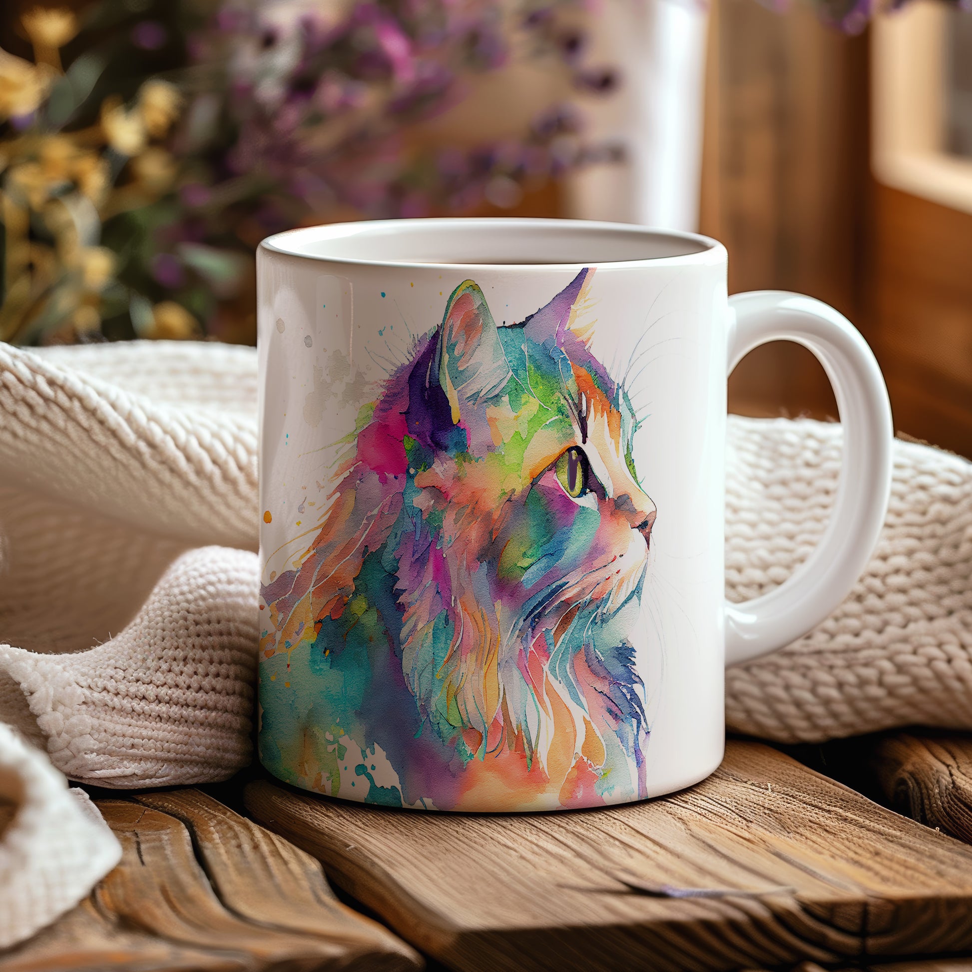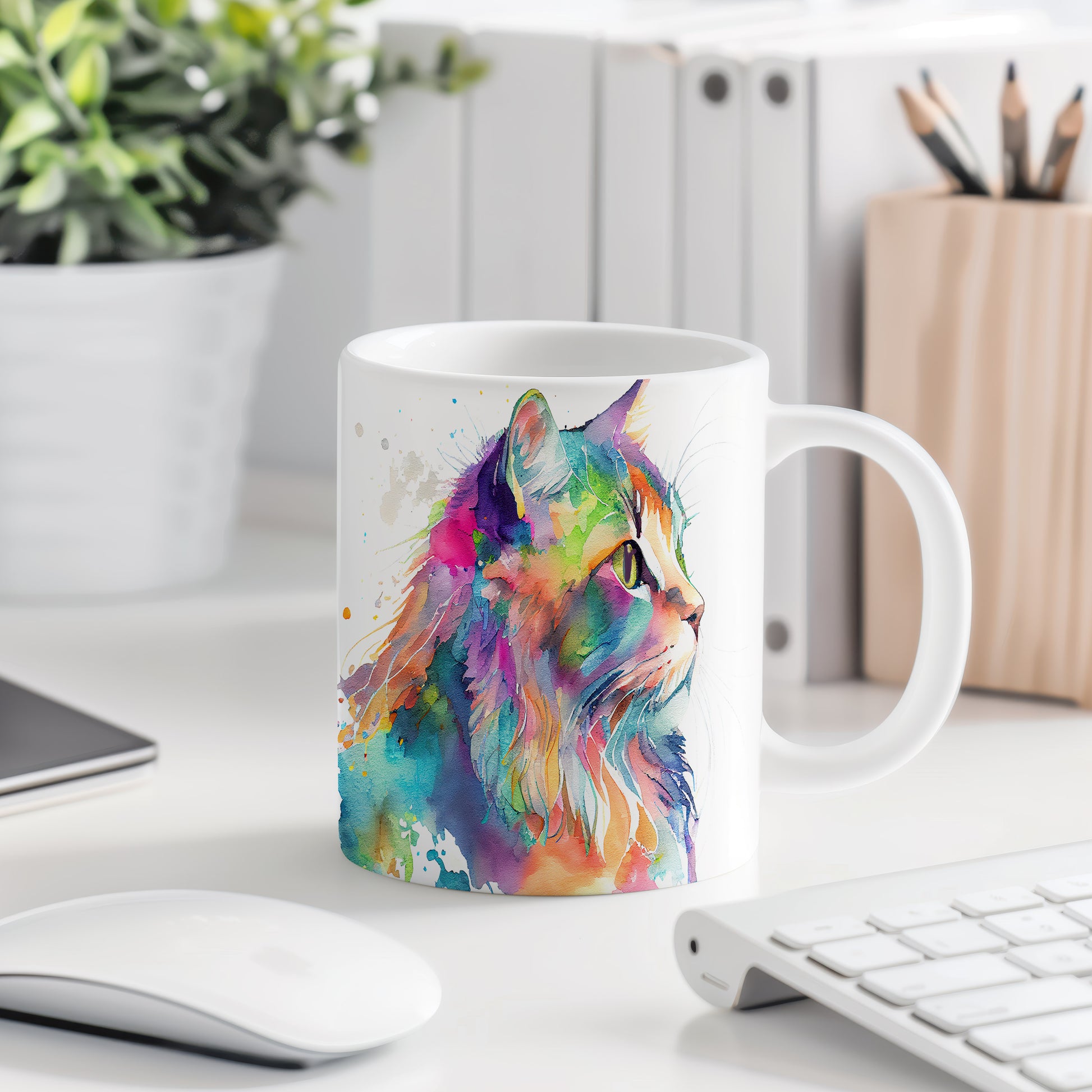 Hrnek s barevnou kočkou – akvarelovým motivem