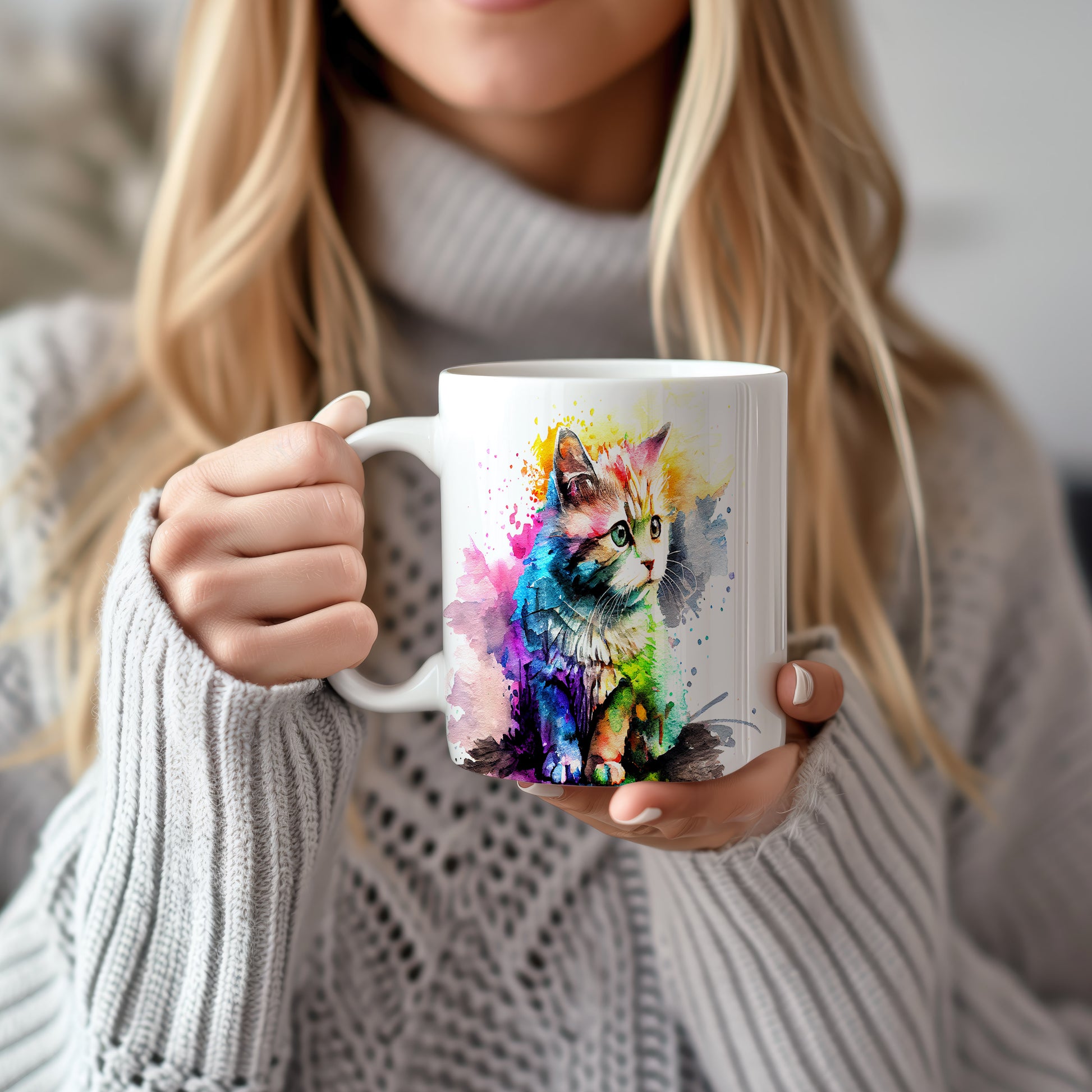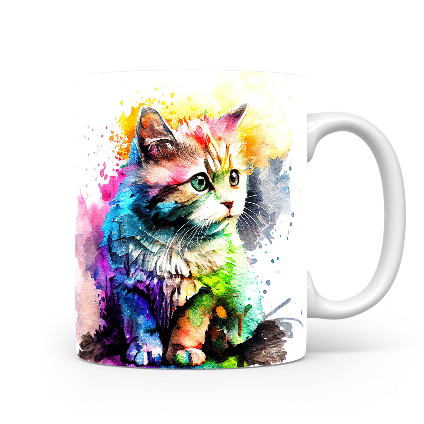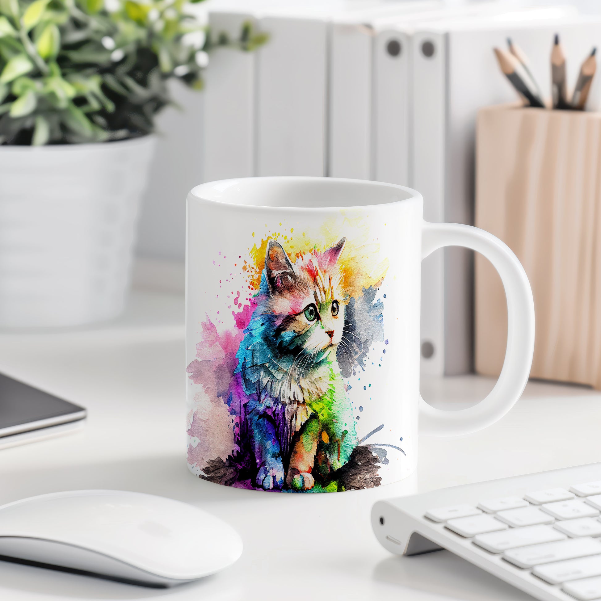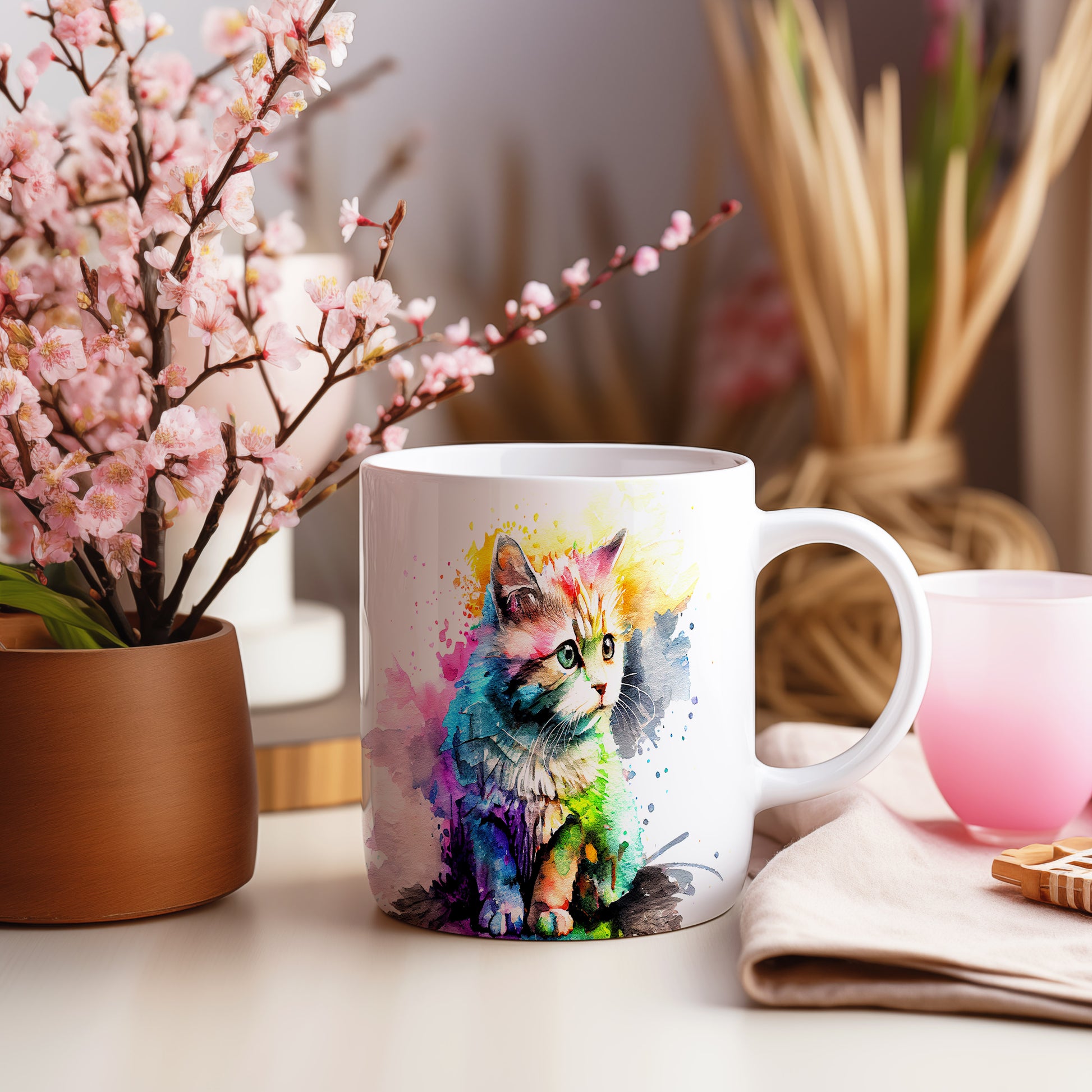 Tento hrnek zobrazuje krásnou kočku v živých barvách a vodovými skvrnami. Je ideální pro milovníky koček a skvělým dárkem pro přátele či rodinu. Materiál: keramika. Objem: 330 ml. Vhodné do myčky i mikrovlnky. Při každém doušku si užijete radost z originálního designu.