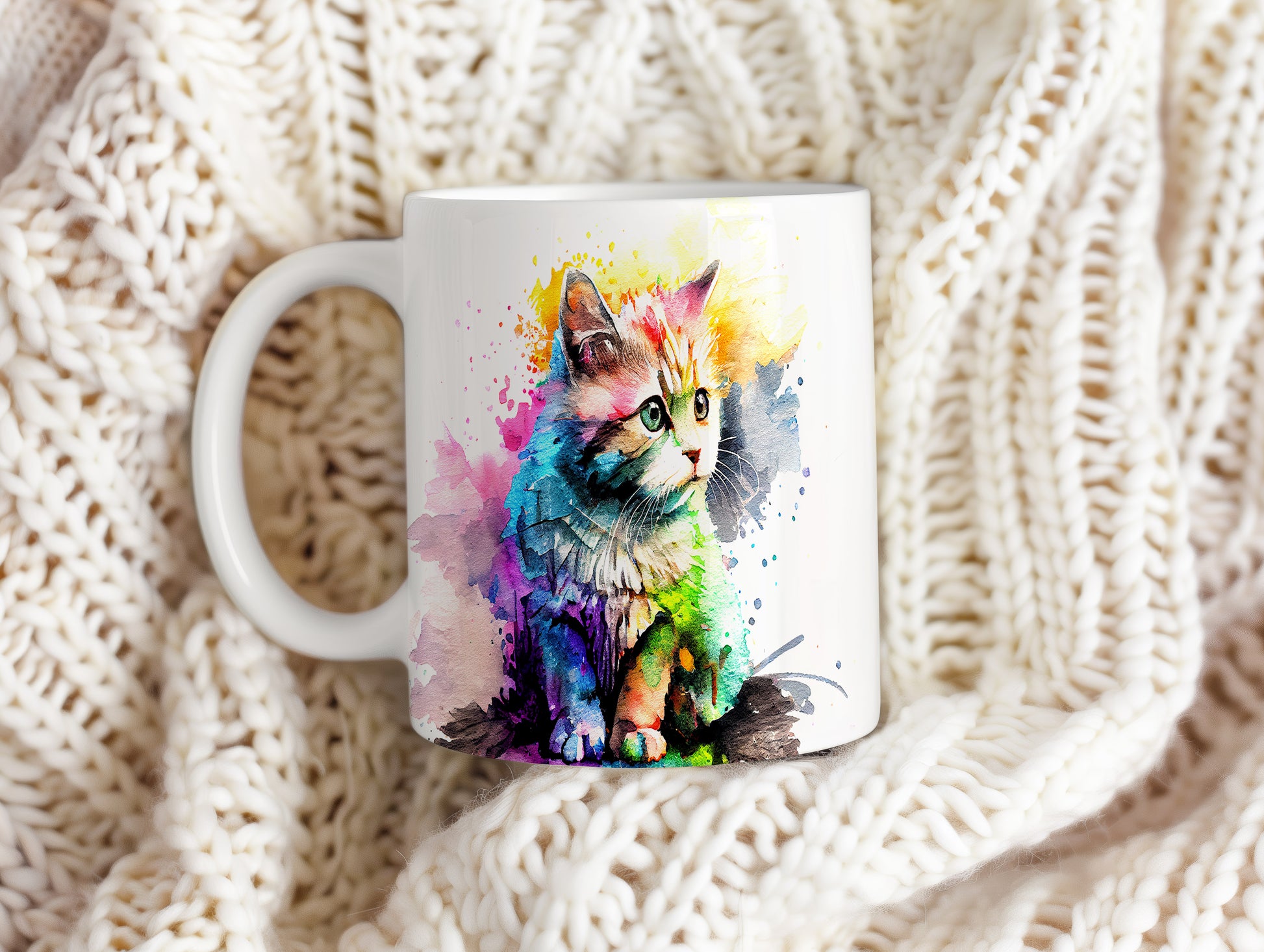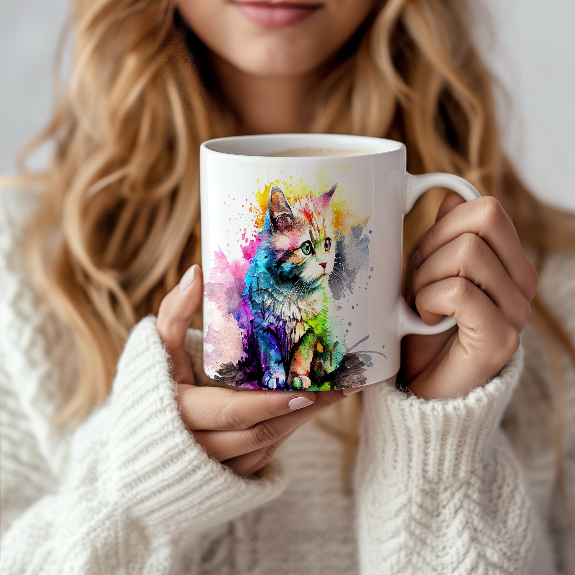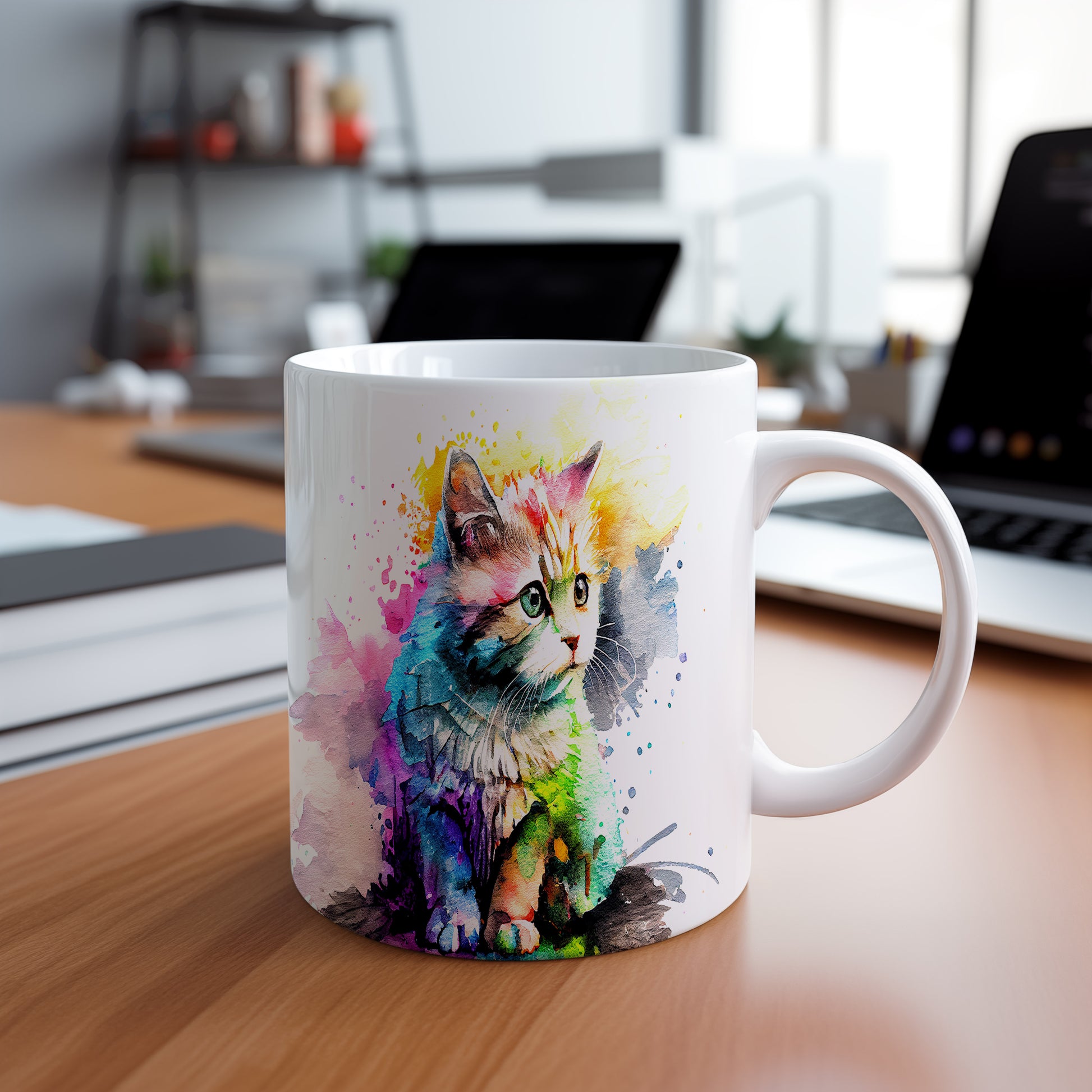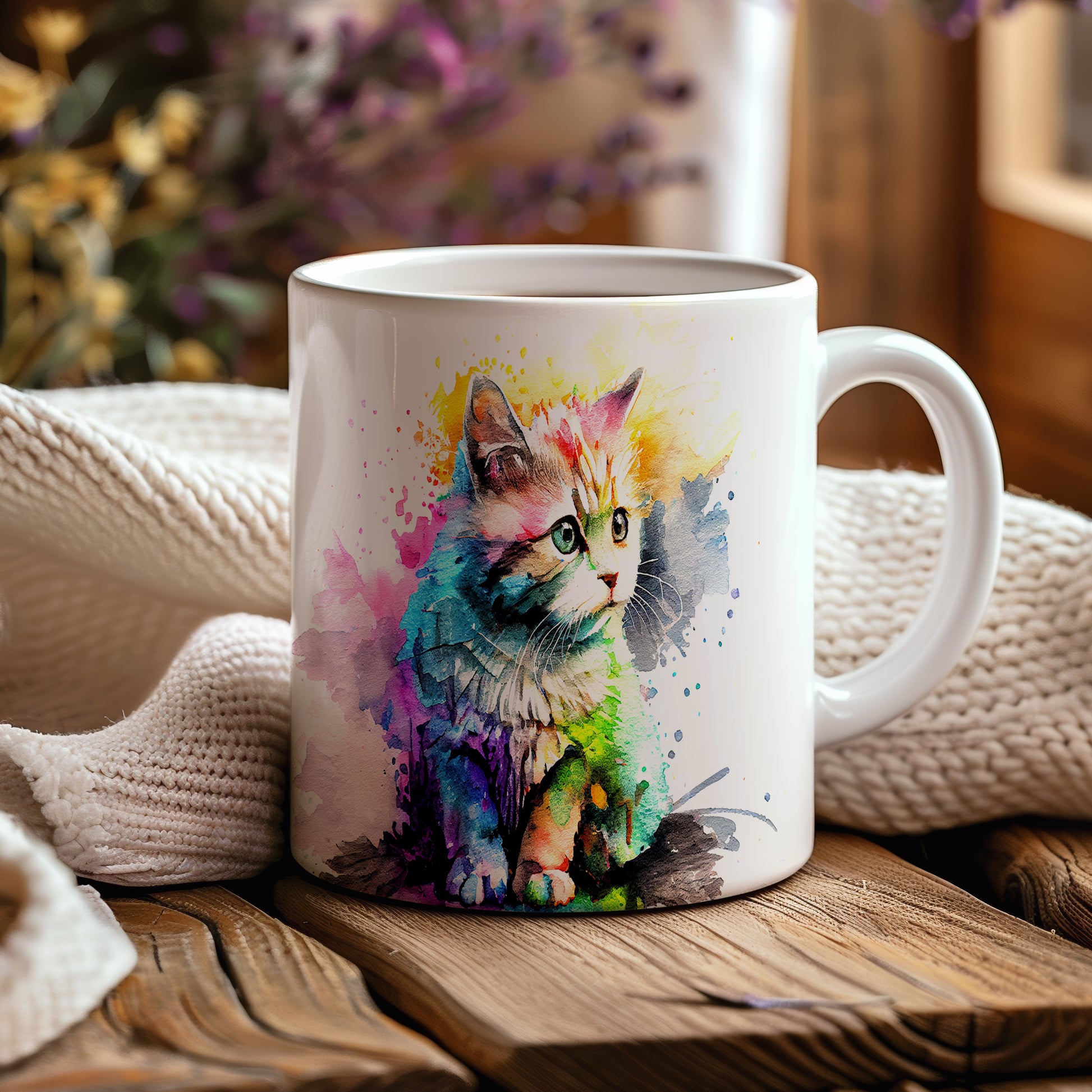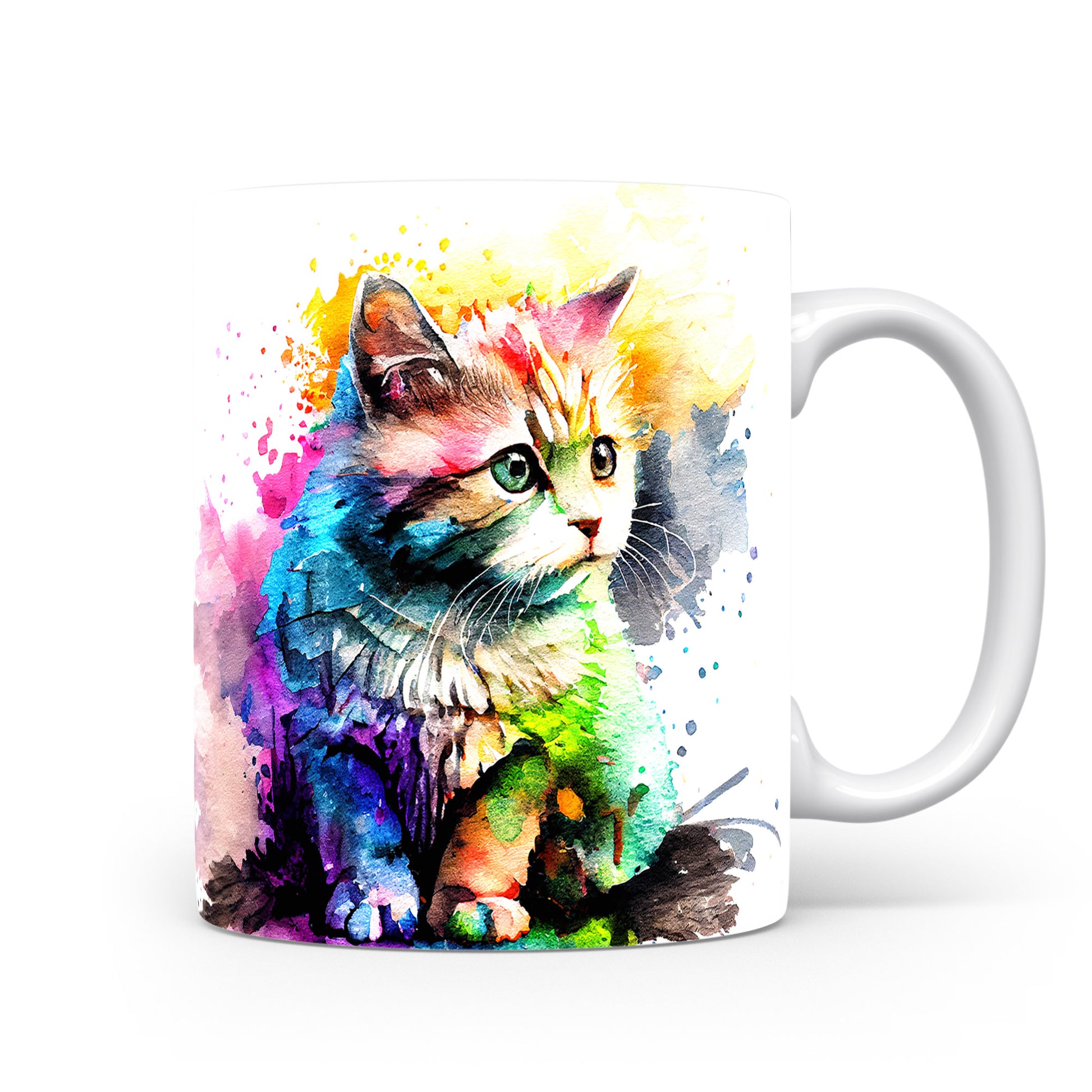 Tento hrnek zobrazuje krásnou kočku v živých barvách a vodovými skvrnami. Je ideální pro milovníky koček a skvělým dárkem pro přátele či rodinu. Materiál: keramika. Objem: 330 ml. Vhodné do myčky i mikrovlnky. Při každém doušku si užijete radost z originálního designu.
