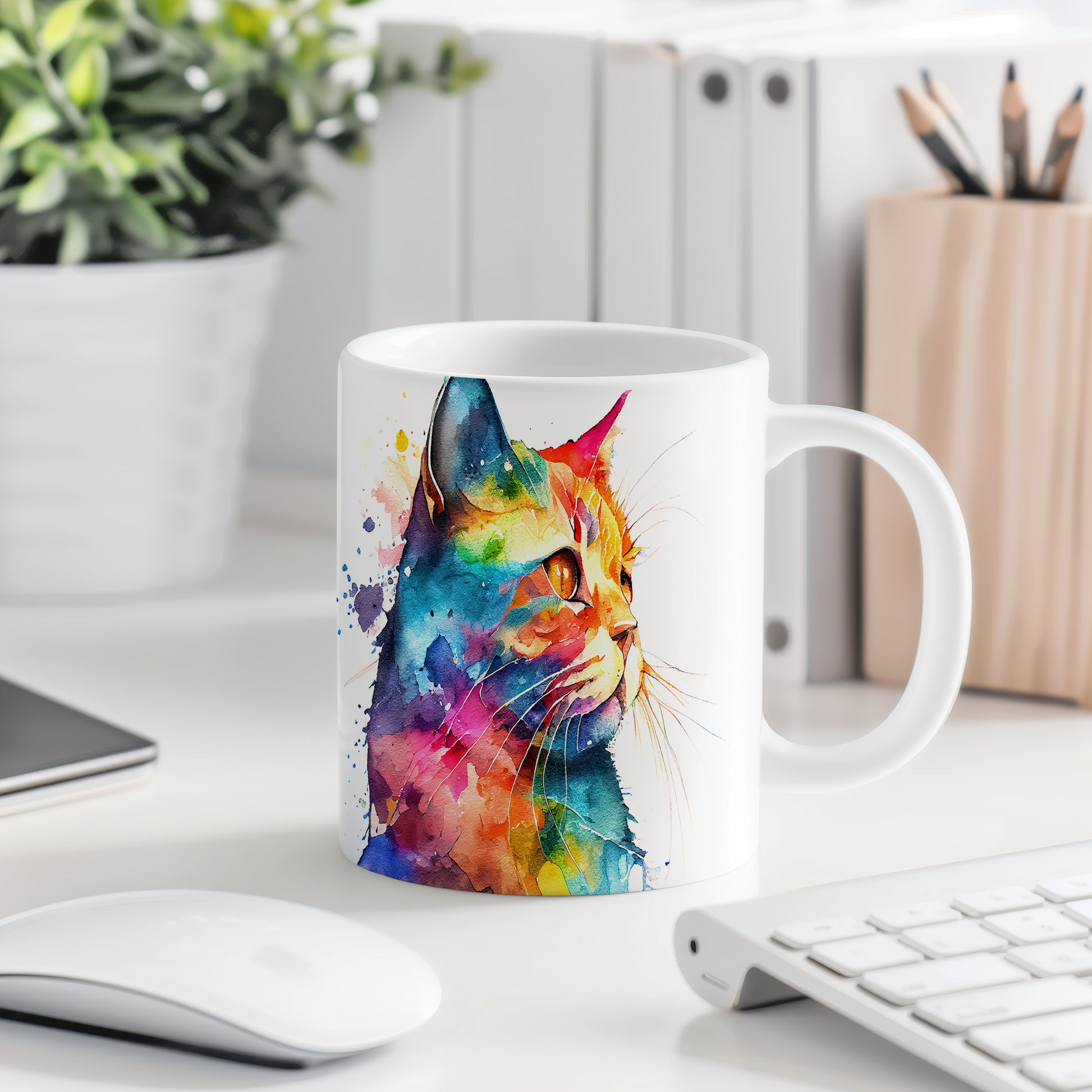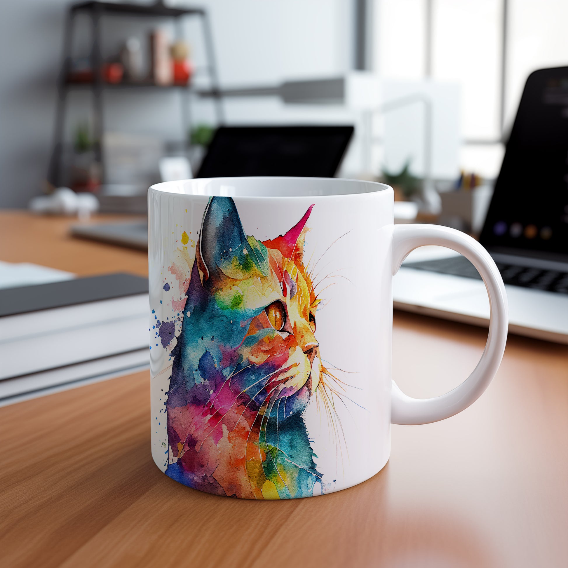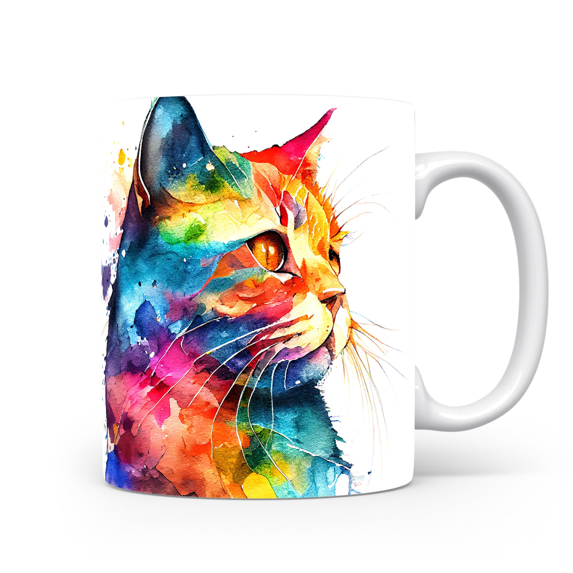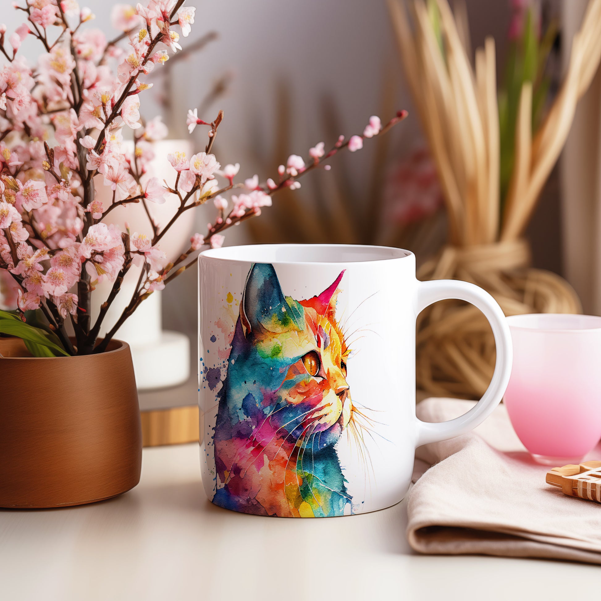 Hrnek s barevnou kočkou v akvarelu