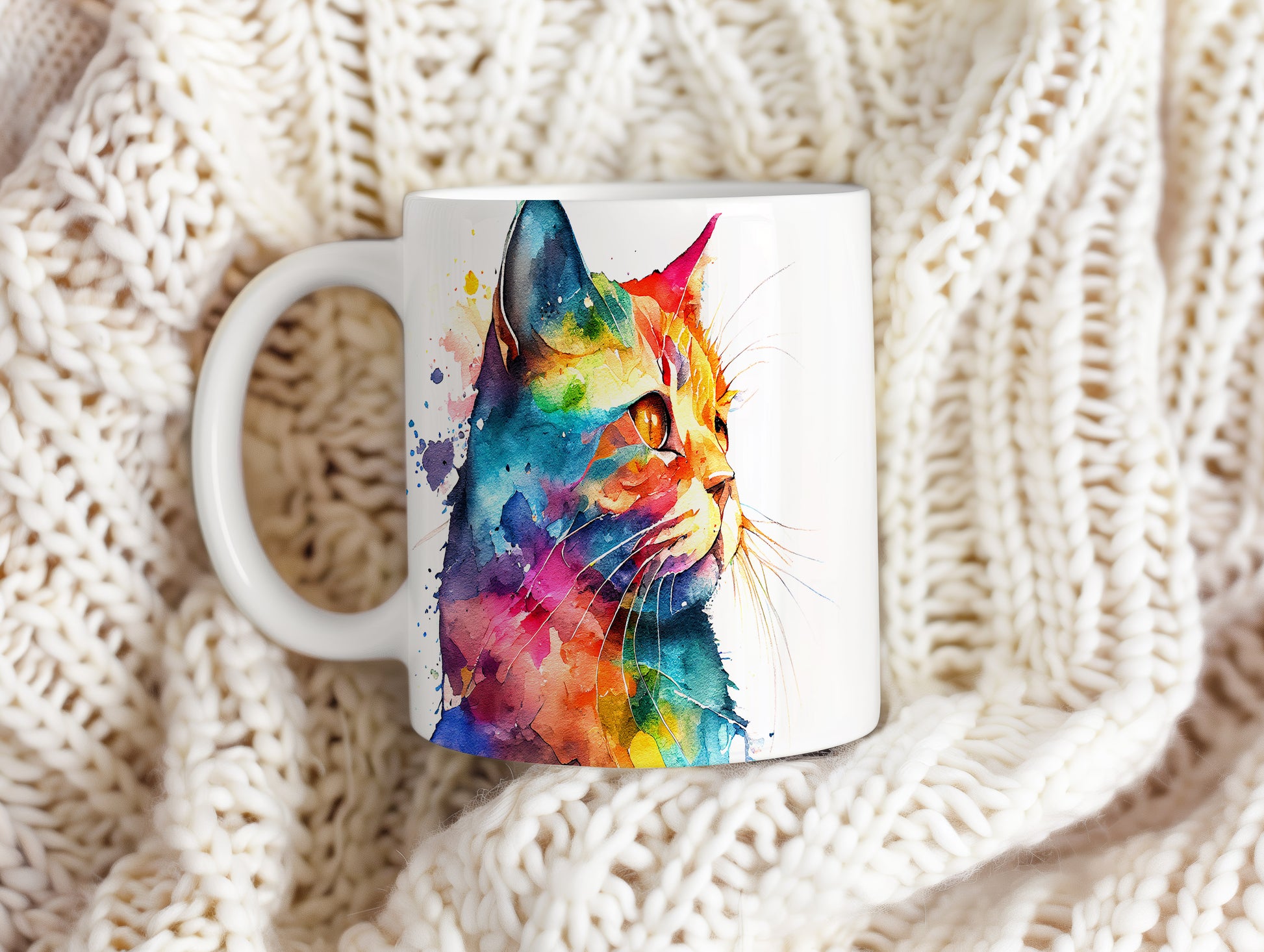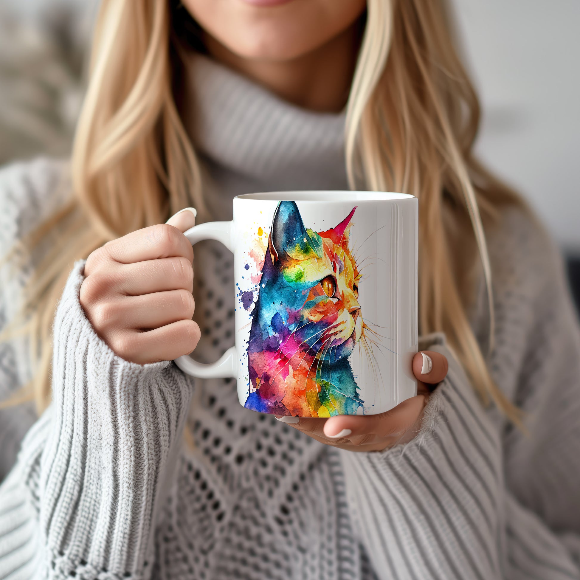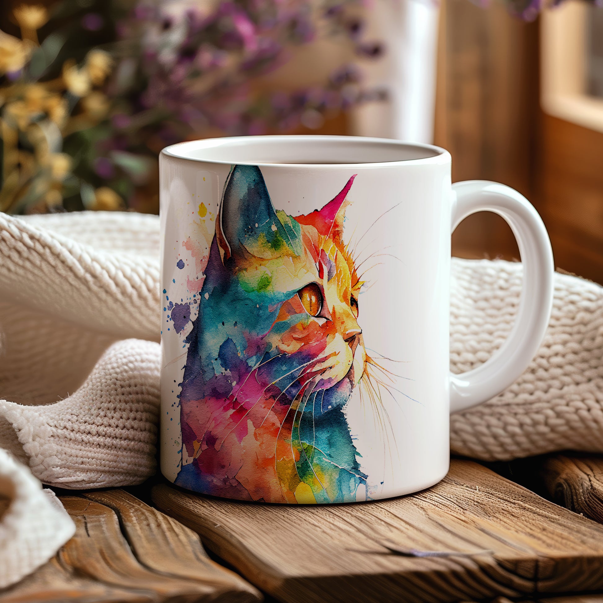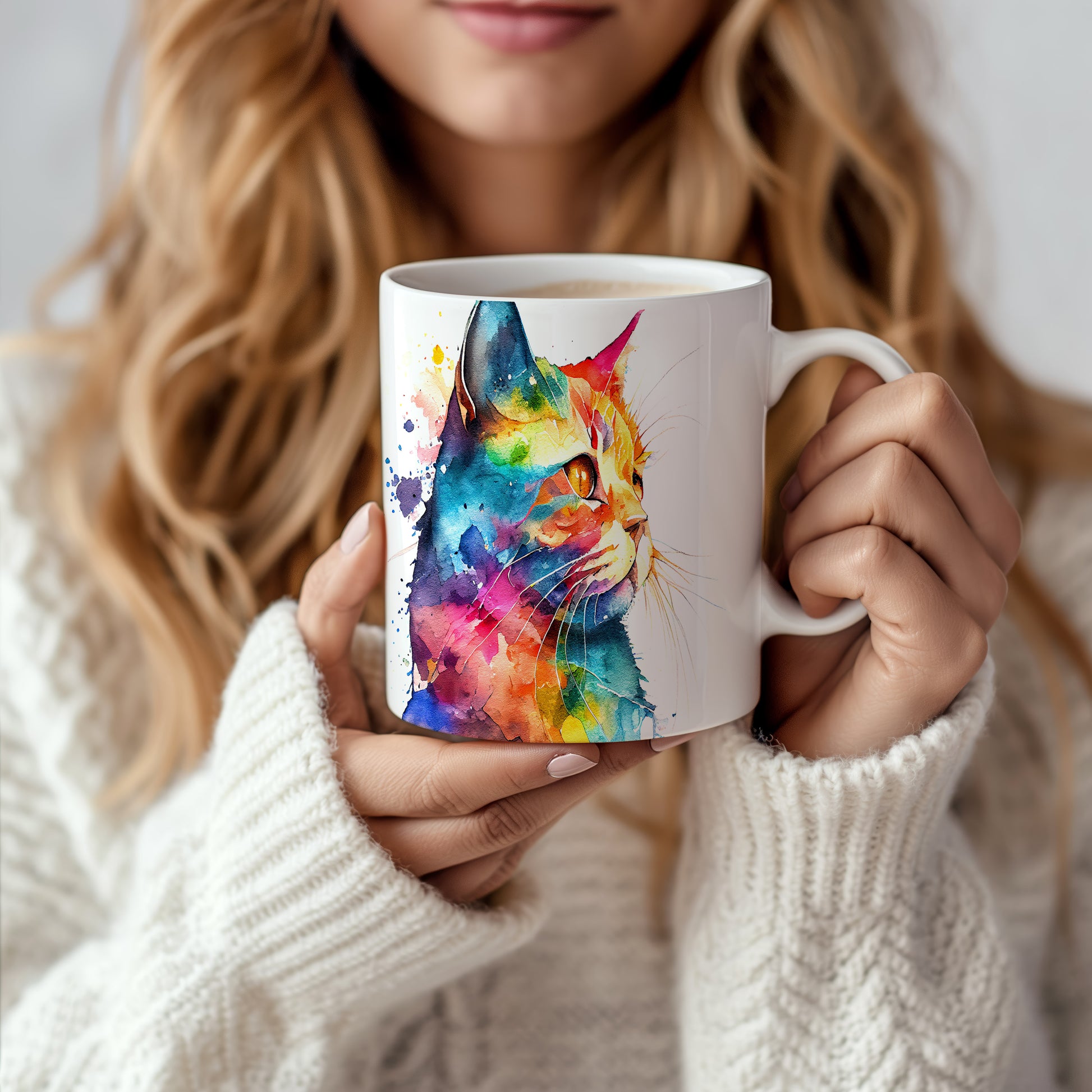 Hrnek s barevnou kočkou v akvarelu