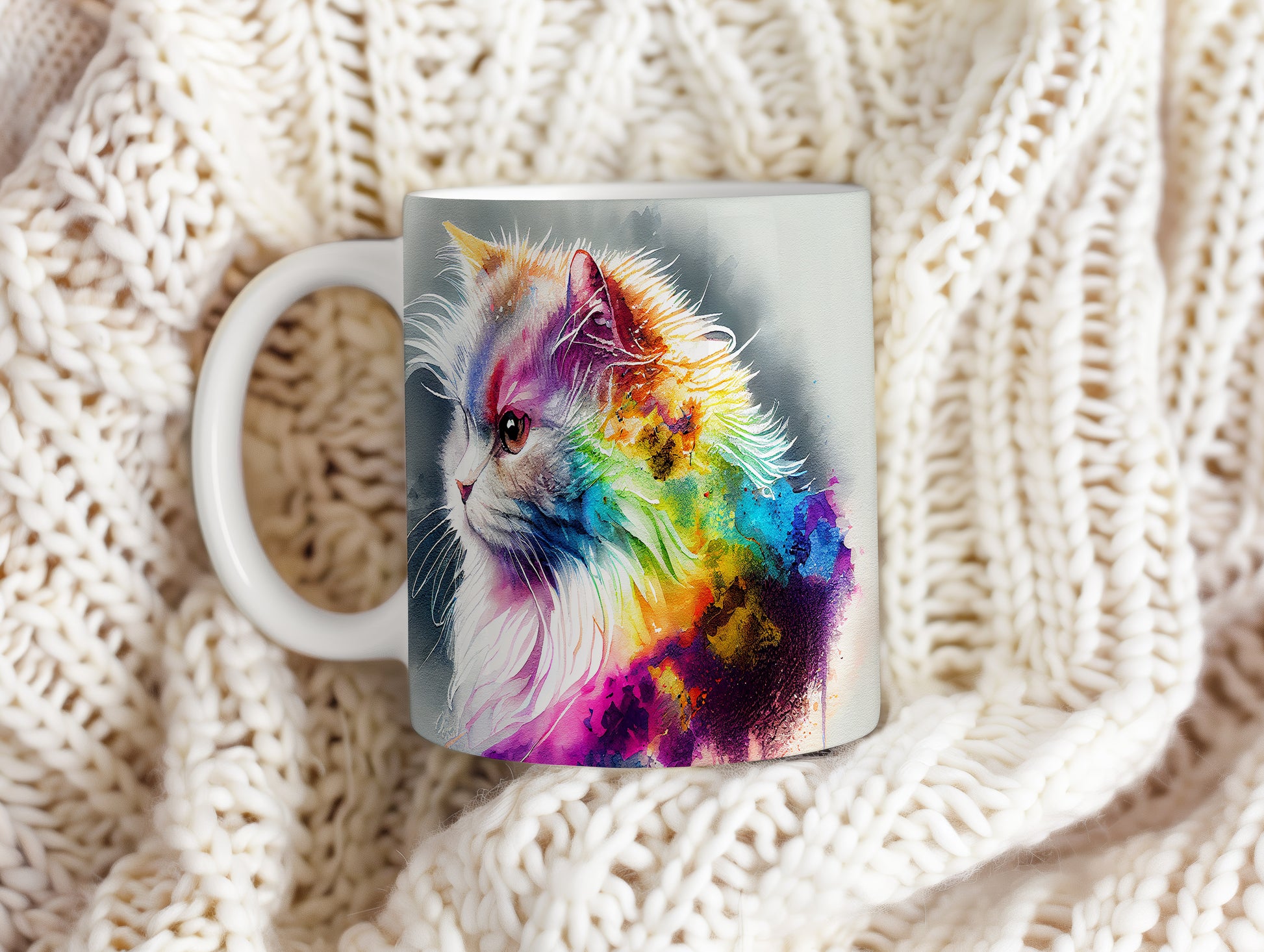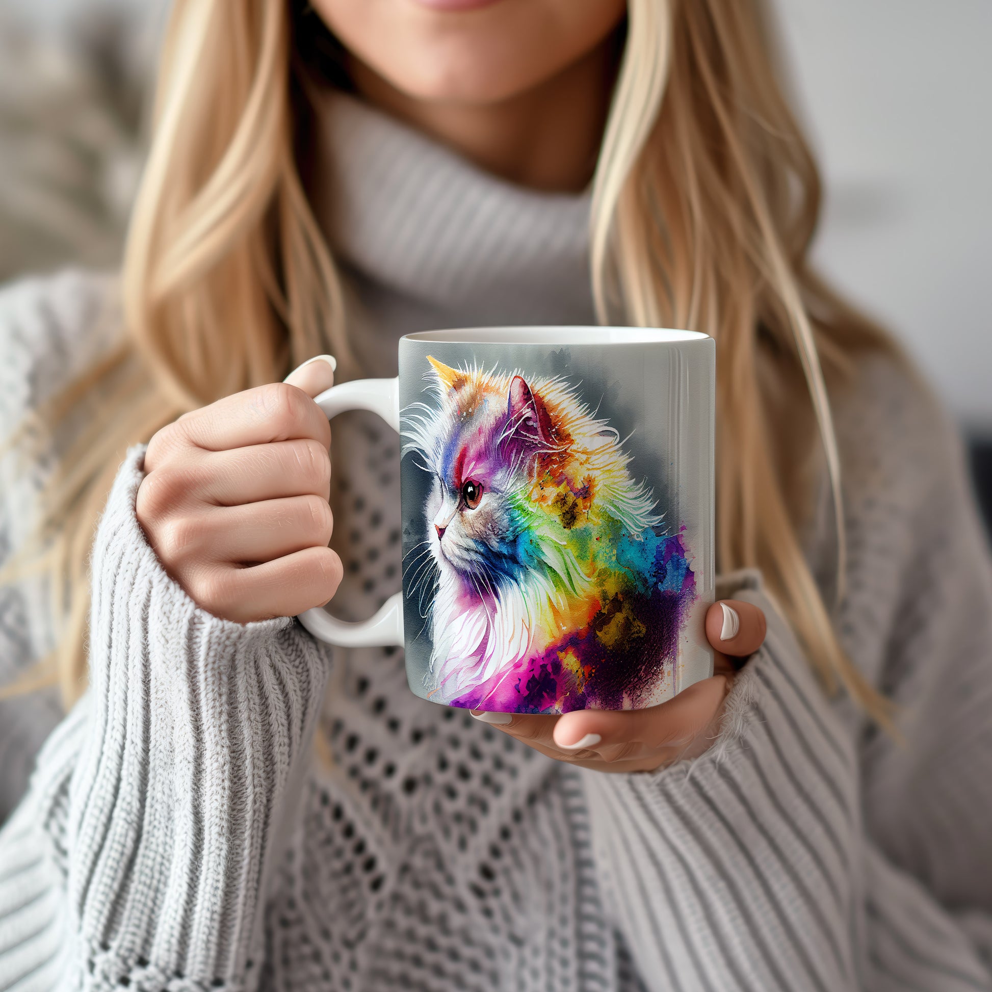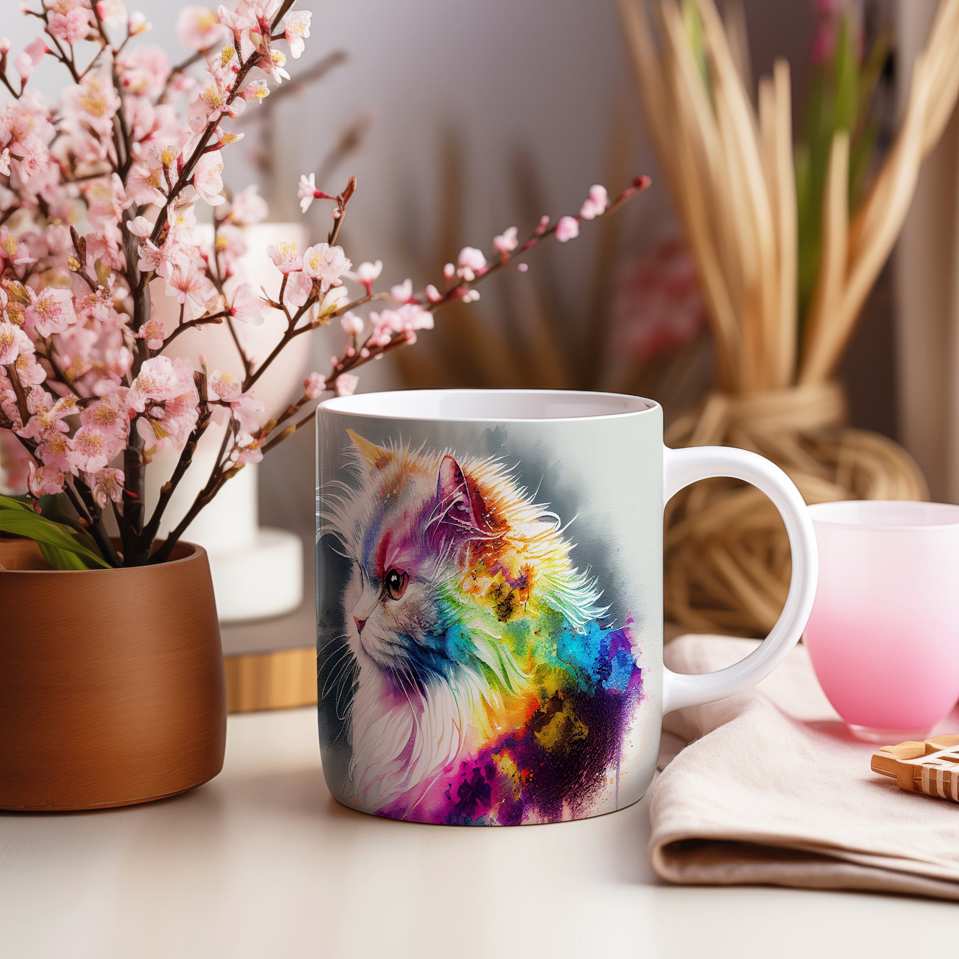 Hrnek s barevnou kočkou ve vodovkách