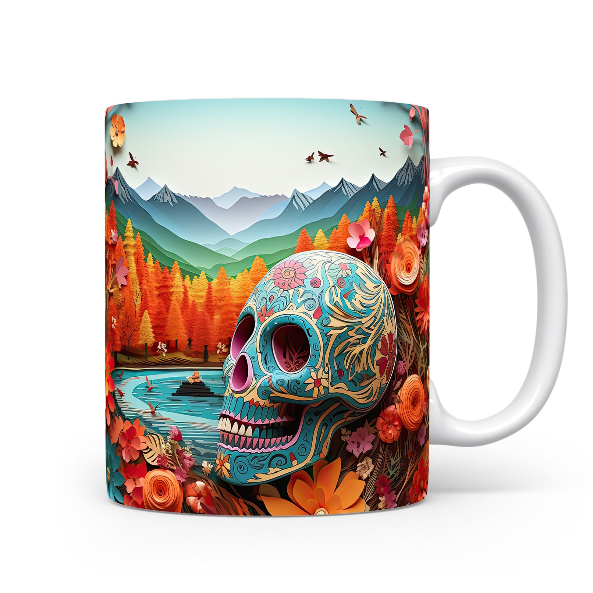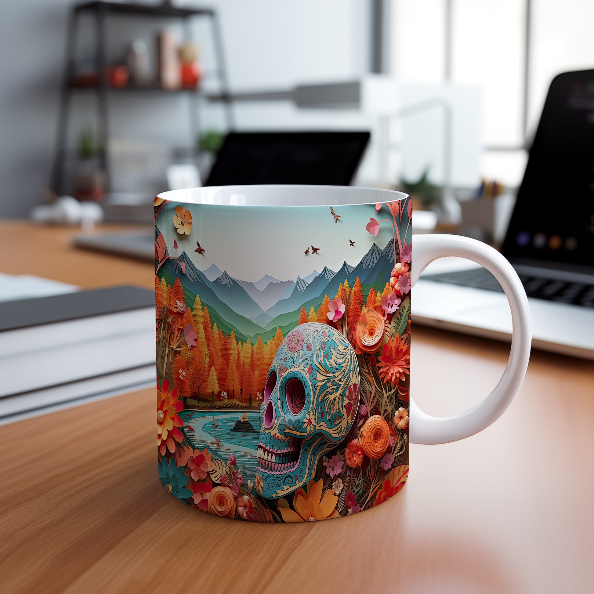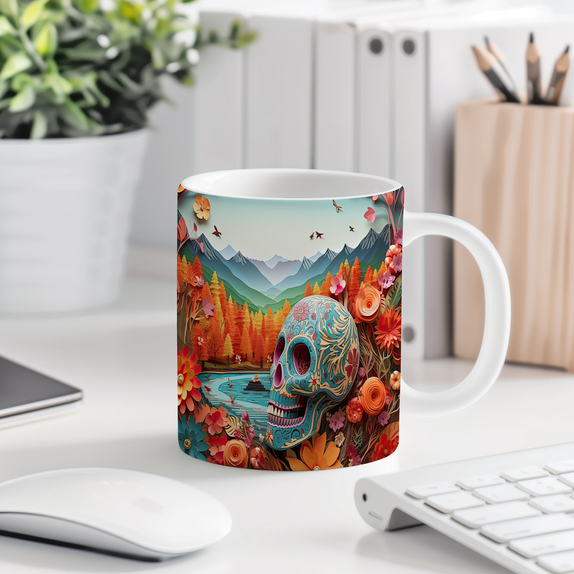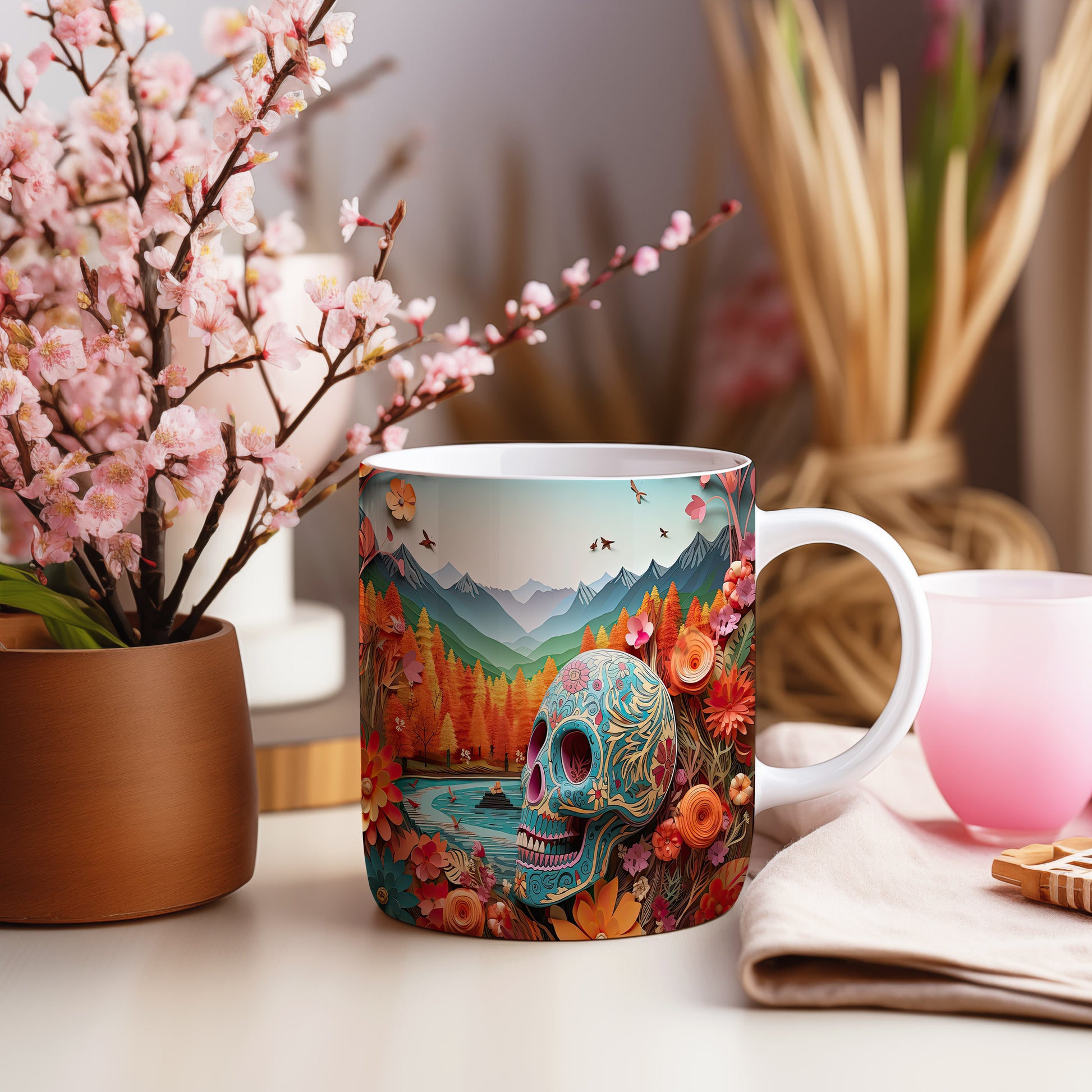 Tento hrnek s designem barevné lebky obklopené květinami a přírodními prvky je skvělým kouskem pro všechny, kdo mají rádi originální styl. Je ideální jako dárek pro přátele nebo rodinu, kteří ocení jedinečnost. Materiál: keramika. Objem: 330 ml. Vhodné do myčky i mikrovlnky. Používání tohoto hrnku přináší radost z pití oblíbeného nápoje.