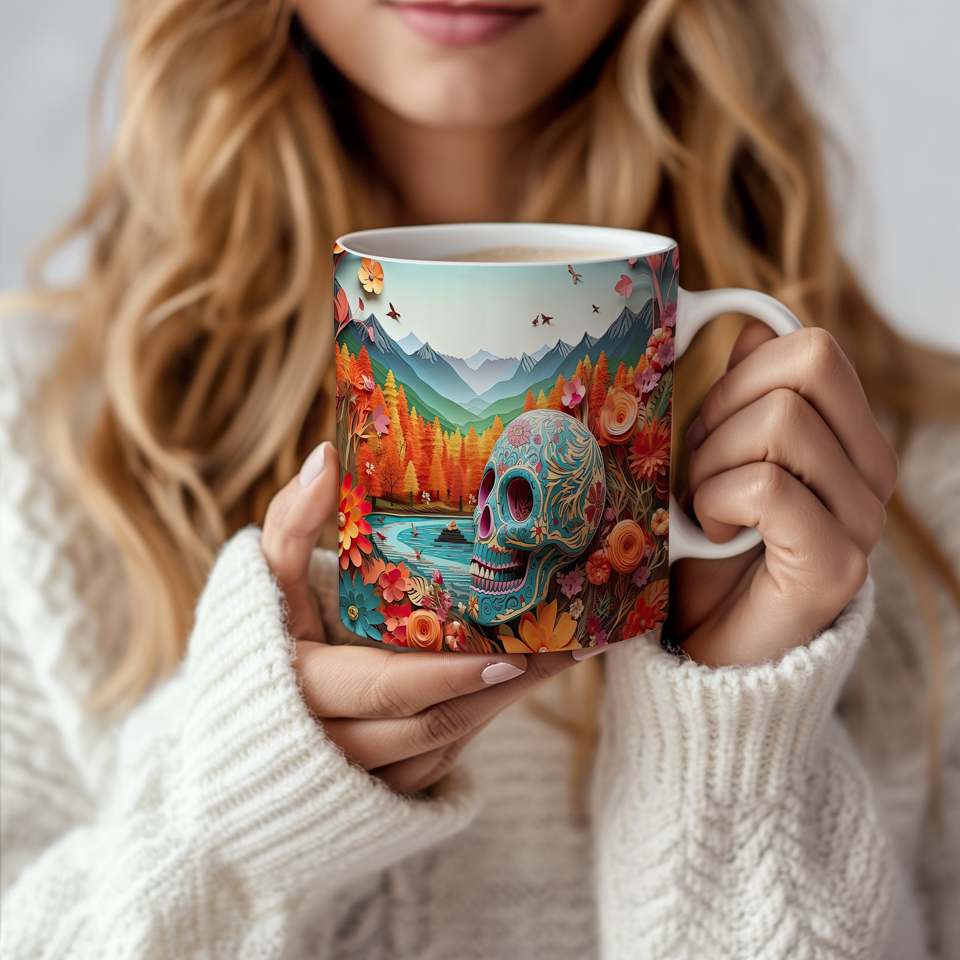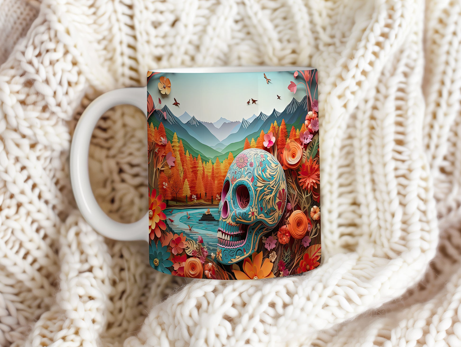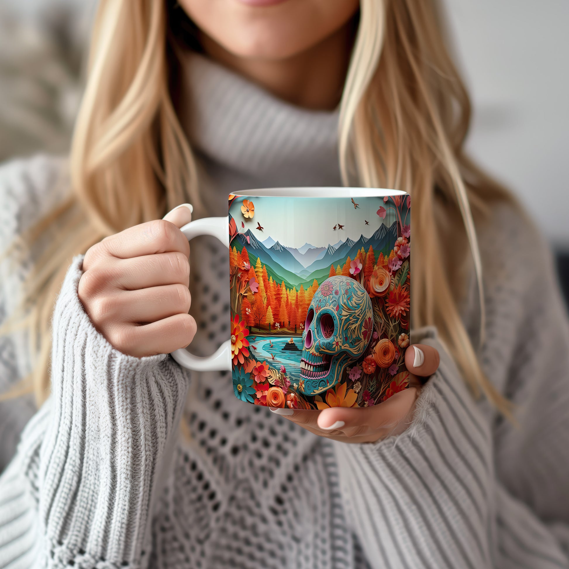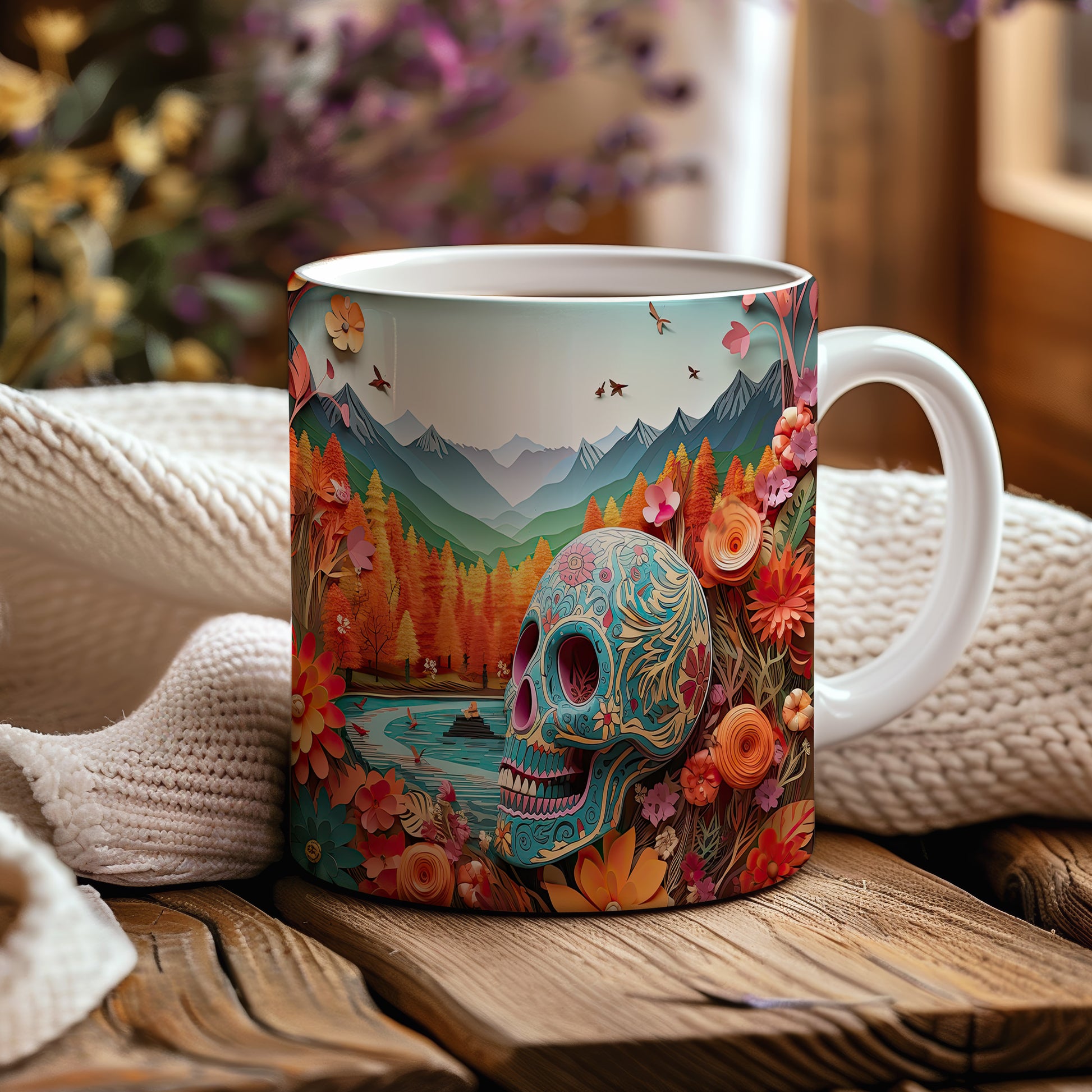 Tento hrnek s designem barevné lebky obklopené květinami a přírodními prvky je skvělým kouskem pro všechny, kdo mají rádi originální styl. Je ideální jako dárek pro přátele nebo rodinu, kteří ocení jedinečnost. Materiál: keramika. Objem: 330 ml. Vhodné do myčky i mikrovlnky. Používání tohoto hrnku přináší radost z pití oblíbeného nápoje.