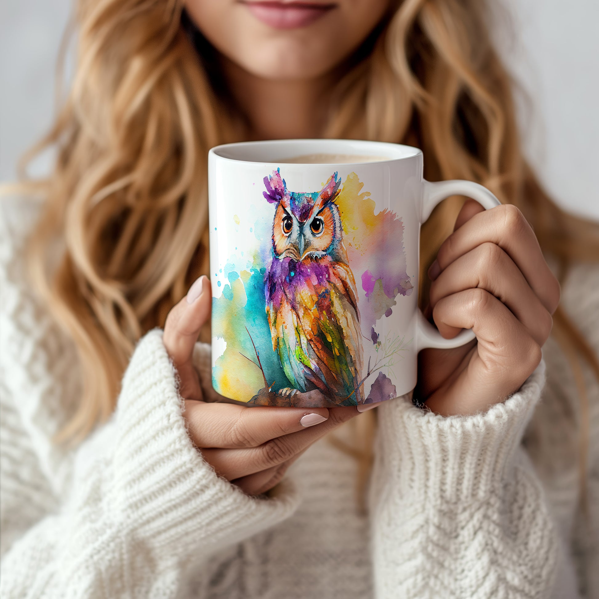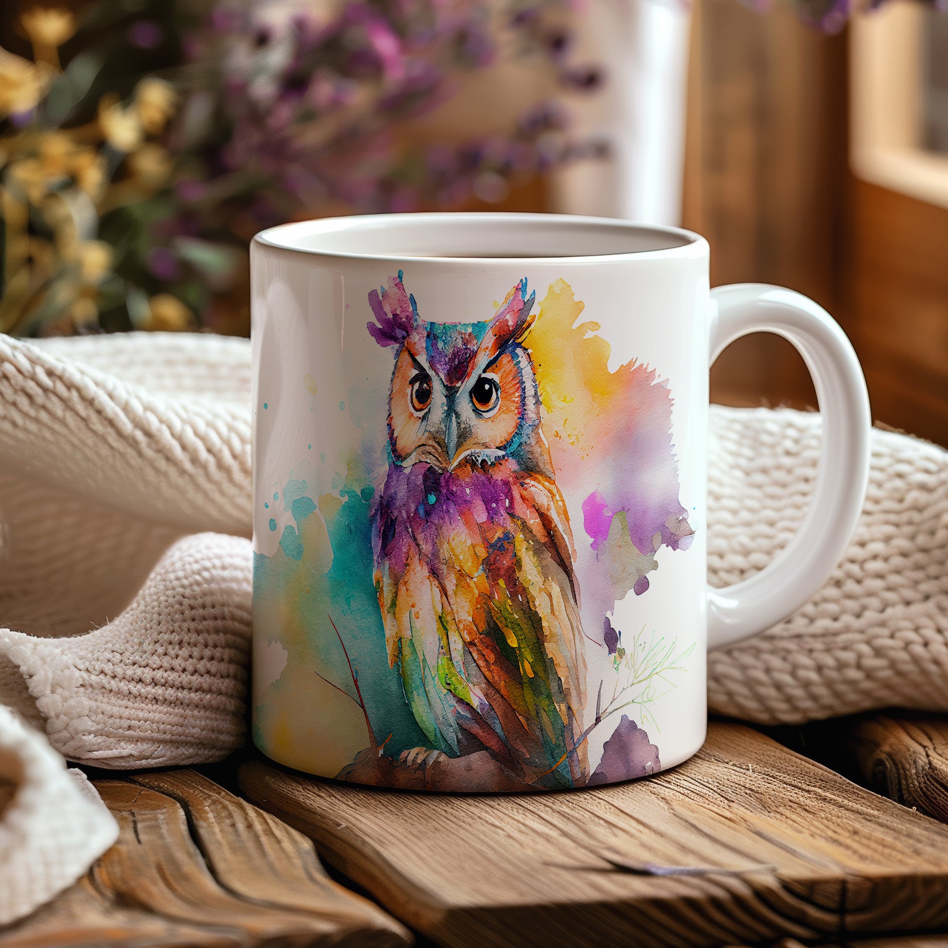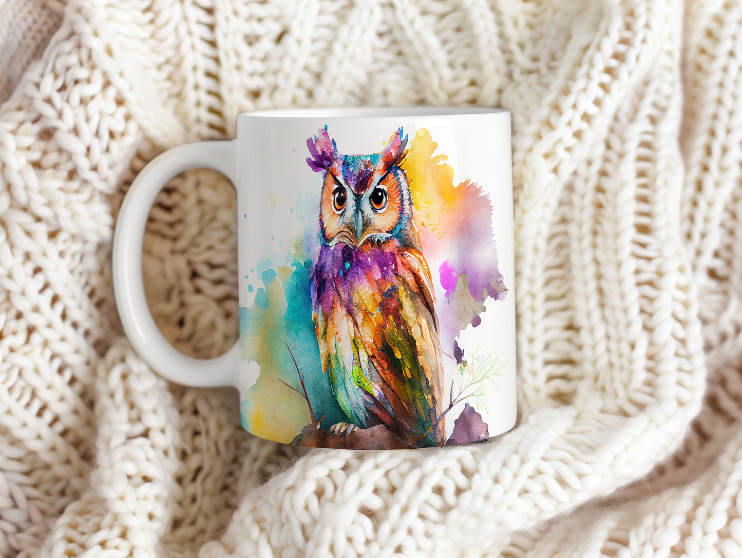 Hrnek s barevnou sovičkou – akvarelovým motivem