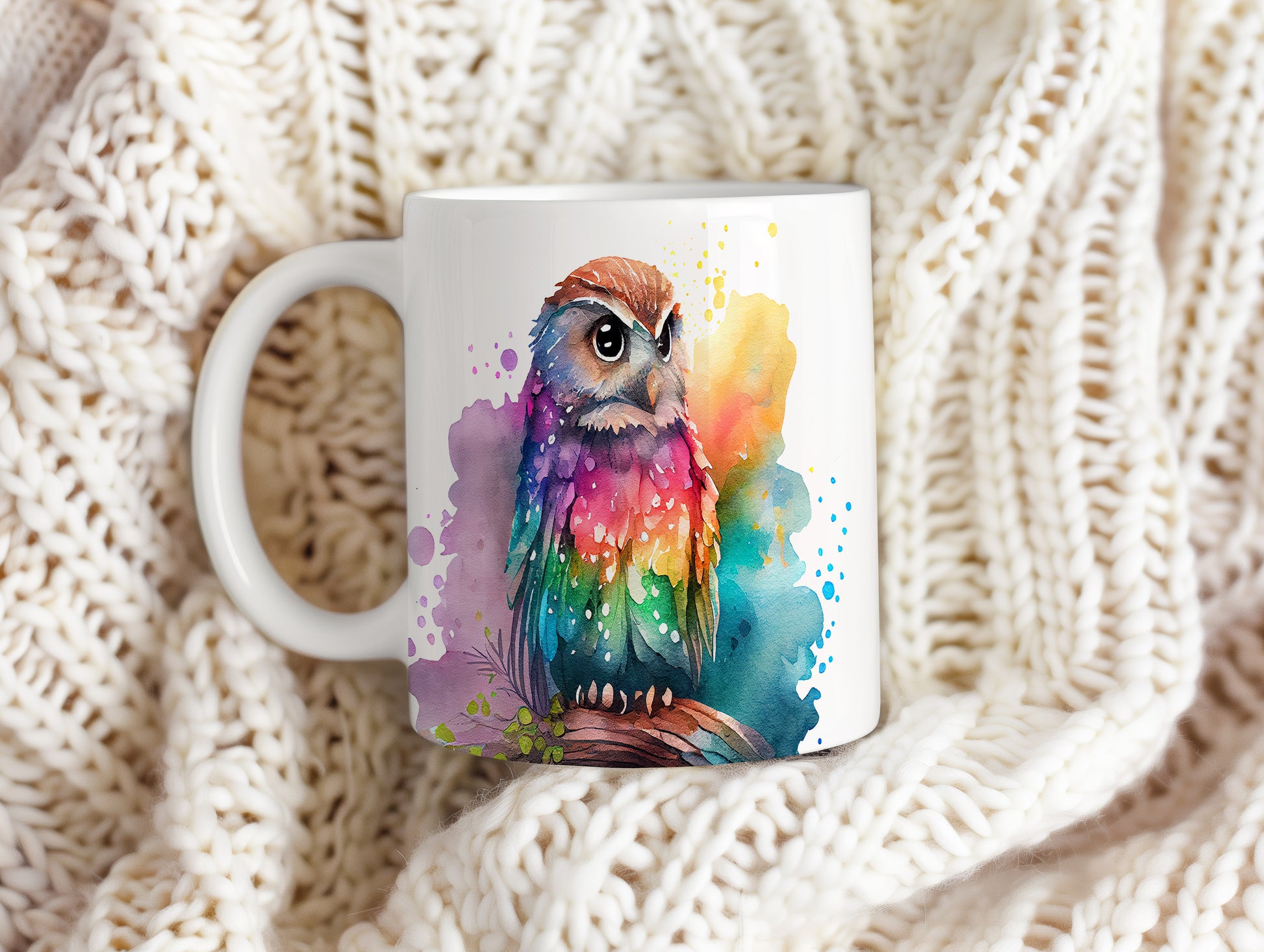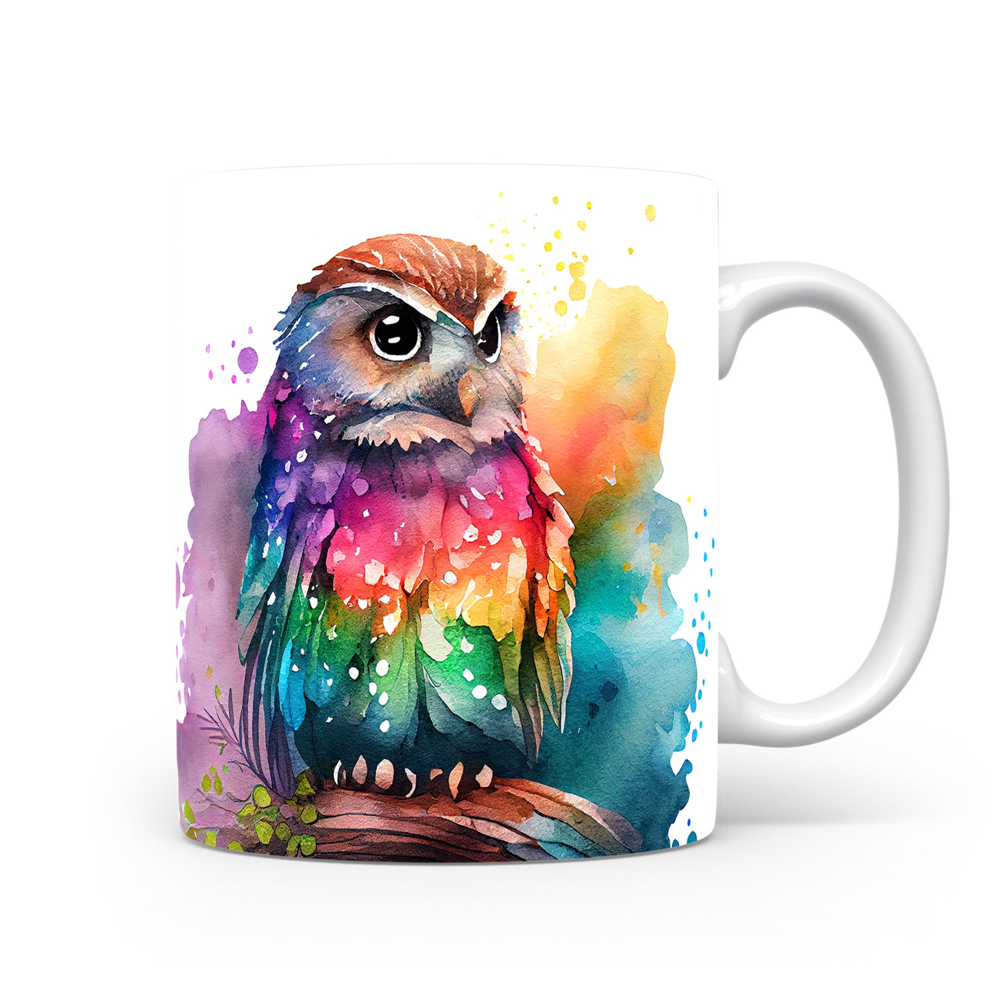 Hrnek s barevnou sovou na větvi