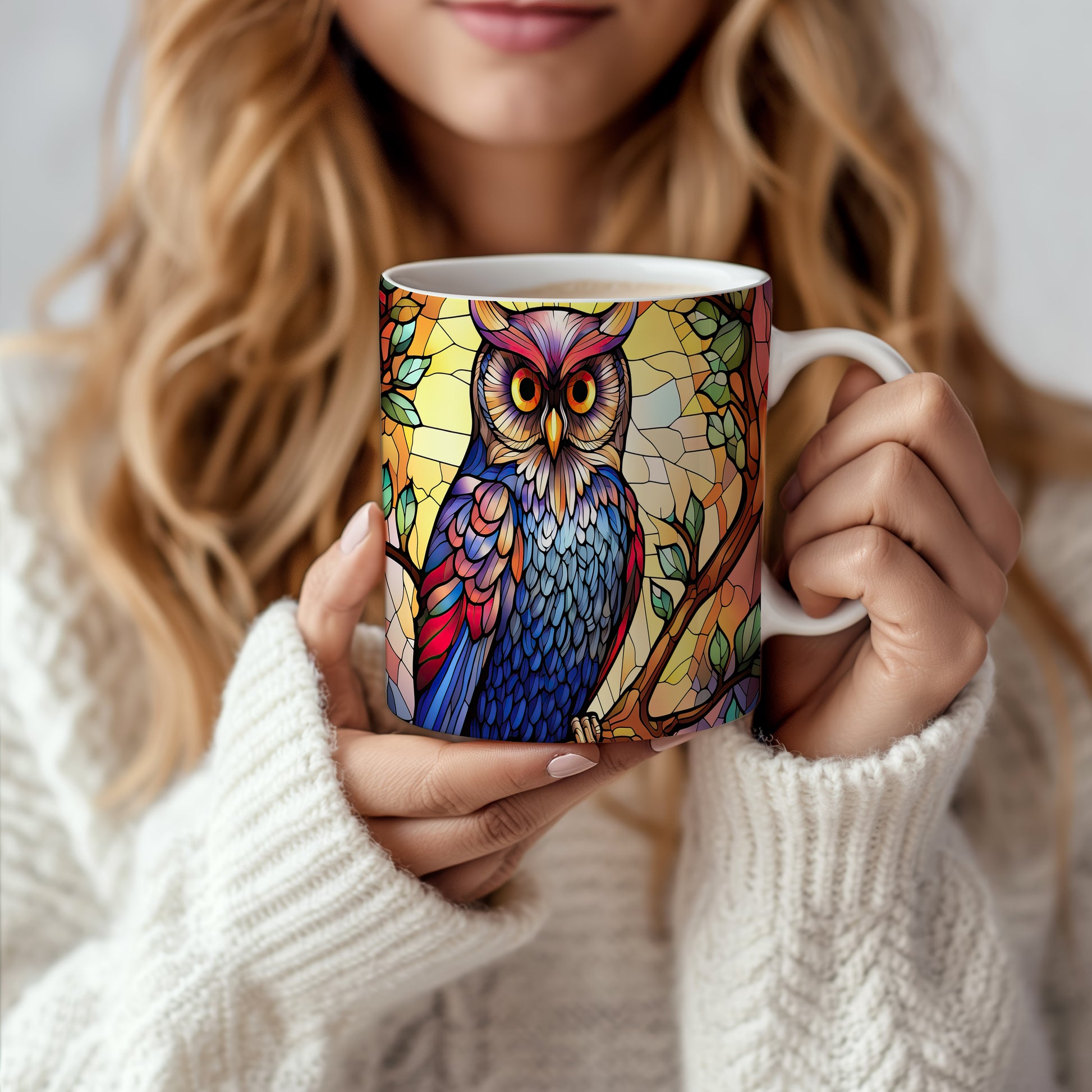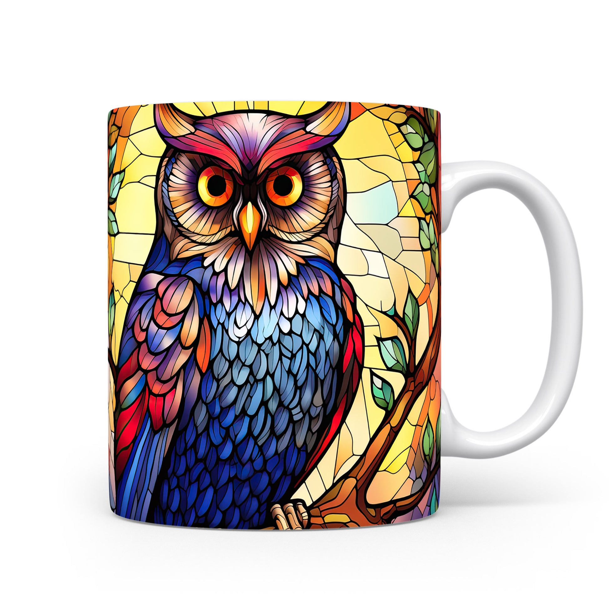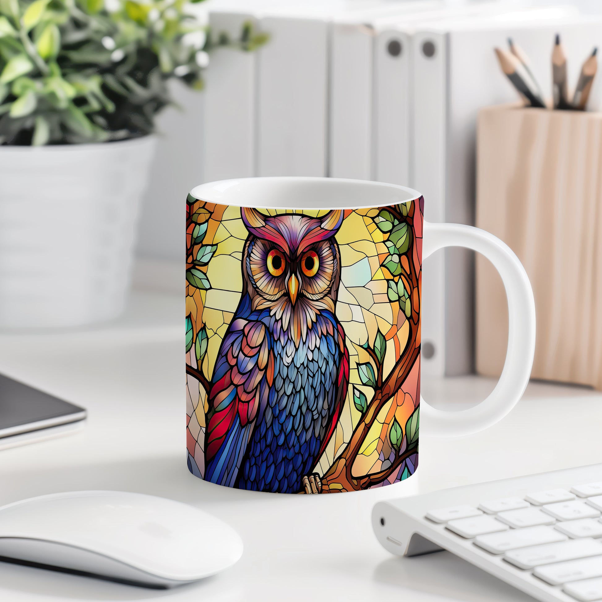 Hrnek s barevnou sovou – vtipnou digitální ilustrací