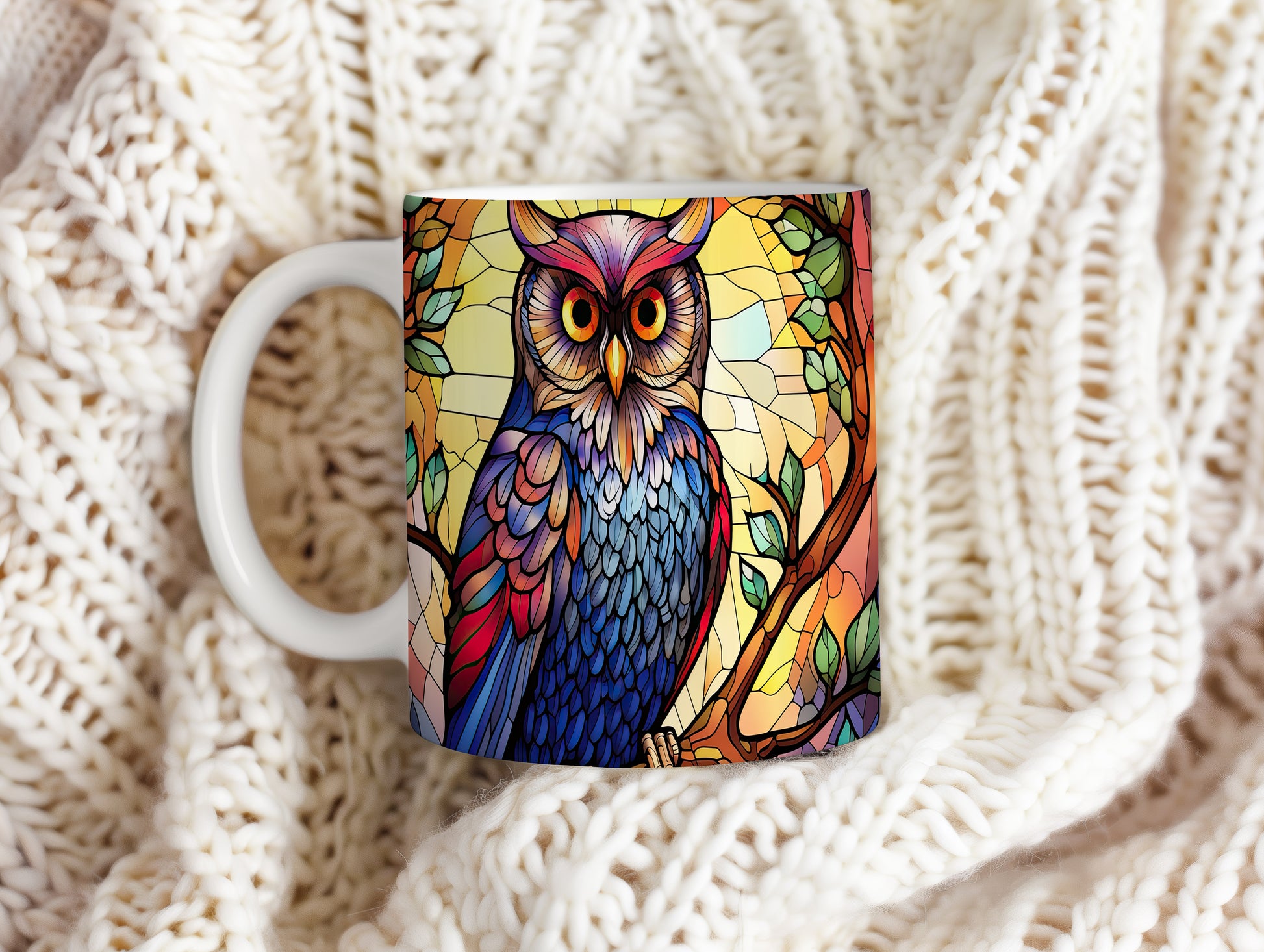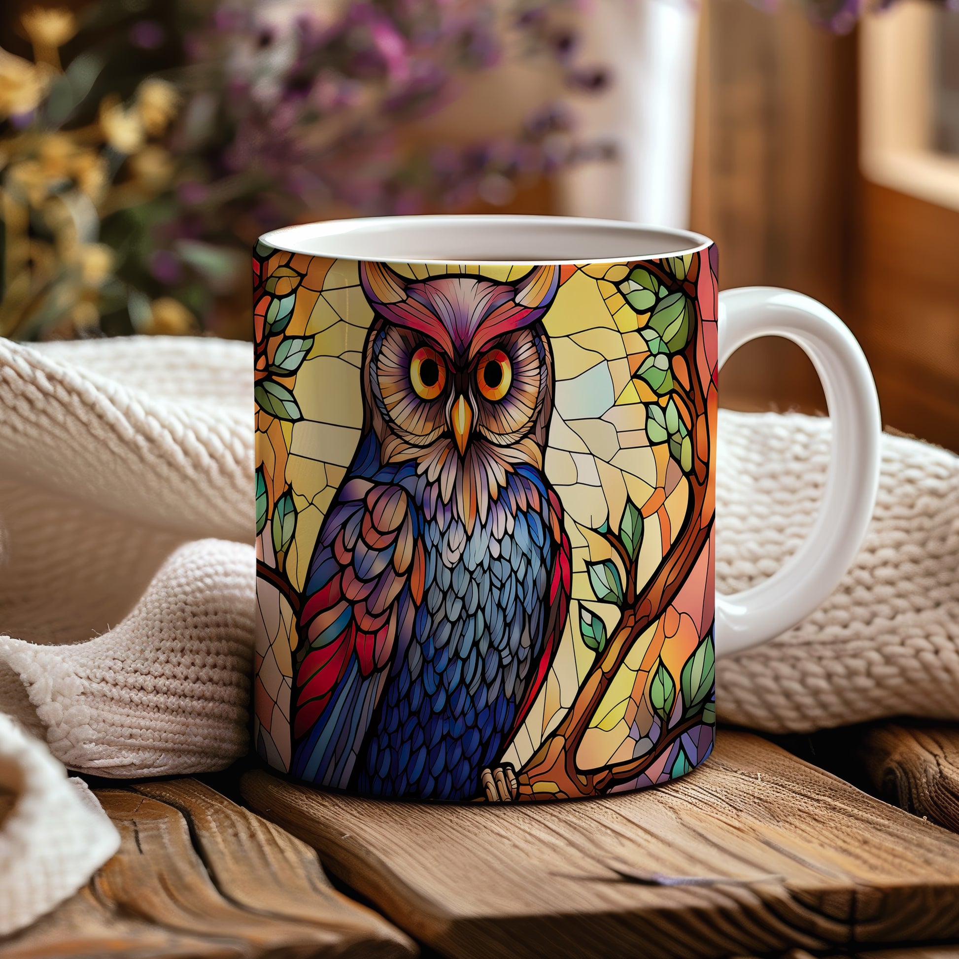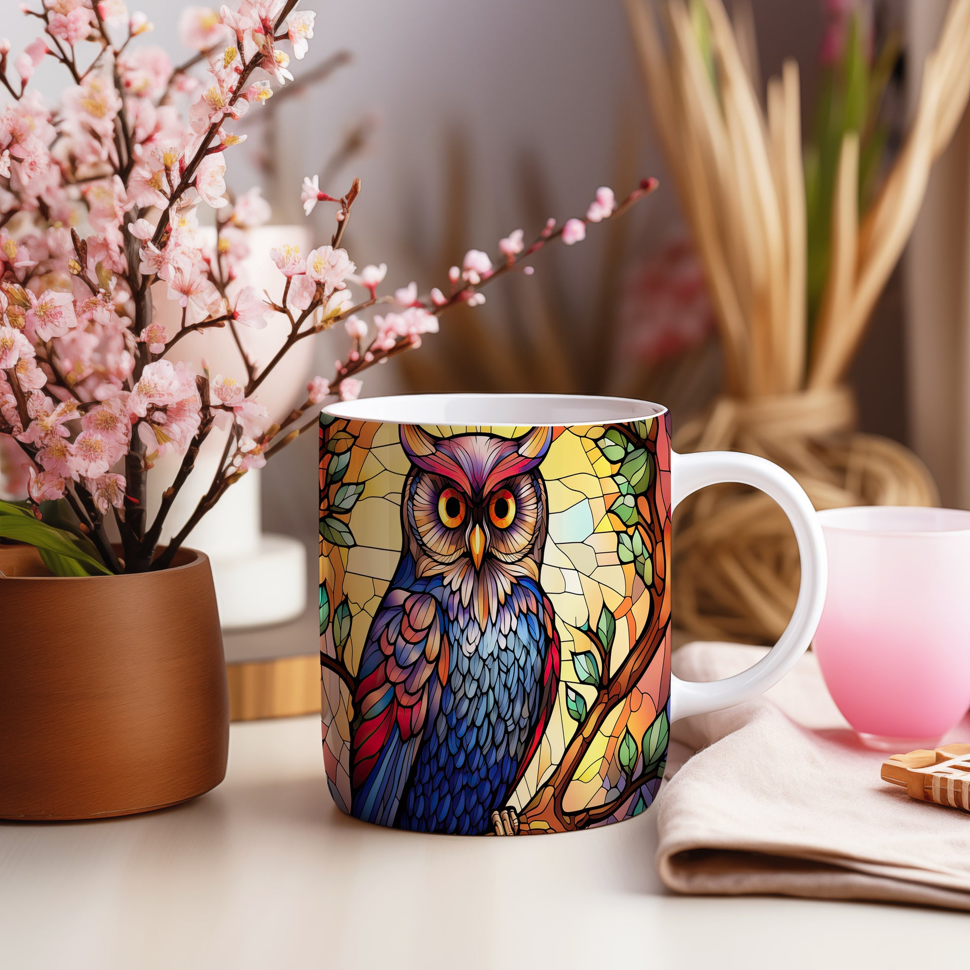 Hrnek s barevnou sovou – vtipnou digitální ilustrací