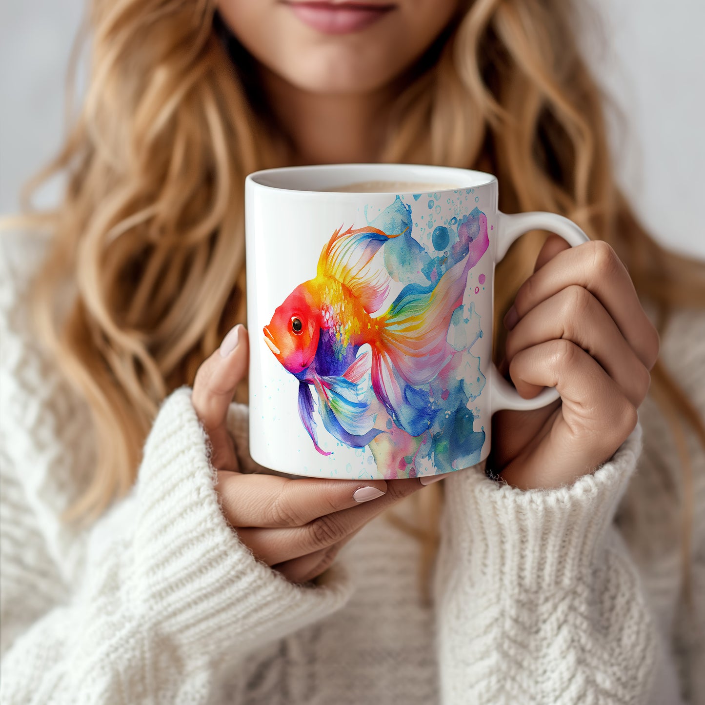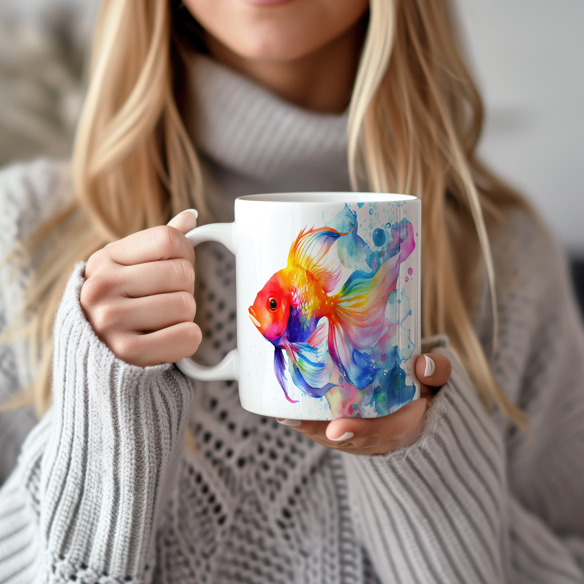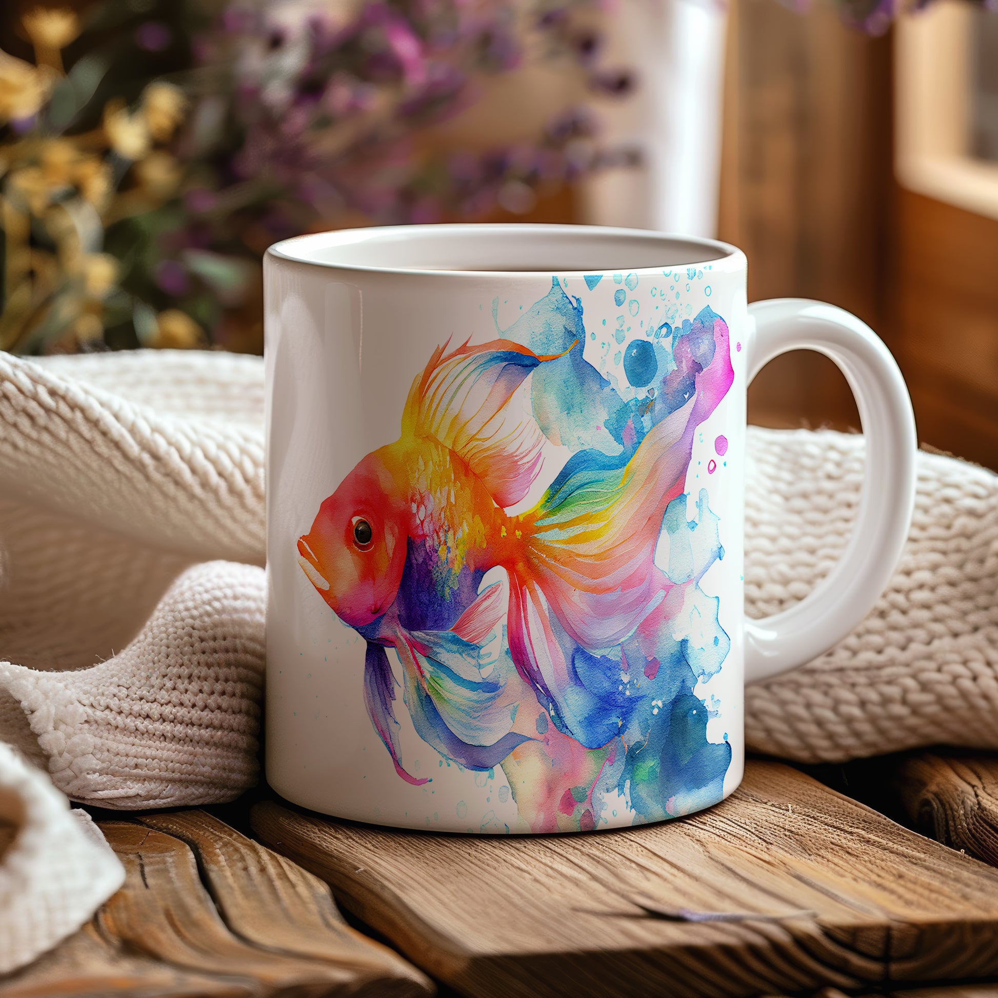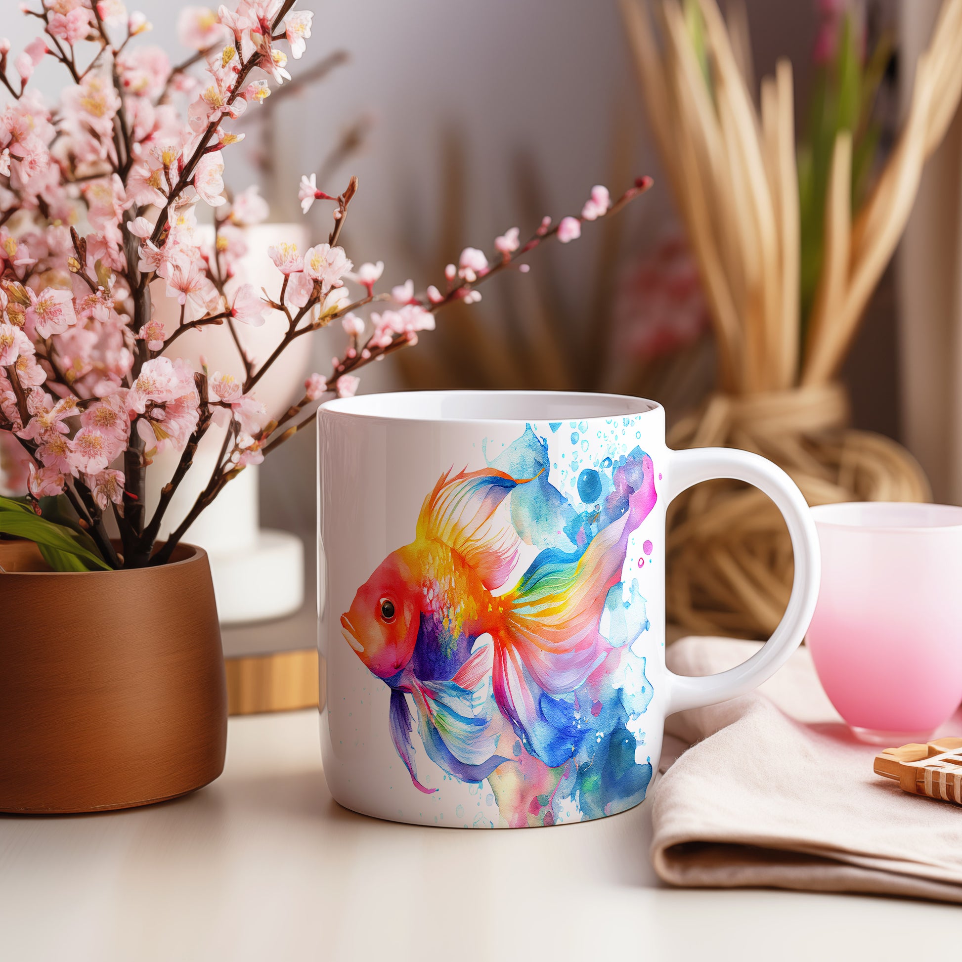 Hrnek s motivem barevné zlaté ryby v akvarelových vlnách je skvělým kouskem pro milovníky přírody a vodních scenérií. Tento hrnek je ideální jako dárek pro přátele nebo rodinu, kteří ocení originální design. Materiál: keramika. Objem: 330 ml. Vhodné do myčky i mikrovlnky. Používáním tohoto hrnku si užijete nejen krásný design, ale i pohodlné pití vašich oblíbených nápojů.