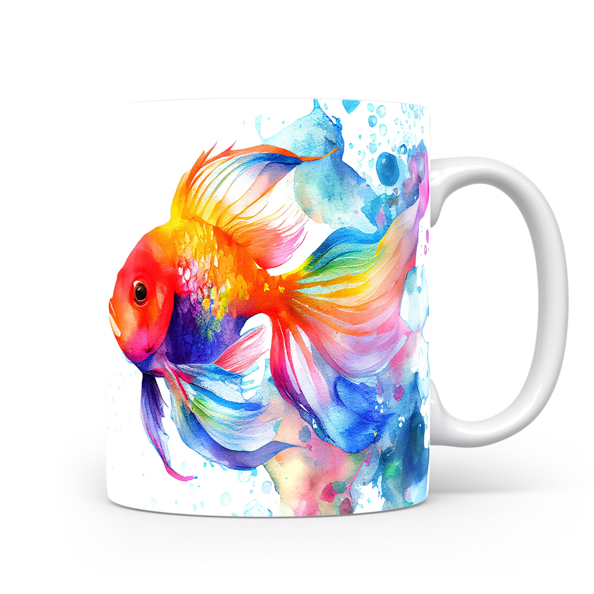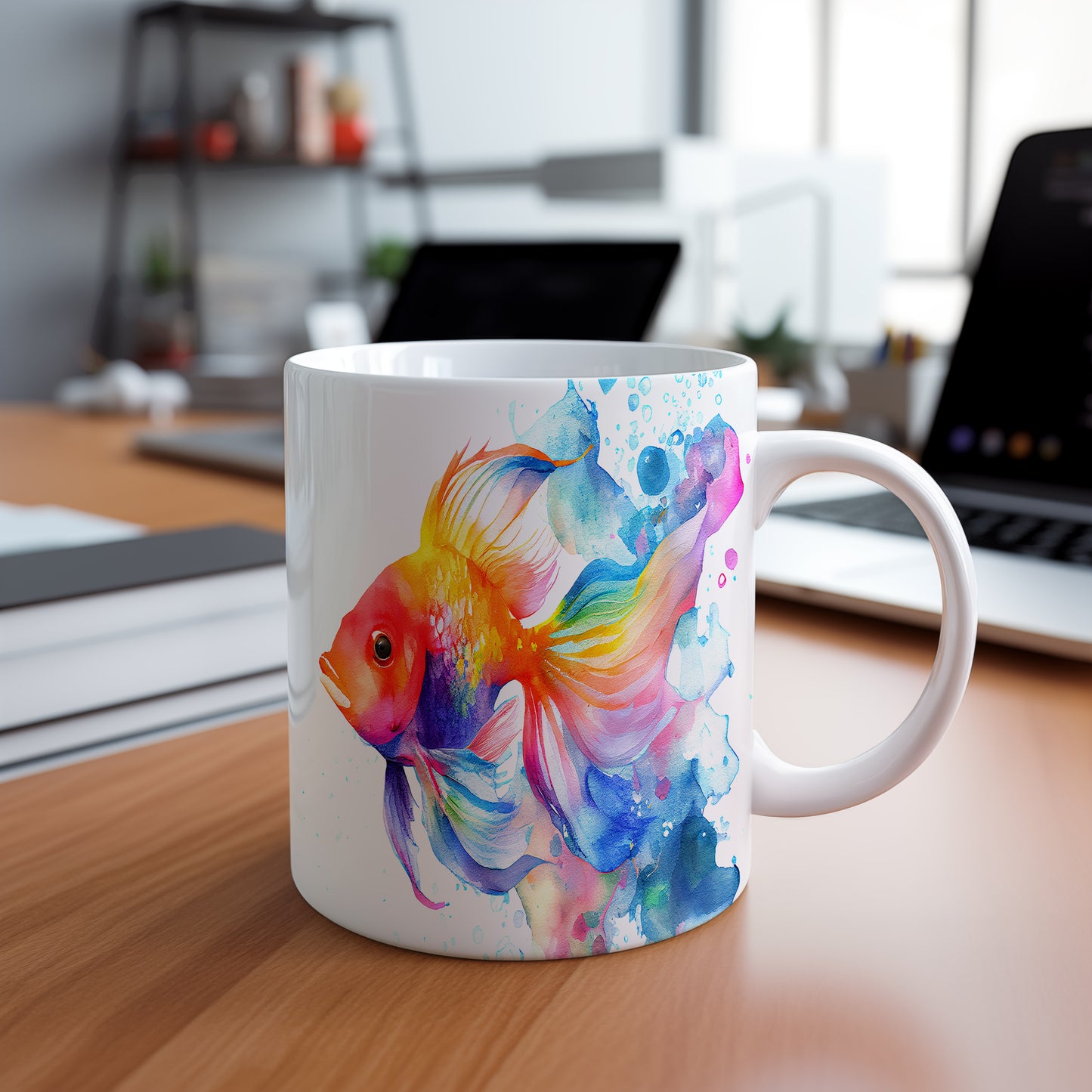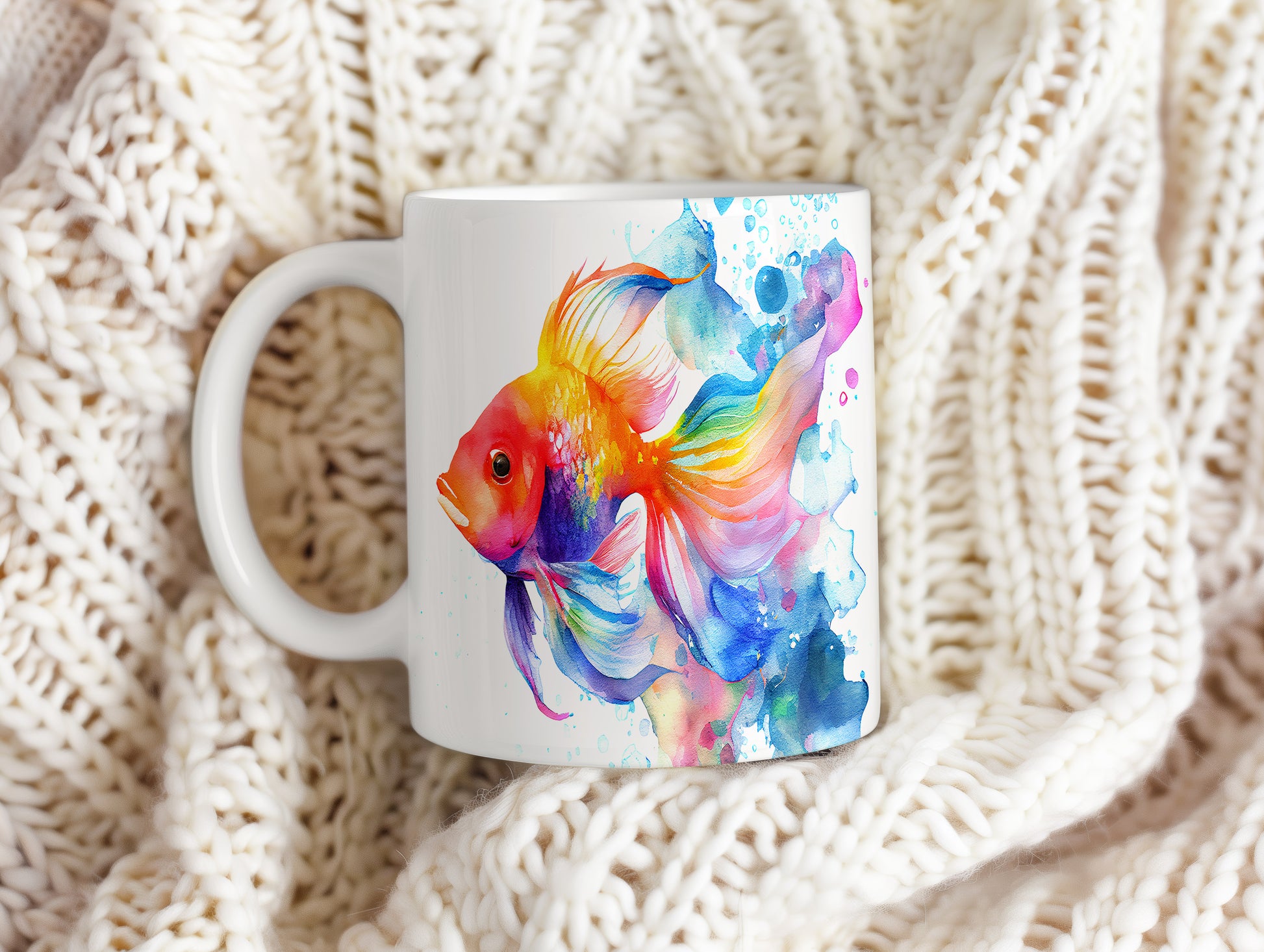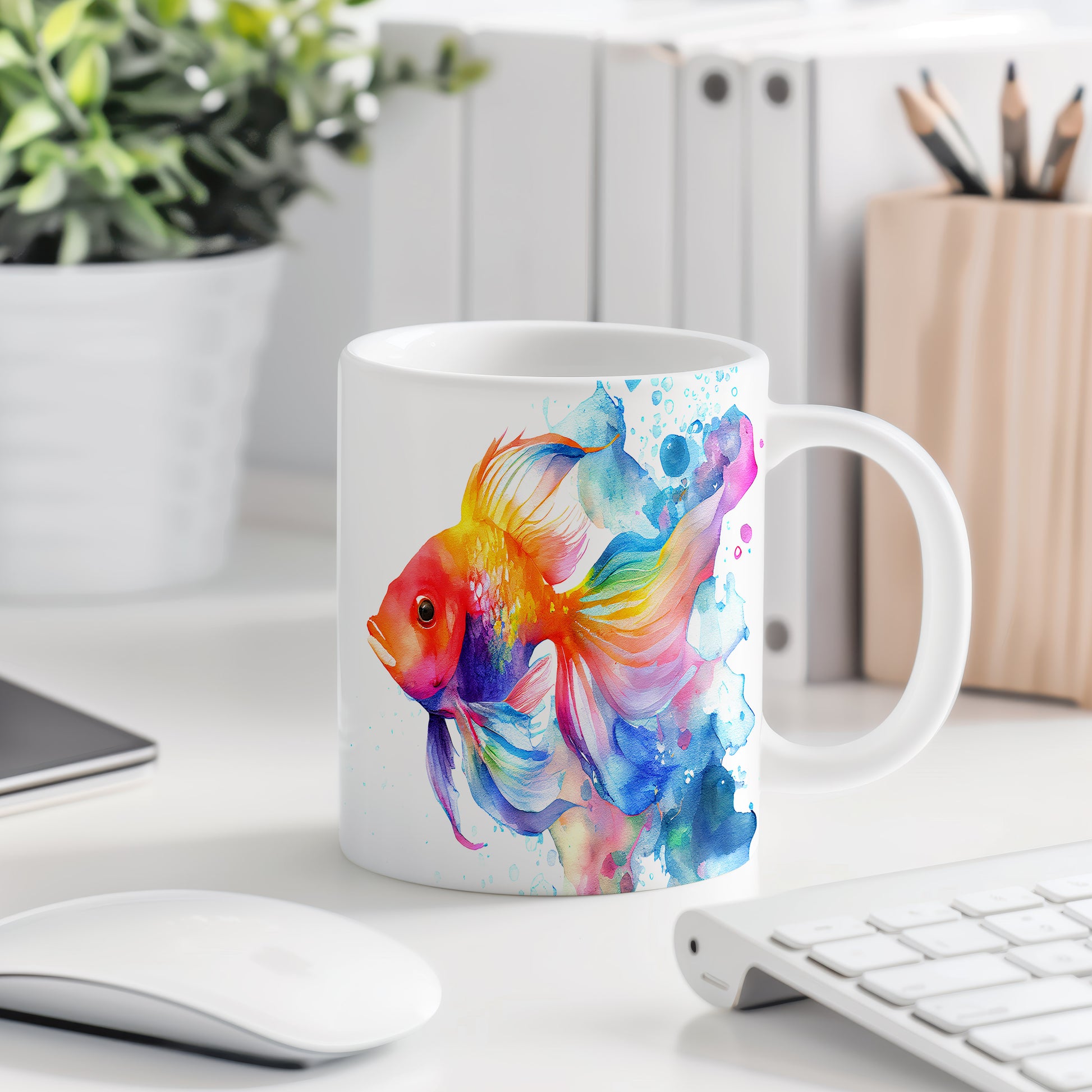 Hrnek s motivem barevné zlaté ryby v akvarelových vlnách je skvělým kouskem pro milovníky přírody a vodních scenérií. Tento hrnek je ideální jako dárek pro přátele nebo rodinu, kteří ocení originální design. Materiál: keramika. Objem: 330 ml. Vhodné do myčky i mikrovlnky. Používáním tohoto hrnku si užijete nejen krásný design, ale i pohodlné pití vašich oblíbených nápojů.