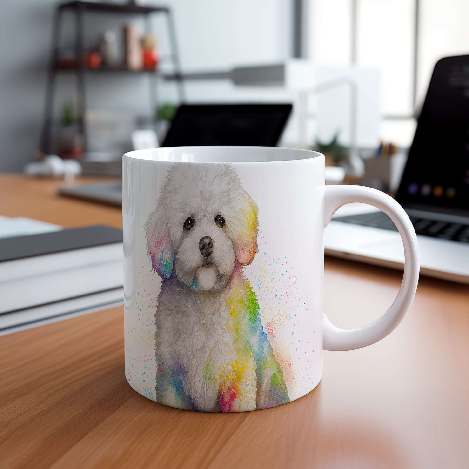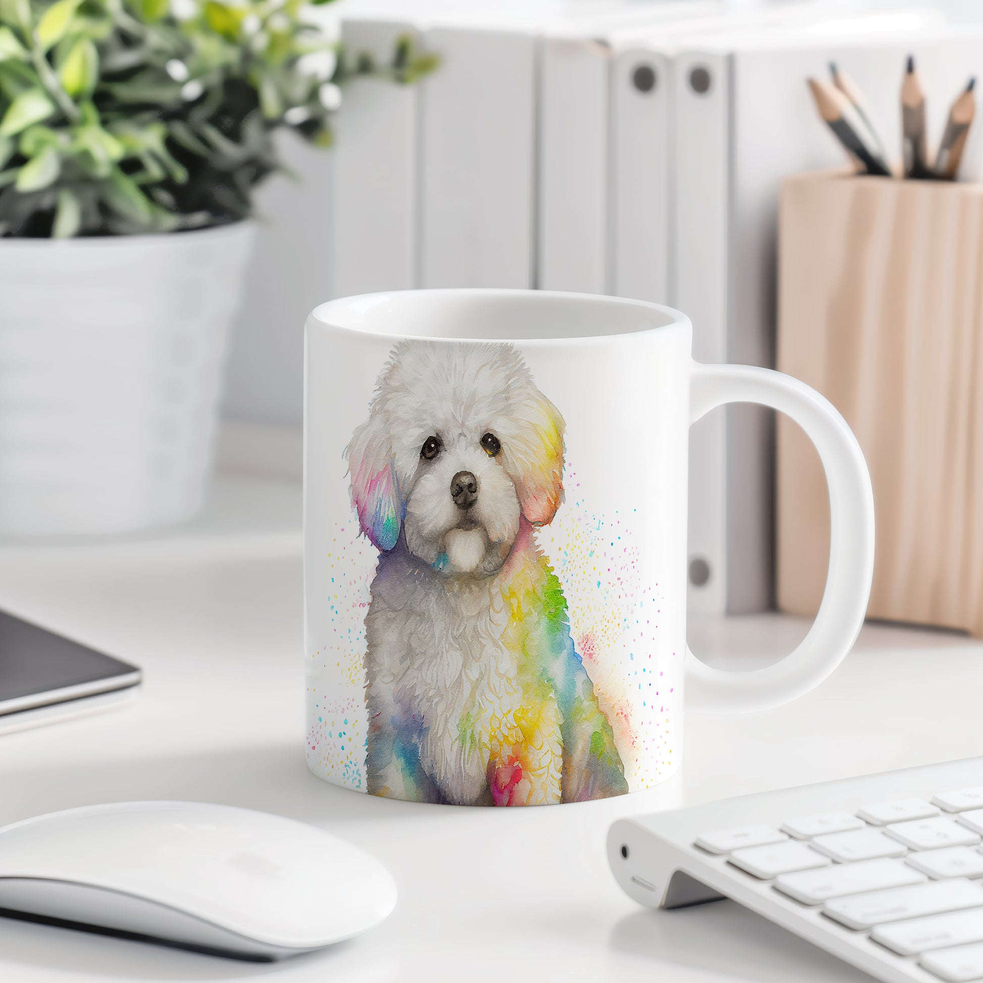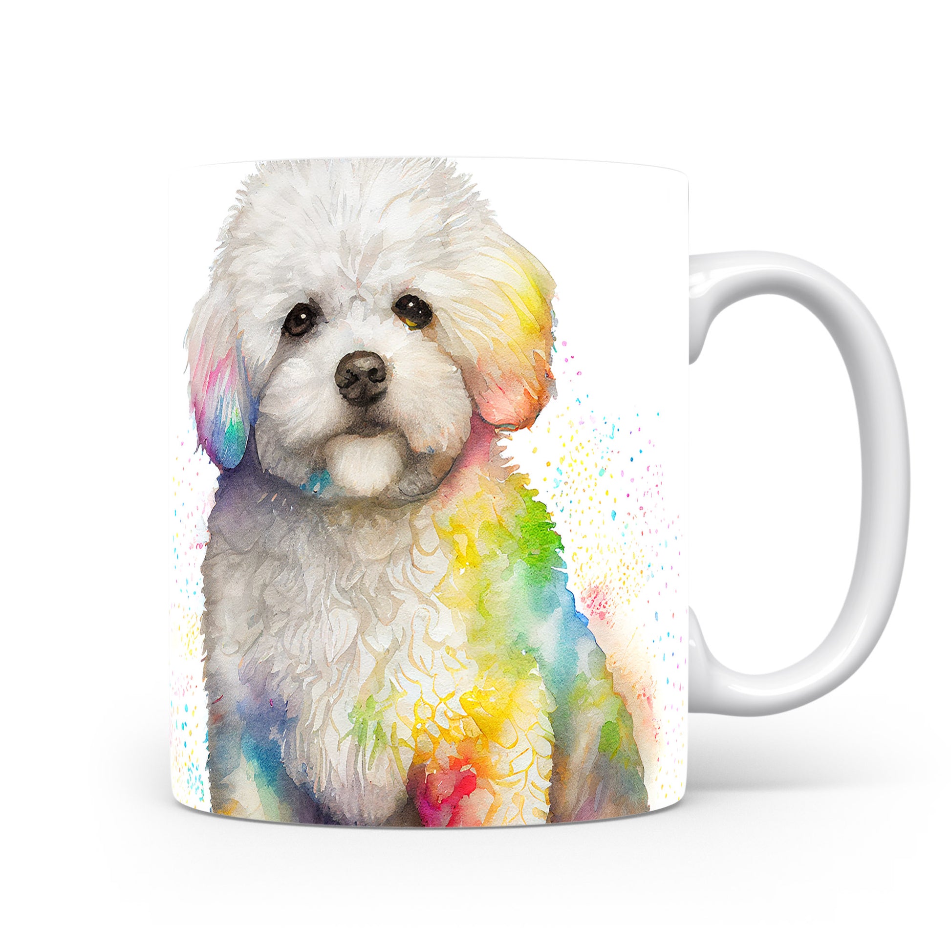 Na hrnku je zobrazen roztomilý pes s bílou srstí, doplněný barevnými akvarelovými skvrnami. Tento hrnek je ideální pro milovníky zvířat a skvělým dárkem pro přátele či rodinu. Materiál: keramika. Objem: 330 ml. Vhodné do myčky i mikrovlnky. Používání tohoto hrnku přináší radost a barevnost do každodenního pití.