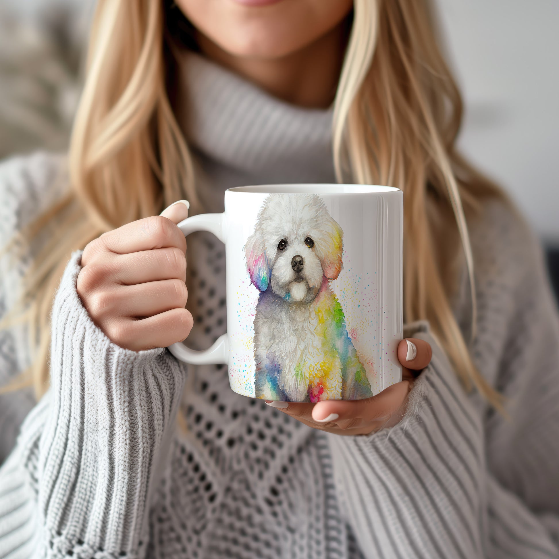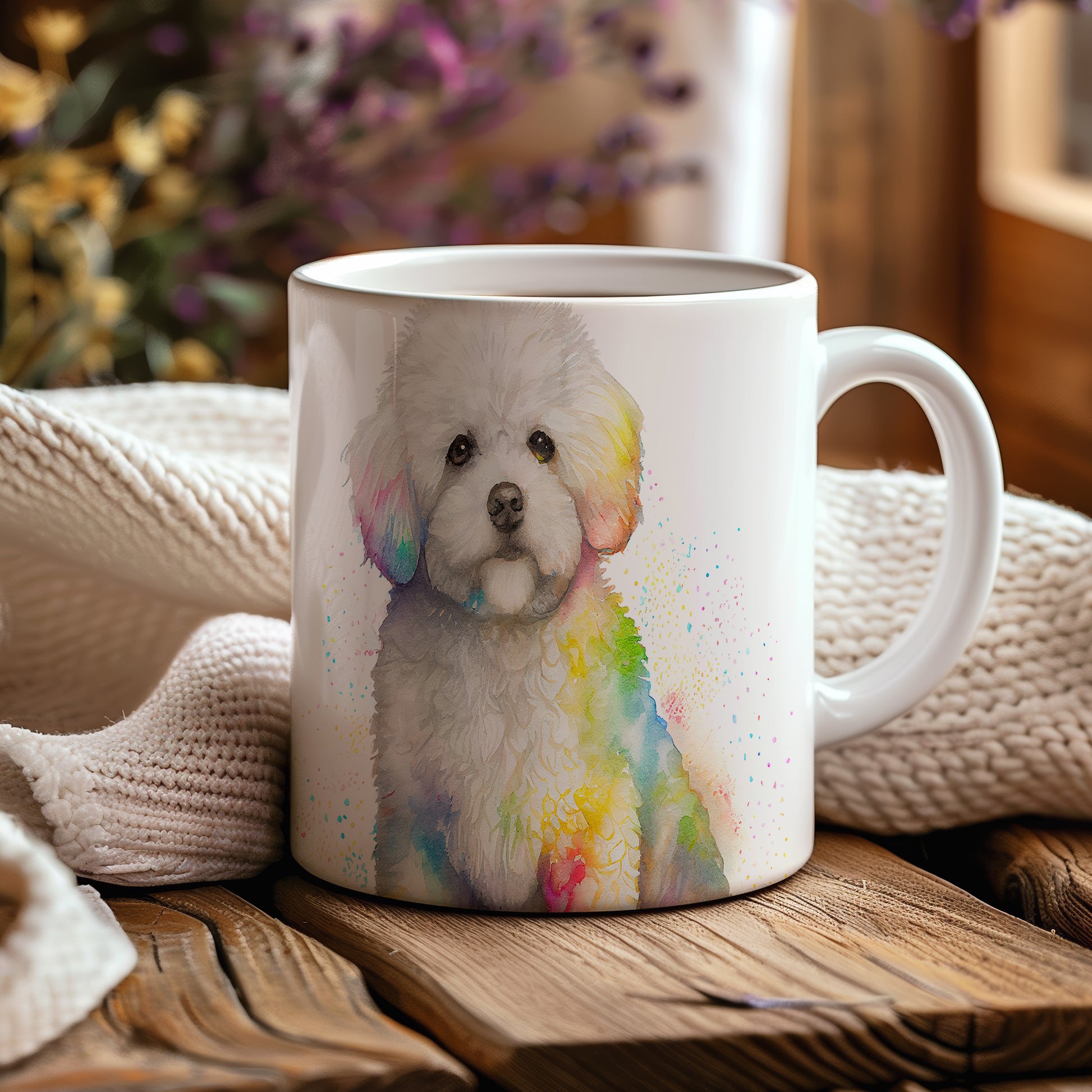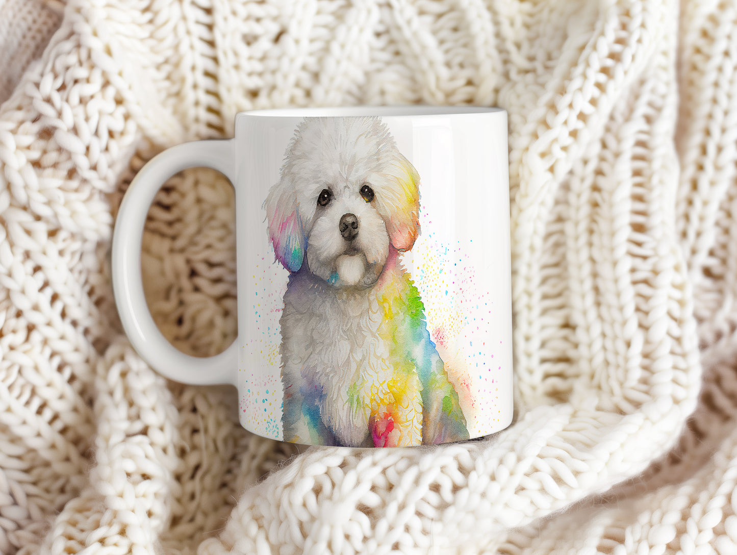 Na hrnku je zobrazen roztomilý pes s bílou srstí, doplněný barevnými akvarelovými skvrnami. Tento hrnek je ideální pro milovníky zvířat a skvělým dárkem pro přátele či rodinu. Materiál: keramika. Objem: 330 ml. Vhodné do myčky i mikrovlnky. Používání tohoto hrnku přináší radost a barevnost do každodenního pití.