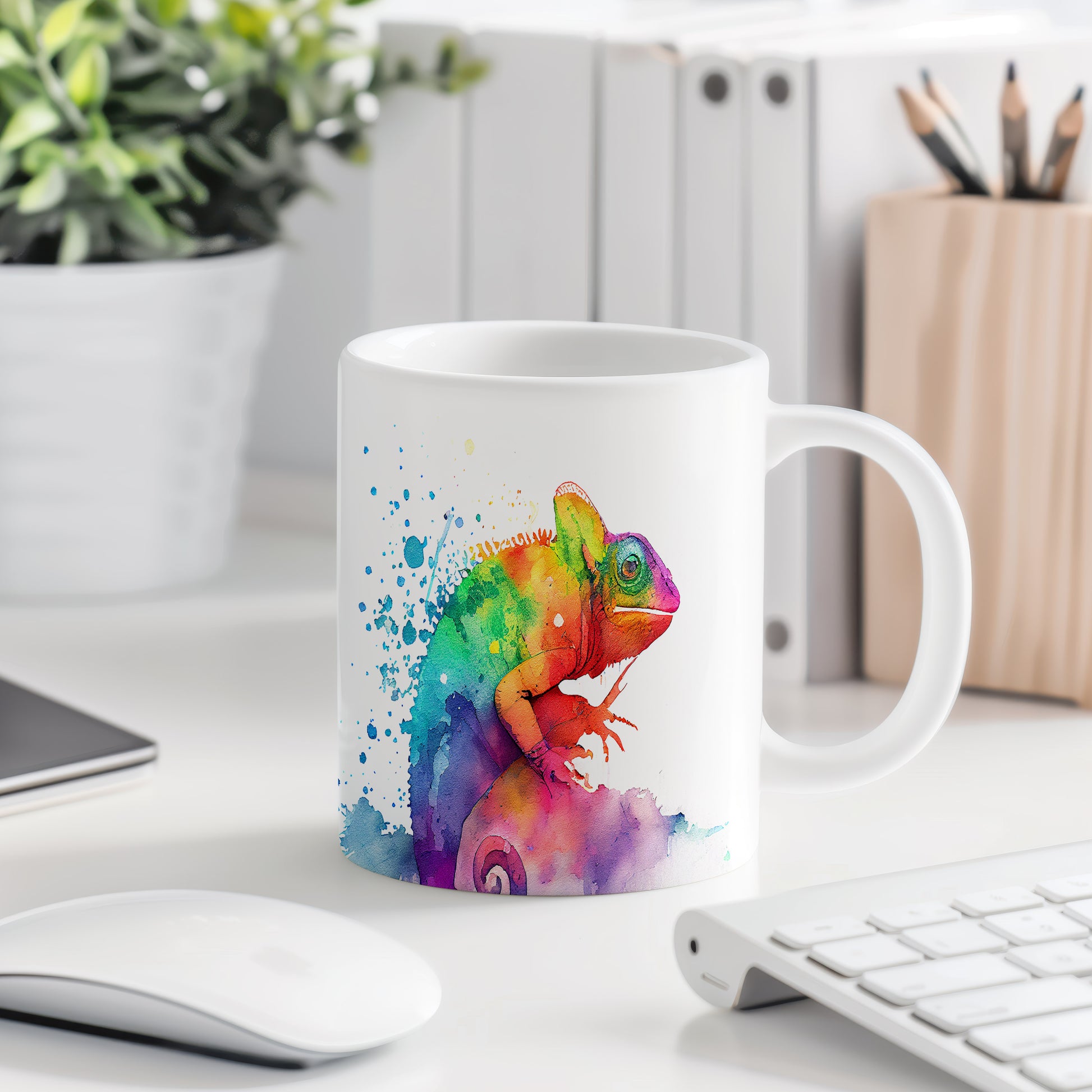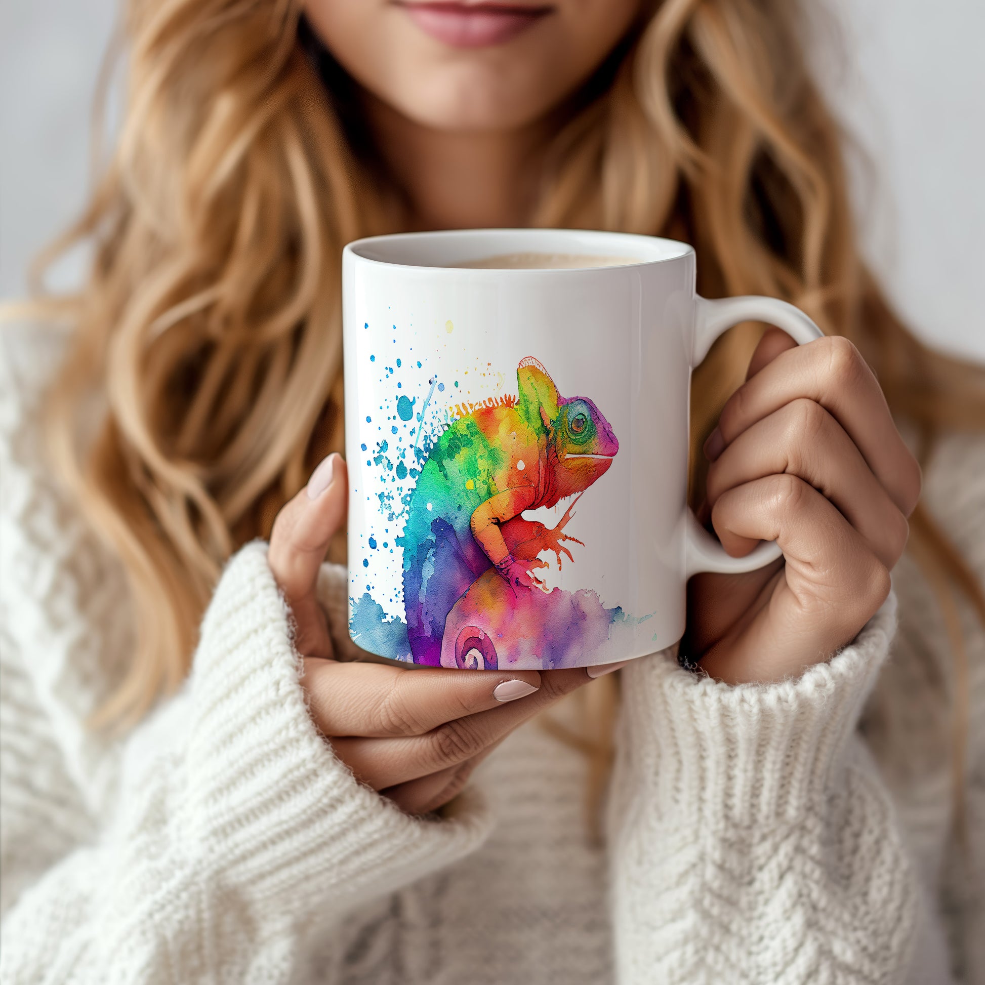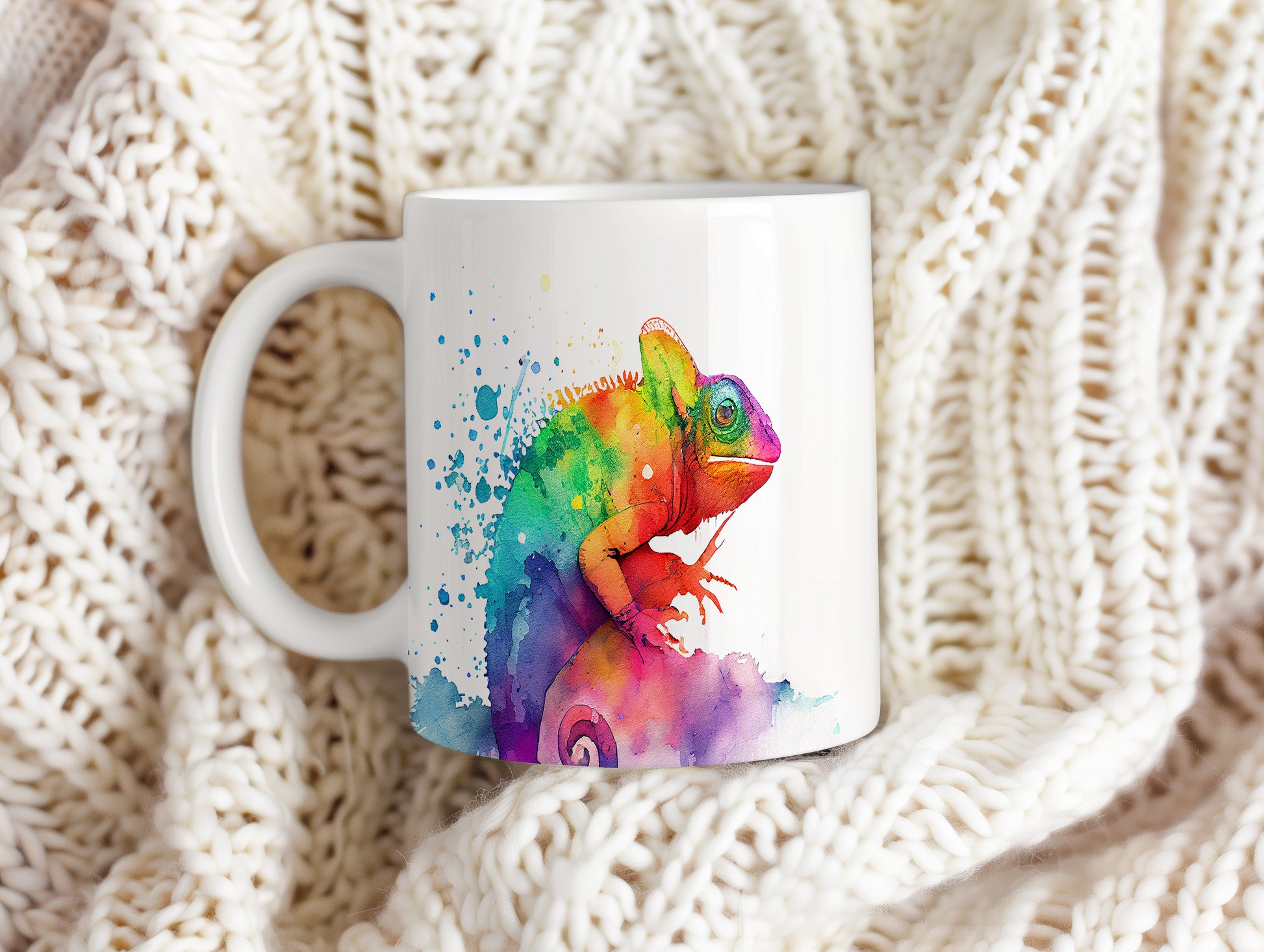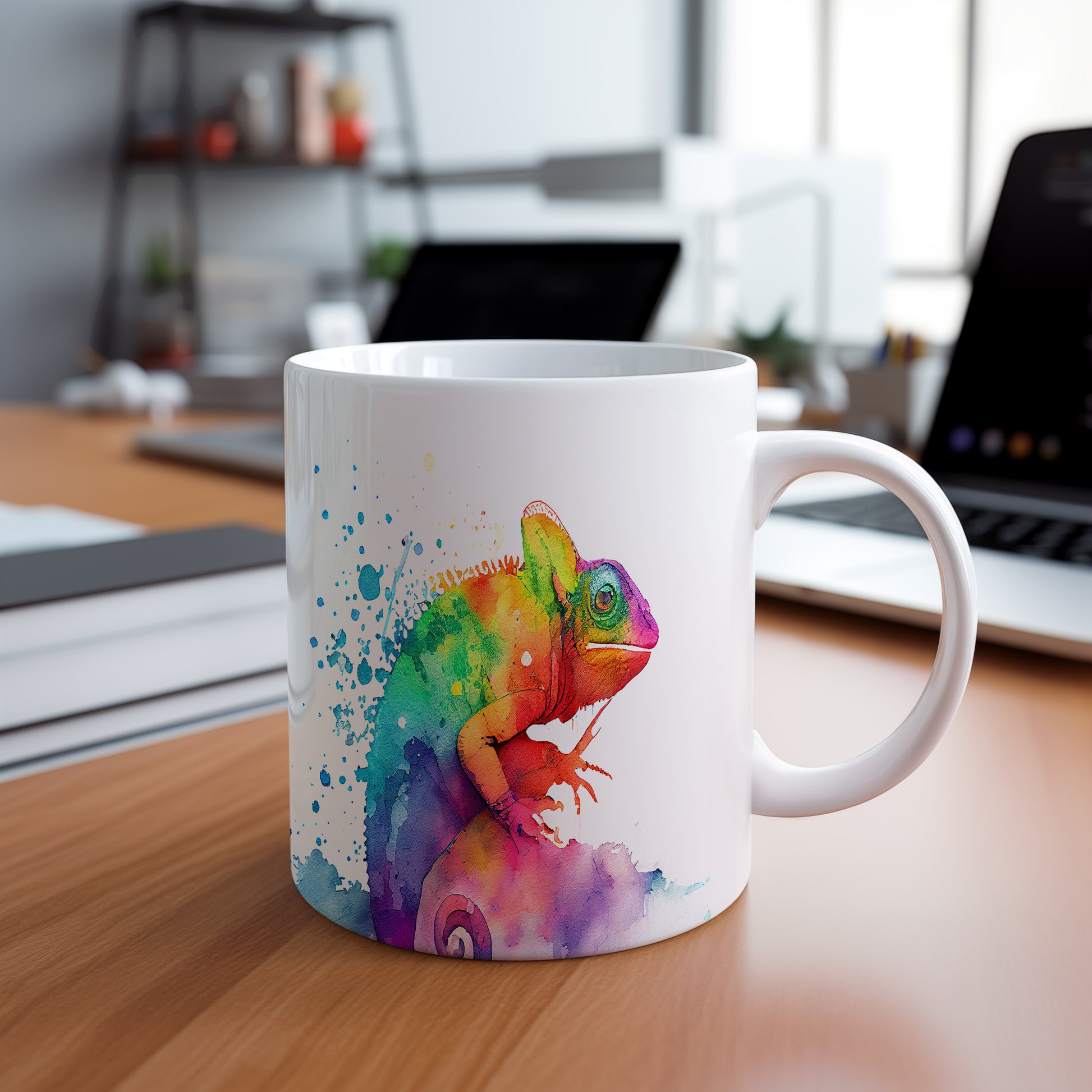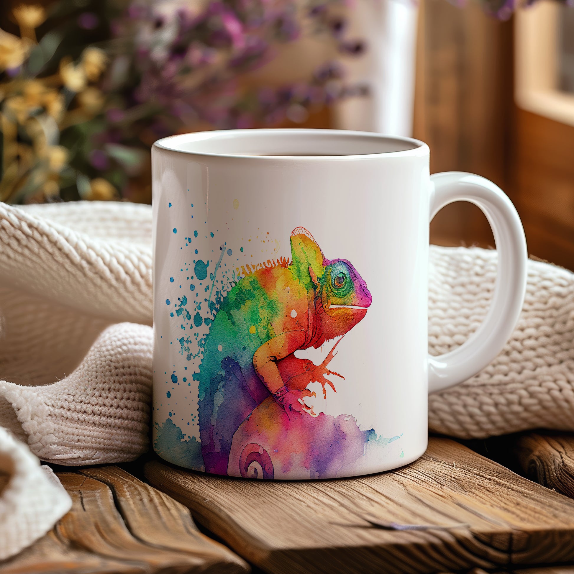 Hrnek s barevným chameleónem – akvarelovým motivem
