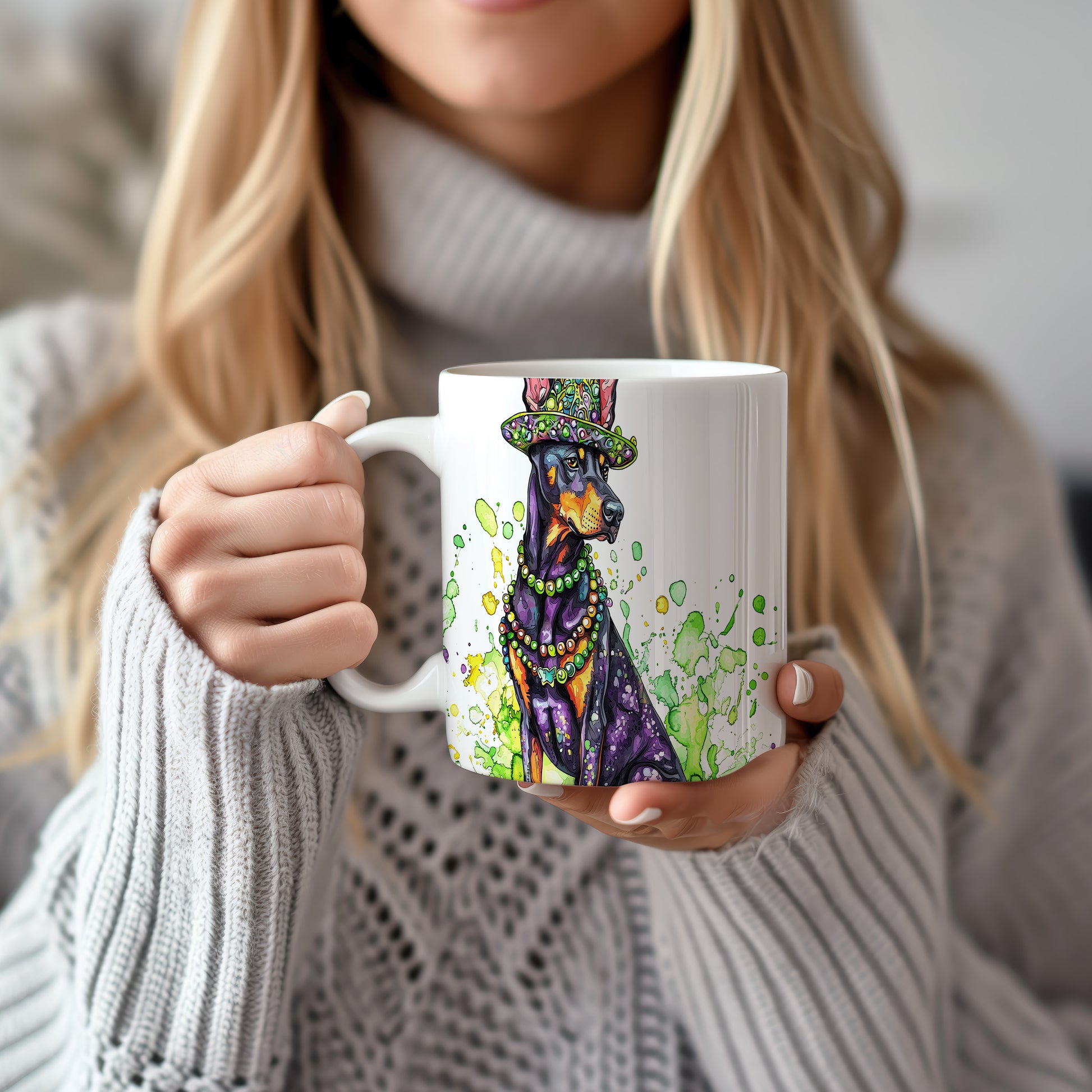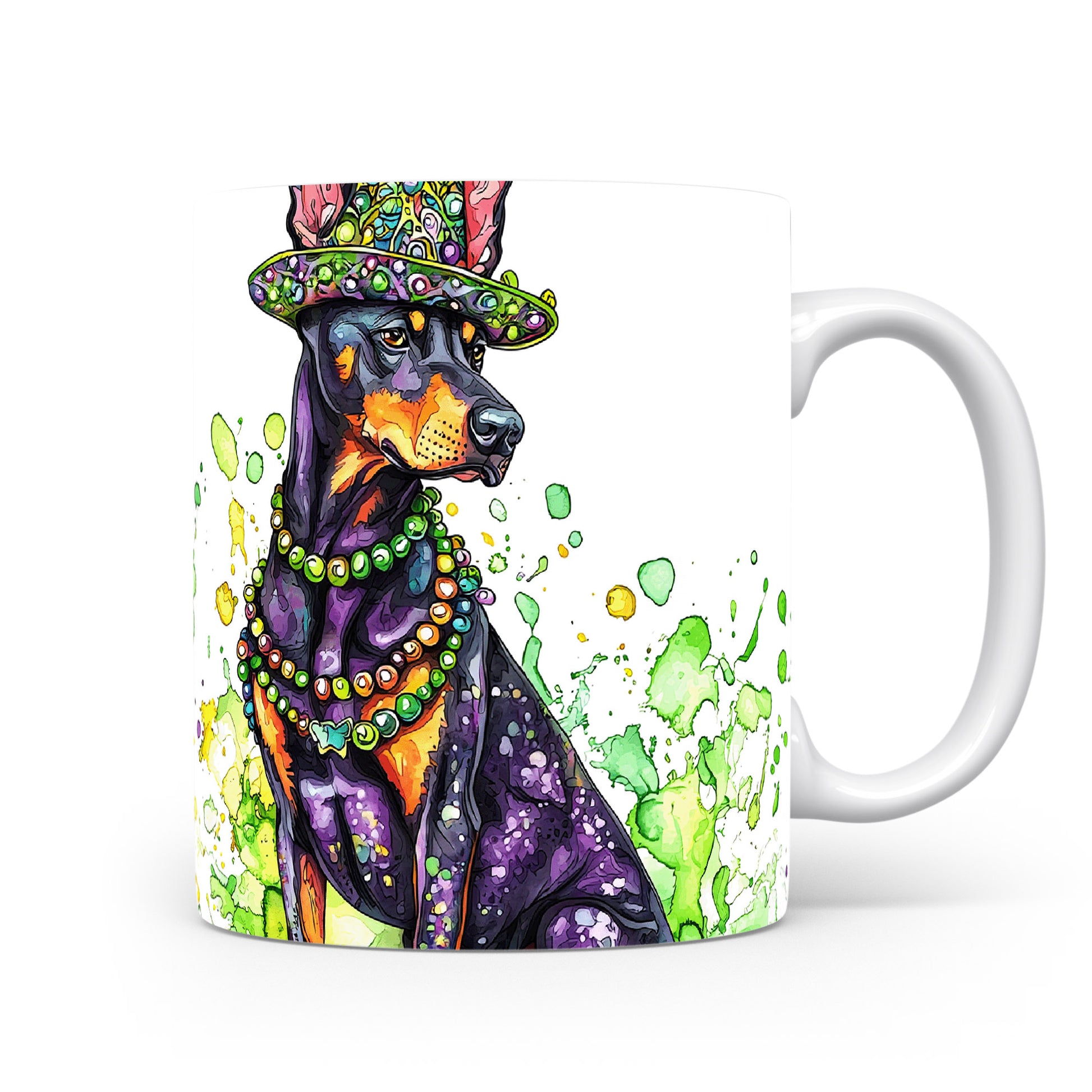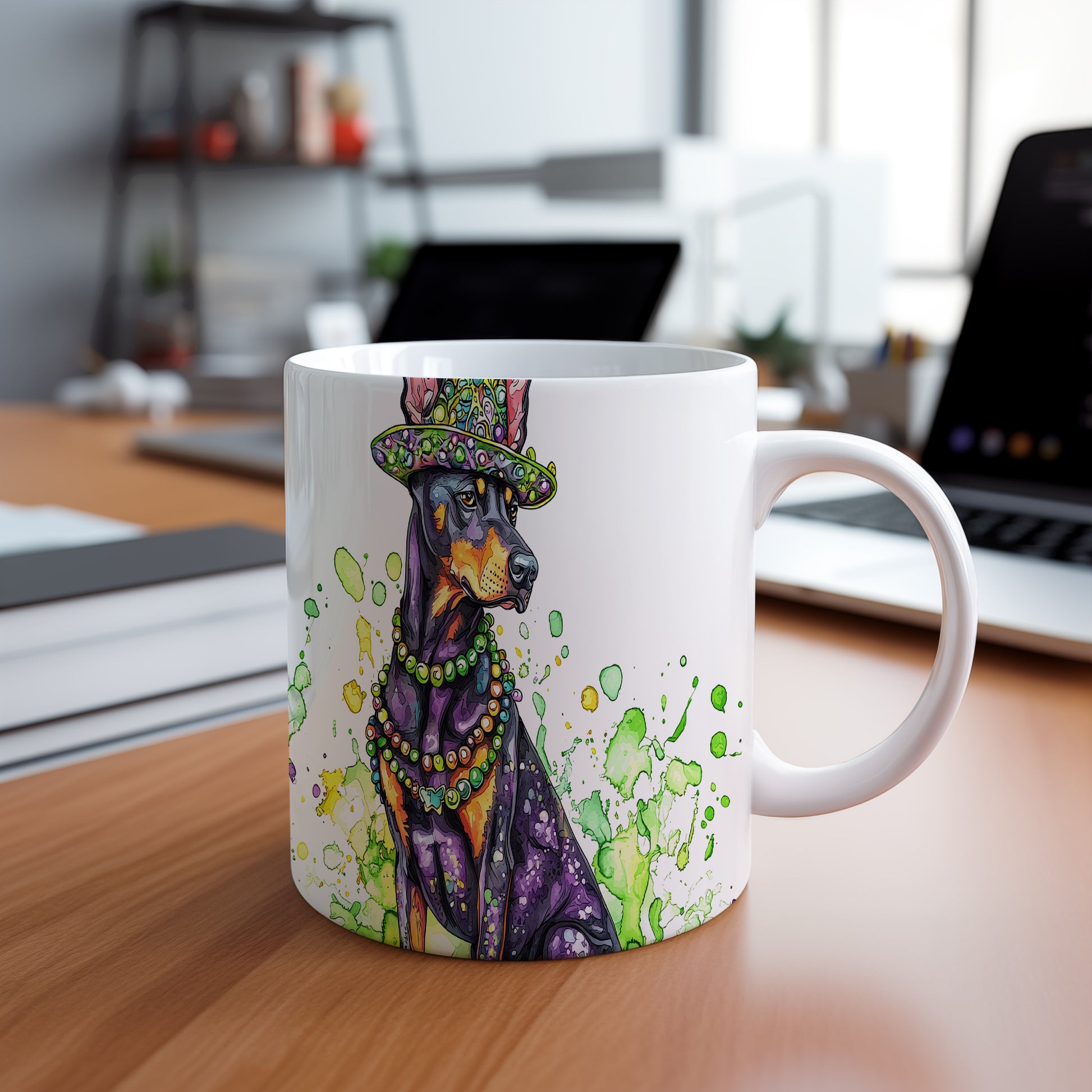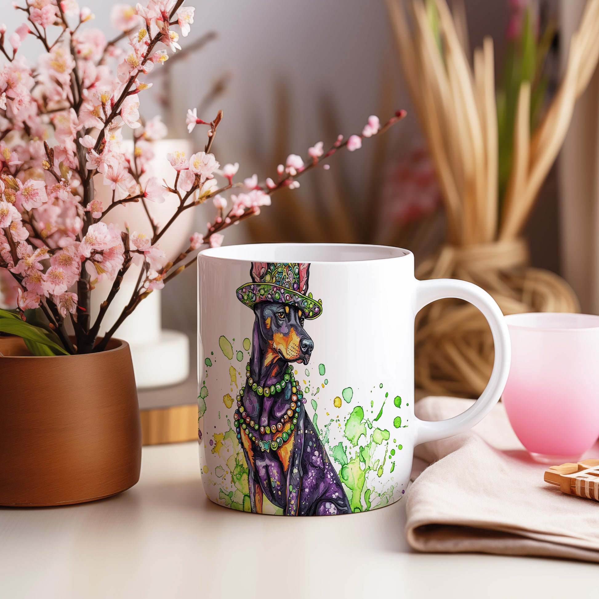 Tento hrnek z keramického materiálu zobrazuje veselého dobrmana v barevném klobouku. Je ideální pro milovníky psů a zábavy, skvěle se hodí jako dárek pro přátele nebo rodinu. Materiál: keramika. Objem: 330 ml. Vhodné do myčky i mikrovlnky. Používání tohoto hrnku přináší radost a oživí každé pití.